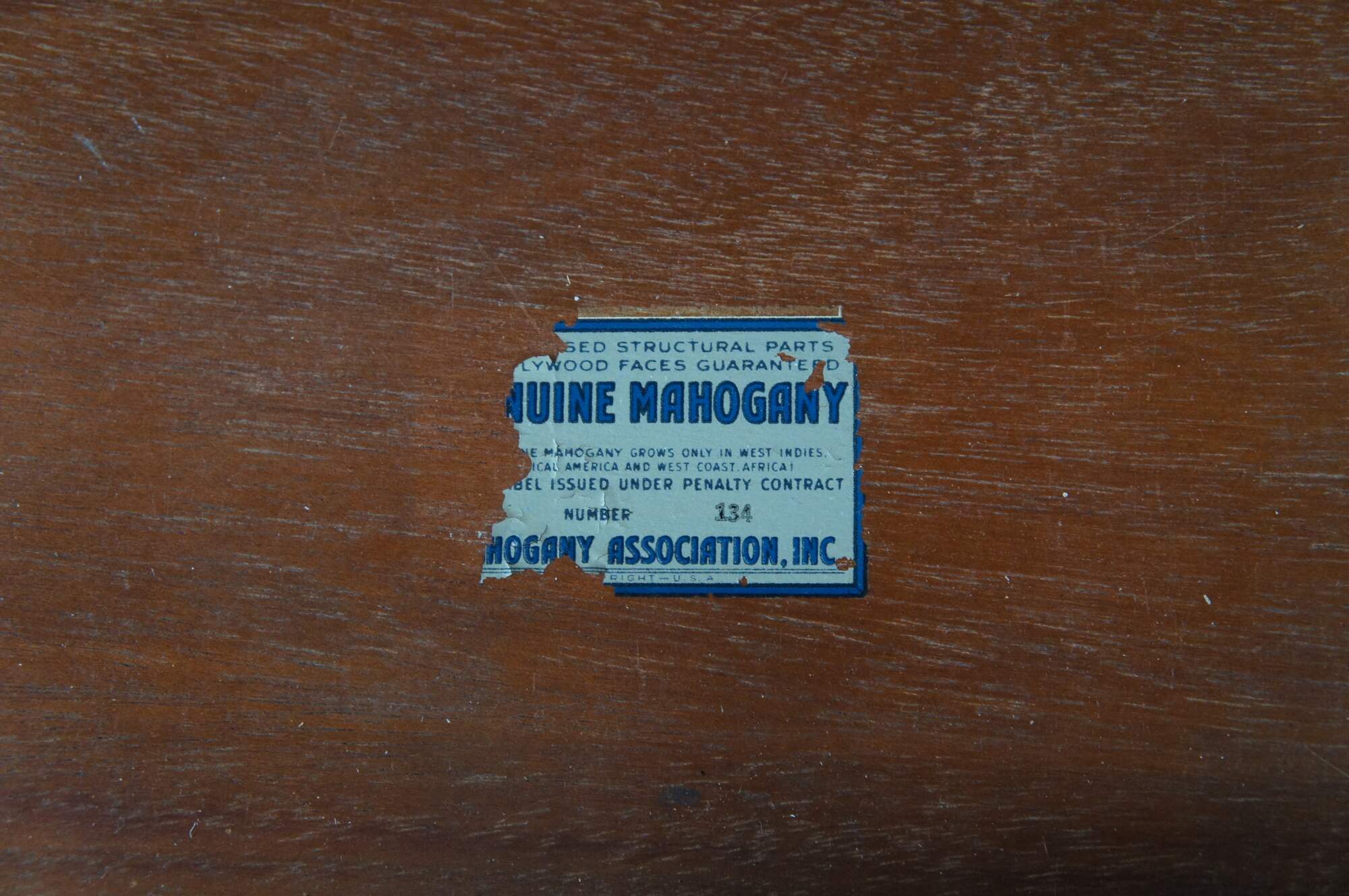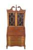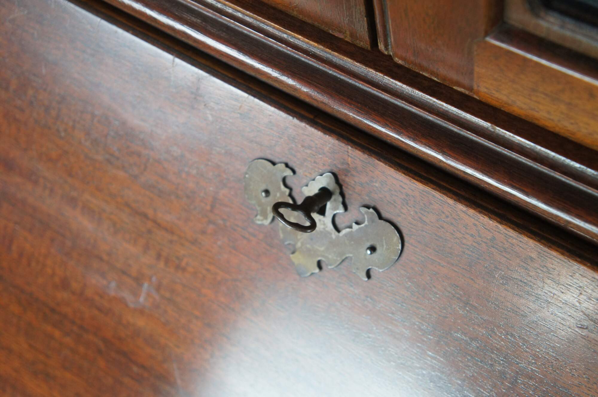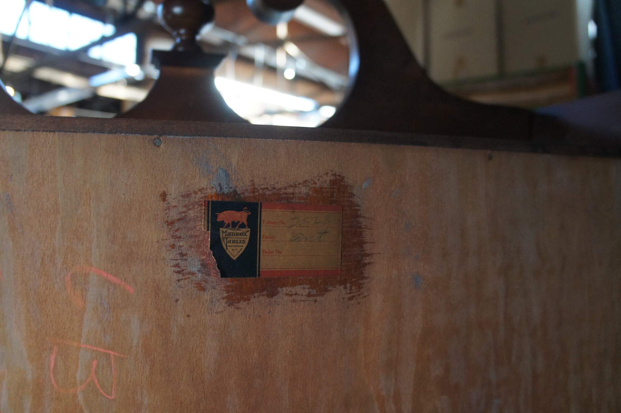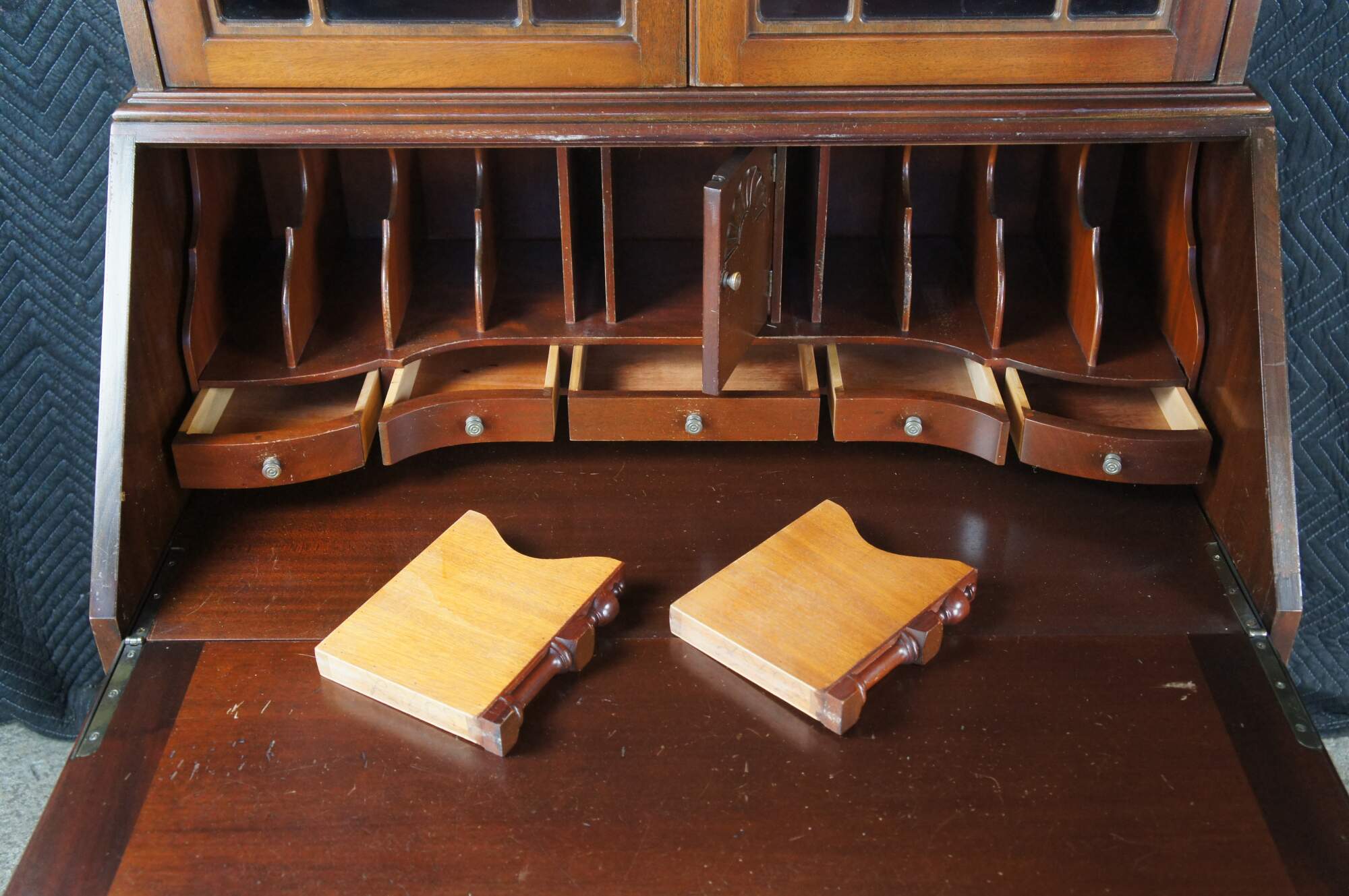 A gorgeous serpentine oxbow secretary desk by Maddox Tables of Jamestown NY. Made from American mahogany. Interior opens to five drawers and multiple divided and hidden compartments. Upper bookcase portion shows an open pediment with turned trophy finial. Doors are glass with fretwork. There are 2 interior bookcase shelves. Hardware is made of brass in classic Chippendale fashion, circa 1940s. Ball and Claw feet.