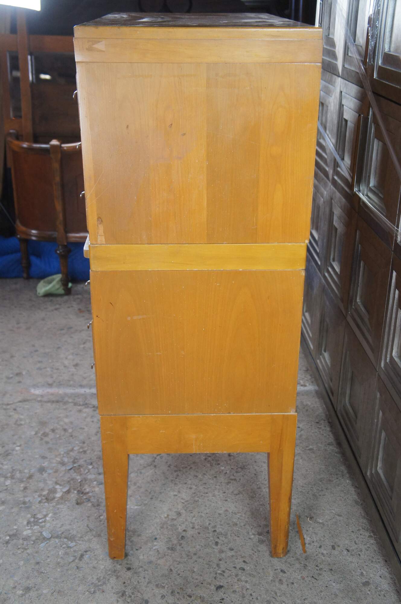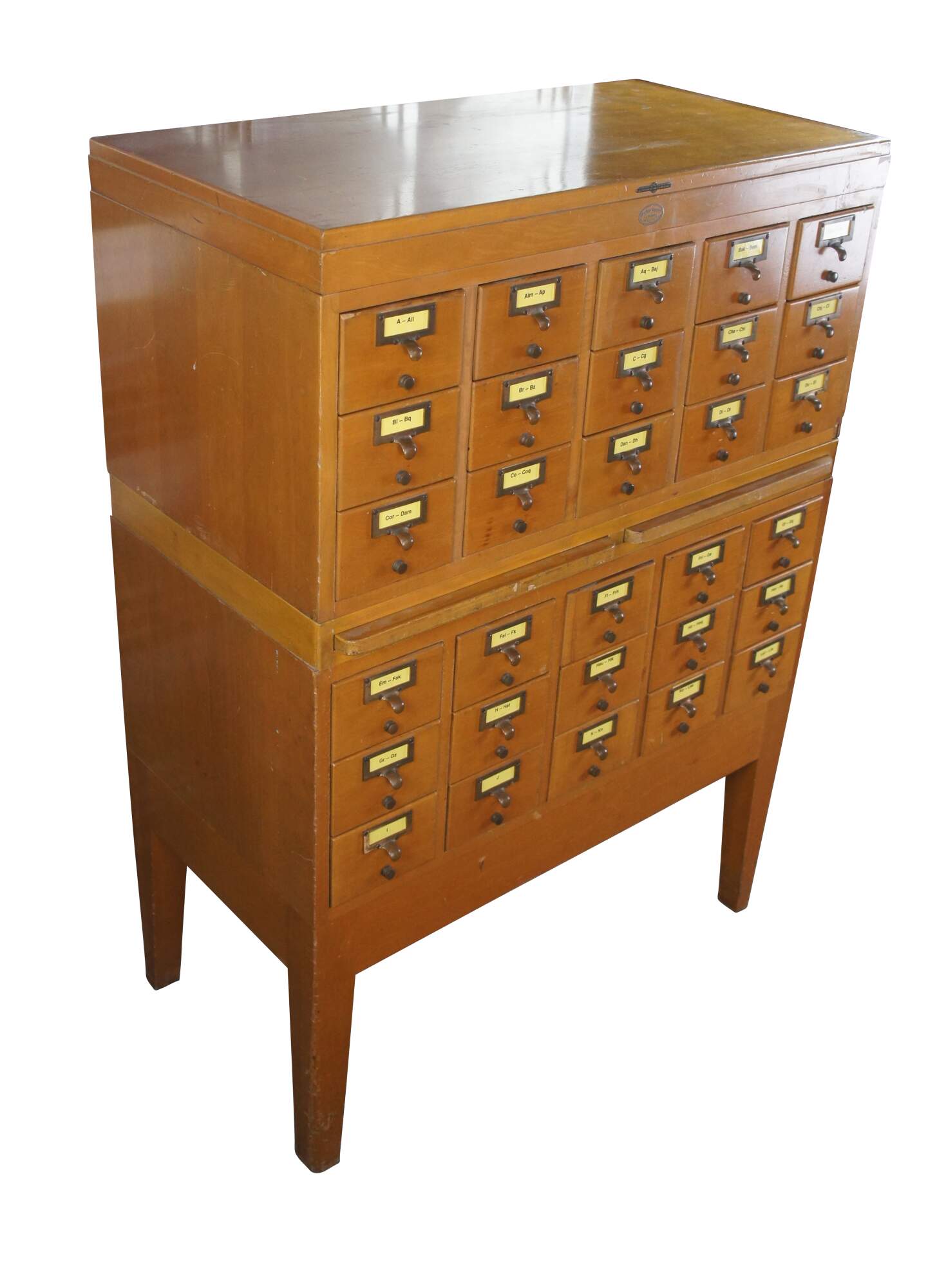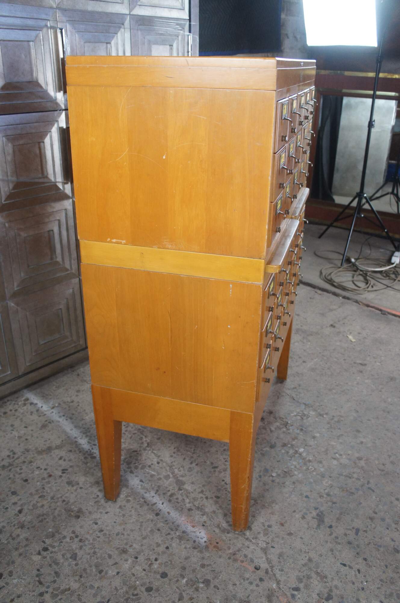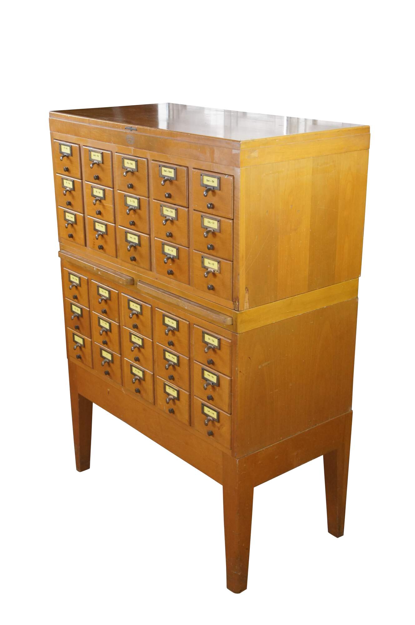 Mid century 5 piece stacking card catalog cabinet by Globe Wernicke. This industrial apothecary style cabinet features two 15 drawer sections flanked by two central pull out shelves. In the past was used at the Archie Sherer Company.