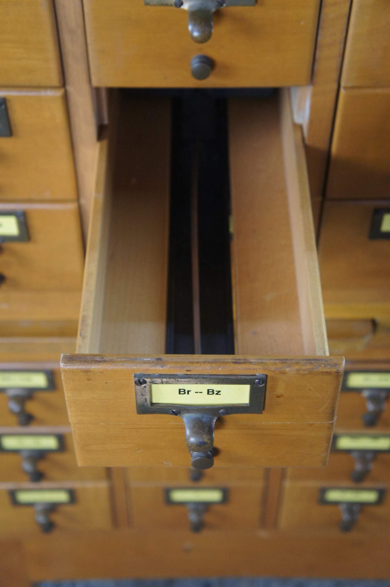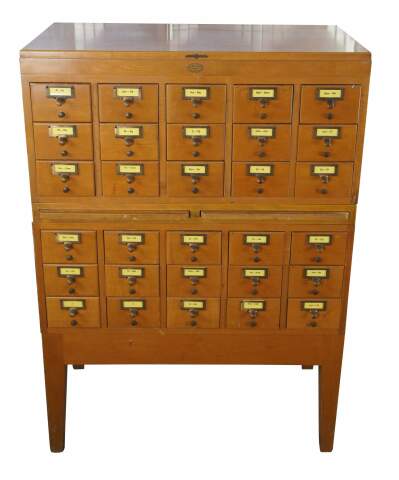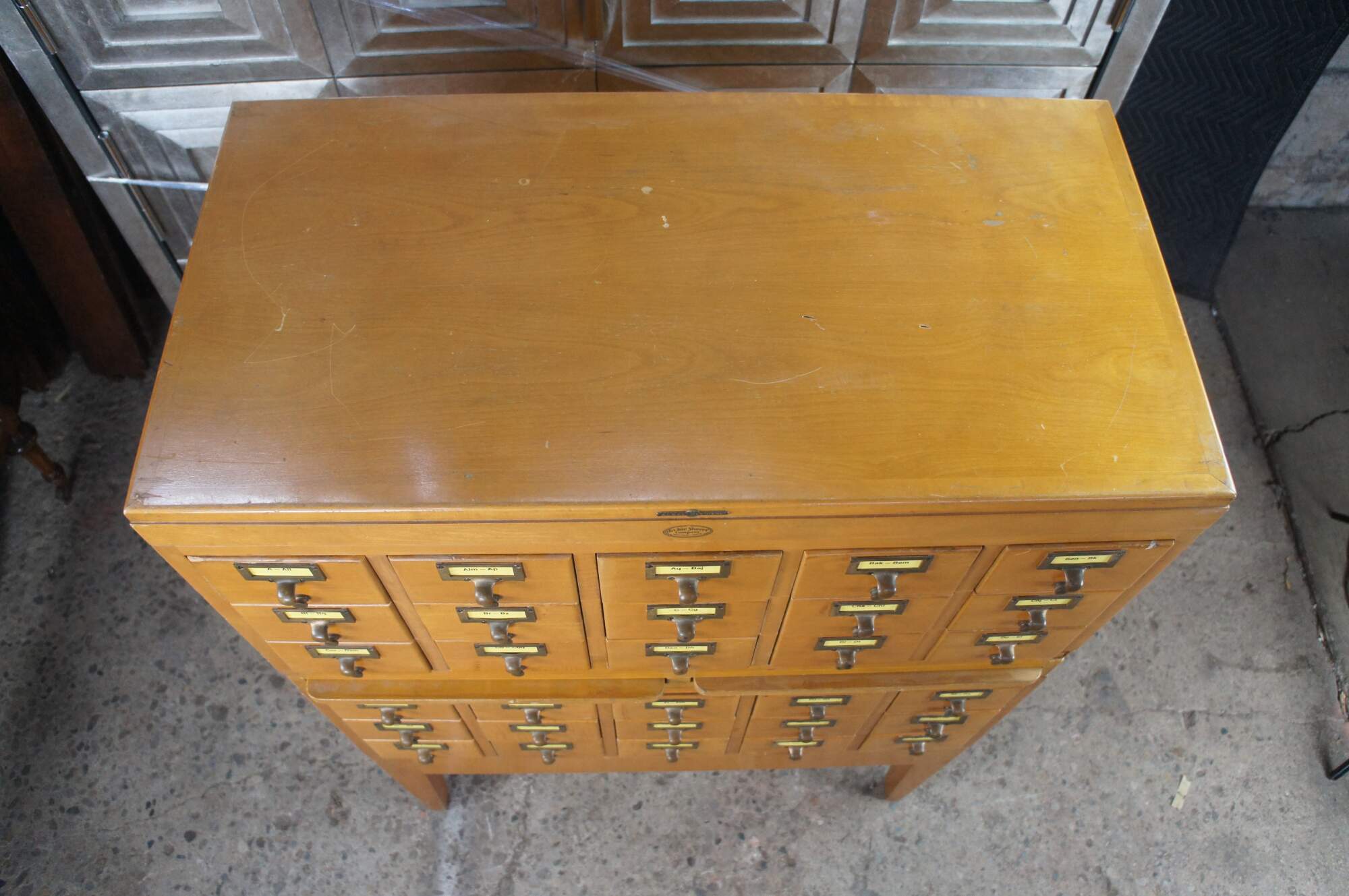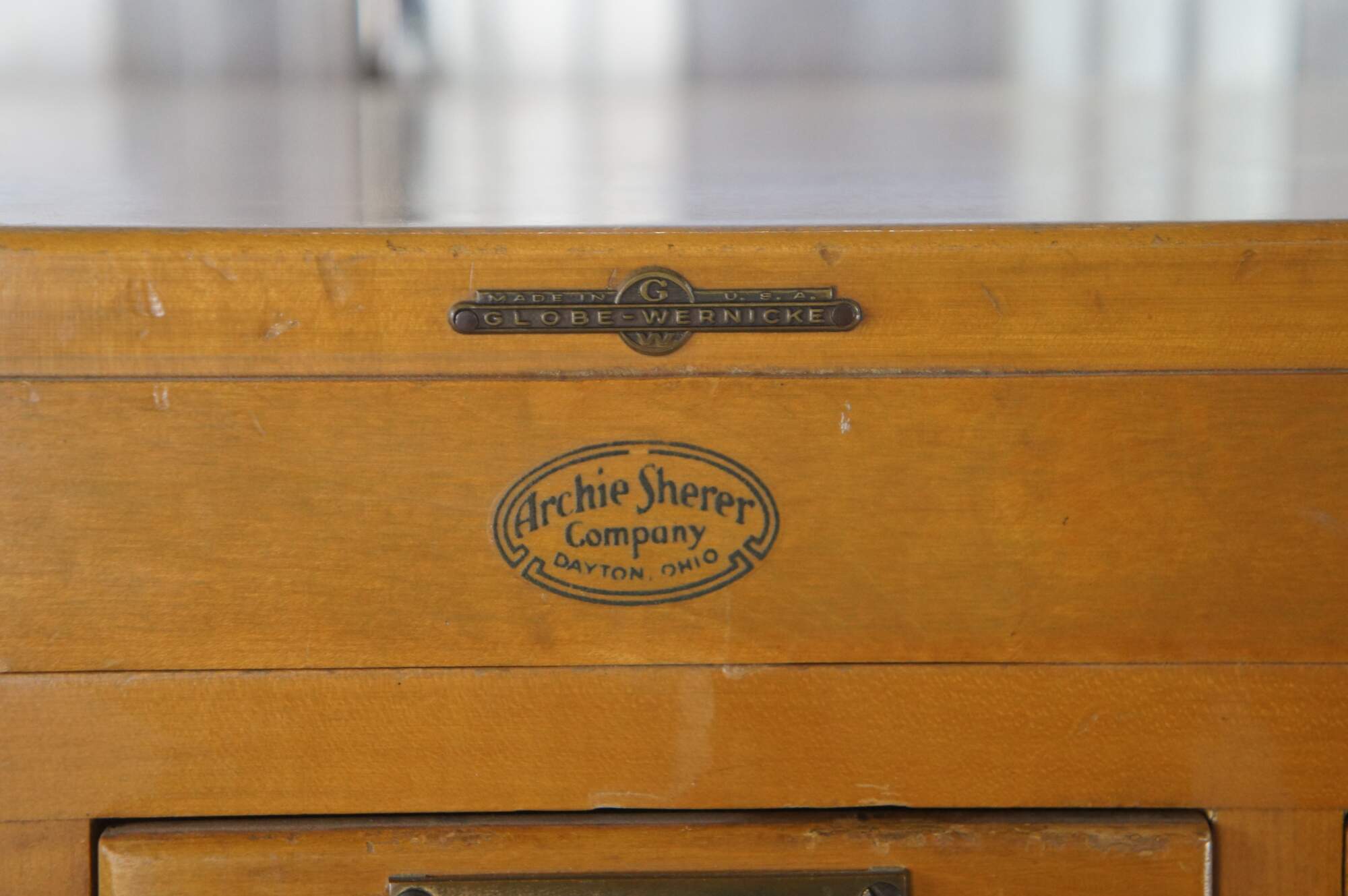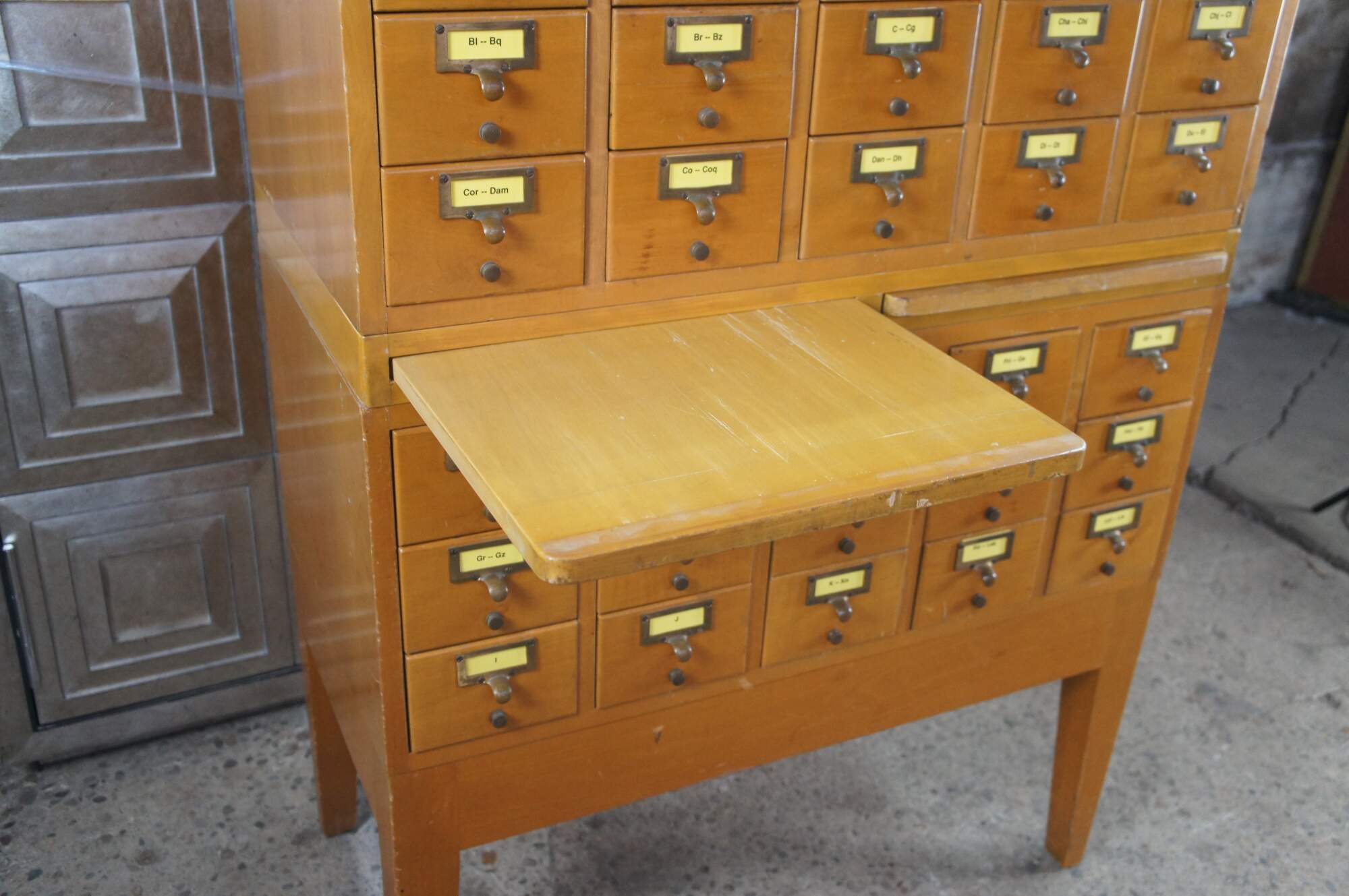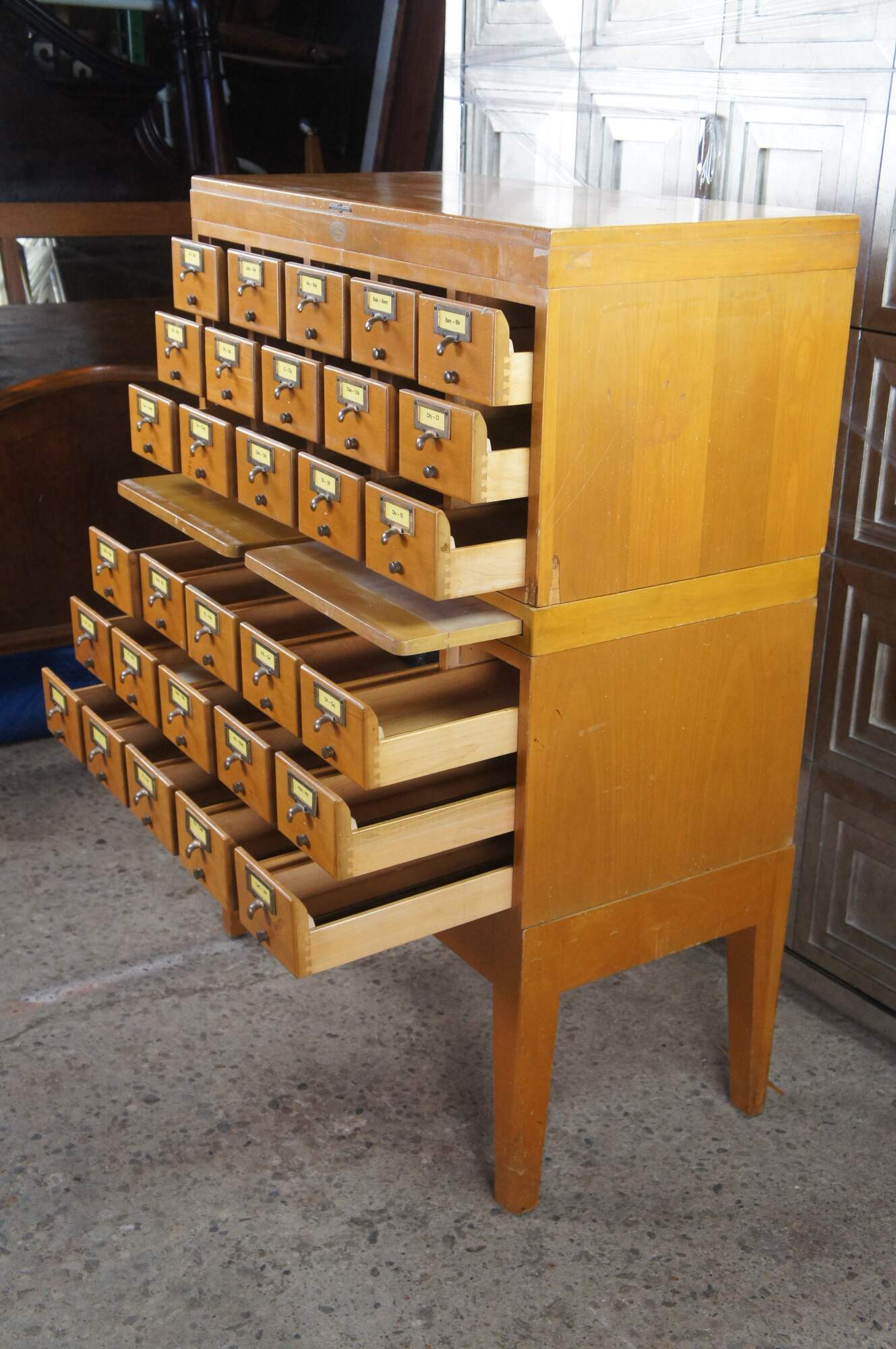 Mid century 5 piece stacking card catalog cabinet by Globe Wernicke. This industrial apothecary style cabinet features two 15 drawer sections flanked by two central pull out shelves. In the past was used at the Archie Sherer Company.