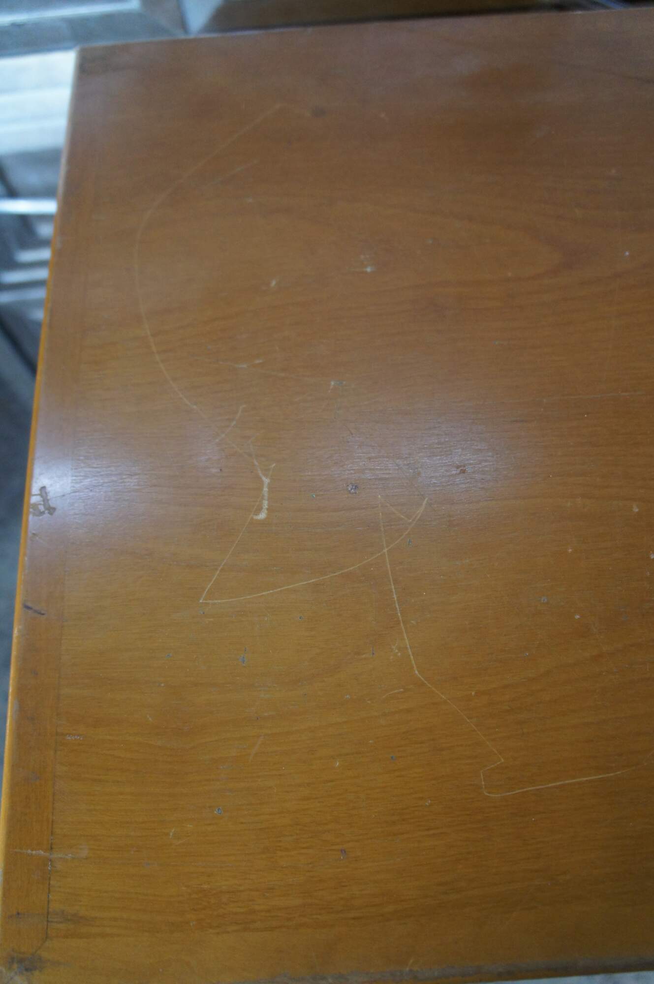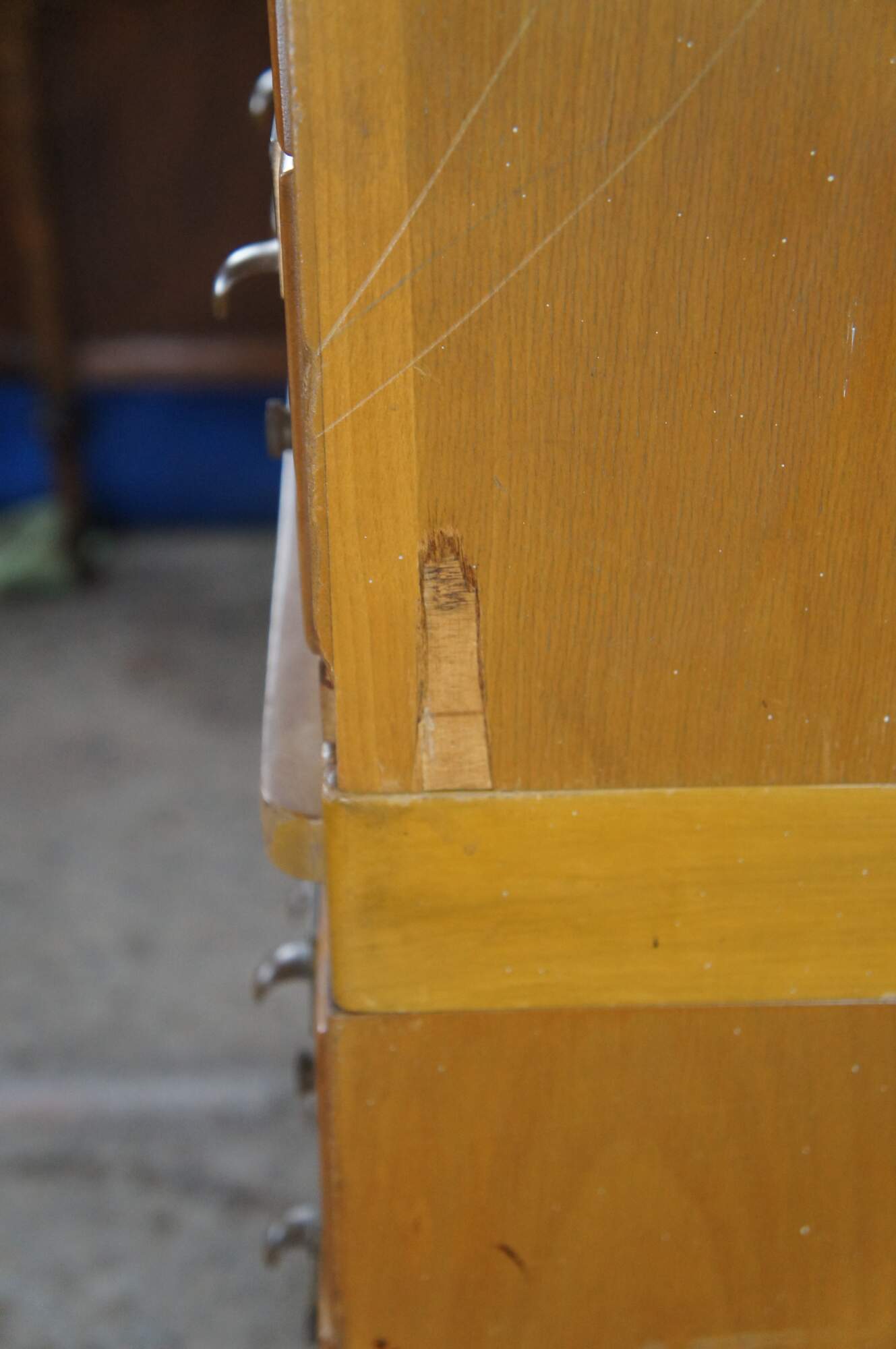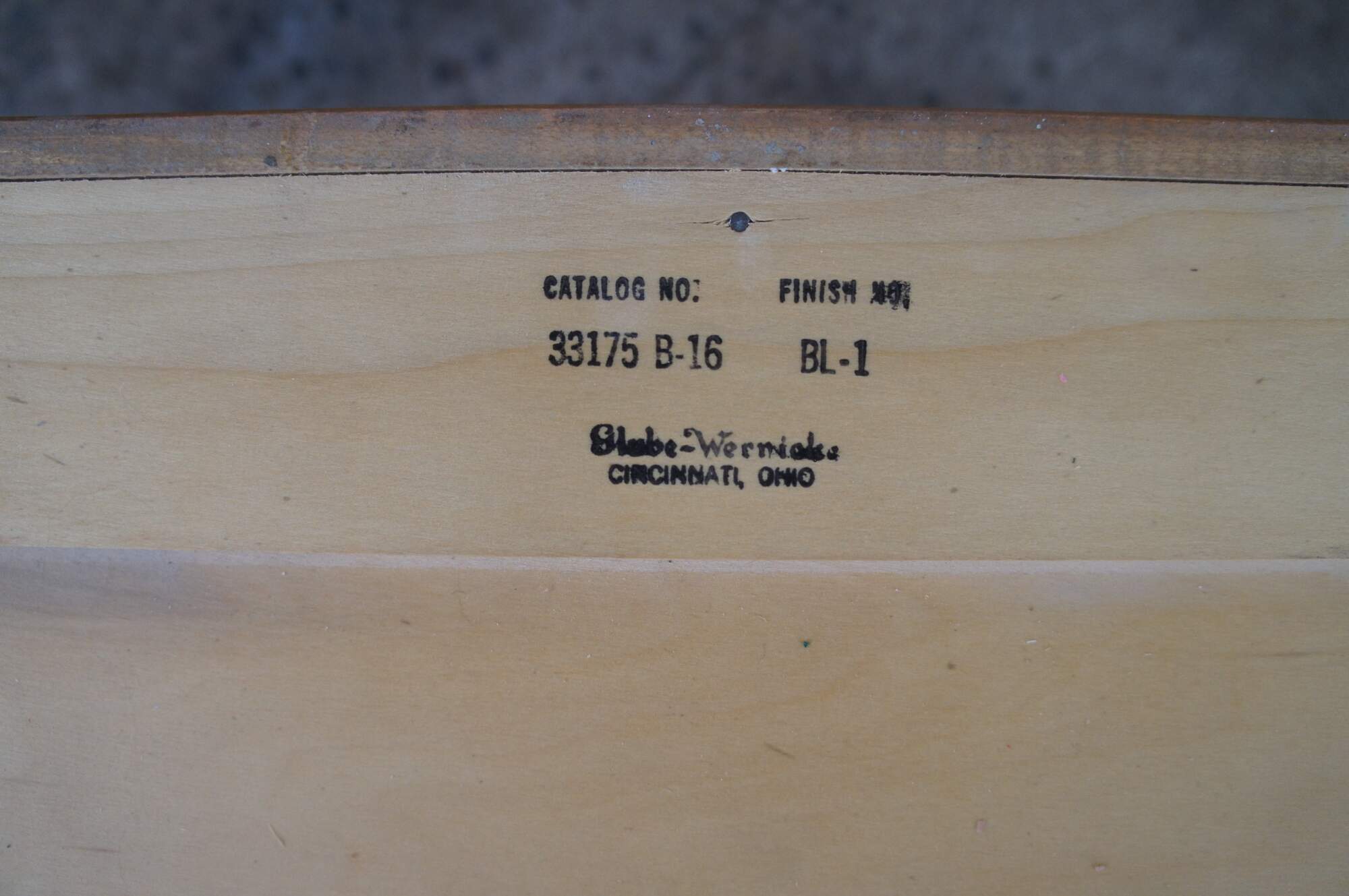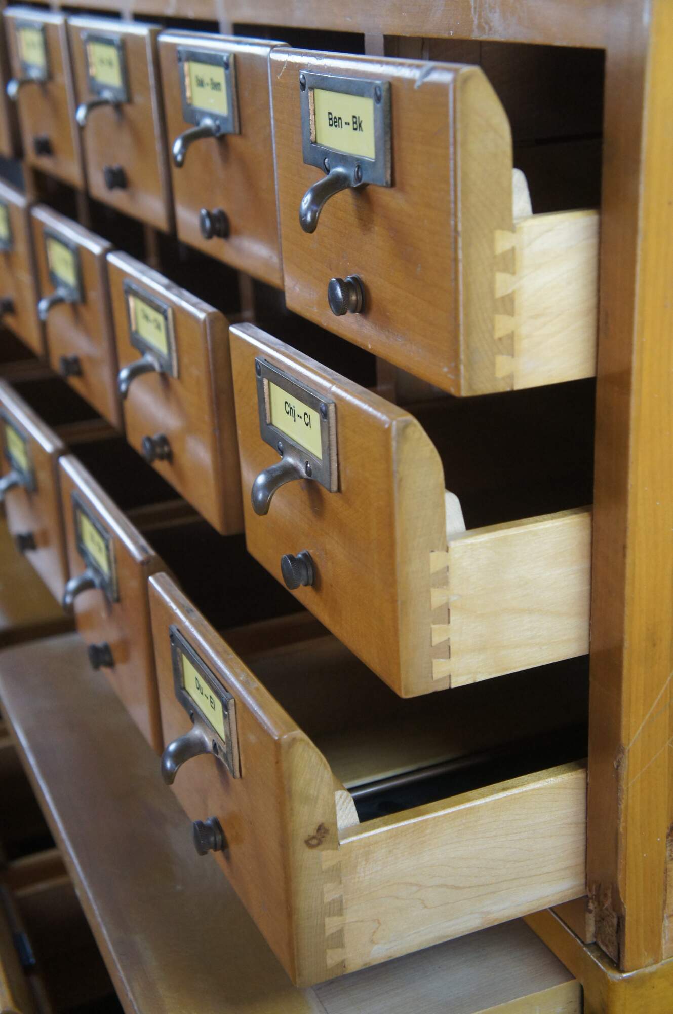 Mid century 5 piece stacking card catalog cabinet by Globe Wernicke. This industrial apothecary style cabinet features two 15 drawer sections flanked by two central pull out shelves. In the past was used at the Archie Sherer Company.