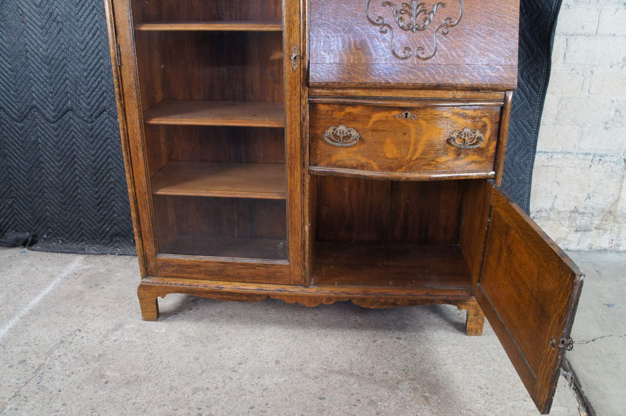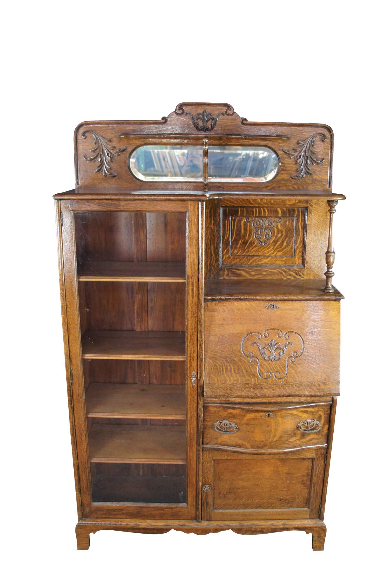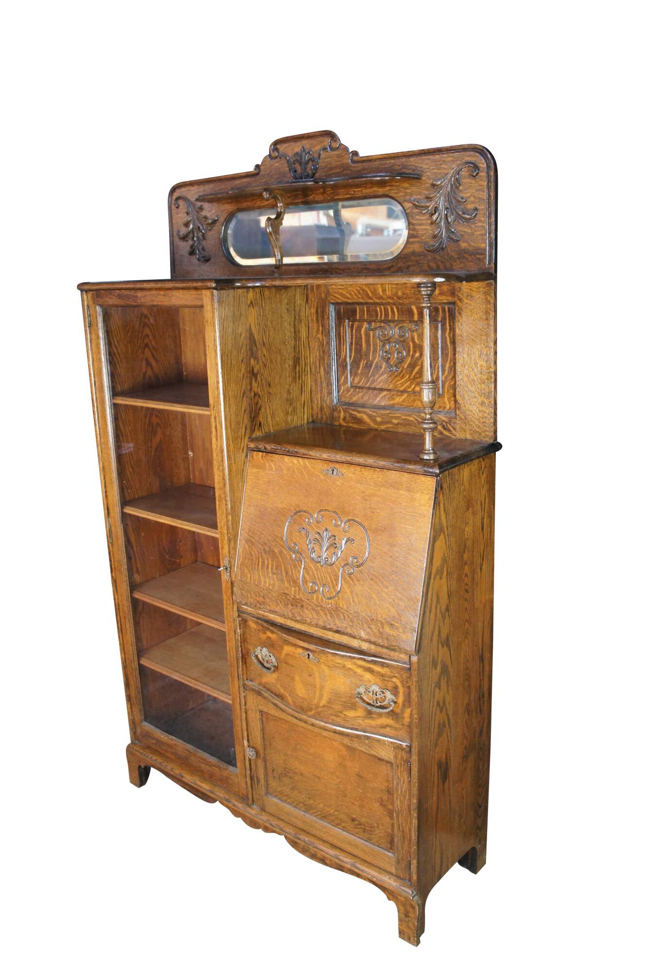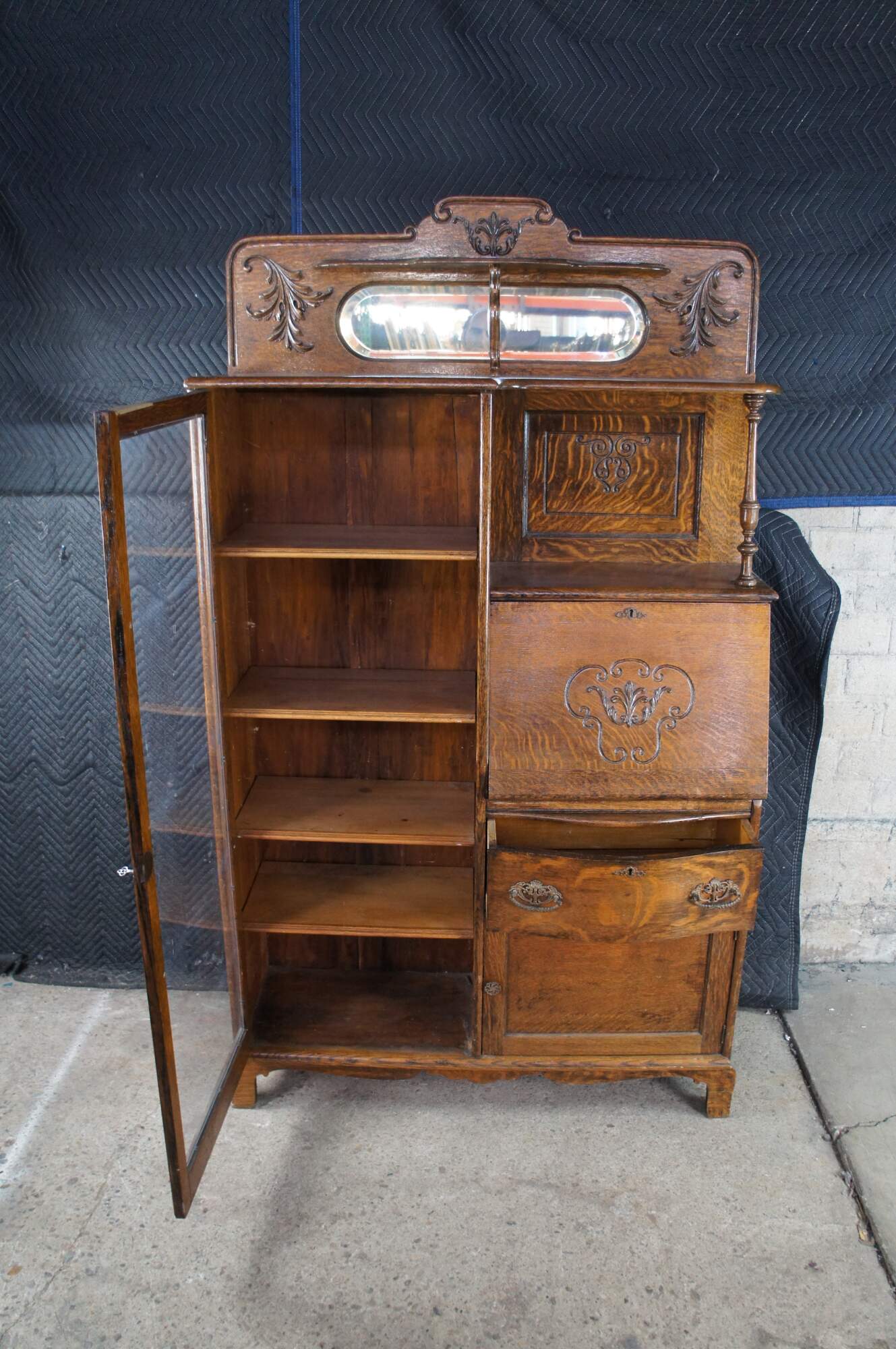 Antique Victorian side by side / secretary desk / bookcase / display case. Made of quartersawn oak featuring Art Nouveau styling with curio cabinet next to a drop front secretary that opens to writing surface with multiple cubbies and a drawer. The top portion of this cabinet features a tiered etagere of shelves with beveled oval mirror and carved acanthus accents