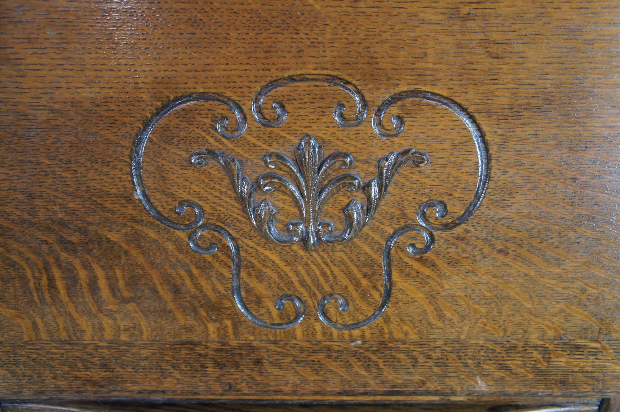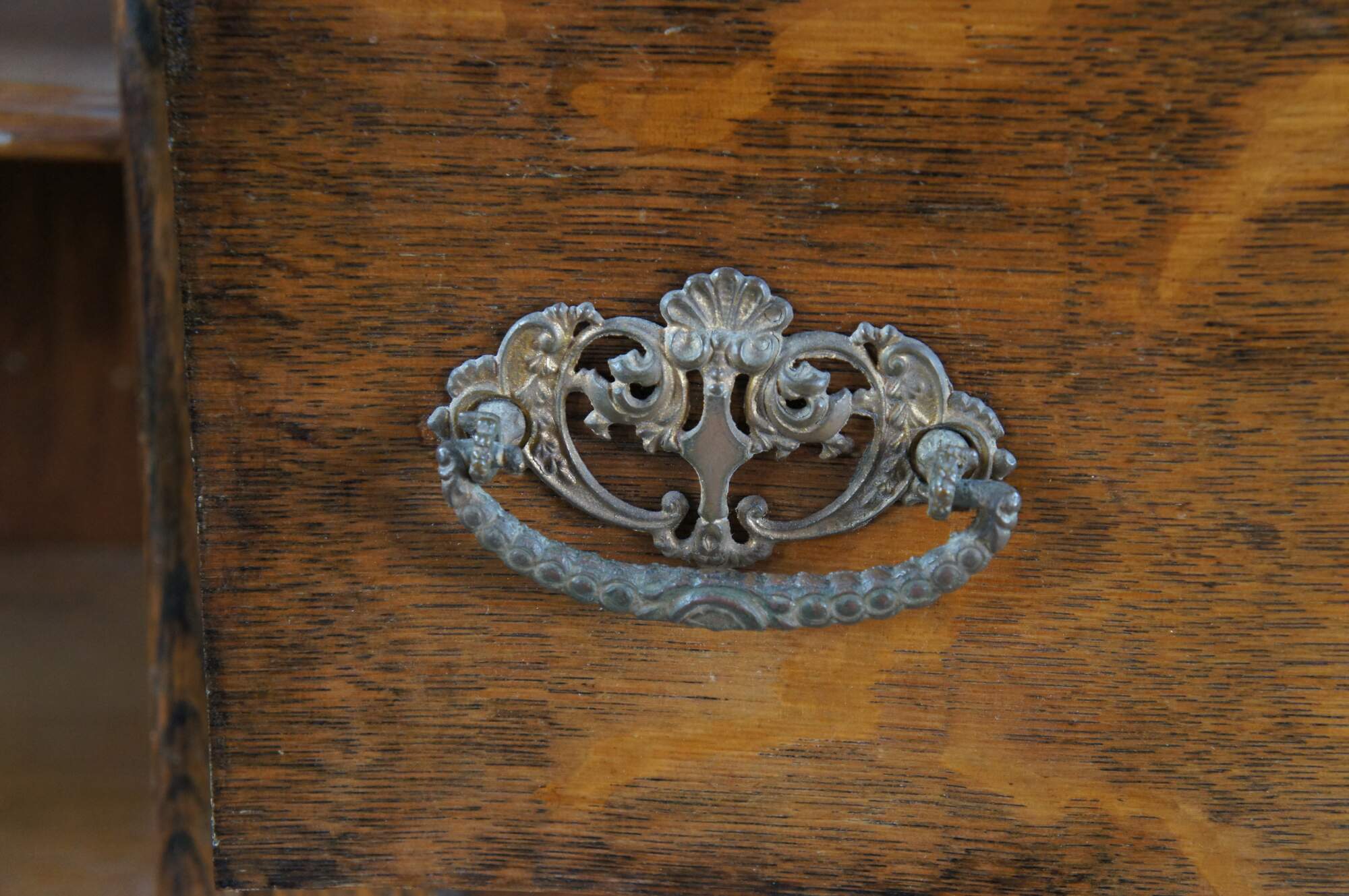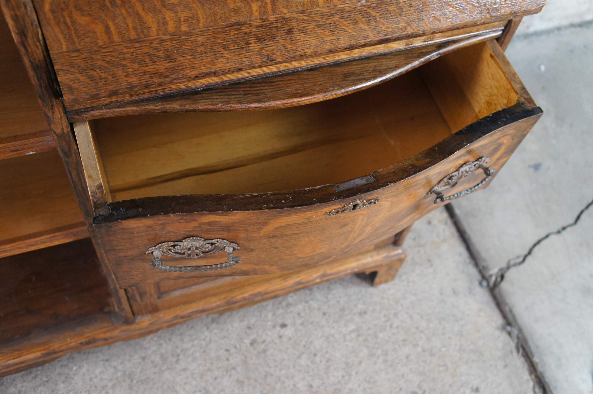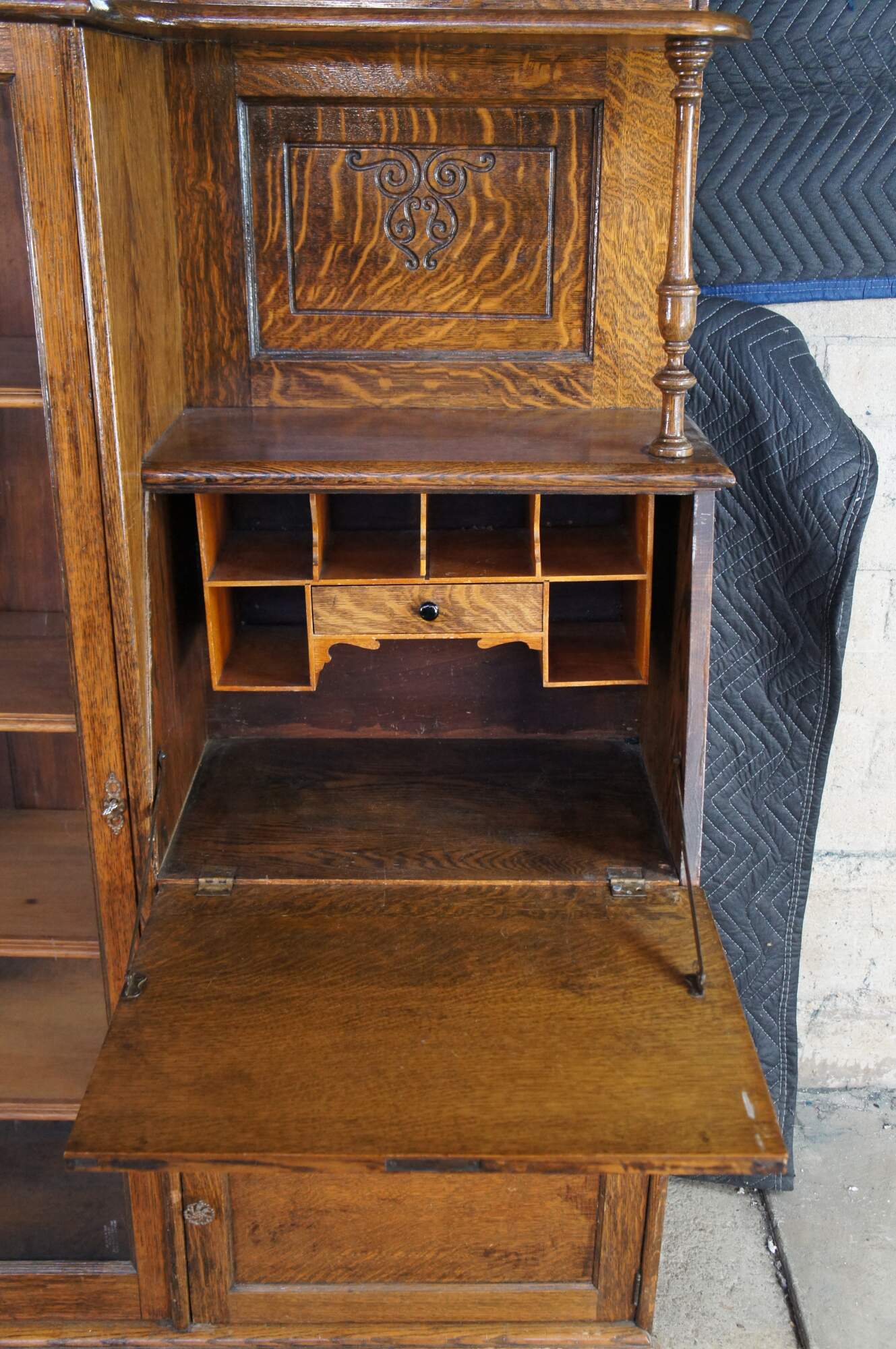 Antique Victorian side by side / secretary desk / bookcase / display case. Made of quartersawn oak featuring Art Nouveau styling with curio cabinet next to a drop front secretary that opens to writing surface with multiple cubbies and a drawer. The top portion of this cabinet features a tiered etagere of shelves with beveled oval mirror and carved acanthus accents