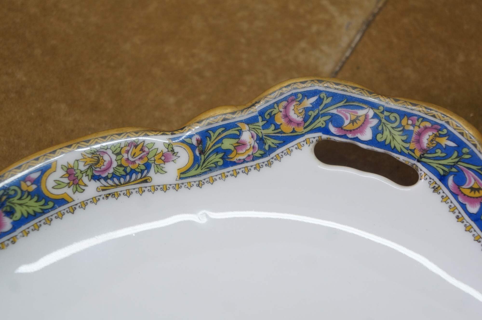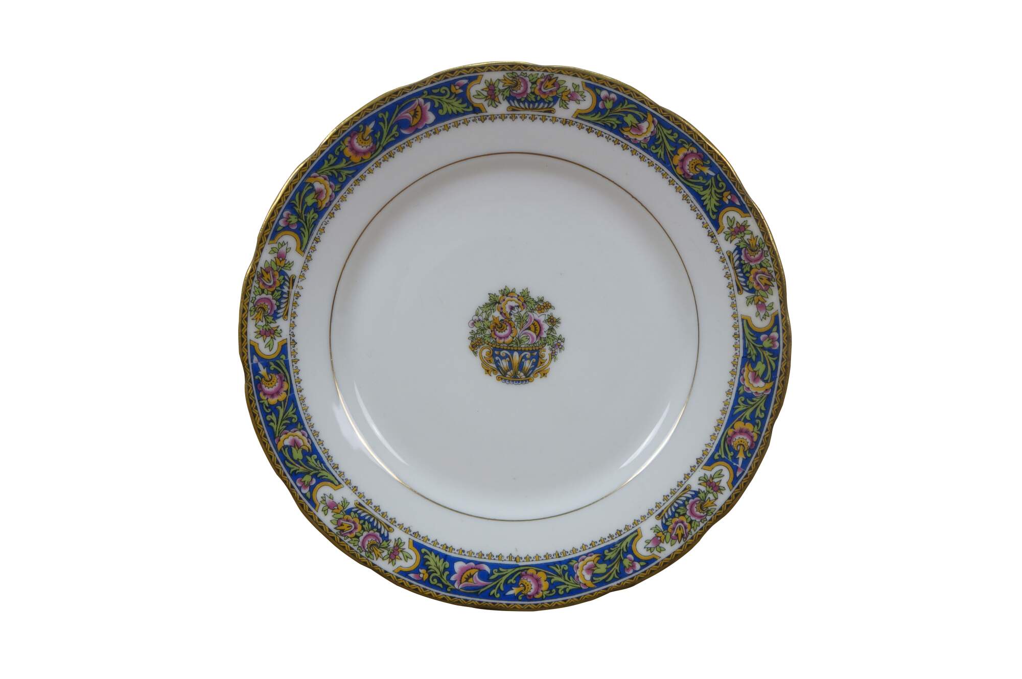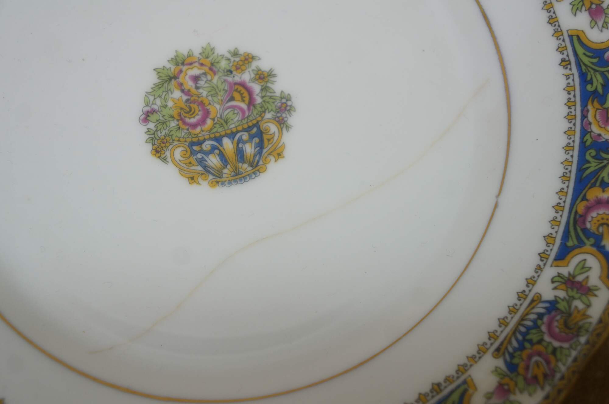 11 pieces of early 20th century Art Deco French Limoges porcelain plates by T.L.B. (Touze, Lemaître Frères & Blancher). White porcelain with gold gilt details and folk art style floral pattern in blue, pink, and yellow. Includes: 1 Serving Plate, 5 Bread Plates, 5 Saucers.