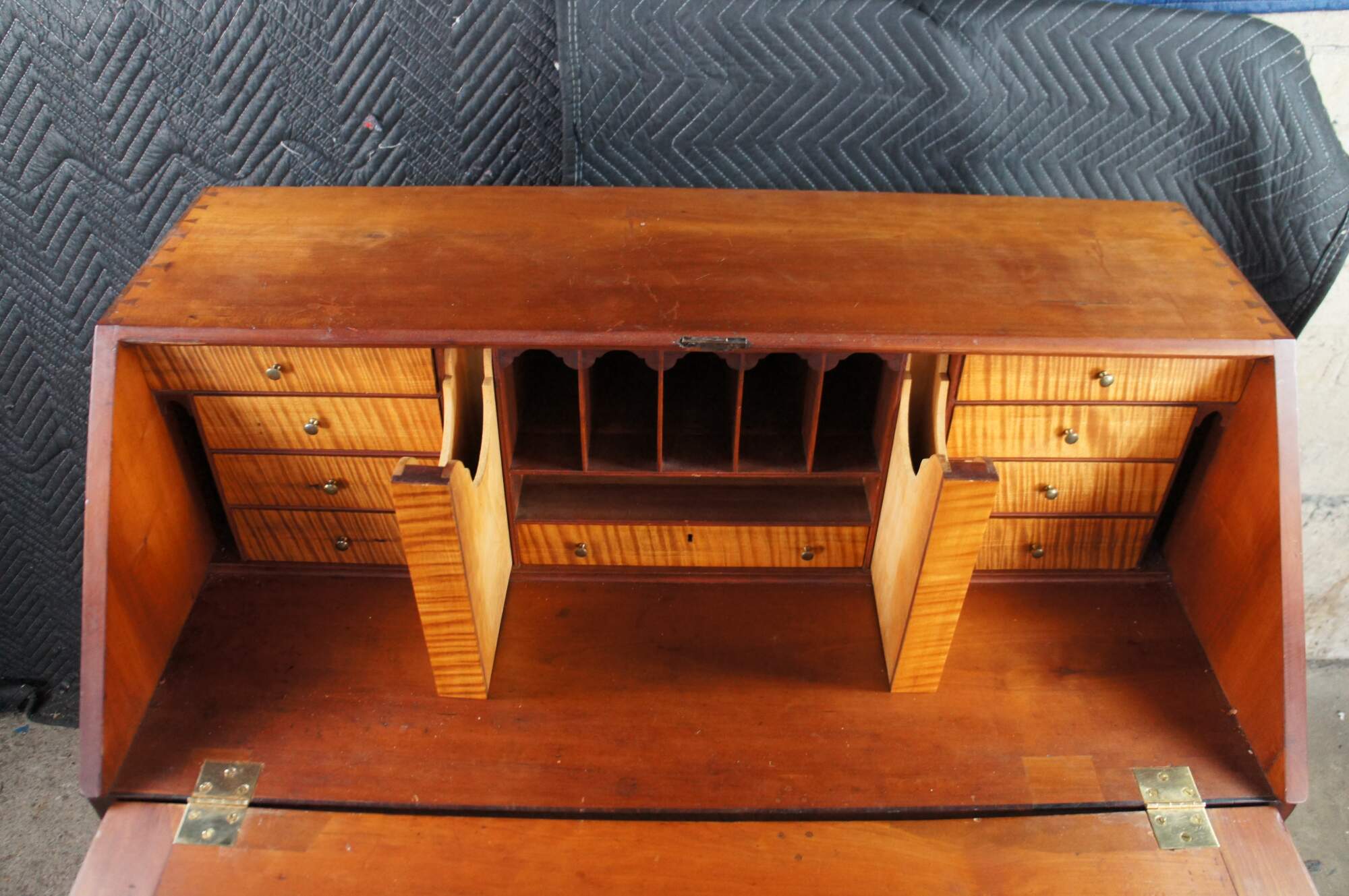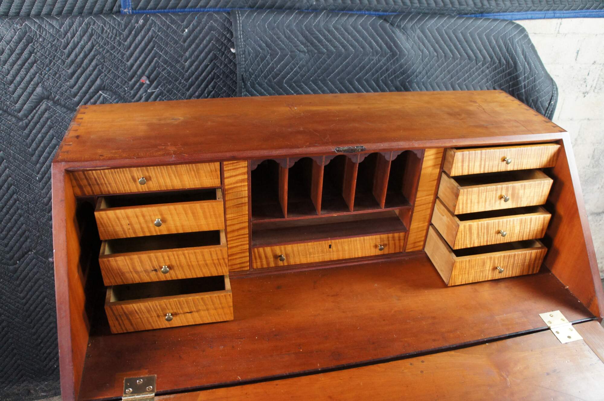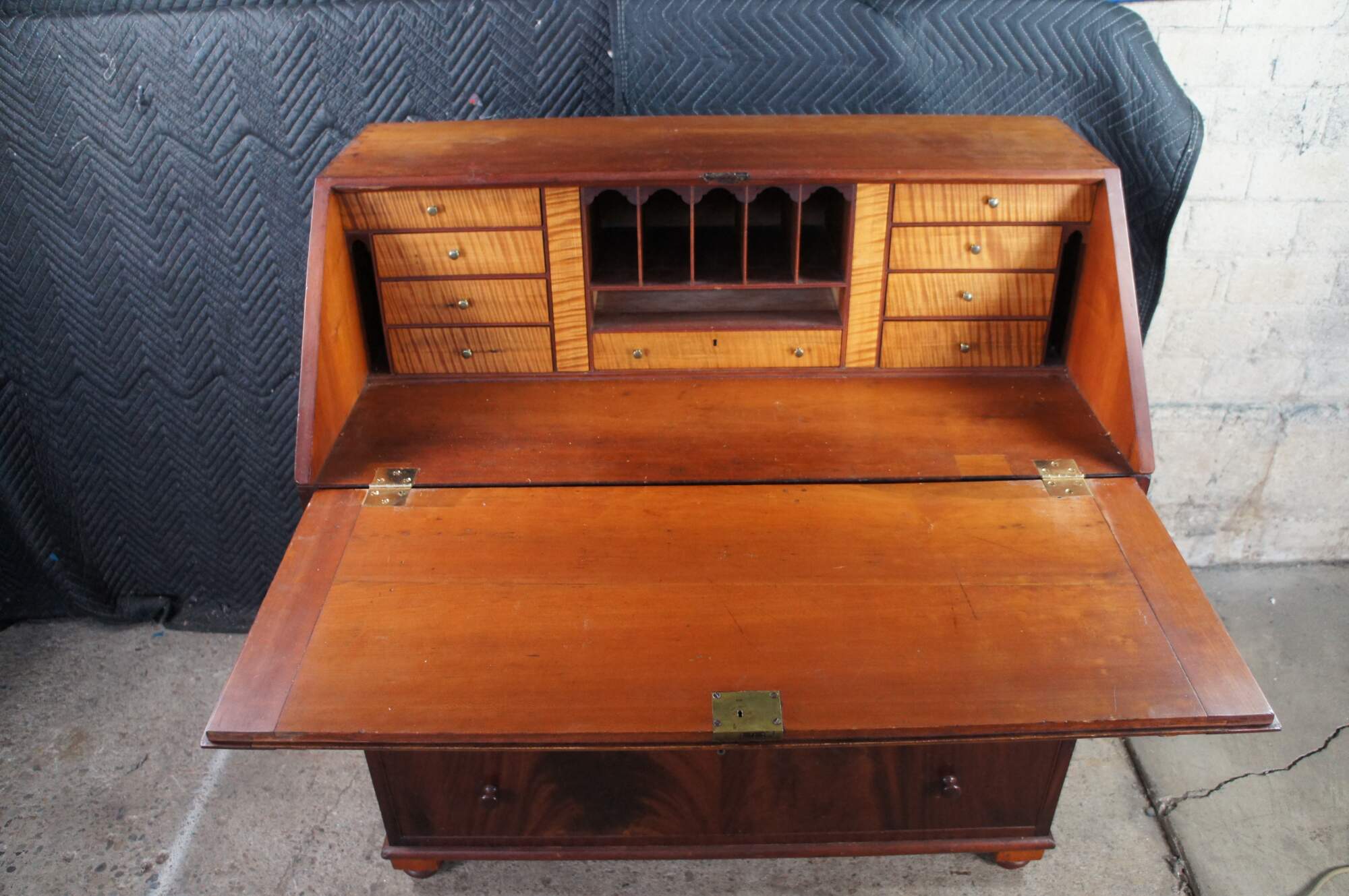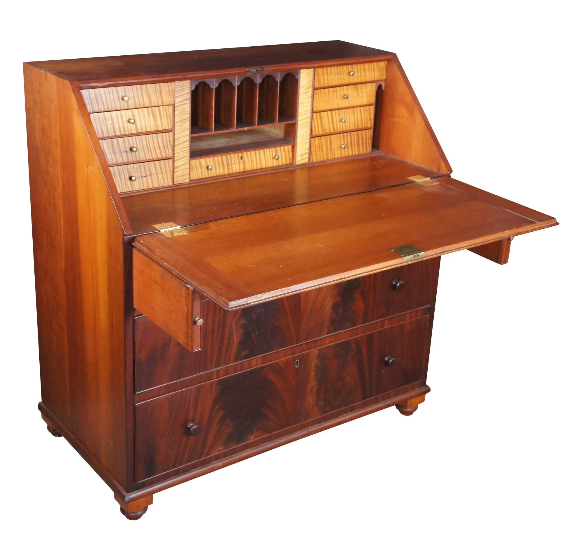 Exquisite antique secretary writing storage desk. Made of flame mahogany featuring Georgian styling with three large dovetailed drawers and a drop front that opens to multiple drawers, cubbies and hidden compartments with a stunning curly maple veneer.