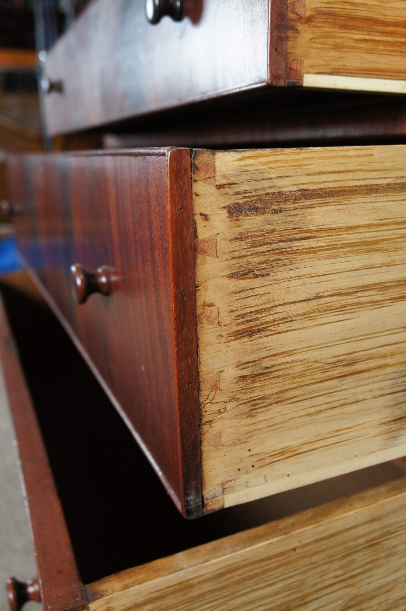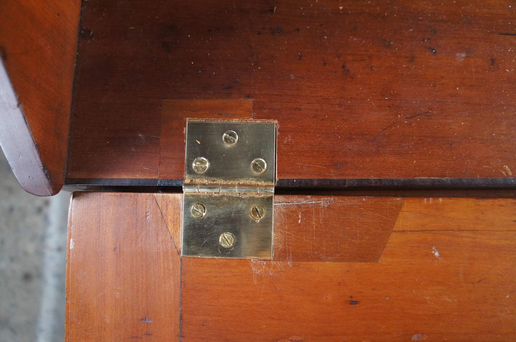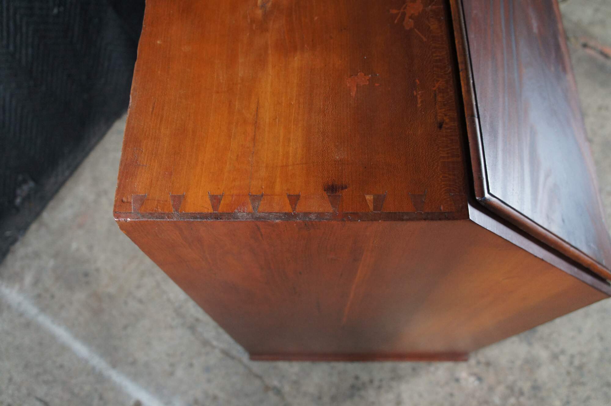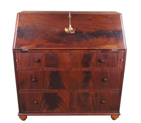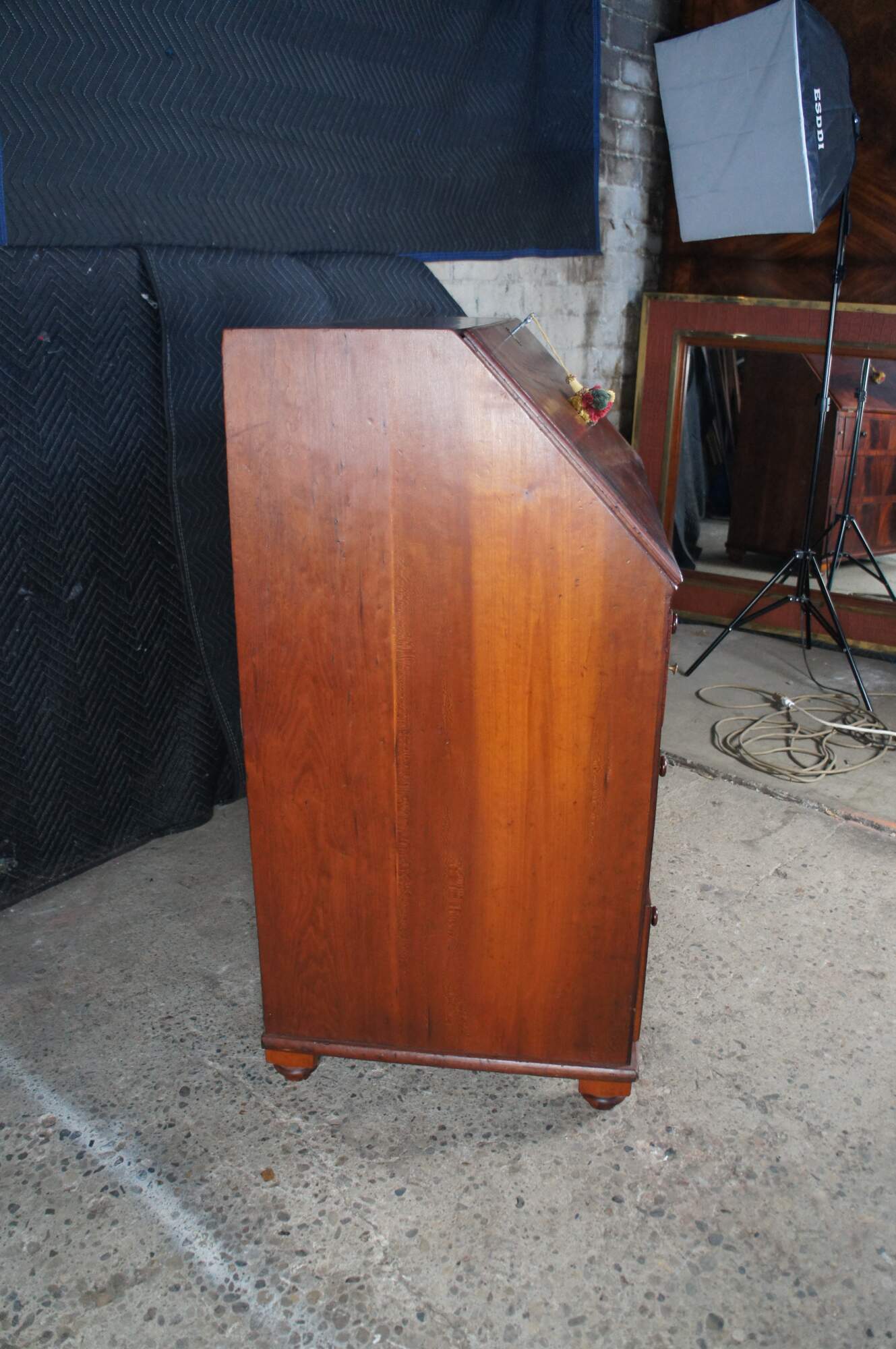 Exquisite antique secretary writing storage desk. Made of flame mahogany featuring Georgian styling with three large dovetailed drawers and a drop front that opens to multiple drawers, cubbies and hidden compartments with a stunning curly maple veneer.