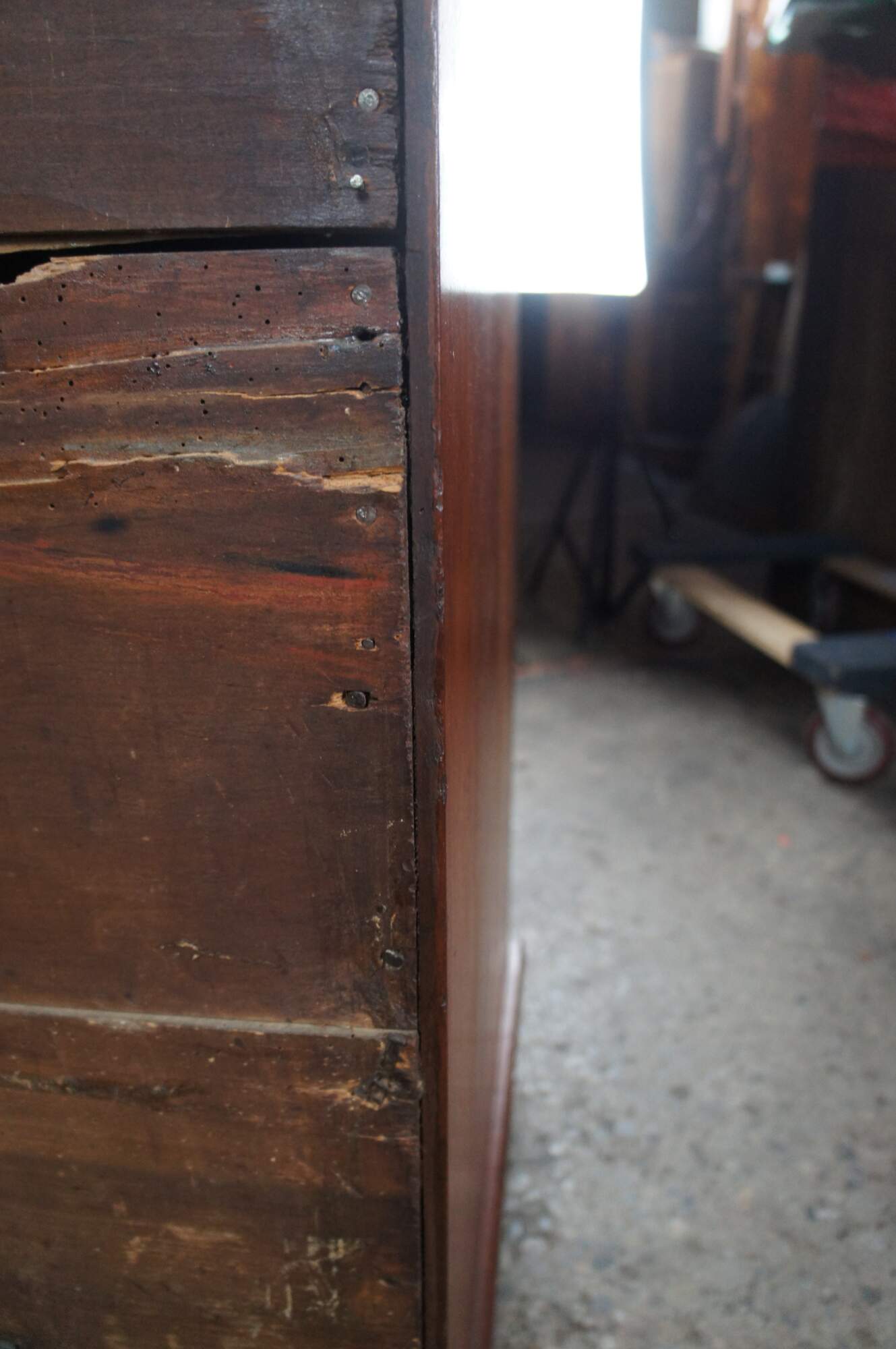 Structurally solid, fading, veneer damage / splitting, alligatoring, marking / scuffing / staining, some past repairs / wood fills, replaced interior hinges, missing one interior drawer, slight warping to door, key works on top and two bottom drawers but top drawer lock seems stuck, no interior key.