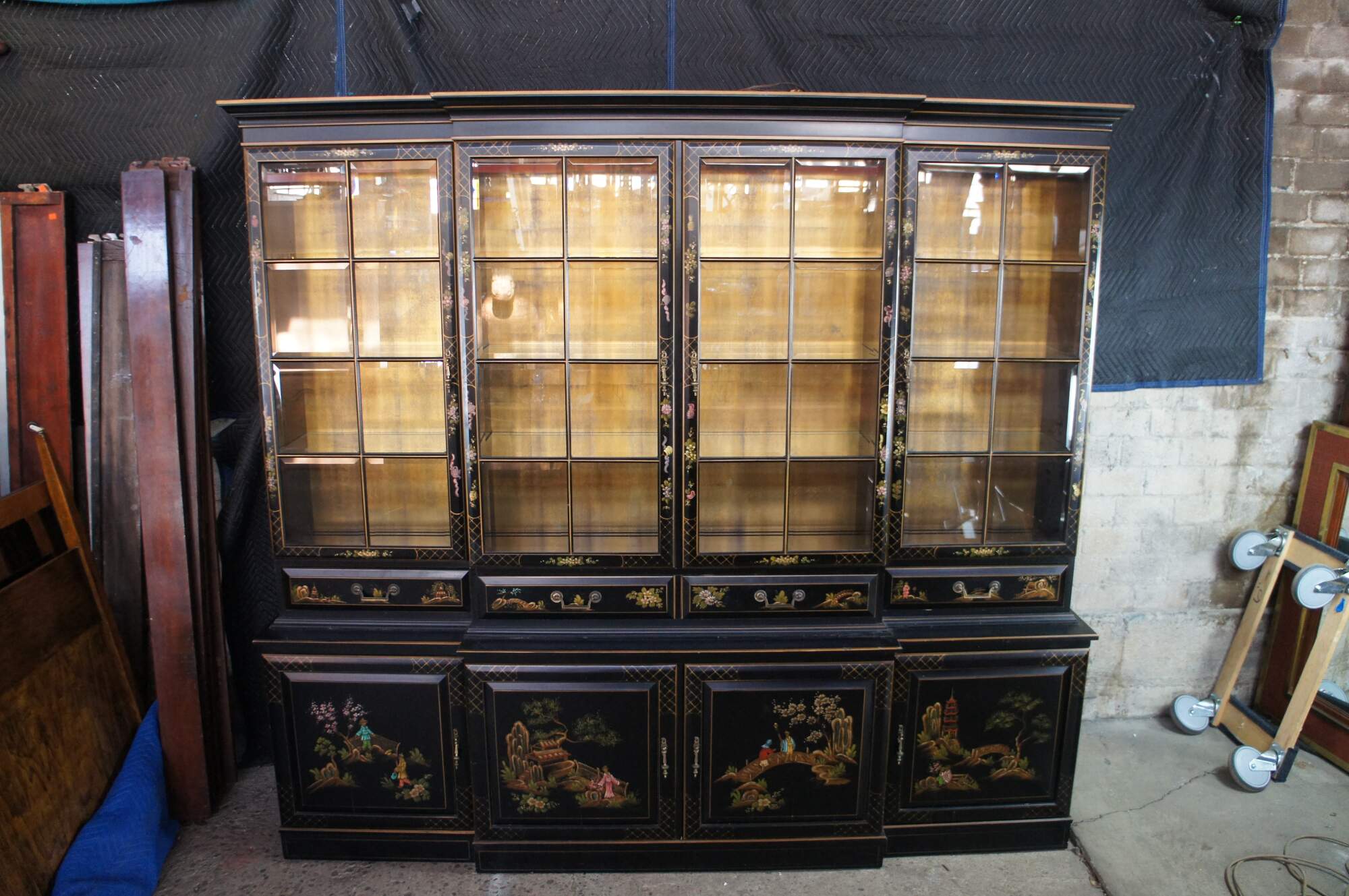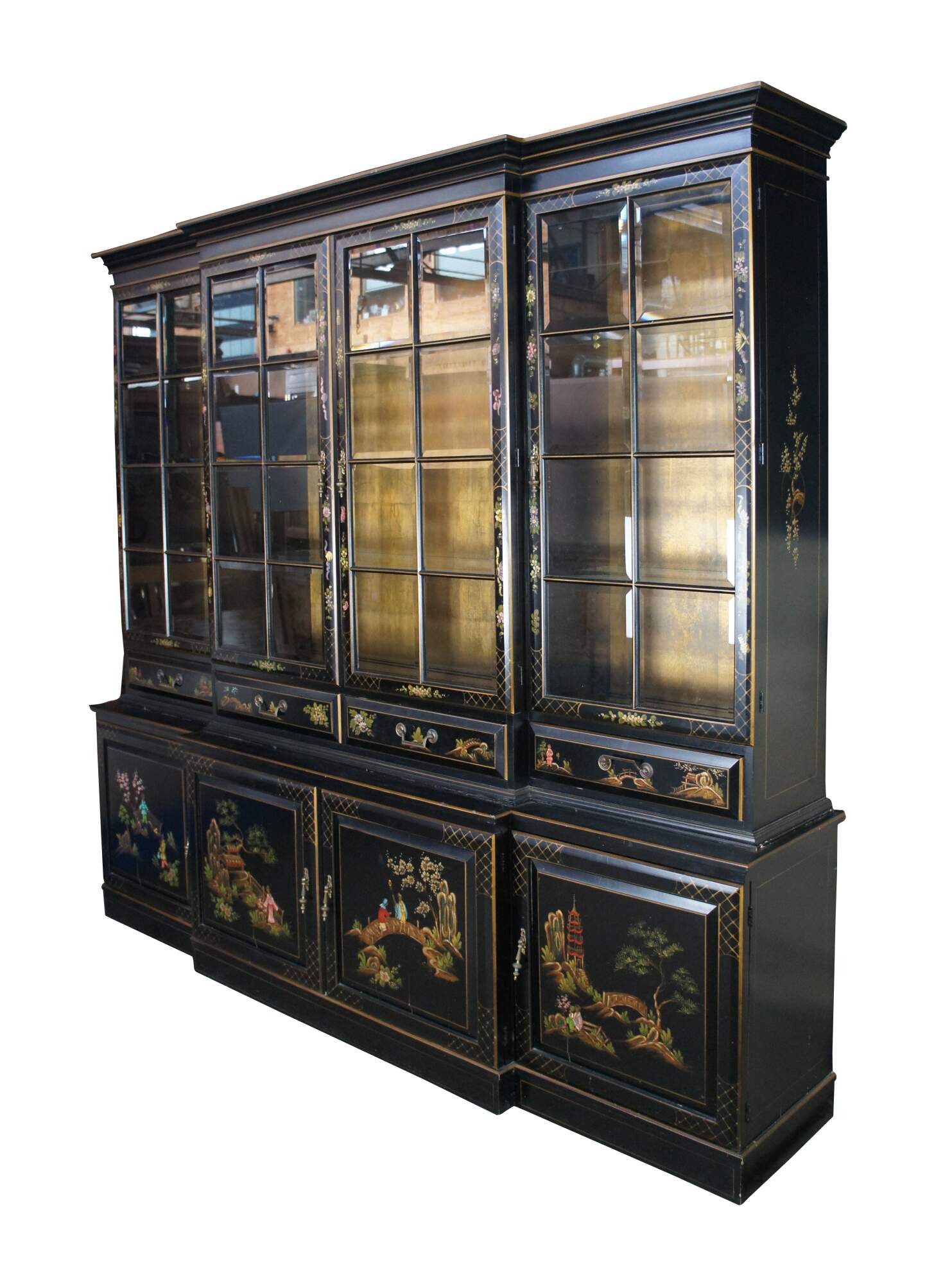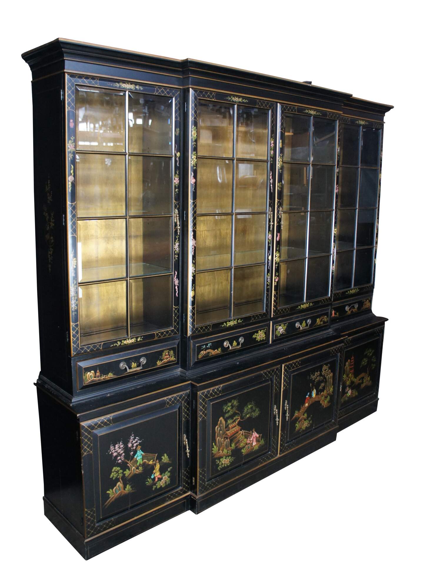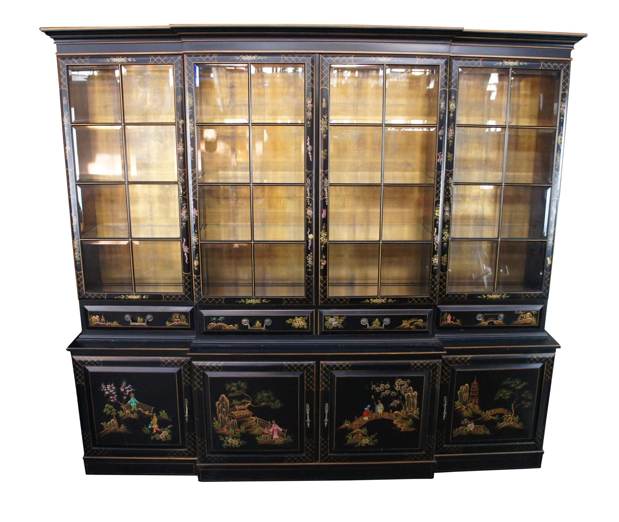 Vintage Union National breakfront china cabinet featuring black lacquer with four hand painted Chinoiserie scenes. One with a two gardners under a flowering tree; Another showing a Geisha, near a home, under a large gnarled pine; Two more figures on a bridge with a lantern; and a Pagoda tower with bridge, gnarled pine and figure in the garden. Signed by artist lower right.
