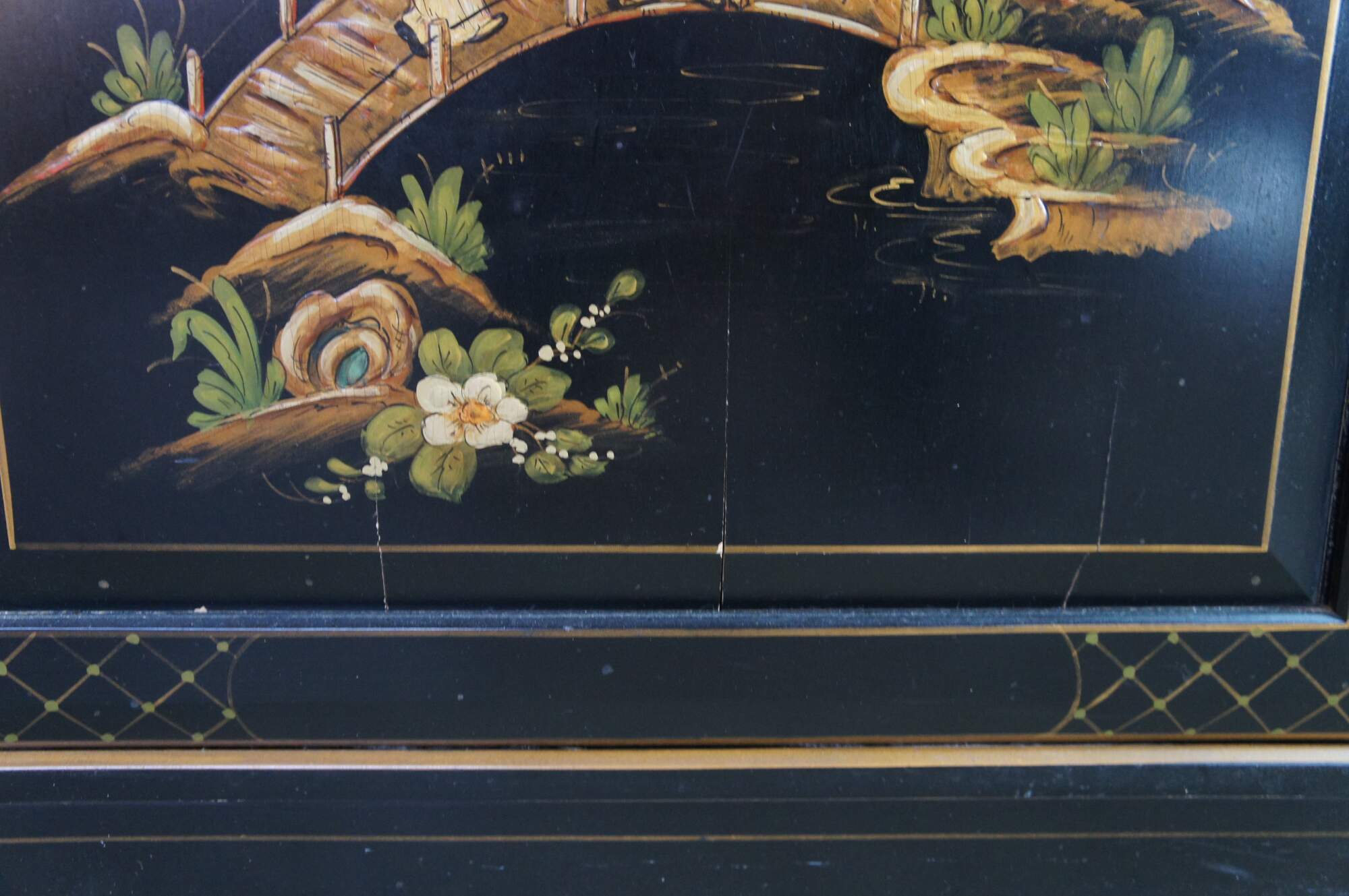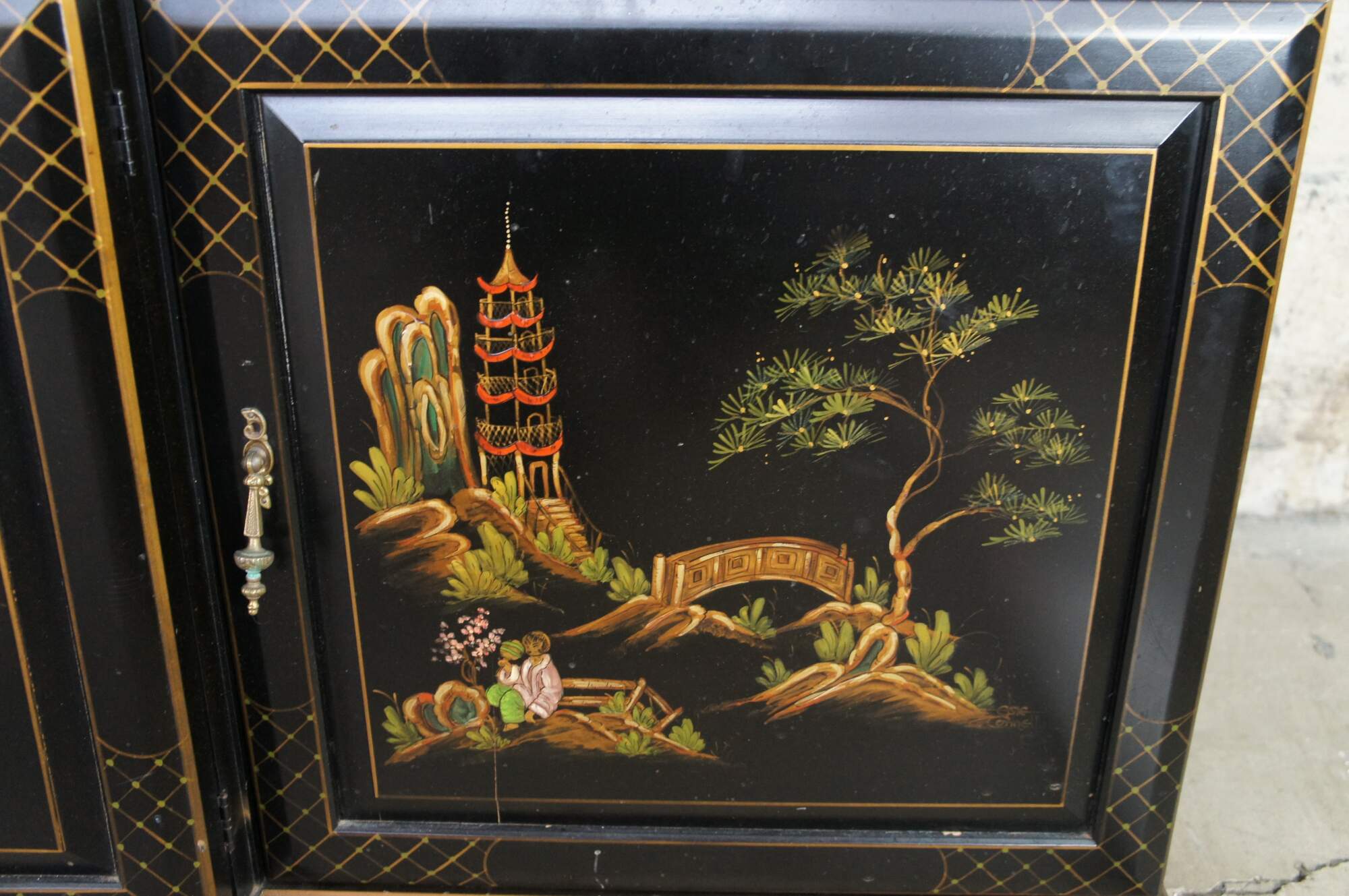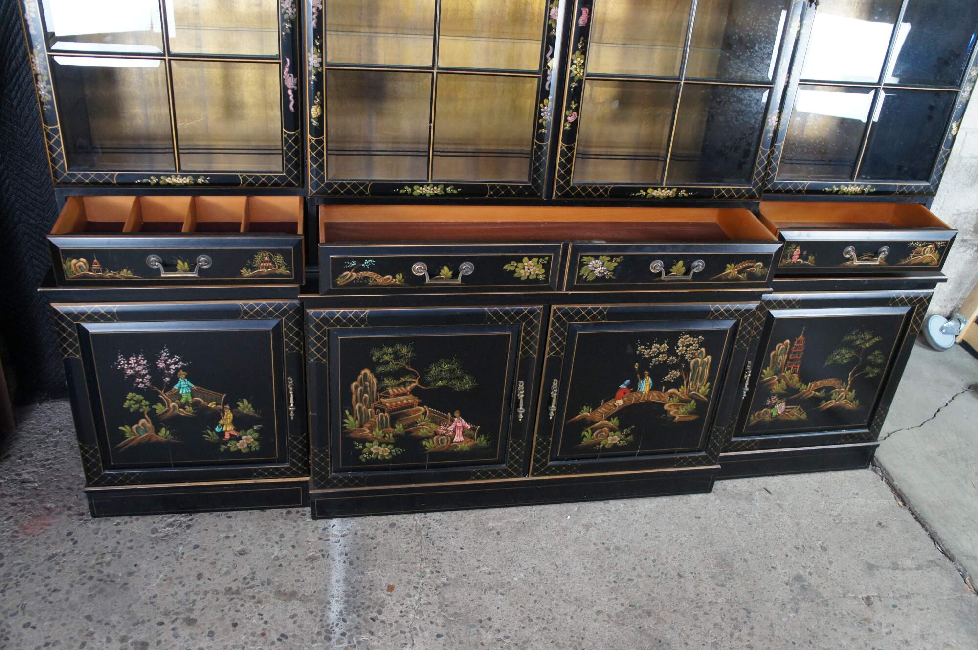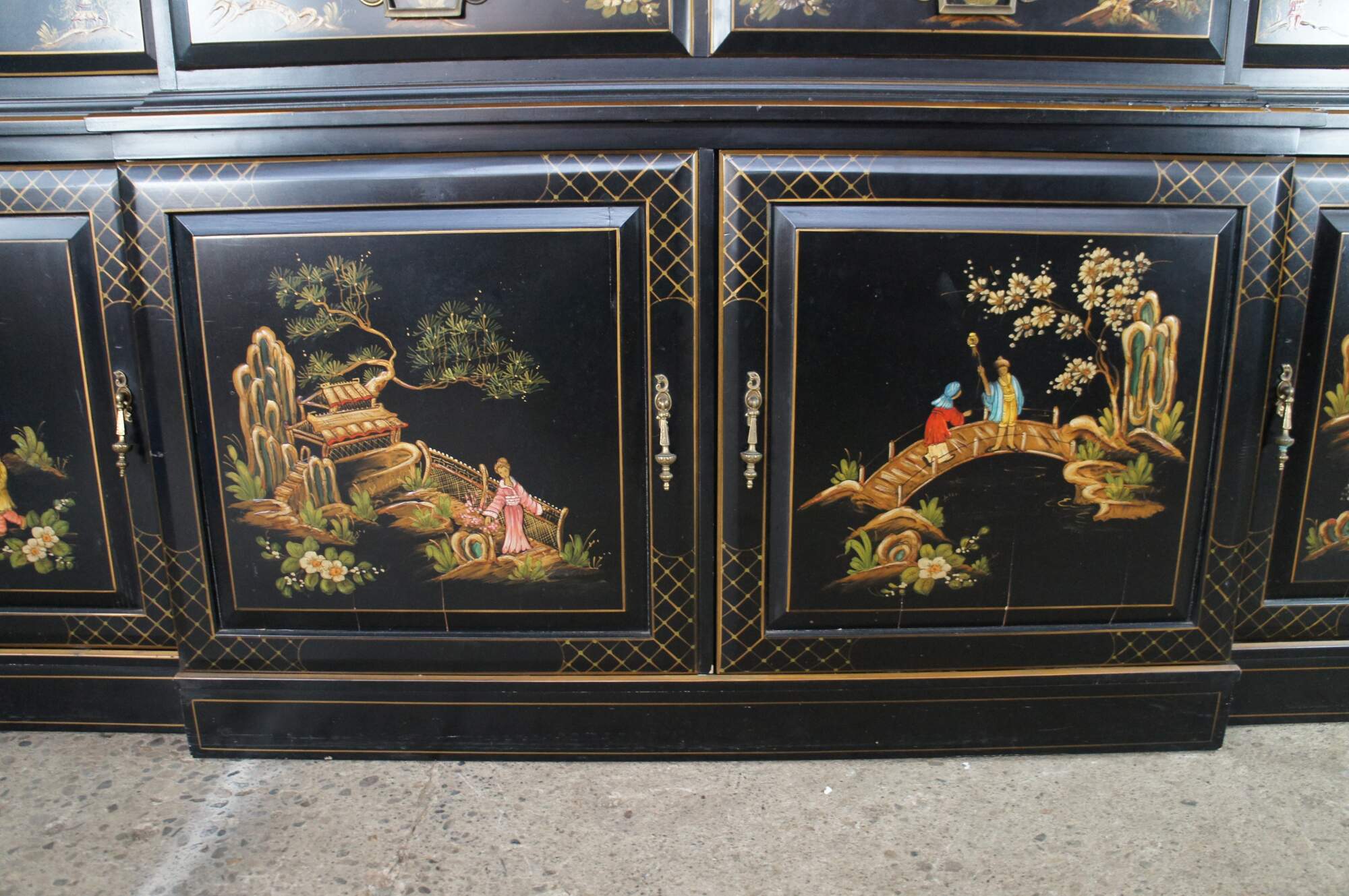 Vintage Union National breakfront china cabinet featuring black lacquer with four hand painted Chinoiserie scenes. One with a two gardners under a flowering tree; Another showing a Geisha, near a home, under a large gnarled pine; Two more figures on a bridge with a lantern; and a Pagoda tower with bridge, gnarled pine and figure in the garden. Signed by artist lower right.