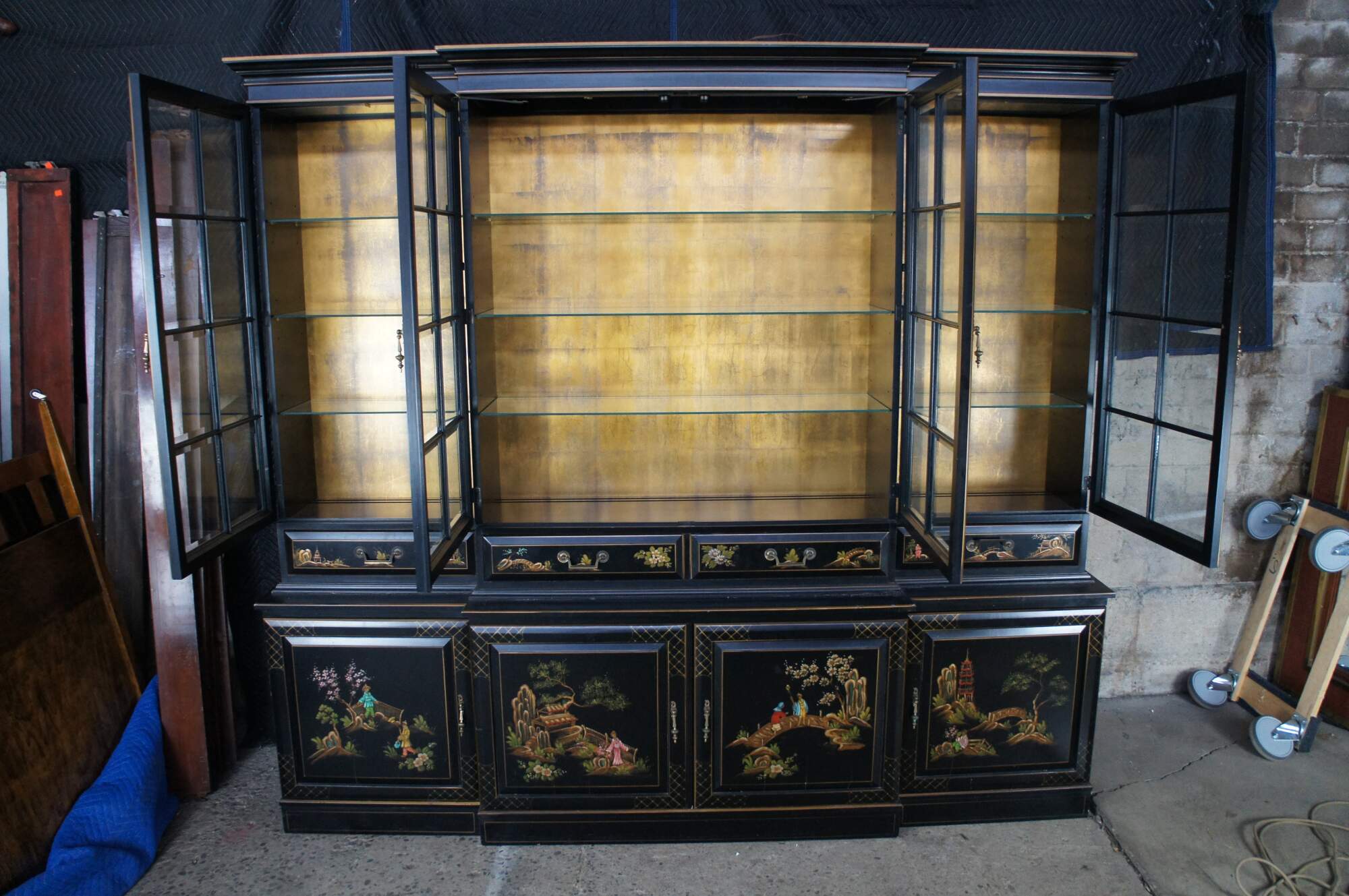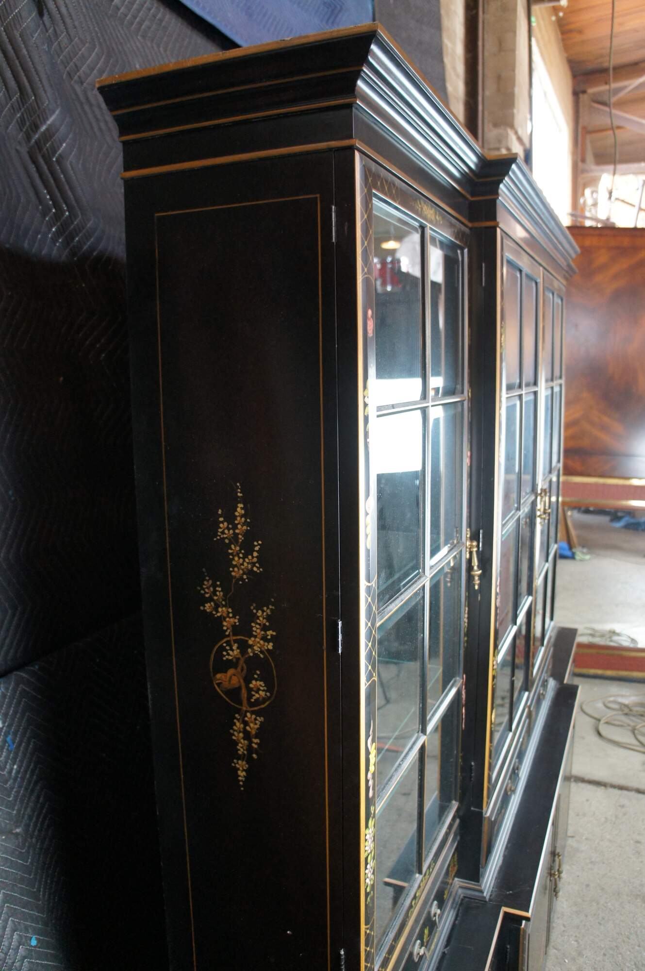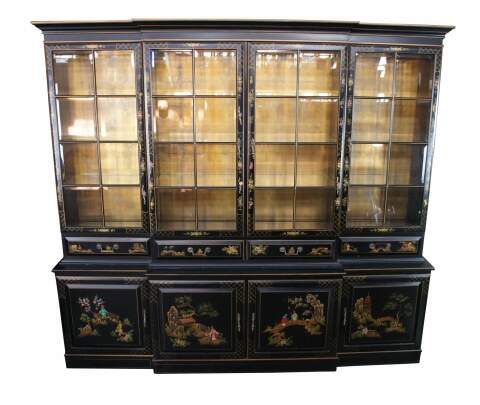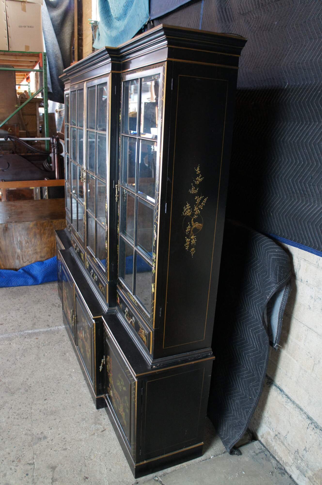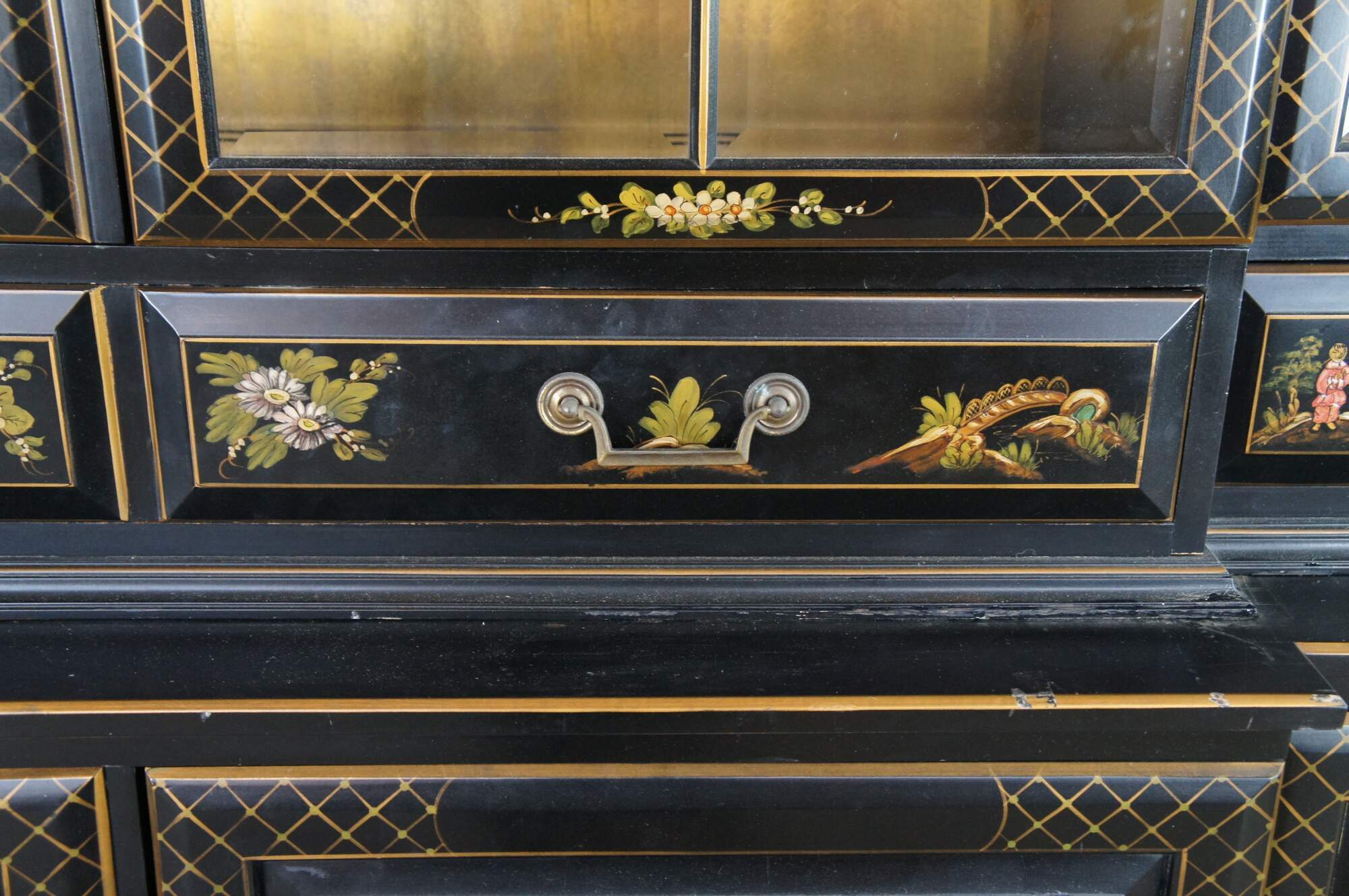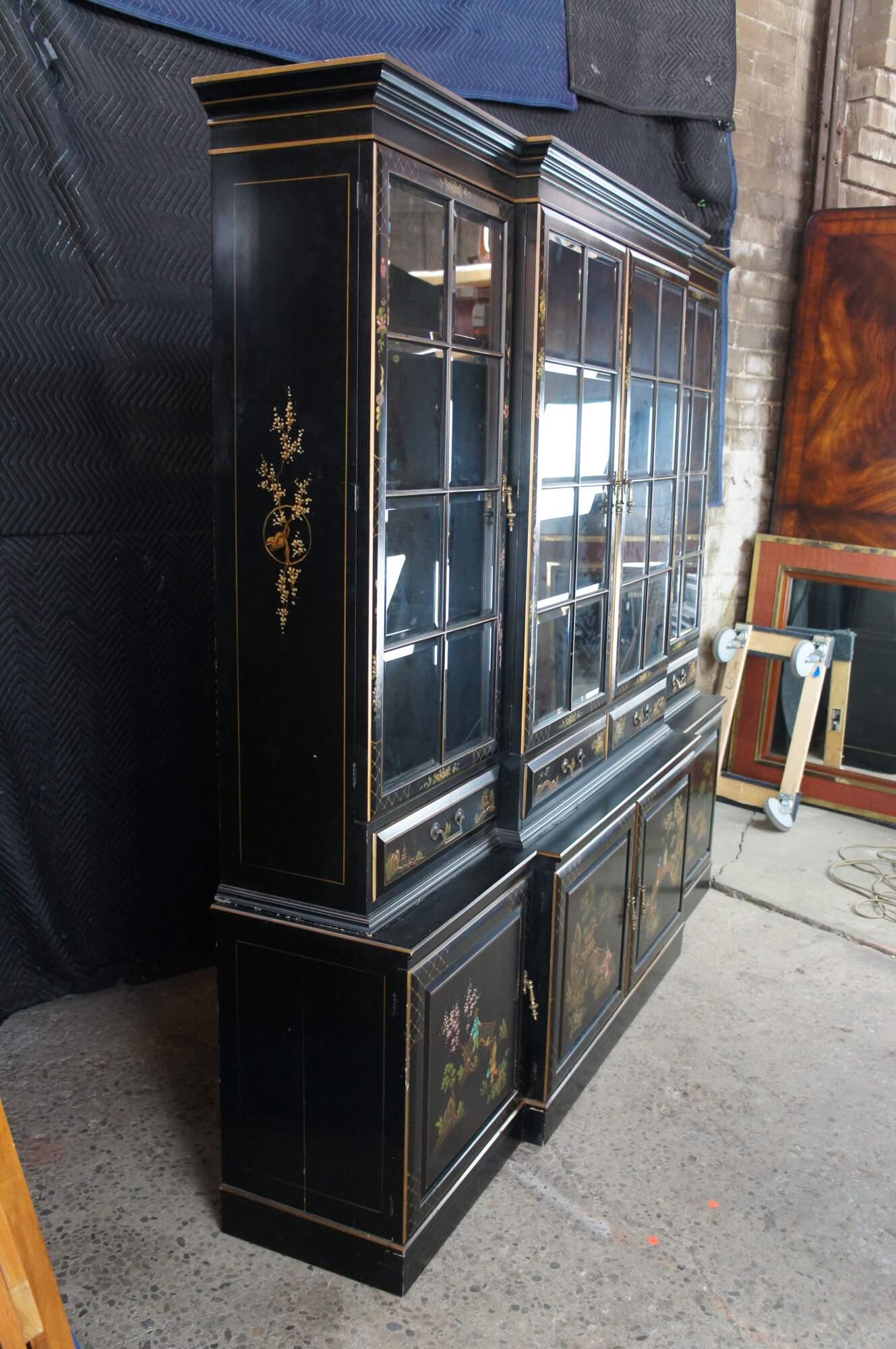 The Union National breakfront was rated as the finest breakfront in the world. In 1980, after flying in the magazines Lear jet to inspect the factory and the breakfront, the publisher of Leaders magazine rated it as the finest available anywhere in the world. If you've never heard of Leaders magazine, don't be surprised because if you aren't one of the worlds leaders, you can't even buy a copy. Built of solid maple and finished in hand rubbed black lacquer with 4 panes of hand beveled glass. The whole piece is hand striped in gold with snowflakes, fretwork and scrolls on each panel. To top it off Chinoiserie landscape designs were then hand painted on each door with birds, butterfly's, flowers, figures / geishas and pagodas. Hand Signed along the lower right door by the artist T. Davis. Union National made fewer than 20 of these breakfronts per year while they were in business and even if 2 were ordered with the same description, each would be unique because the artwork was always original
