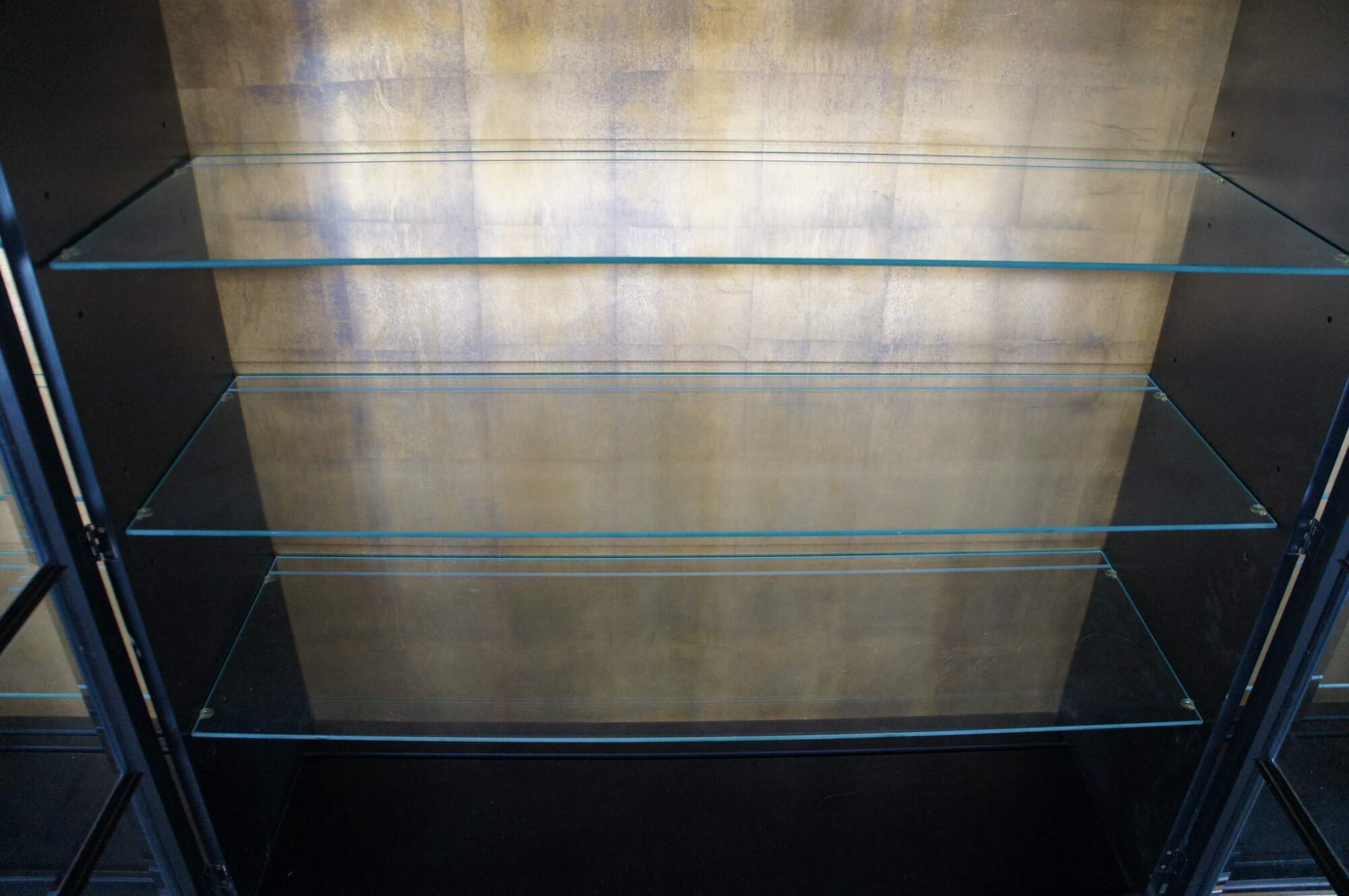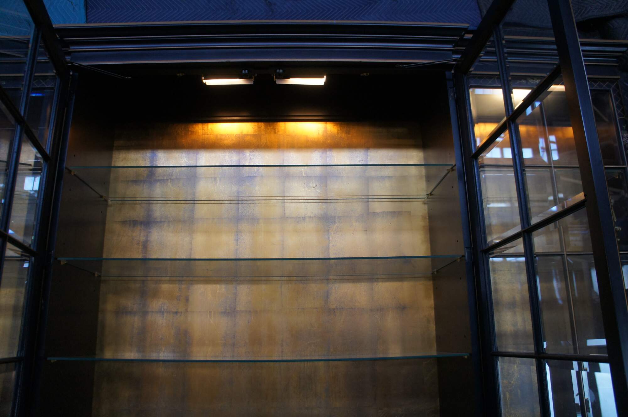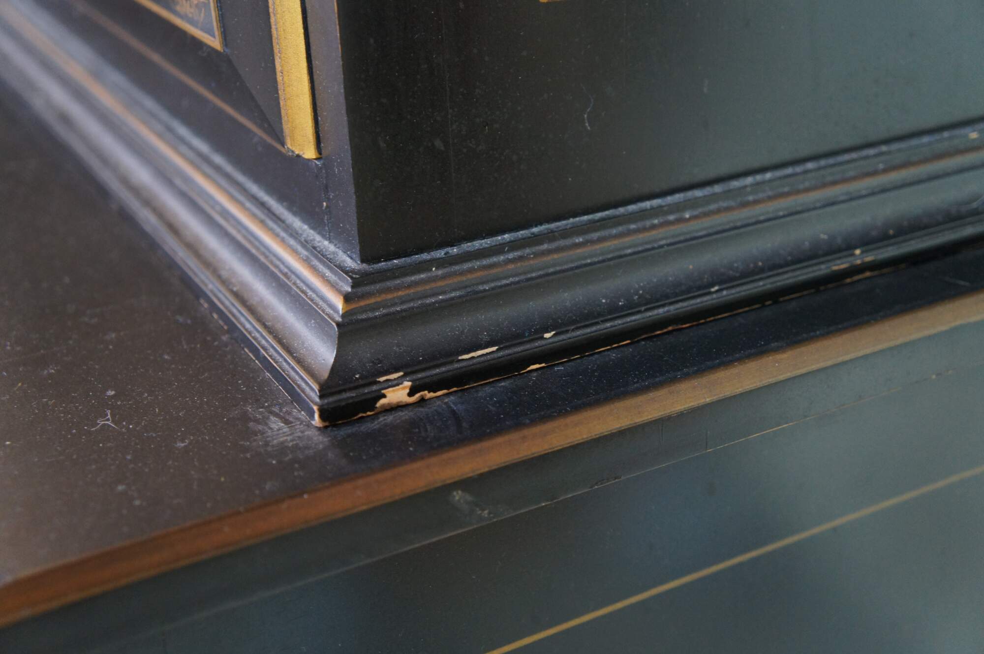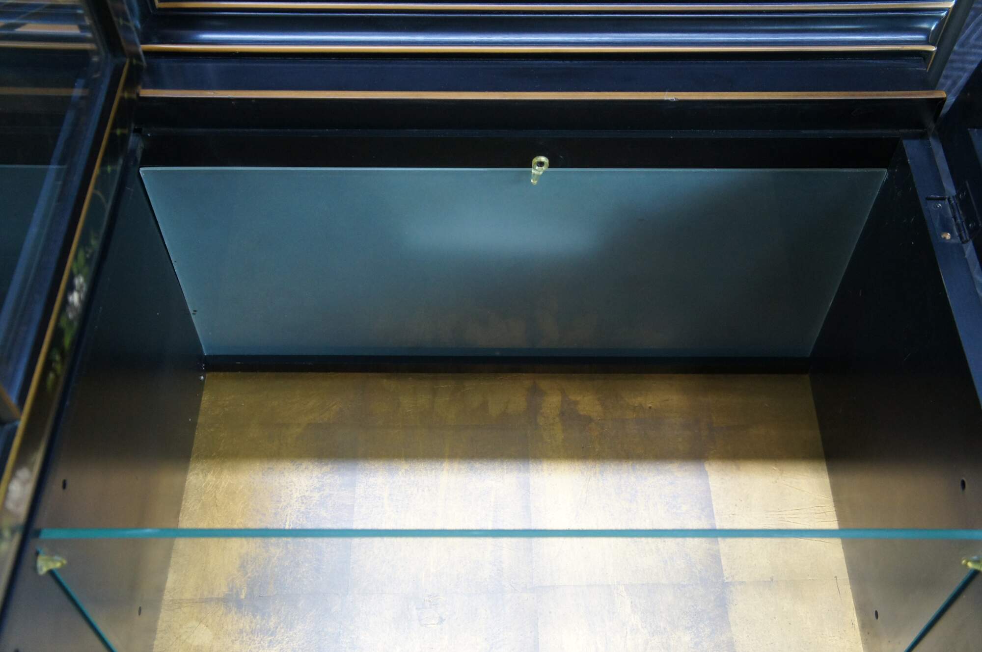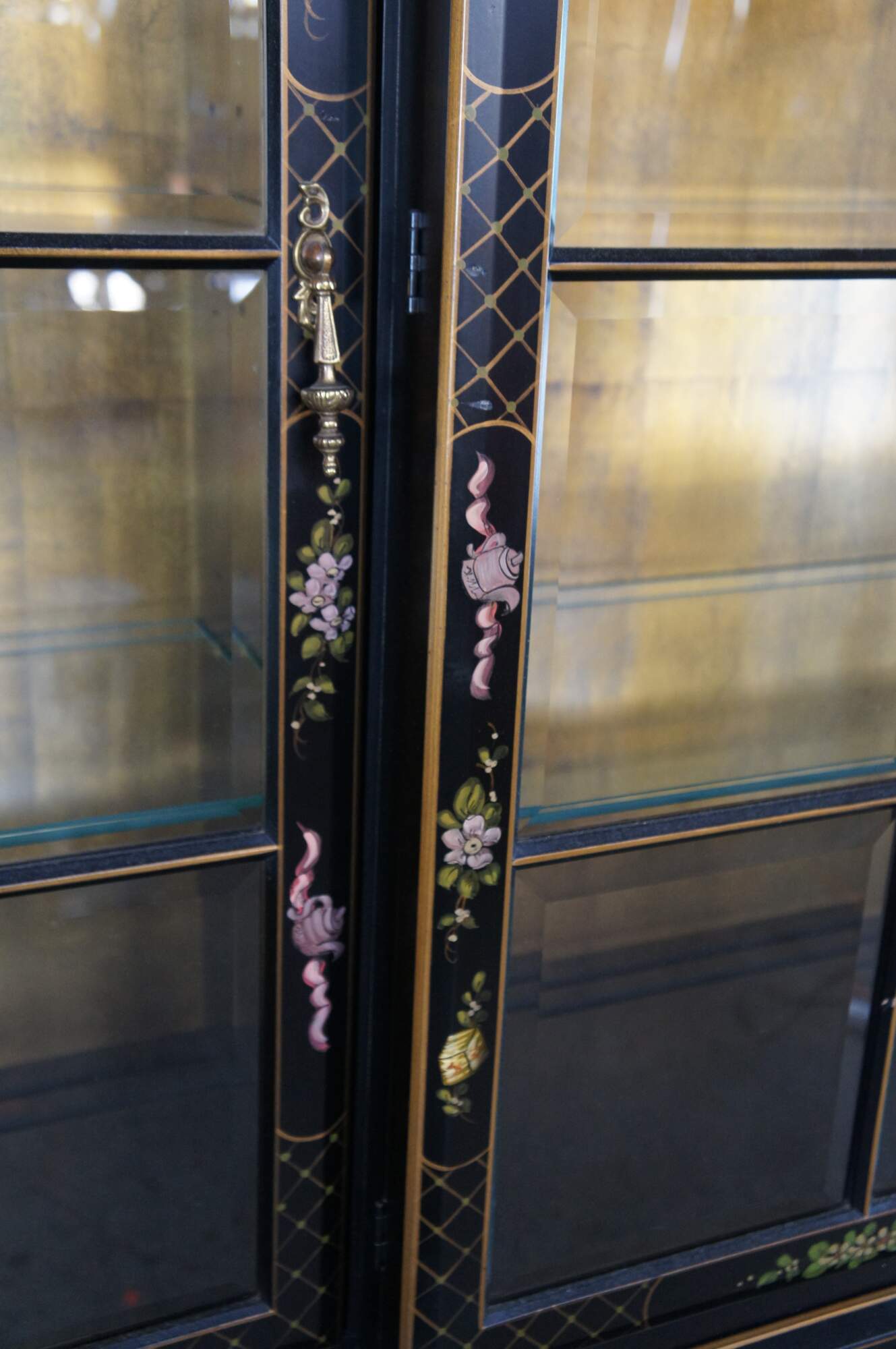 The Union National breakfront was rated as the finest breakfront in the world. In 1980, after flying in the magazines Lear jet to inspect the factory and the breakfront, the publisher of Leaders magazine rated it as the finest available anywhere in the world. If you've never heard of Leaders magazine, don't be surprised because if you aren't one of the worlds leaders, you can't even buy a copy. Built of solid maple and finished in hand rubbed black lacquer with 4 panes of hand beveled glass. The whole piece is hand striped in gold with snowflakes, fretwork and scrolls on each panel. To top it off Chinoiserie landscape designs were then hand painted on each door with birds, butterfly's, flowers, figures / geishas and pagodas. Hand Signed along the lower right door by the artist T. Davis. Union National made fewer than 20 of these breakfronts per year while they were in business and even if 2 were ordered with the same description, each would be unique because the artwork was always original