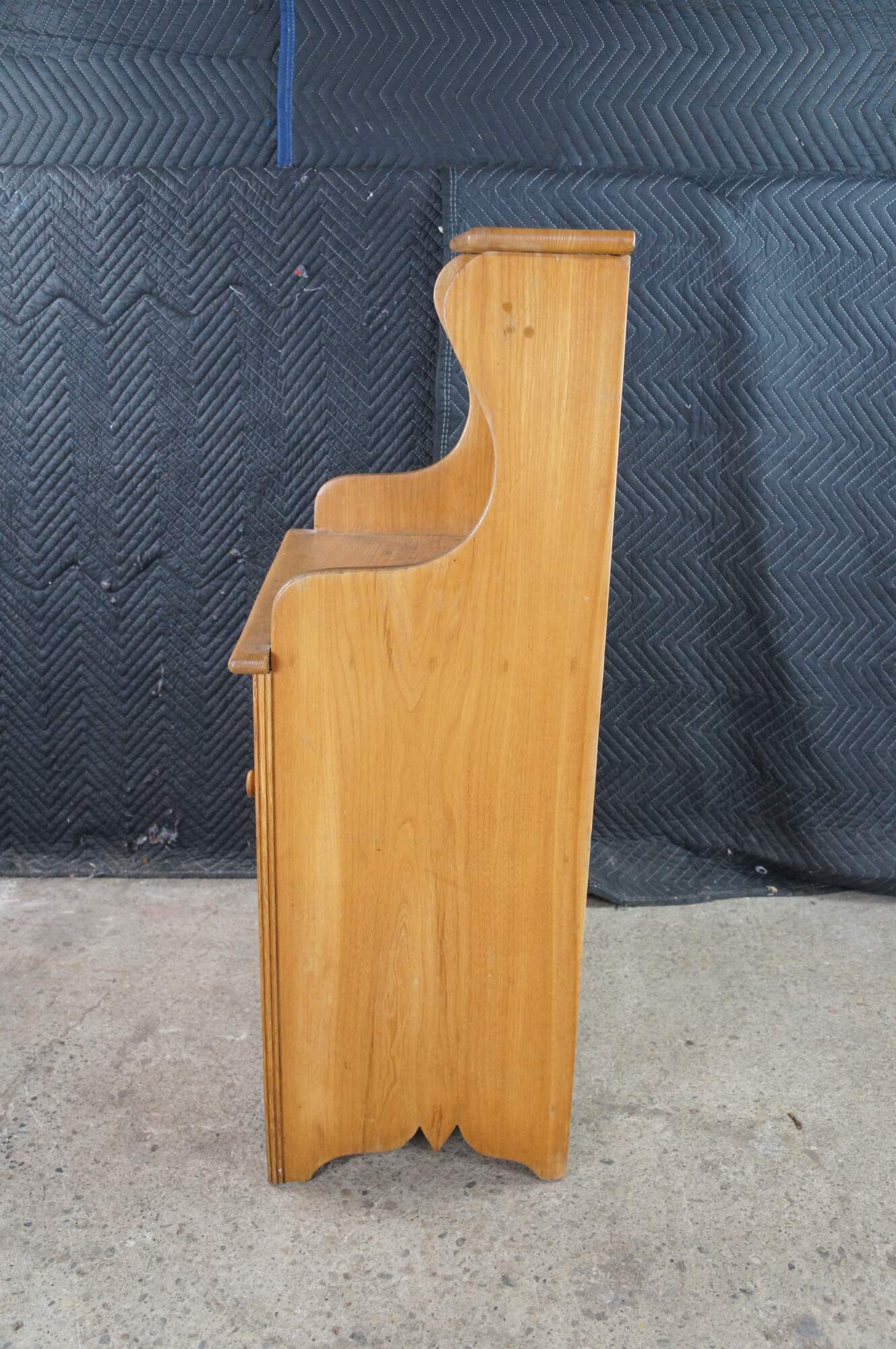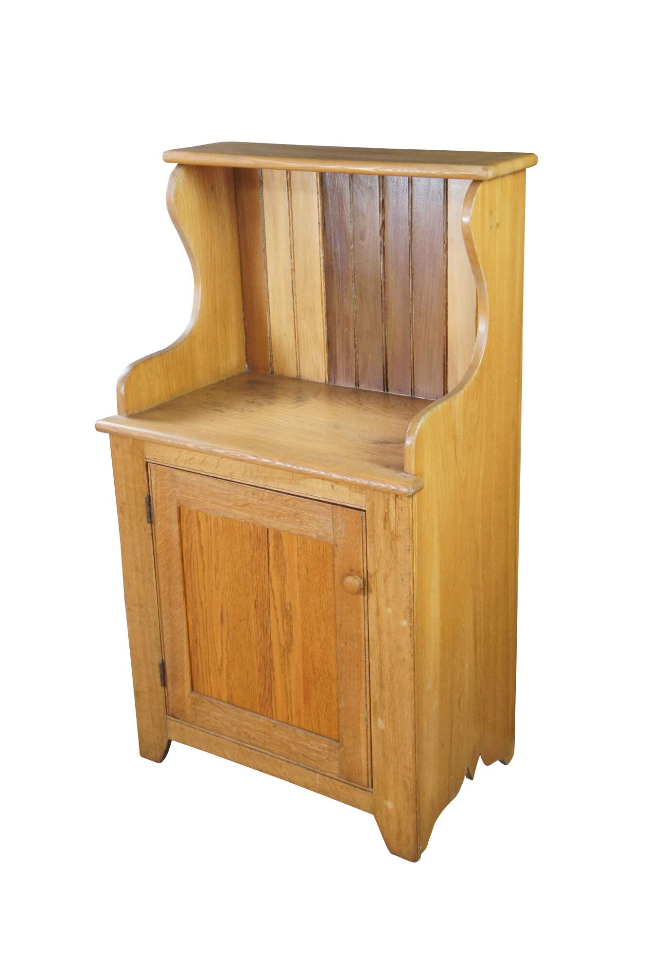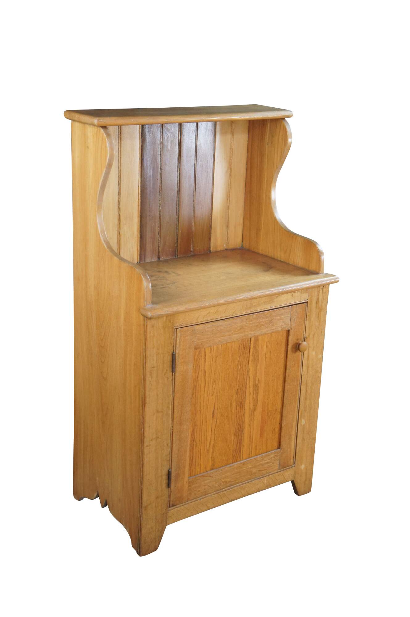 Antique oak dry sink cabinet / commode / stand featuring a two tier serpentine design with large cabinet and workspace with upper shelf.