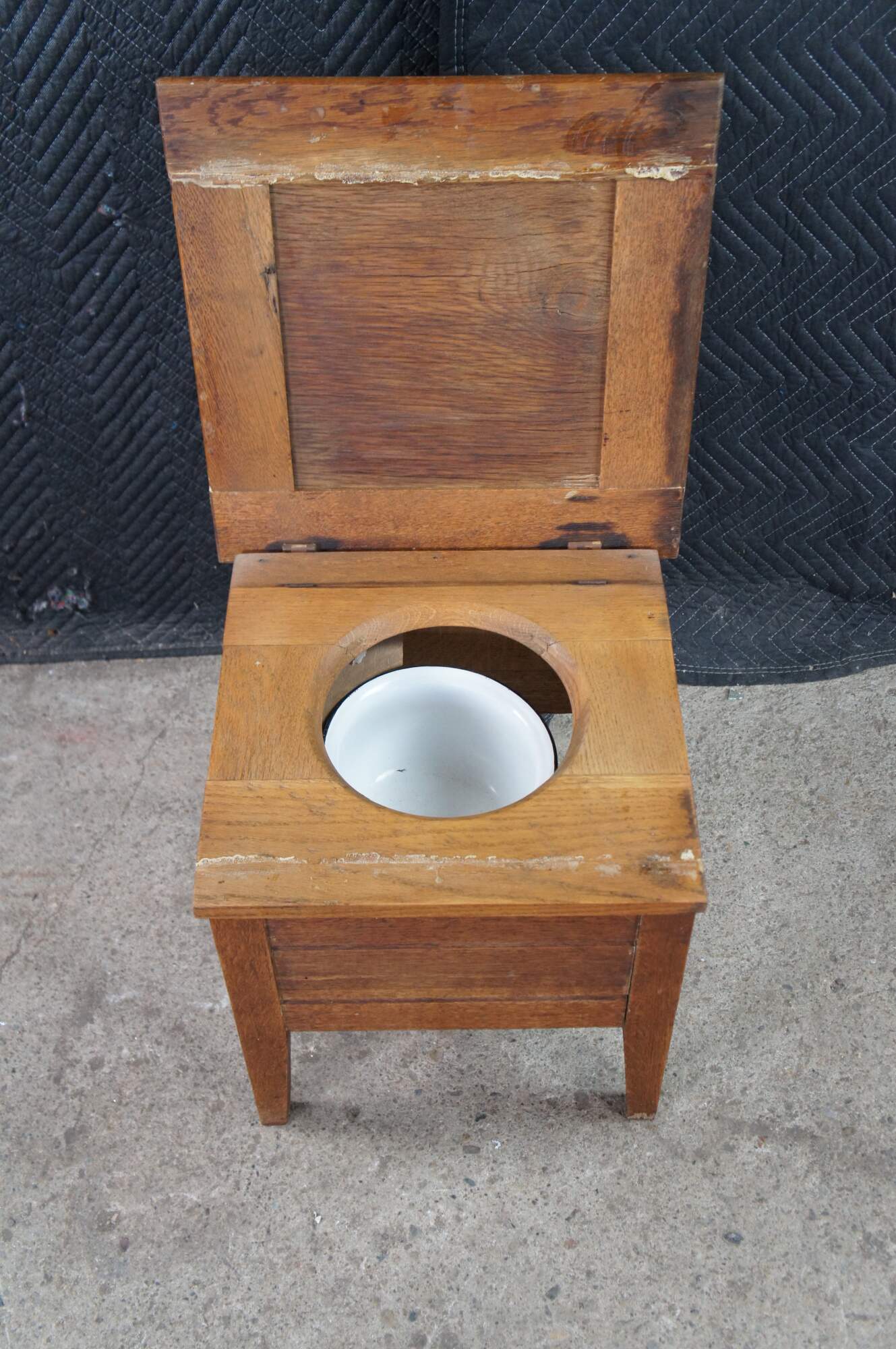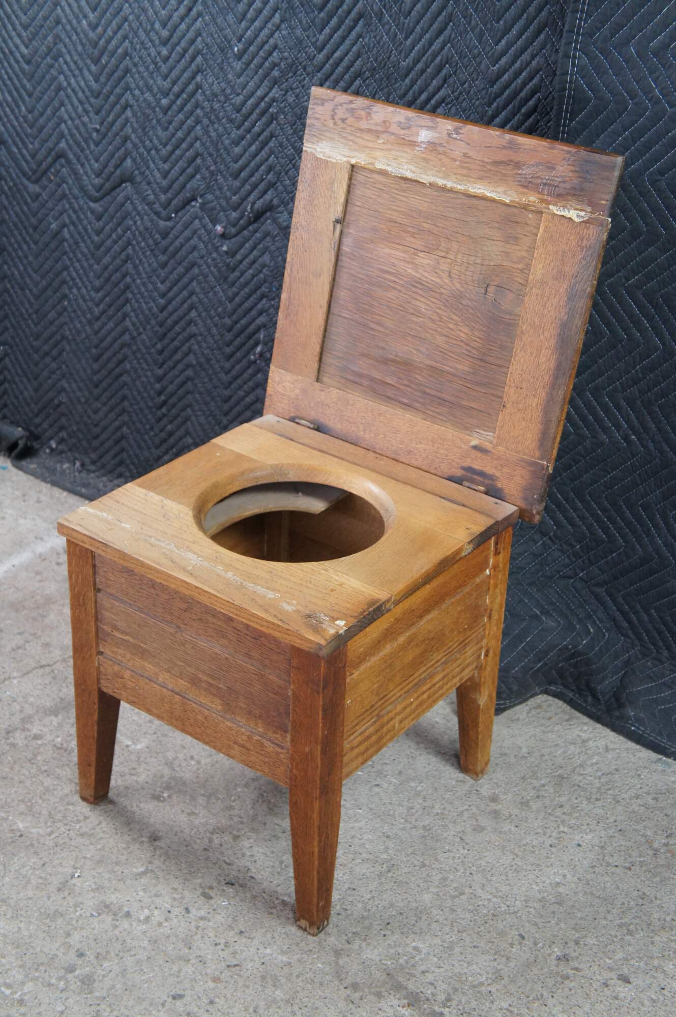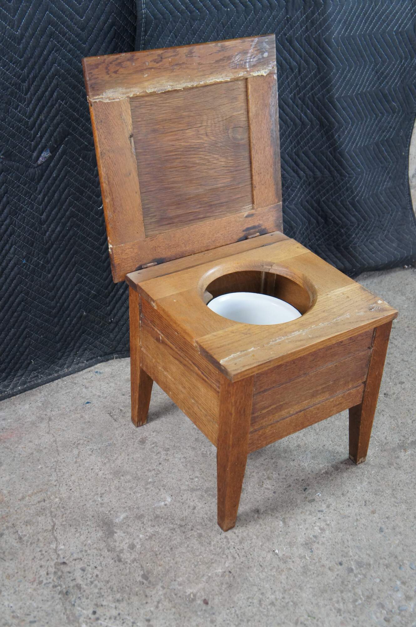 Antique 19th century Mission style chamber pot or commode. Made from quartered oak with a paneled top and square form. The top opens to a porcelain chamber with handle and lid, and is supported by simple tapered legs.