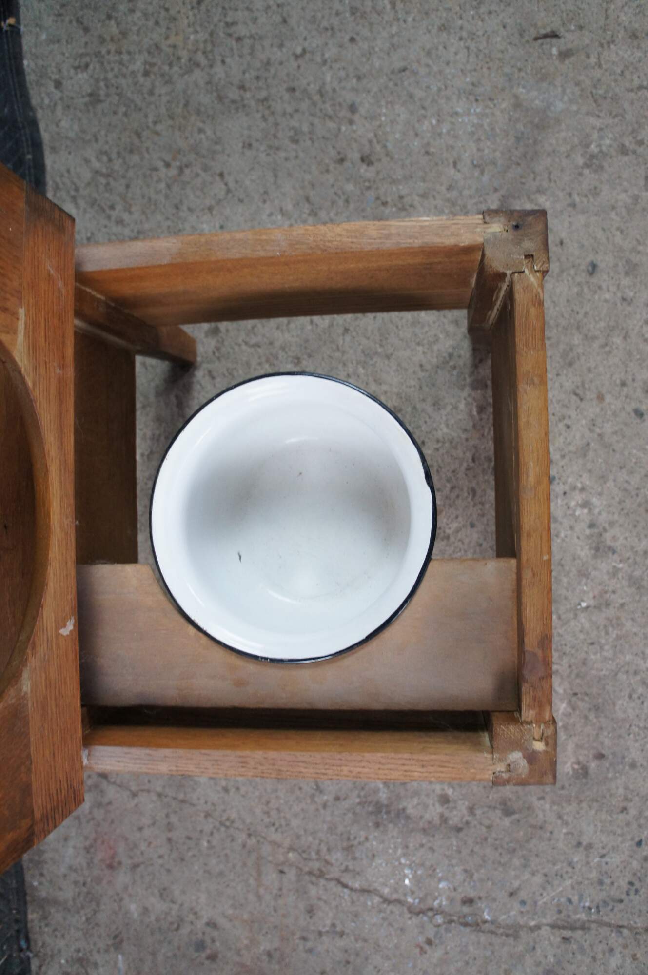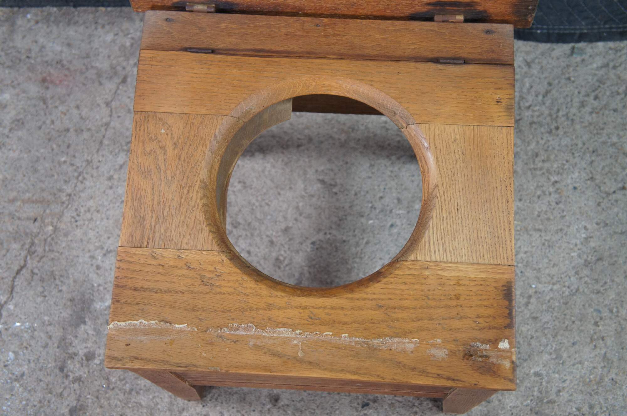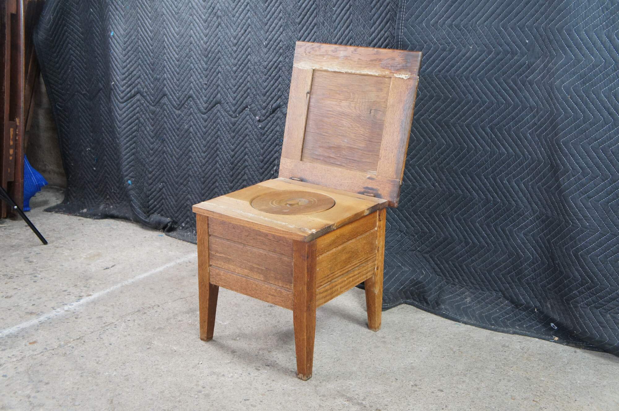 Antique 19th century Mission style chamber pot or commode. Made from quartered oak with a paneled top and square form. The top opens to a porcelain chamber with handle and lid, and is supported by simple tapered legs.