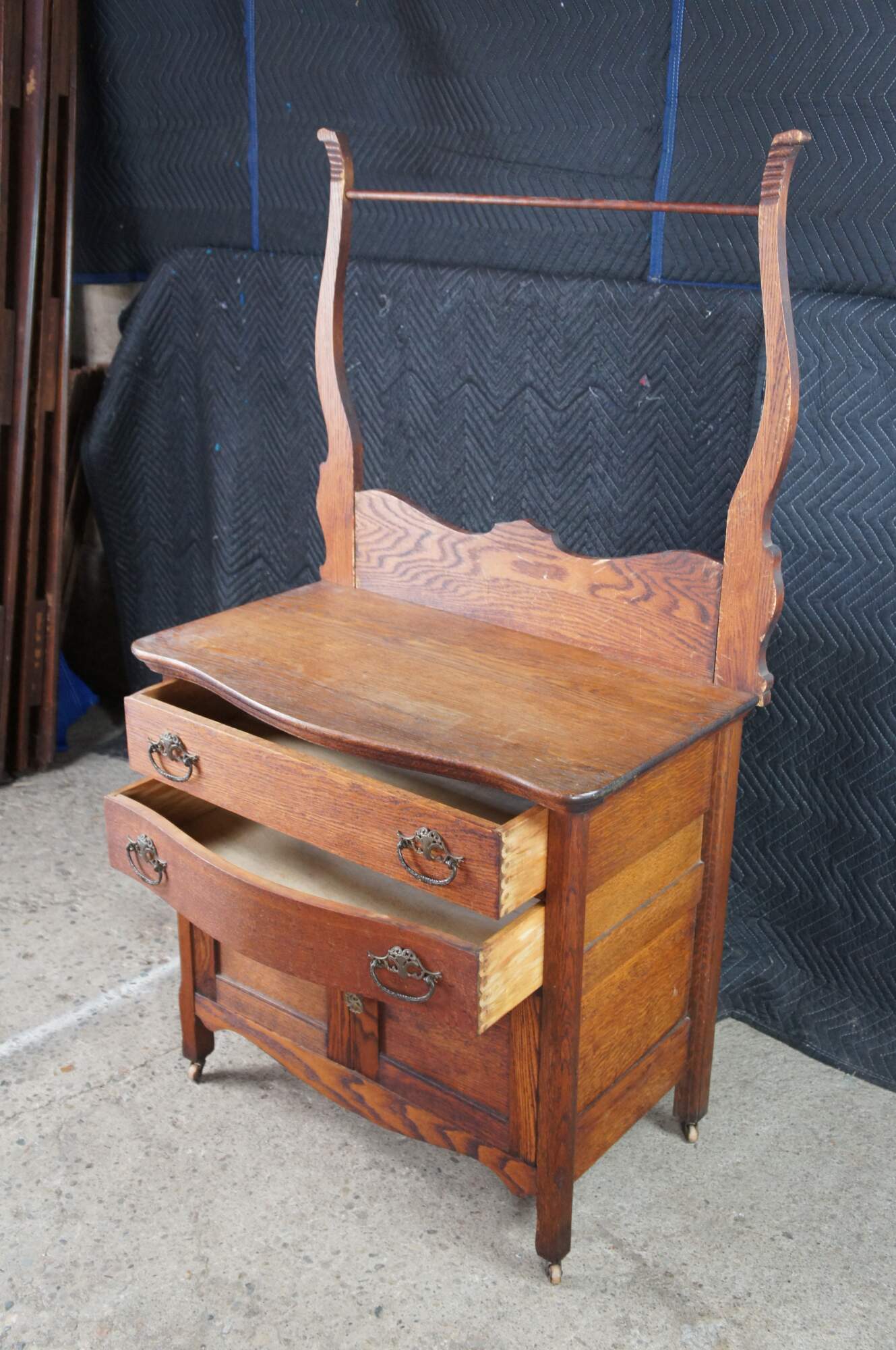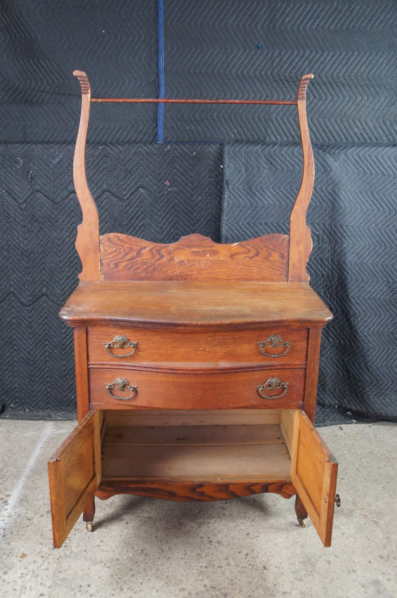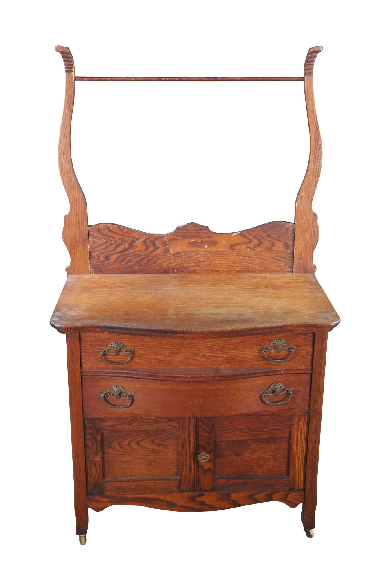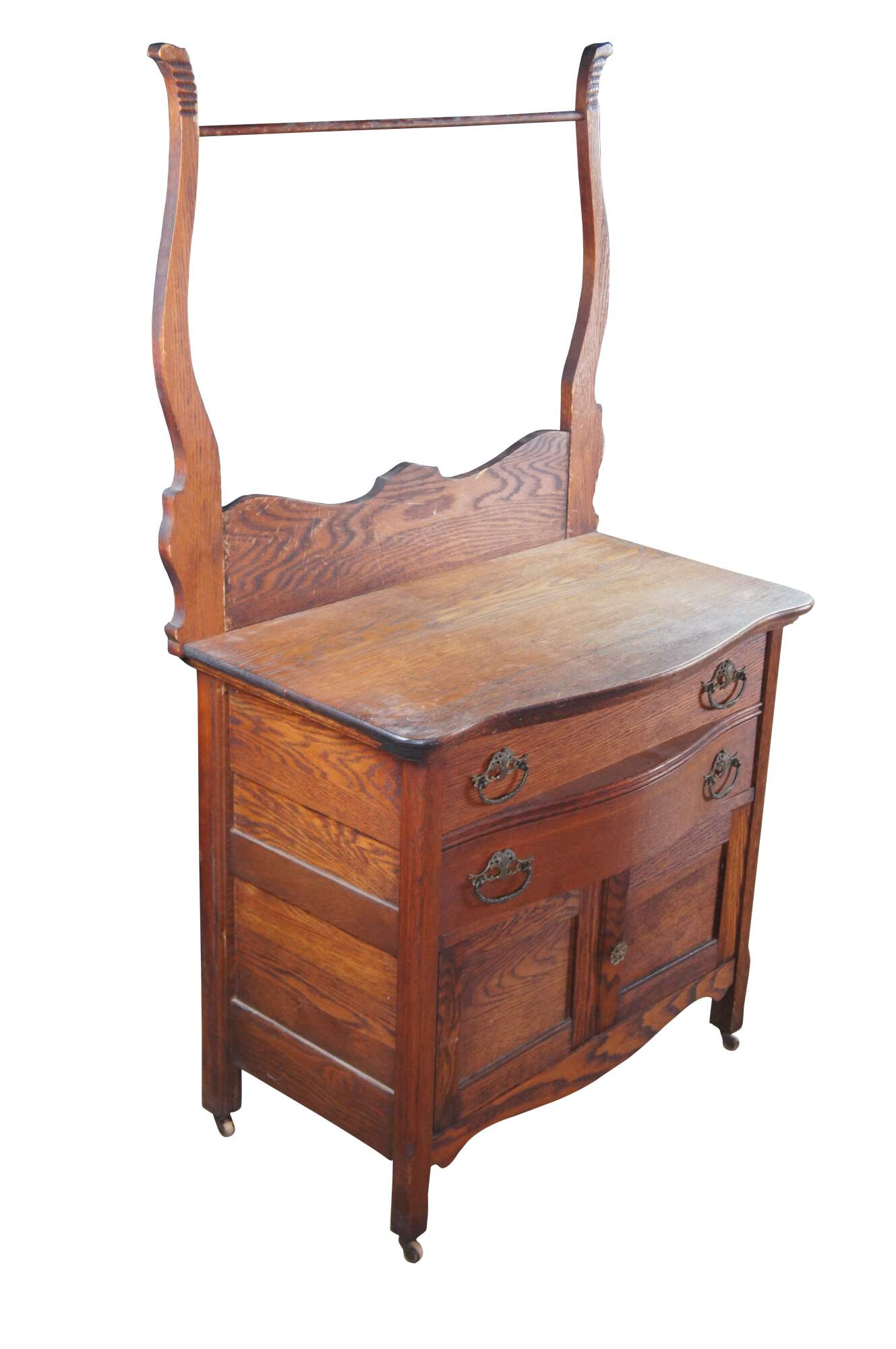 Antique Victorian wash stand or dry sink. Made of quartersawn oak featuring serpentine bowfront design with two drawers, lower cabinet and towel rack. Drawers feature Knapp Joints.