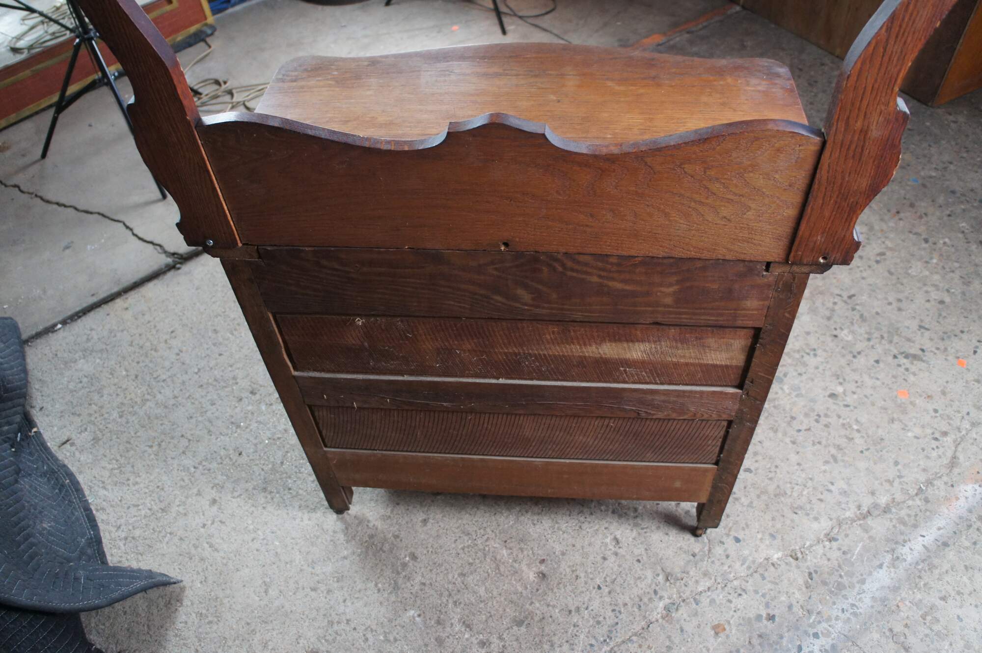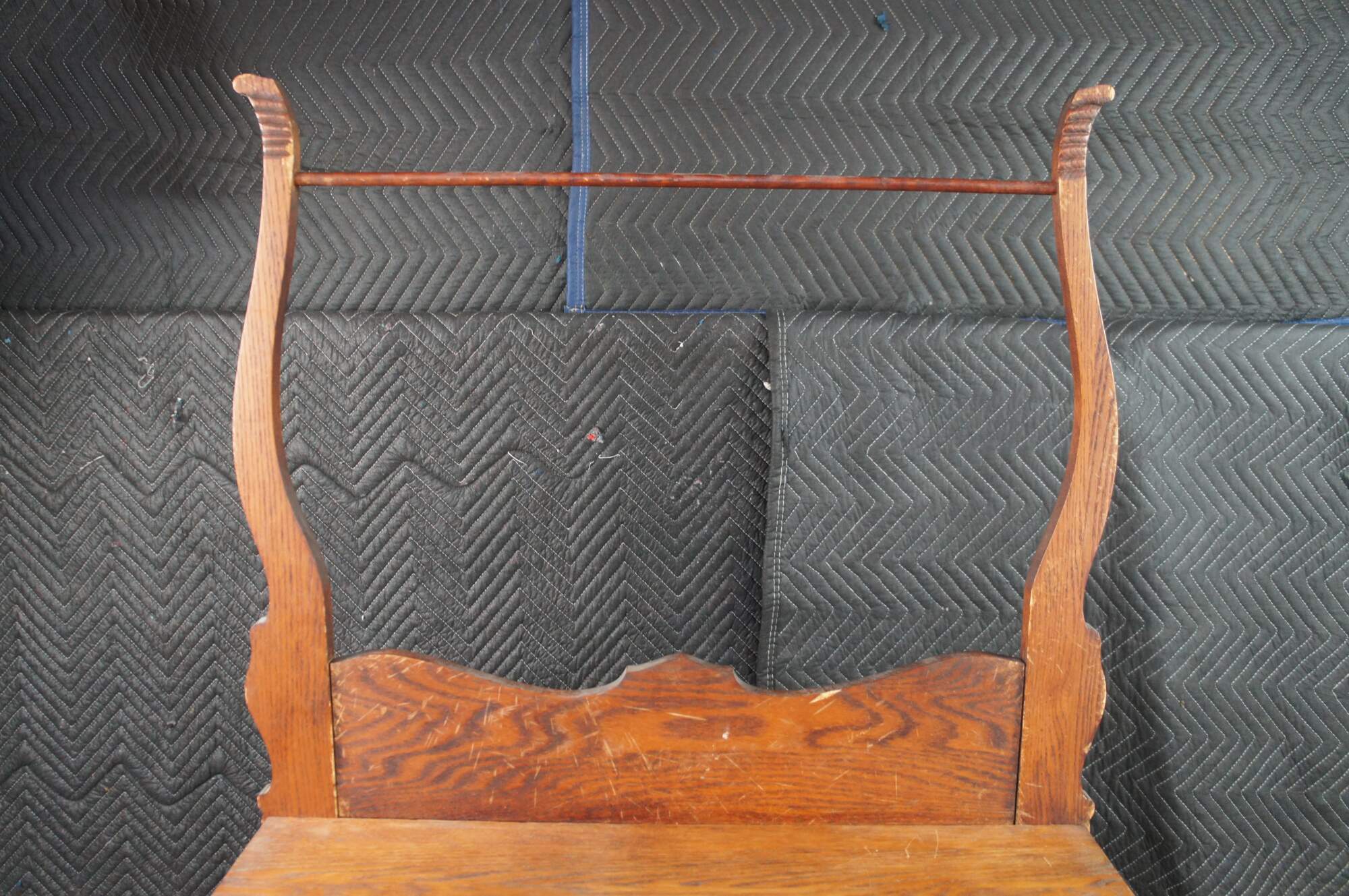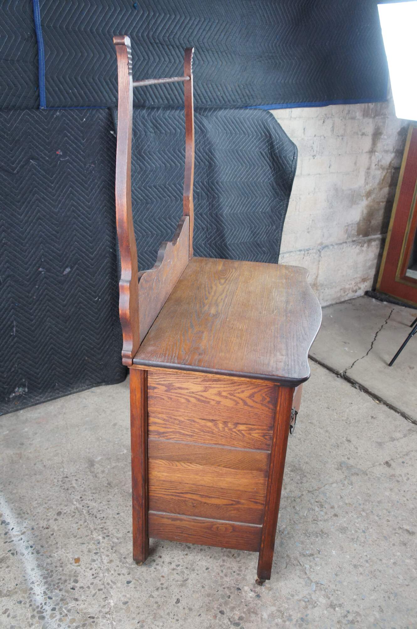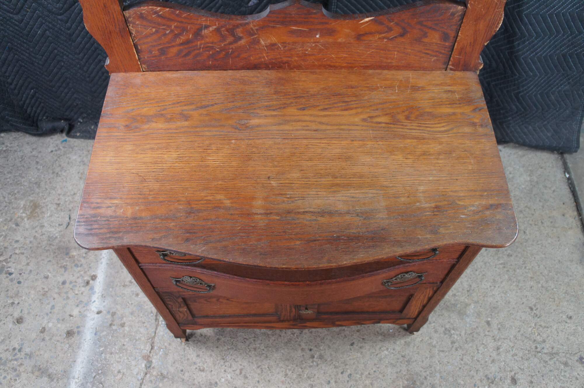 Antique Victorian wash stand or dry sink. Made of quartersawn oak featuring serpentine bowfront design with two drawers, lower cabinet and towel rack. Drawers feature Knapp Joints.