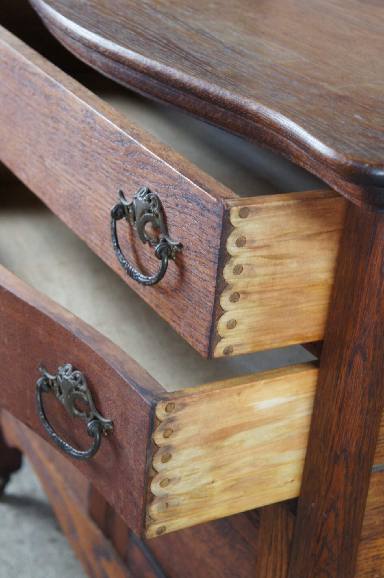 The Knapp joint was developed during the late Victoria Era in post Civil War United States. Patented by Charles Knapp of Waterloo, WI in 1867, the Knapp Joint was a huge breakthrough for the furniture industry; machines called routers made circular cuts in wood far quicker than by hand. The Knapp Joint is particularly unique to furniture as it was only used from 1870 until 1900. It is also referred to as the Pin and Cove Drawer.