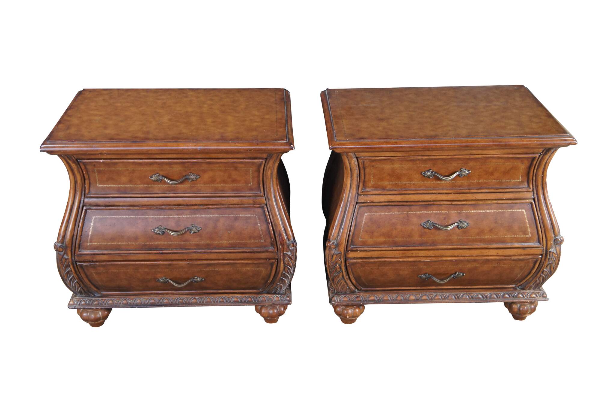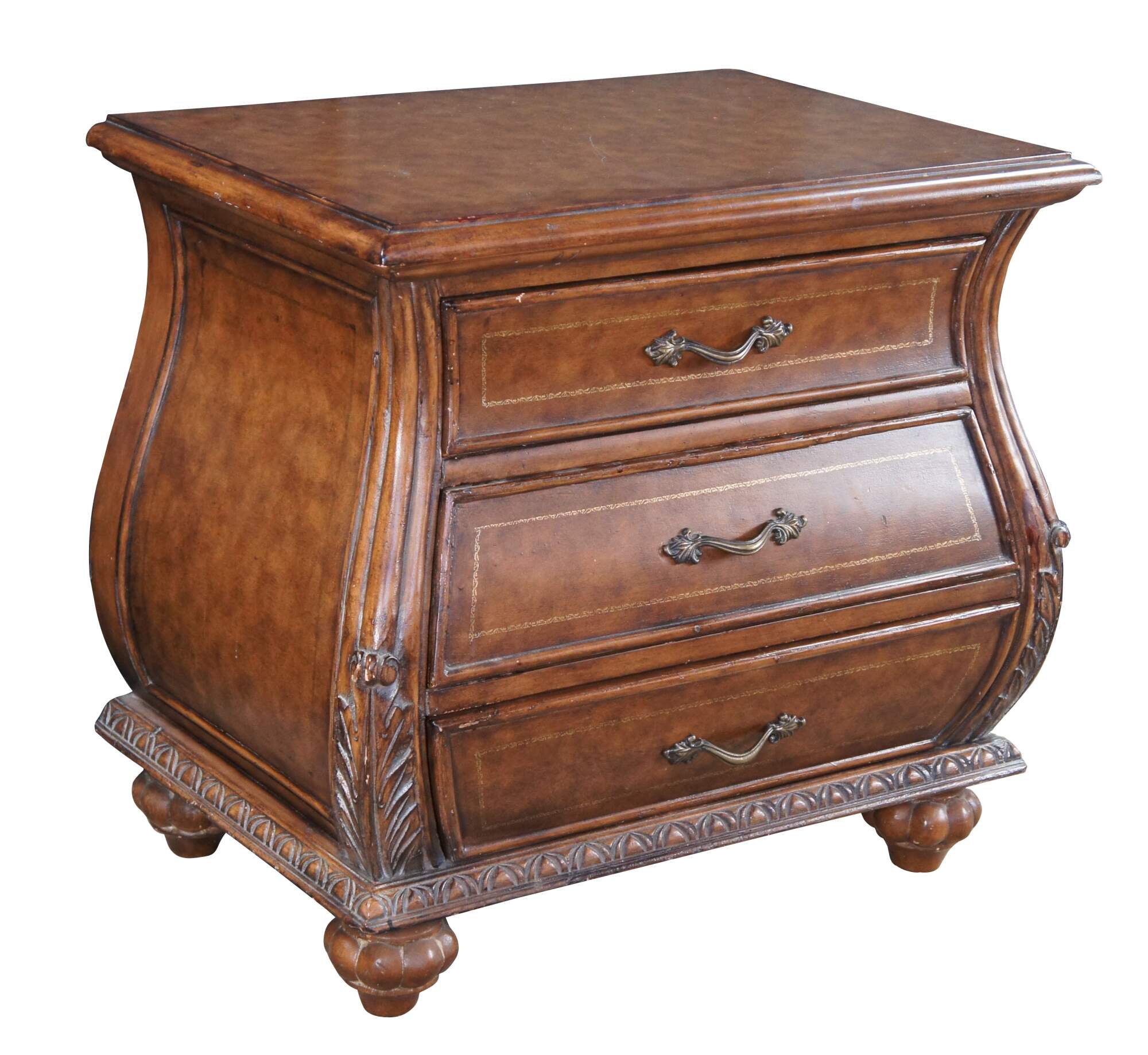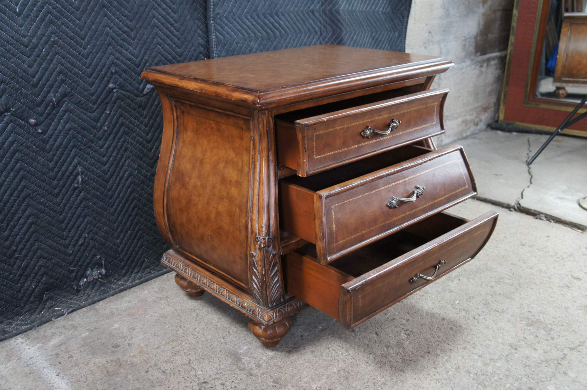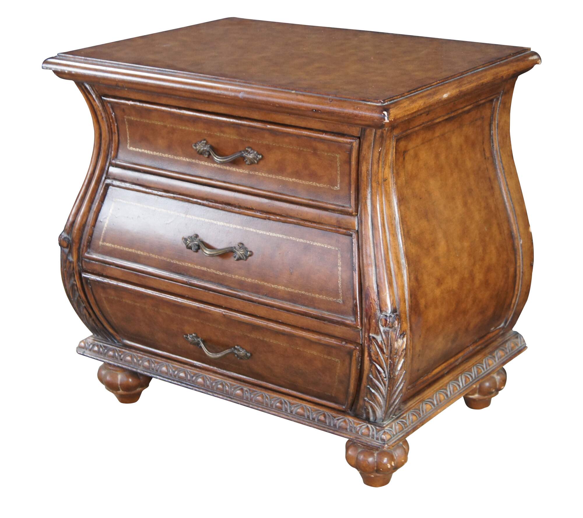 Vintage French Louis XVI style bombe dresser / chest of drawers / nightstands featuring a tooled leather design with acanthus accents. Made in Indonesia 40-72.