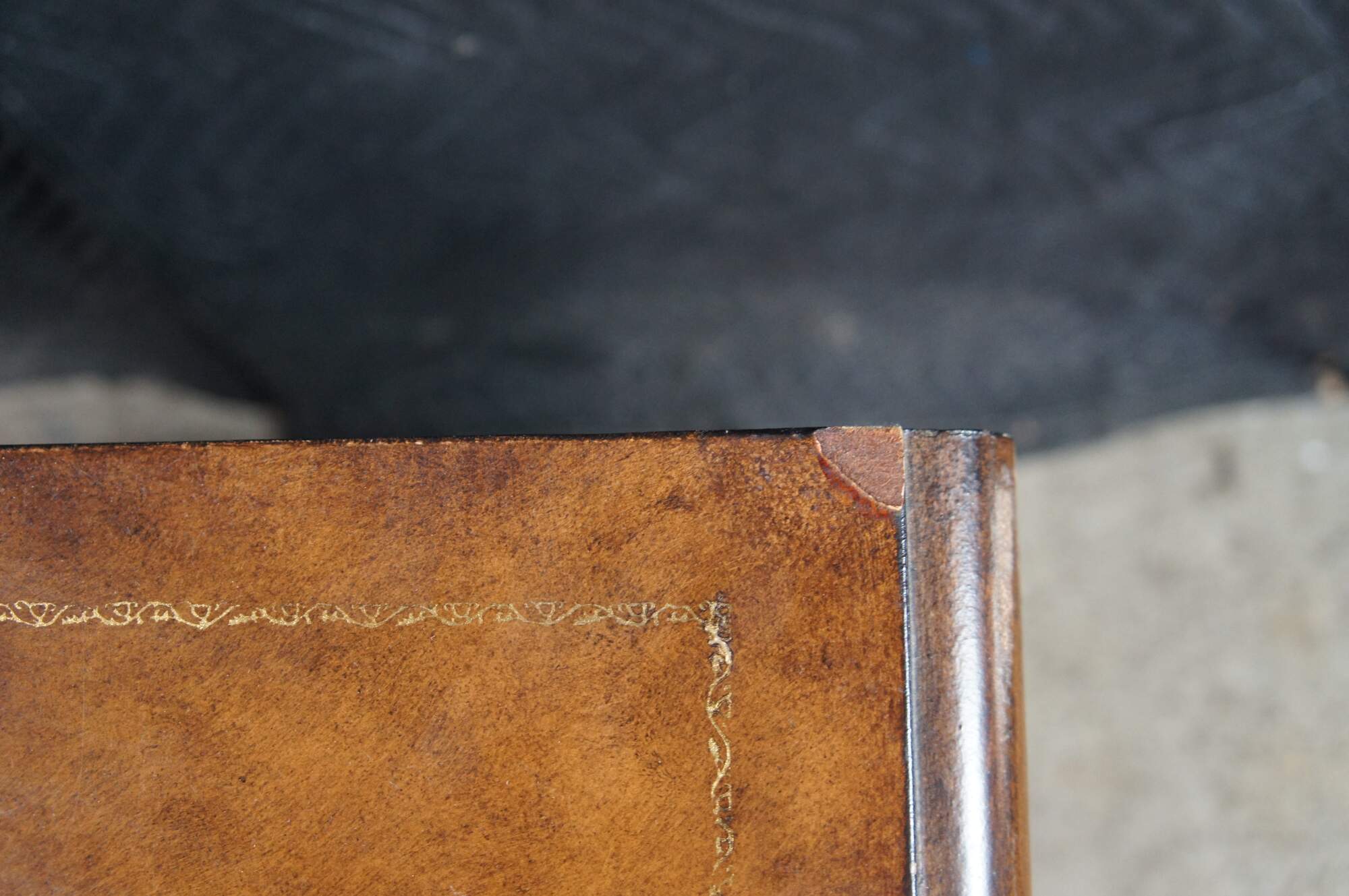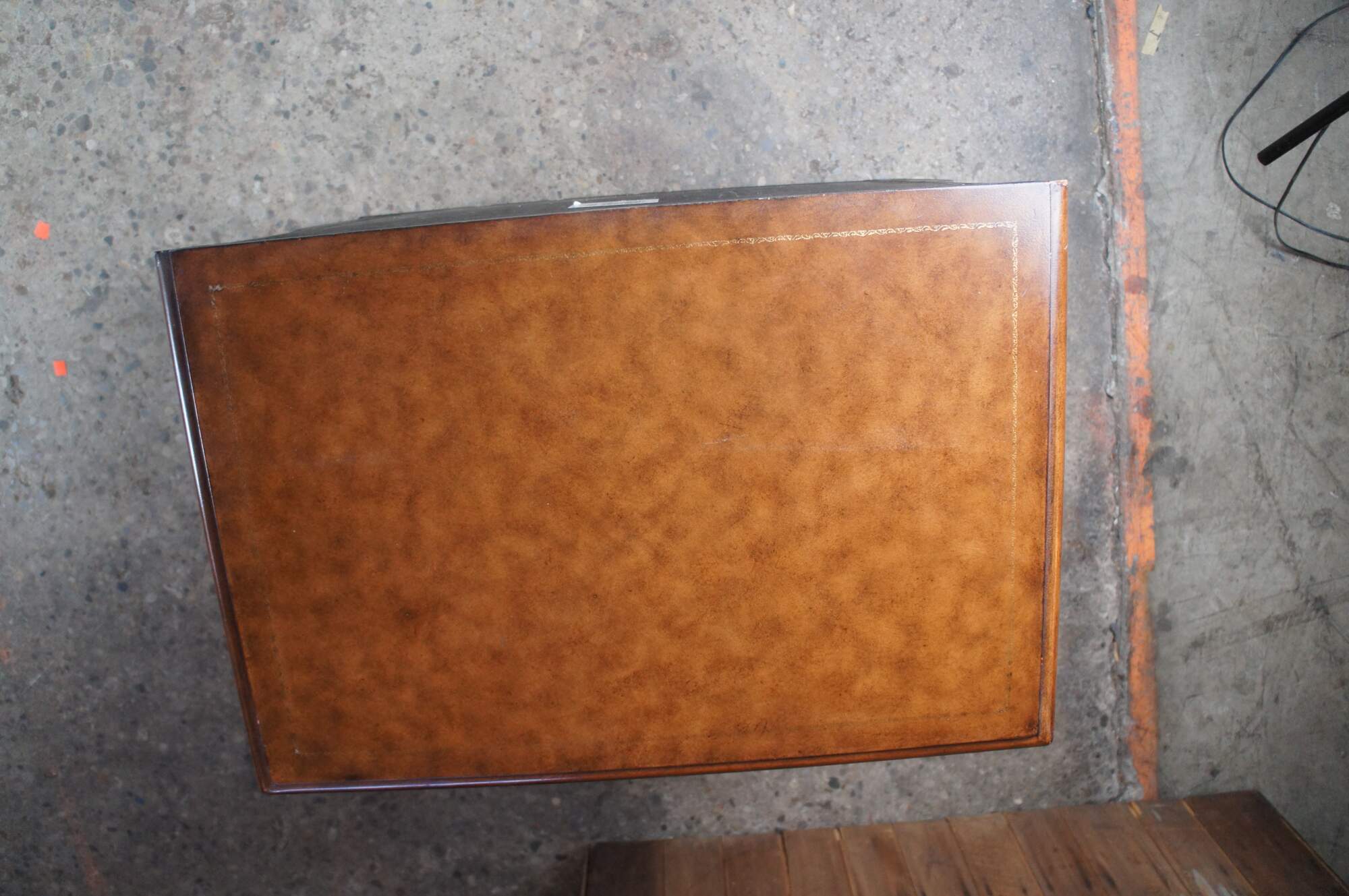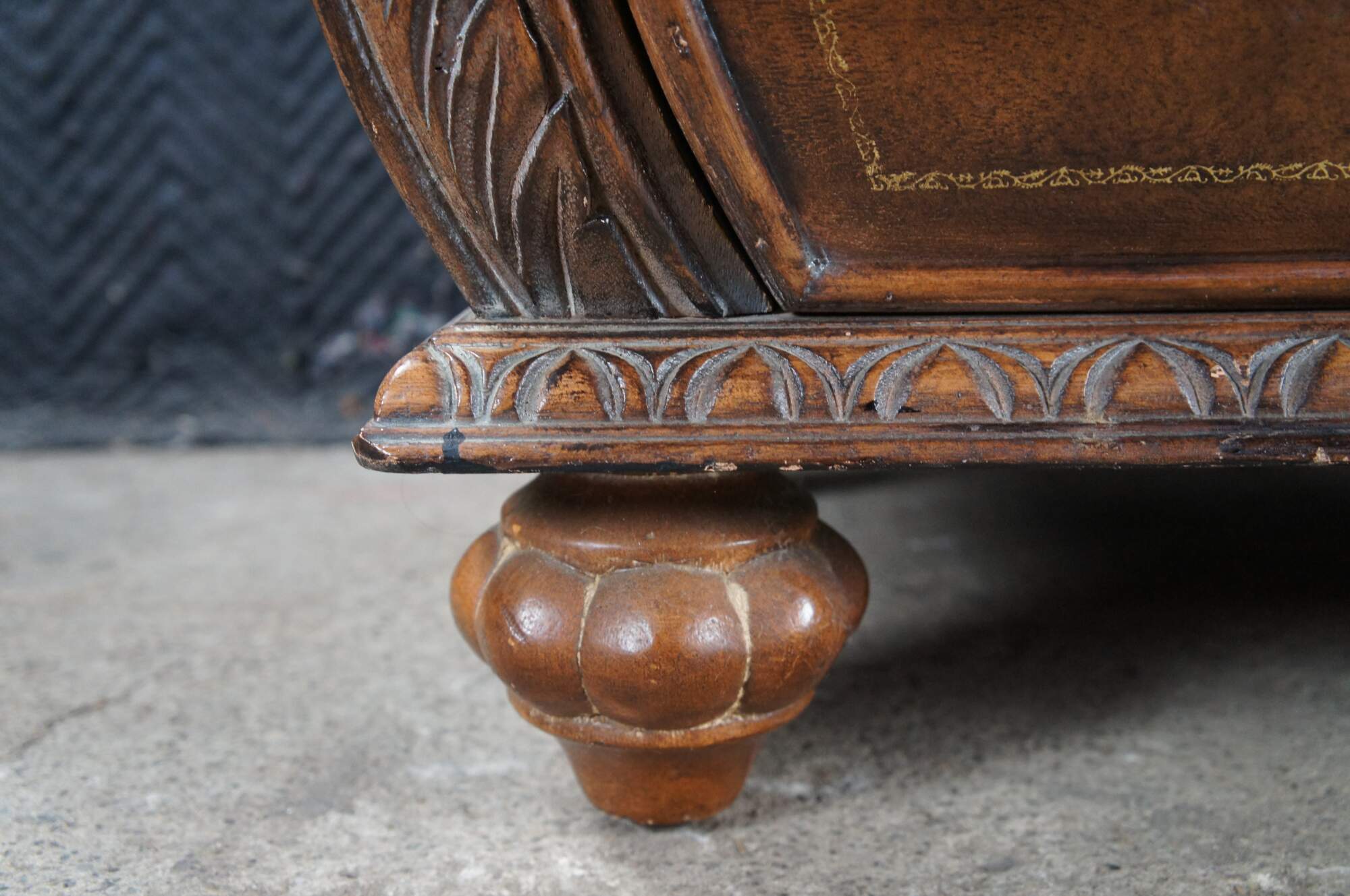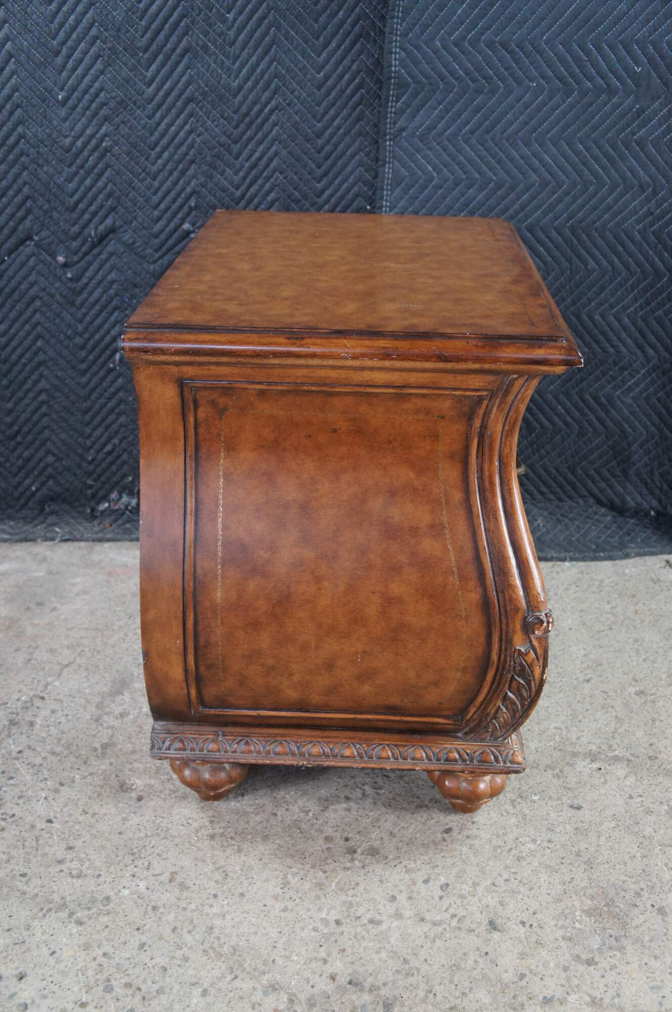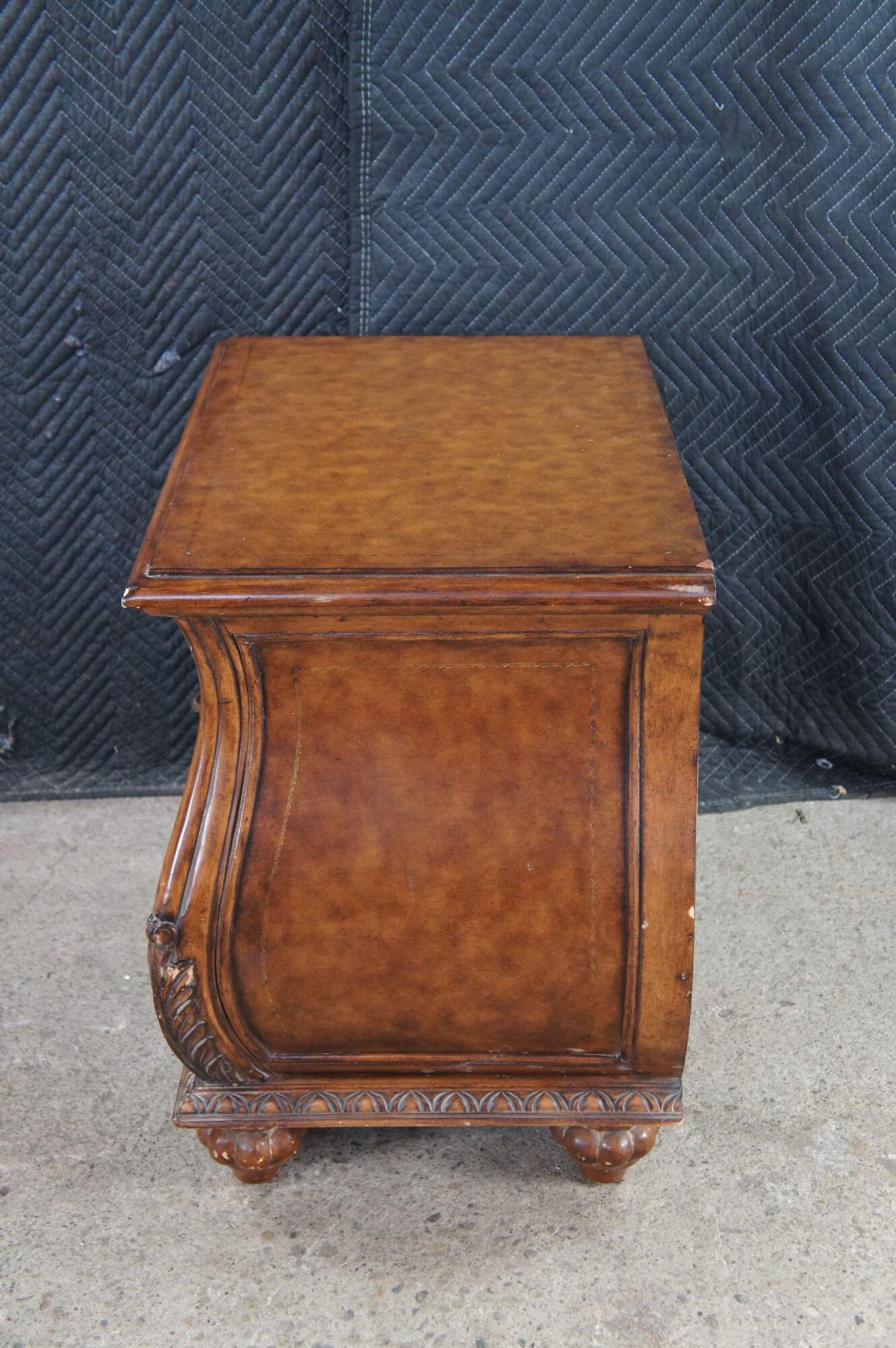 Vintage French Louis XVI style bombe dresser / chest of drawers / nightstands featuring a tooled leather design with acanthus accents. Made in Indonesia 40-72.