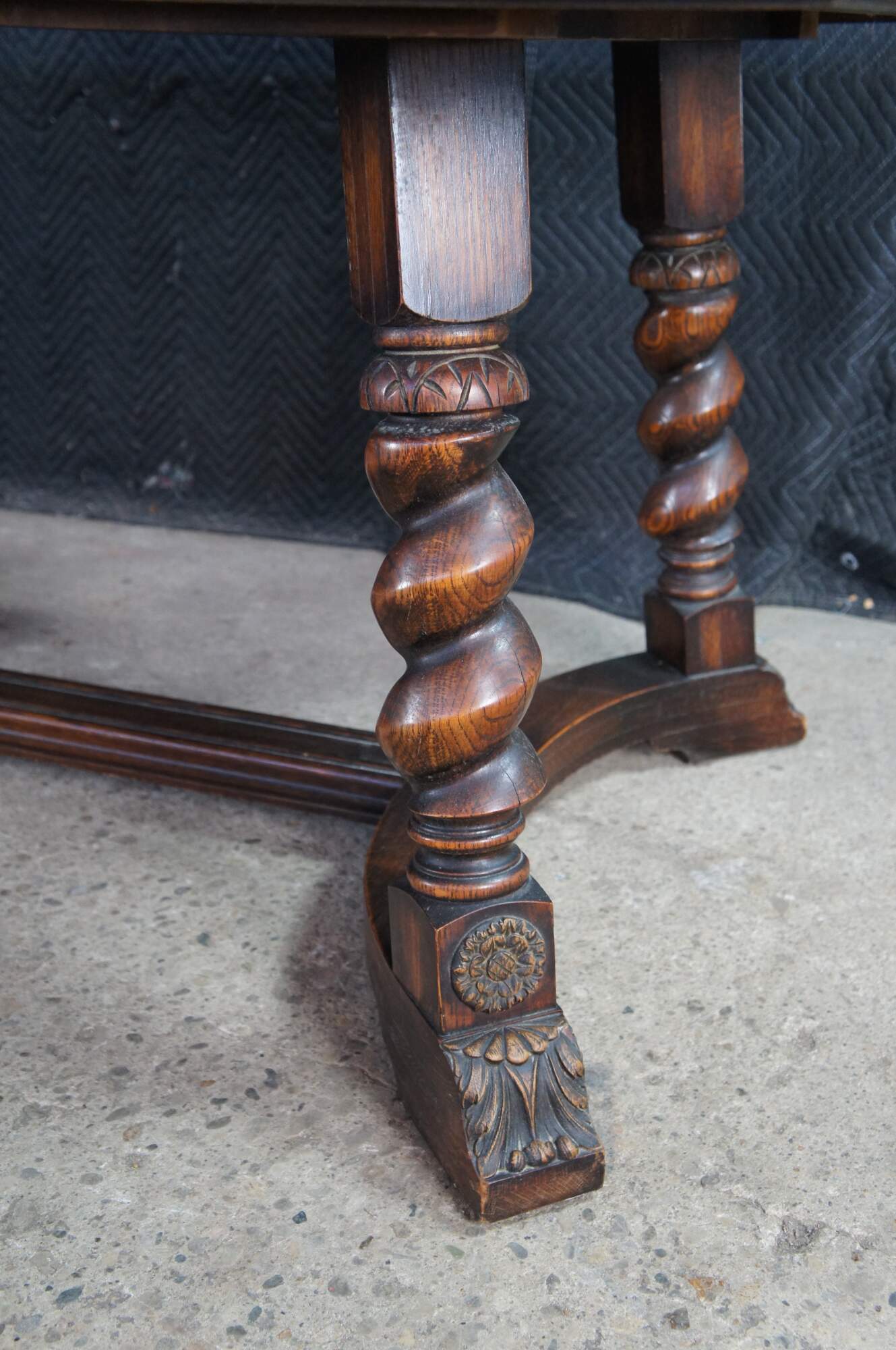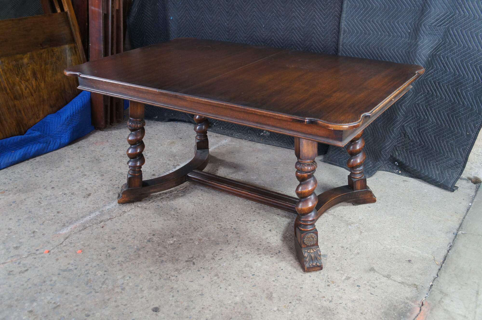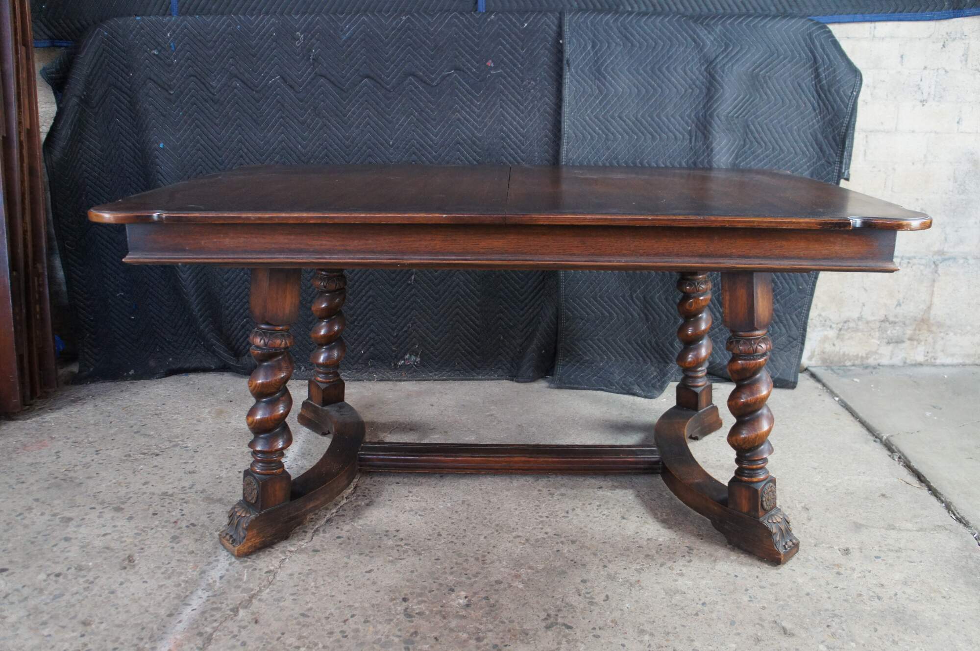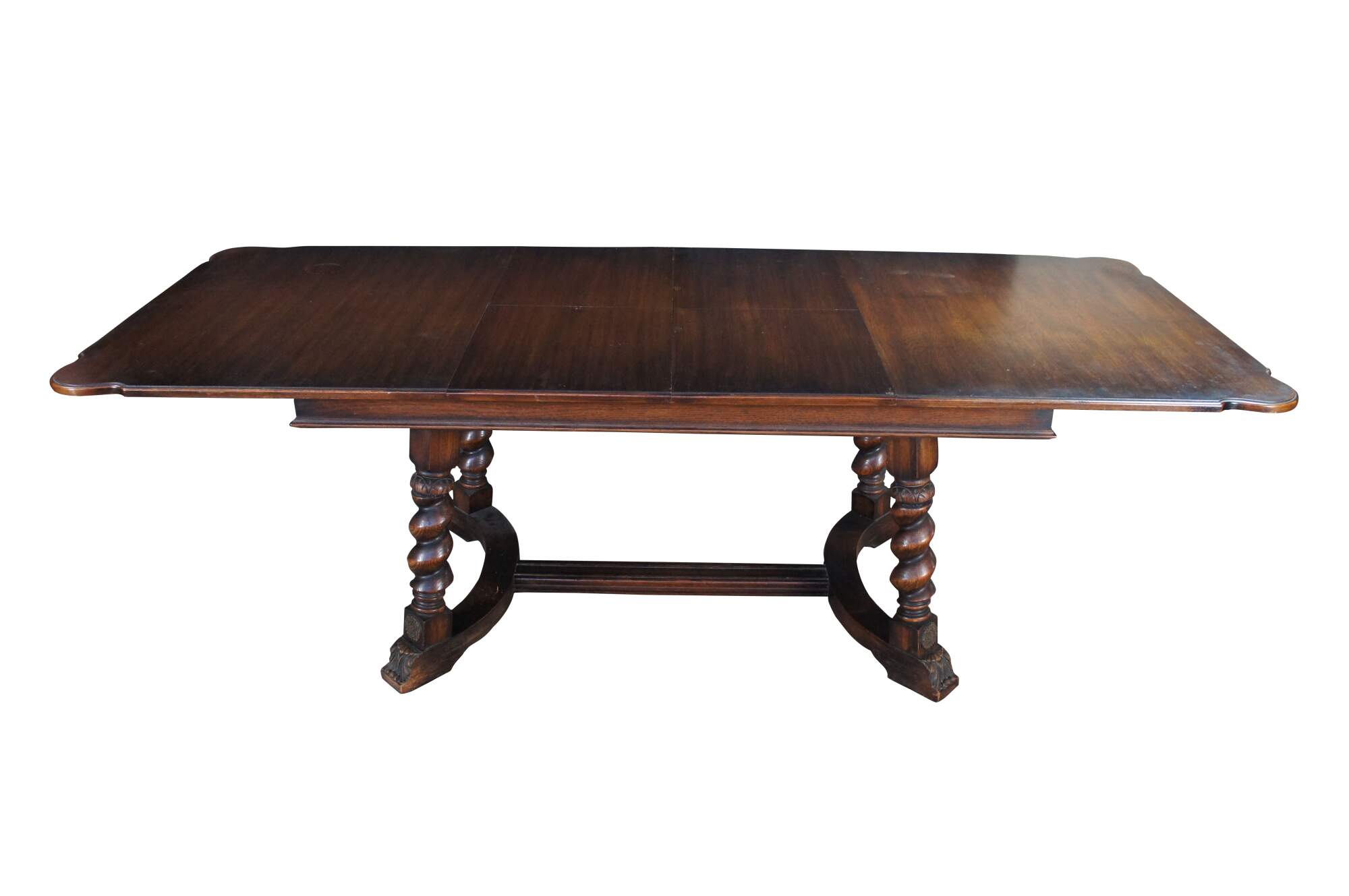 Early 20th century Jacobean inspired dining table. Made from oak with a rectangular top with rounded corners. Over four turned barley twist legs, leading to an acanthus feet connected by H stretcher / trestle base. The table expands with a unique mechanism using scissor leaves that fold out when needed. Includes table pads.