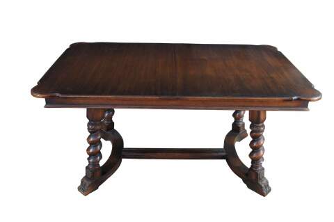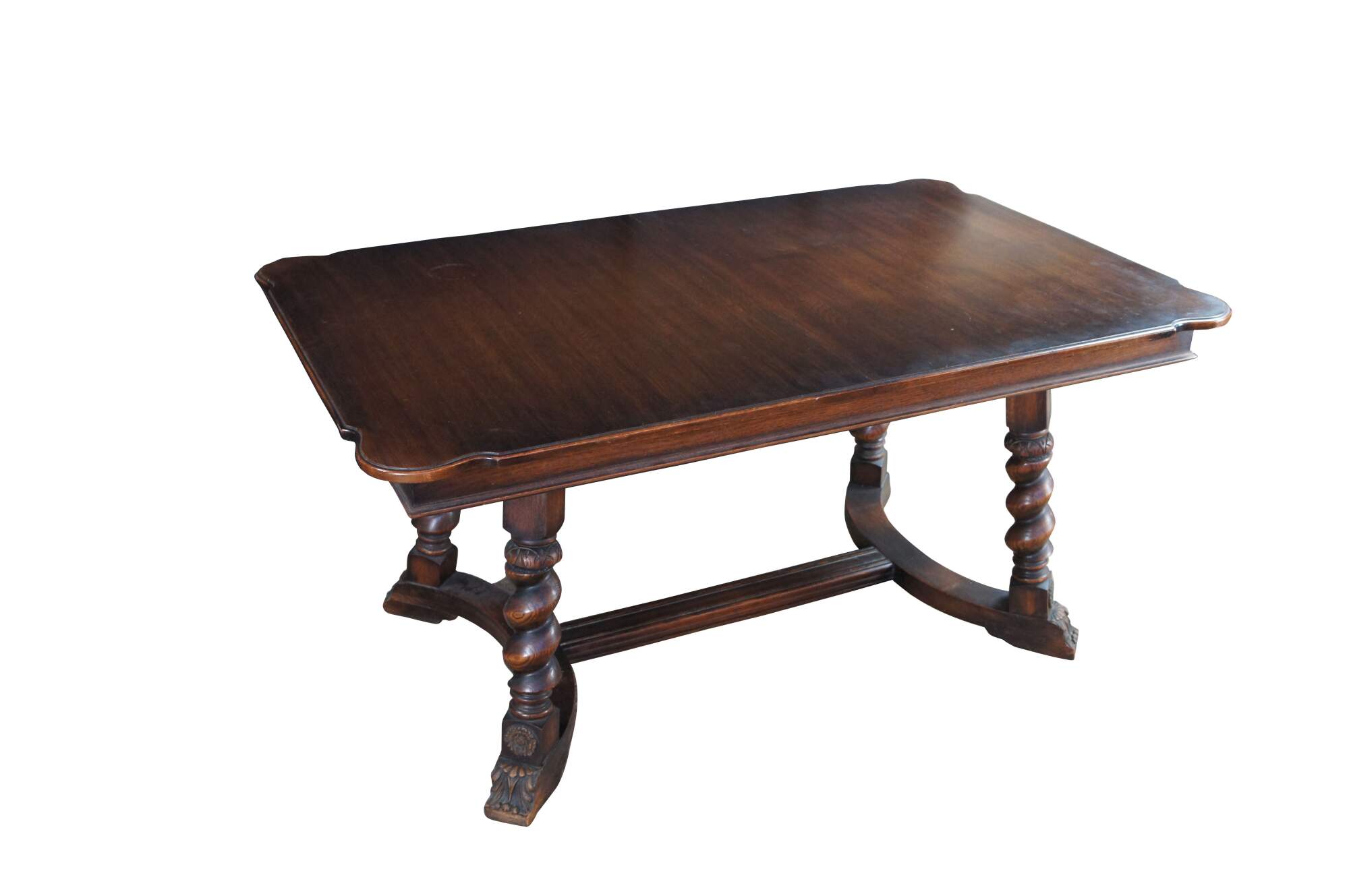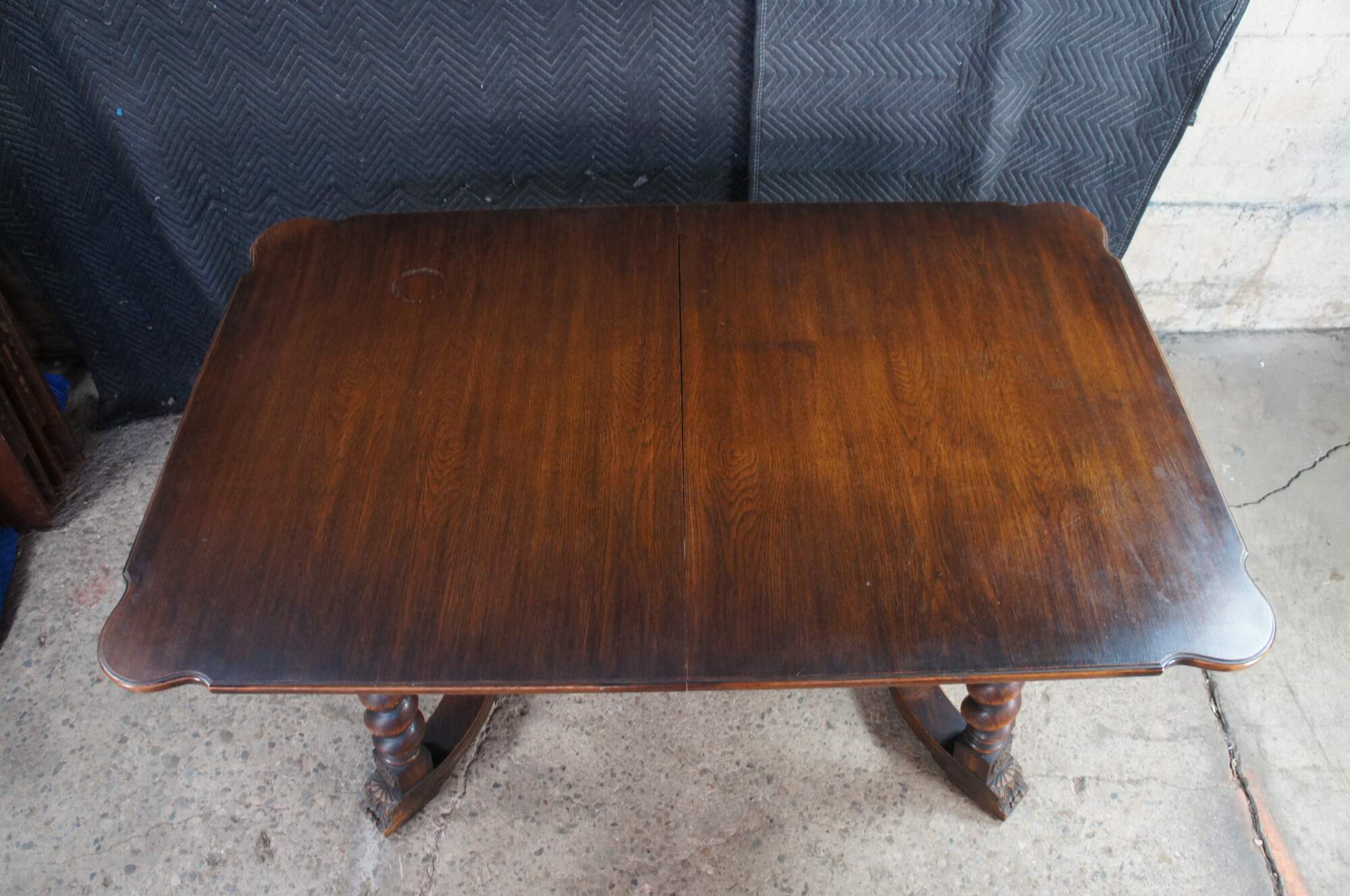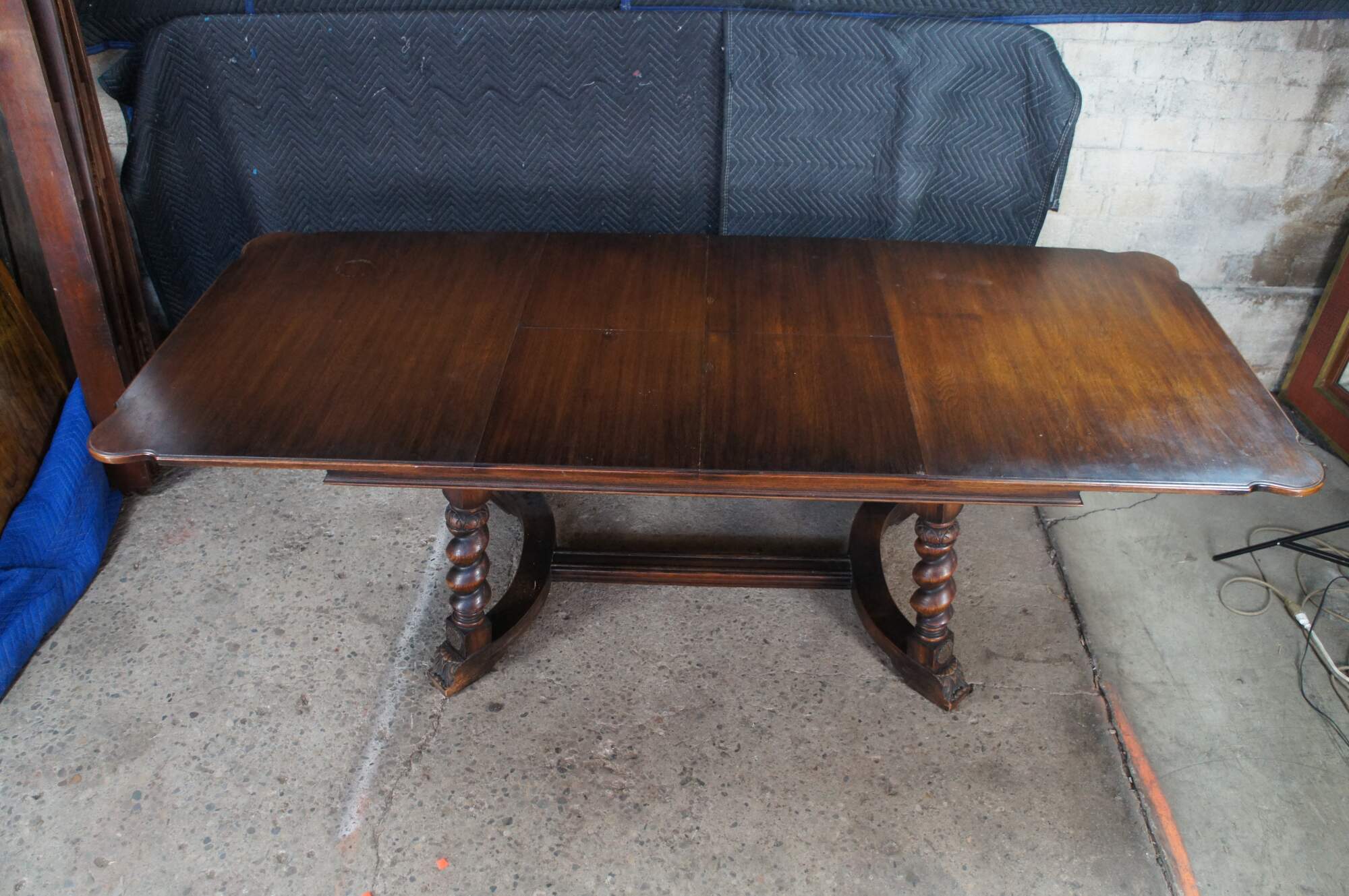 Early 20th century Jacobean inspired dining table. Made from oak with a rectangular top with rounded corners. Over four turned barley twist legs, leading to an acanthus feet connected by H stretcher / trestle base. The table expands with a unique mechanism using scissor leaves that fold out when needed. Includes table pads.