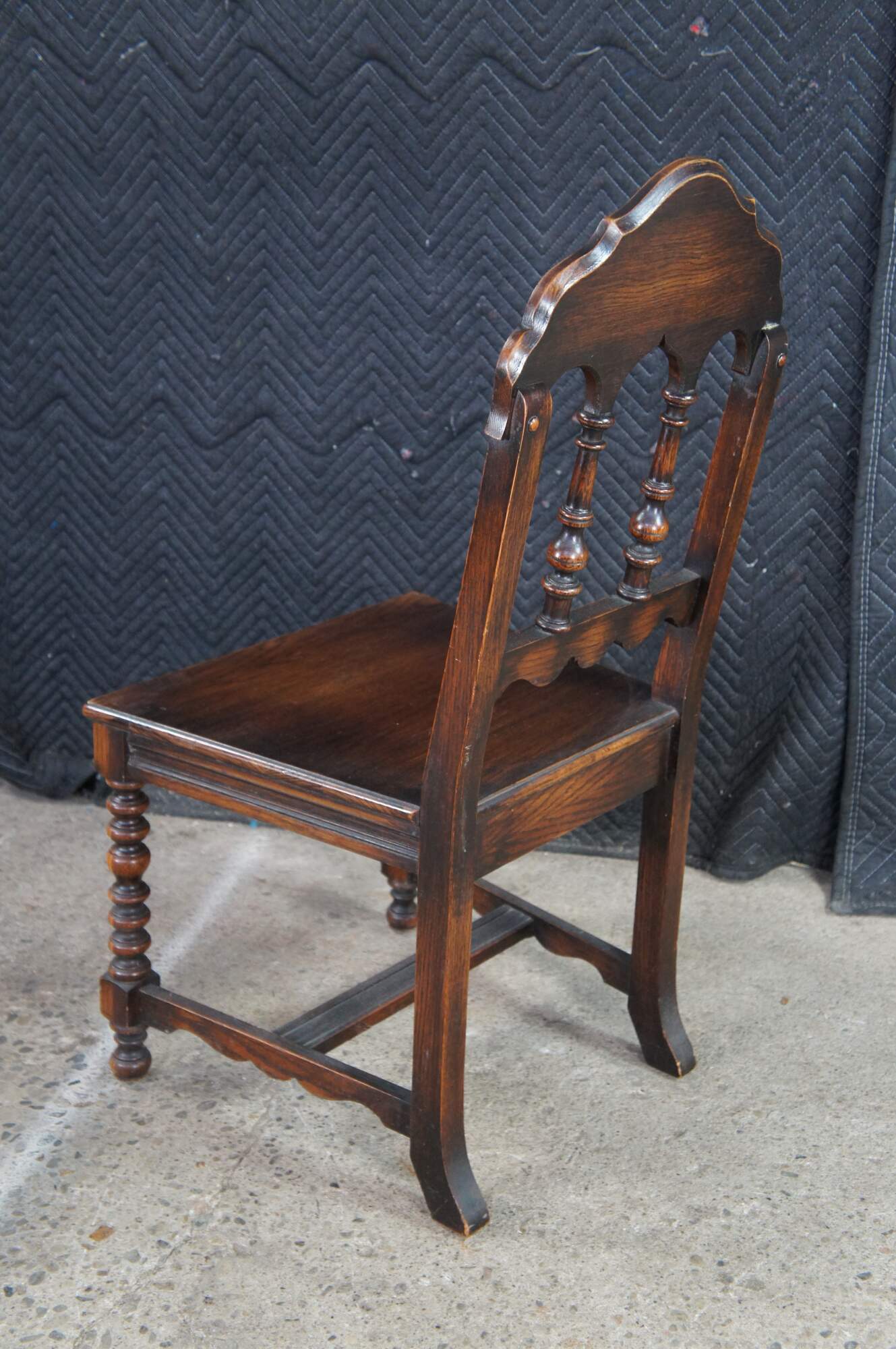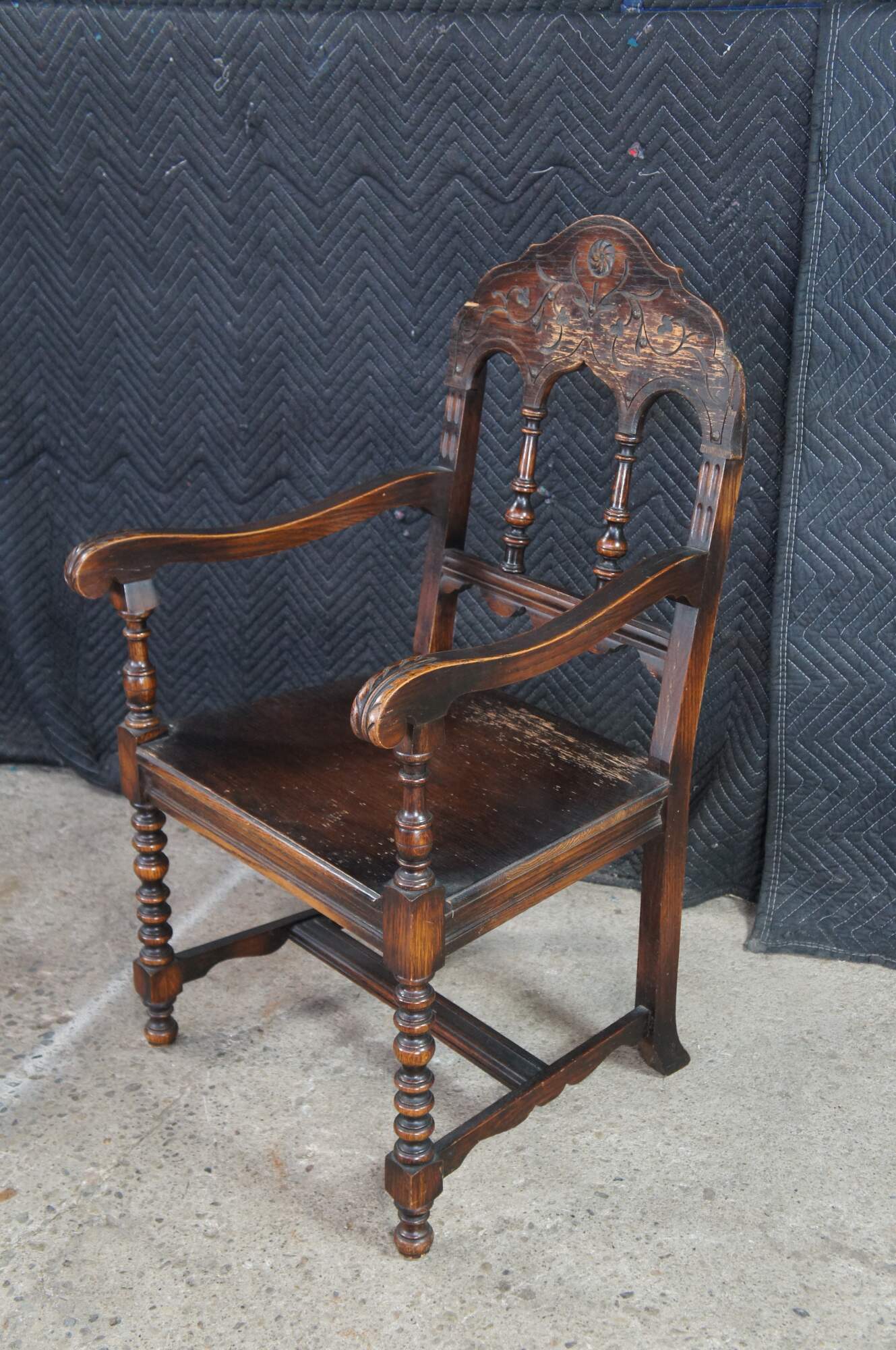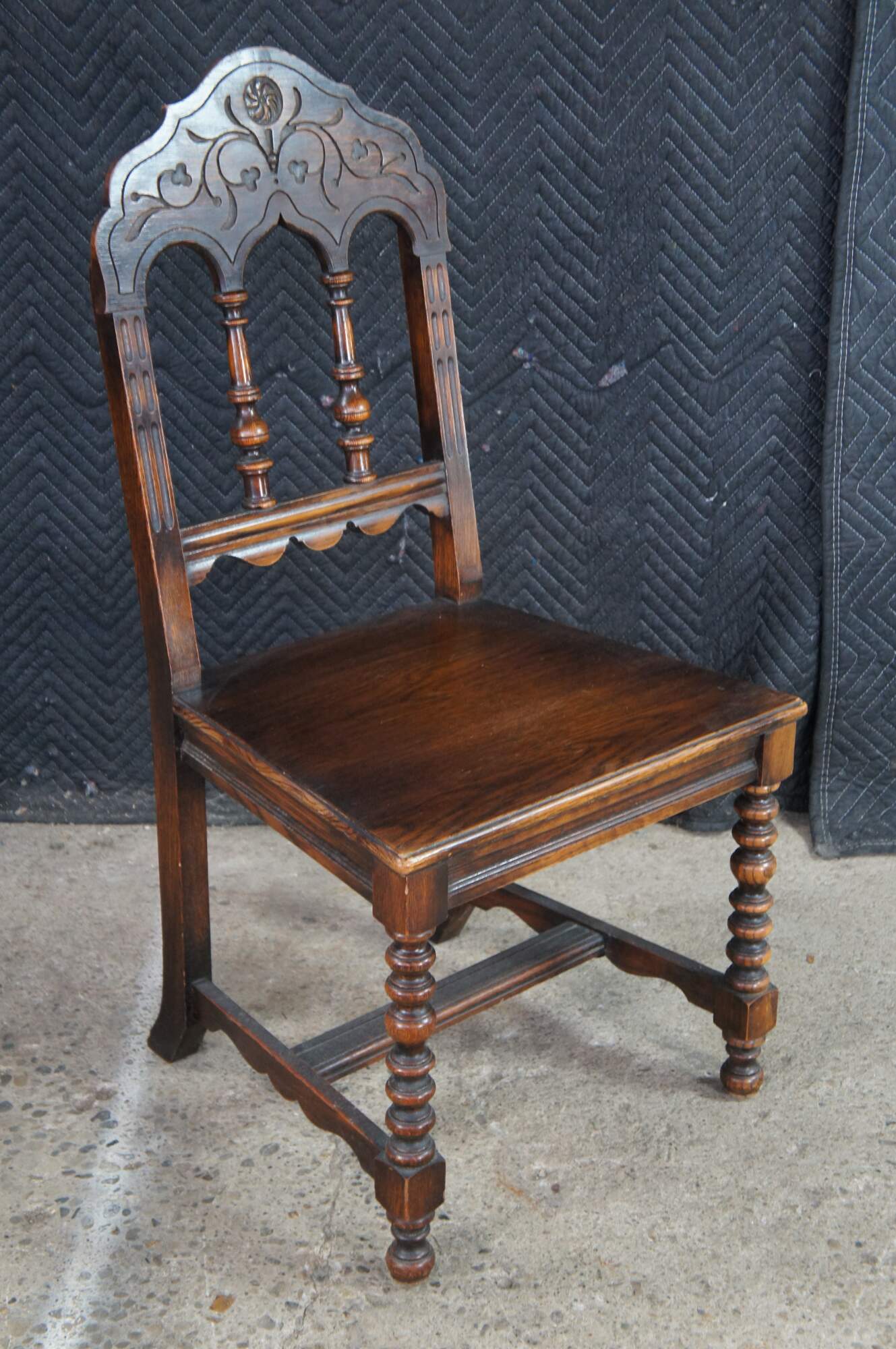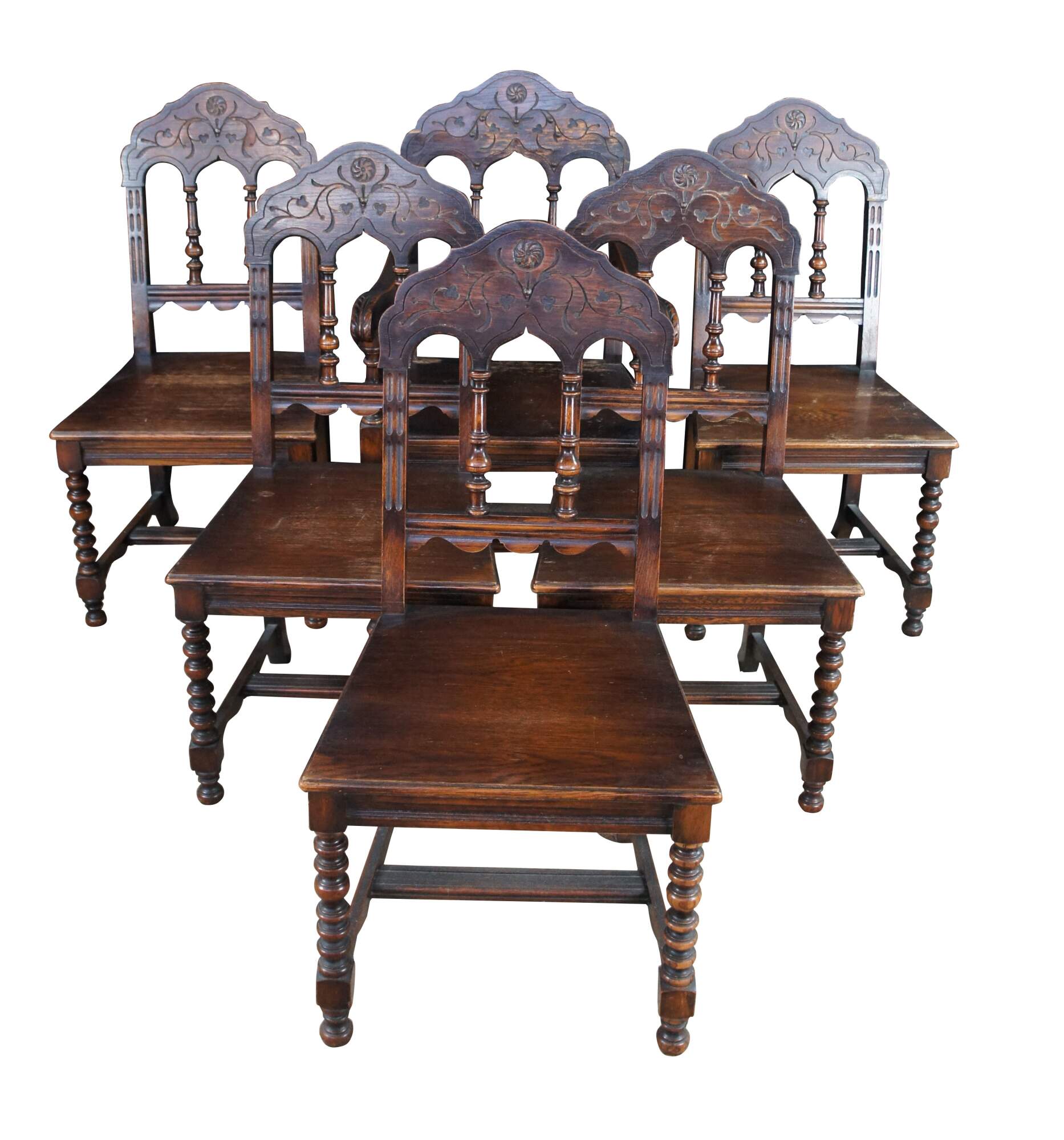 Antique set of six dining chairs featuring Jacobean and Spanish Revival styling. Made of oak with arched gothic back, floral carved accents, and turned posts connected by H stretcher.