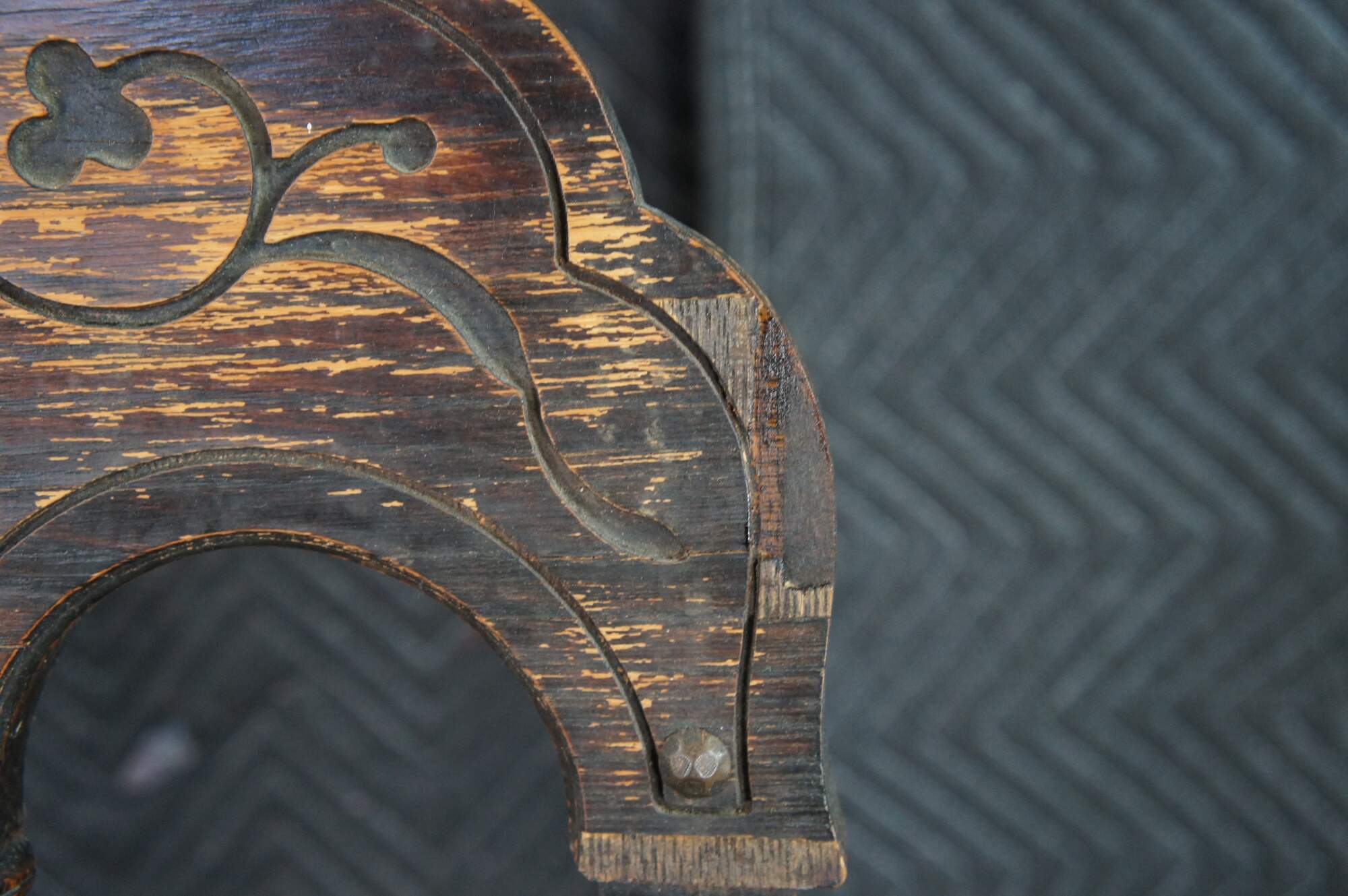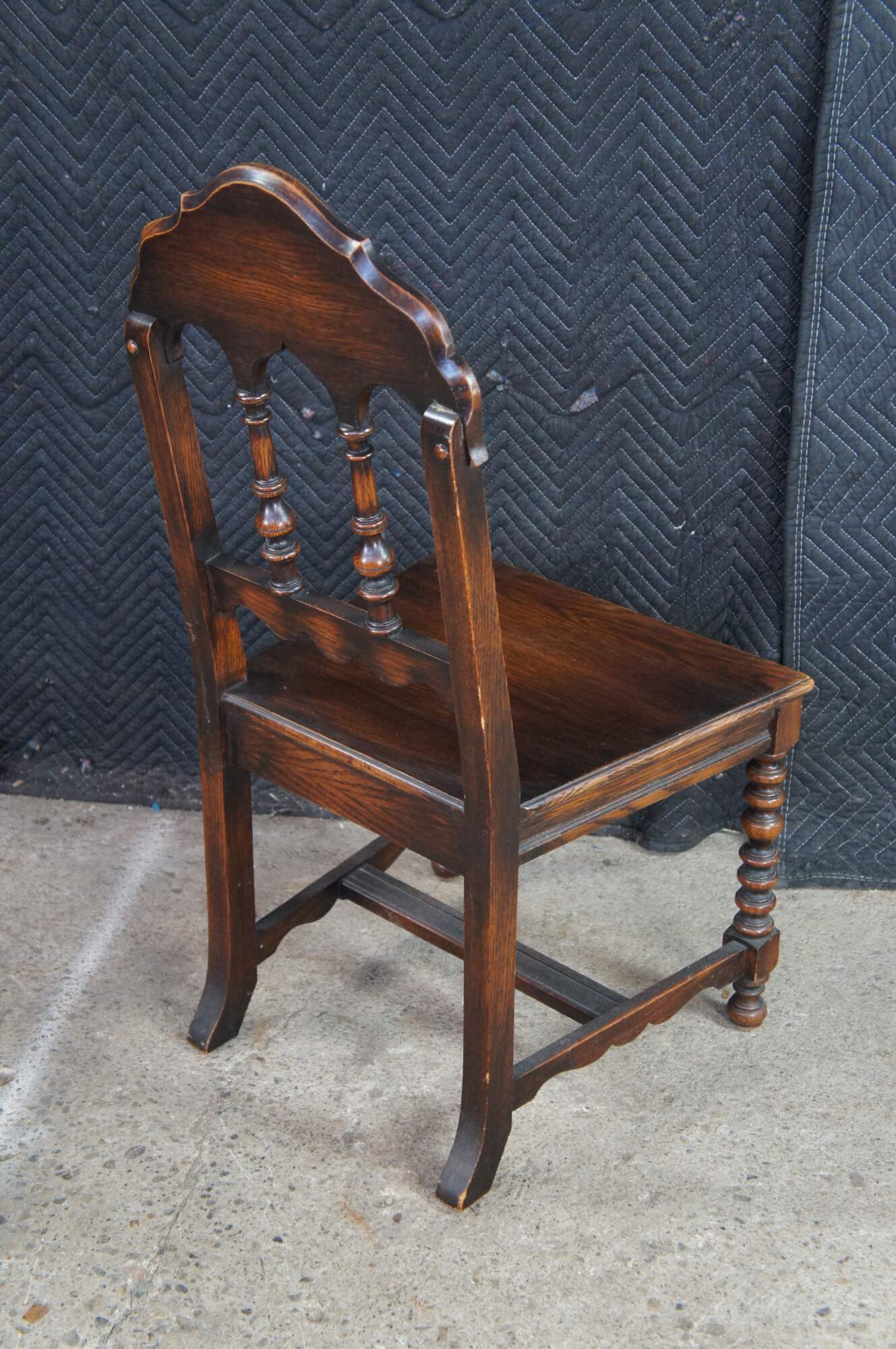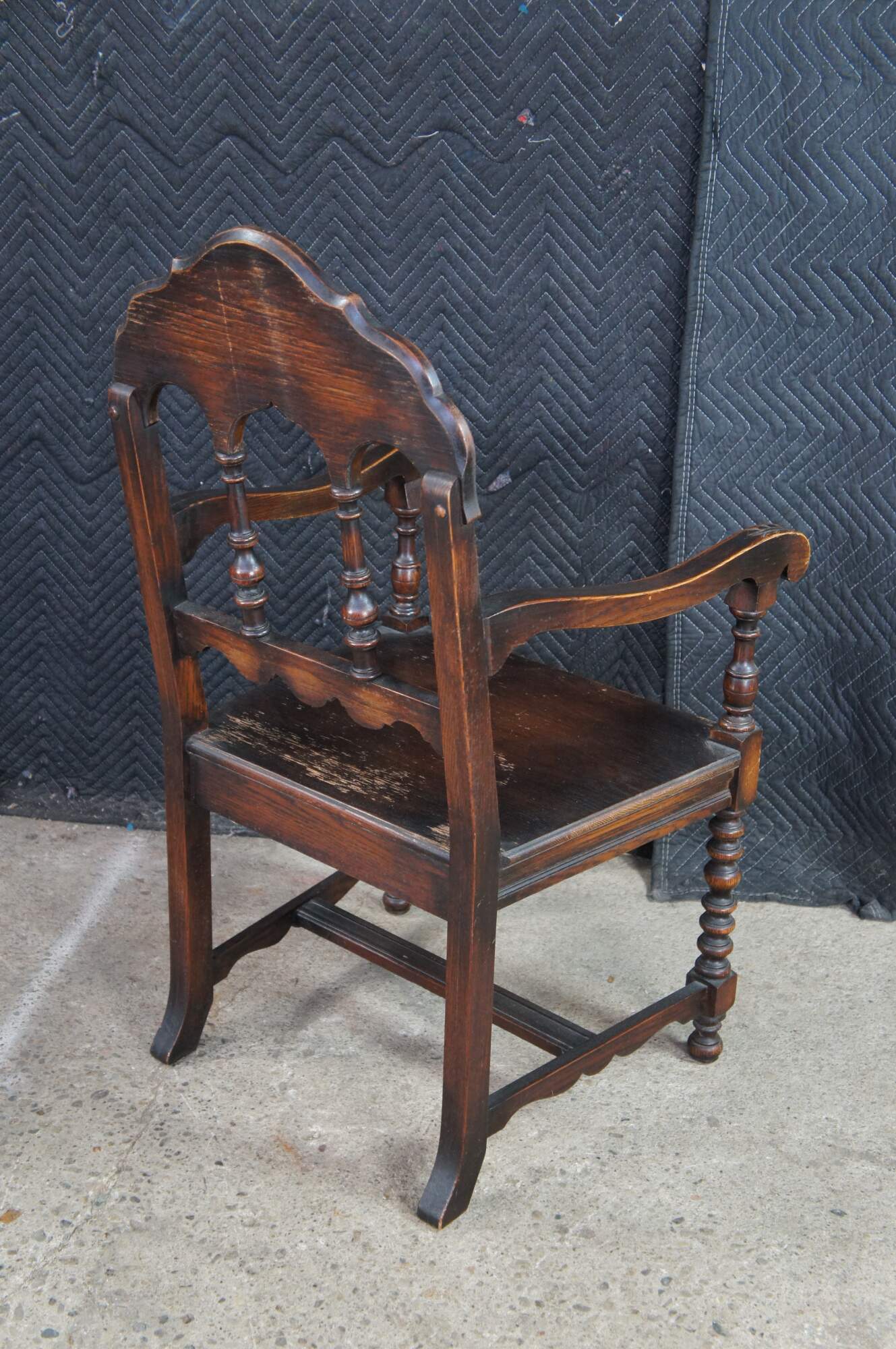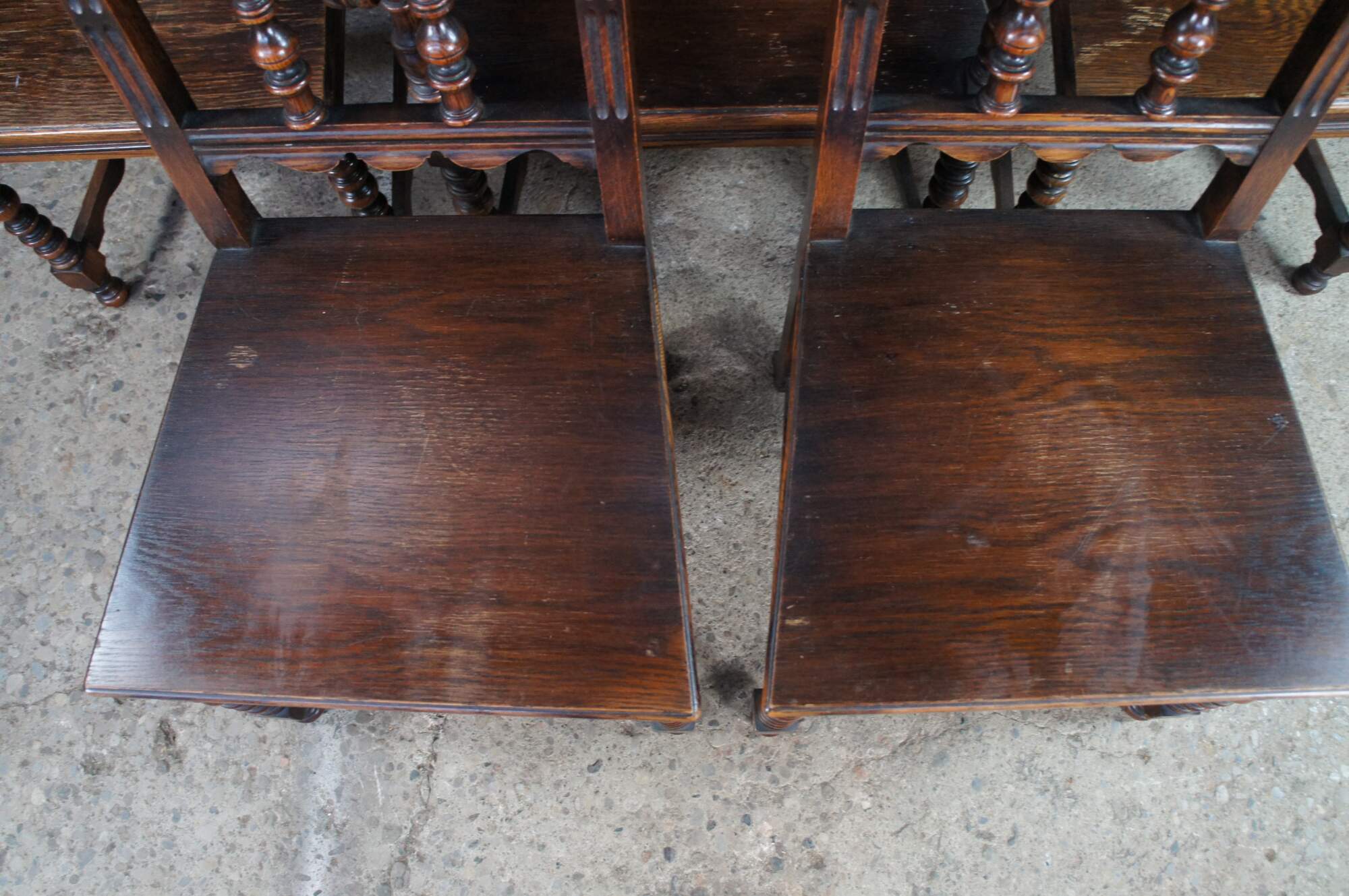 Antique set of six dining chairs featuring Jacobean and Spanish Revival styling. Made of oak with arched gothic back, floral carved accents, and turned posts connected by H stretcher.