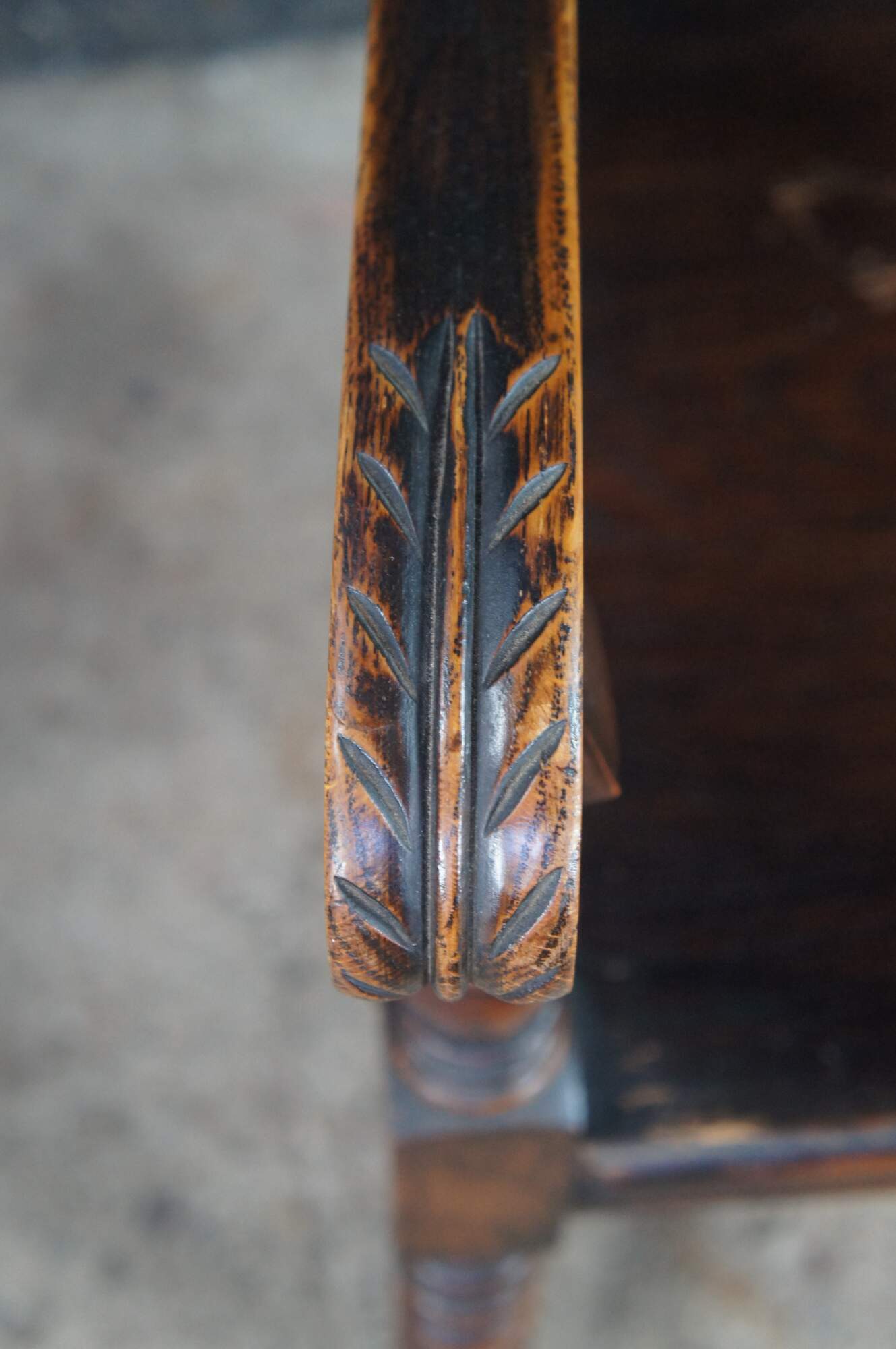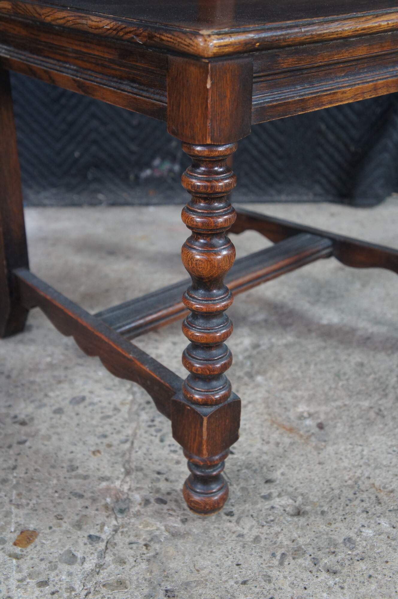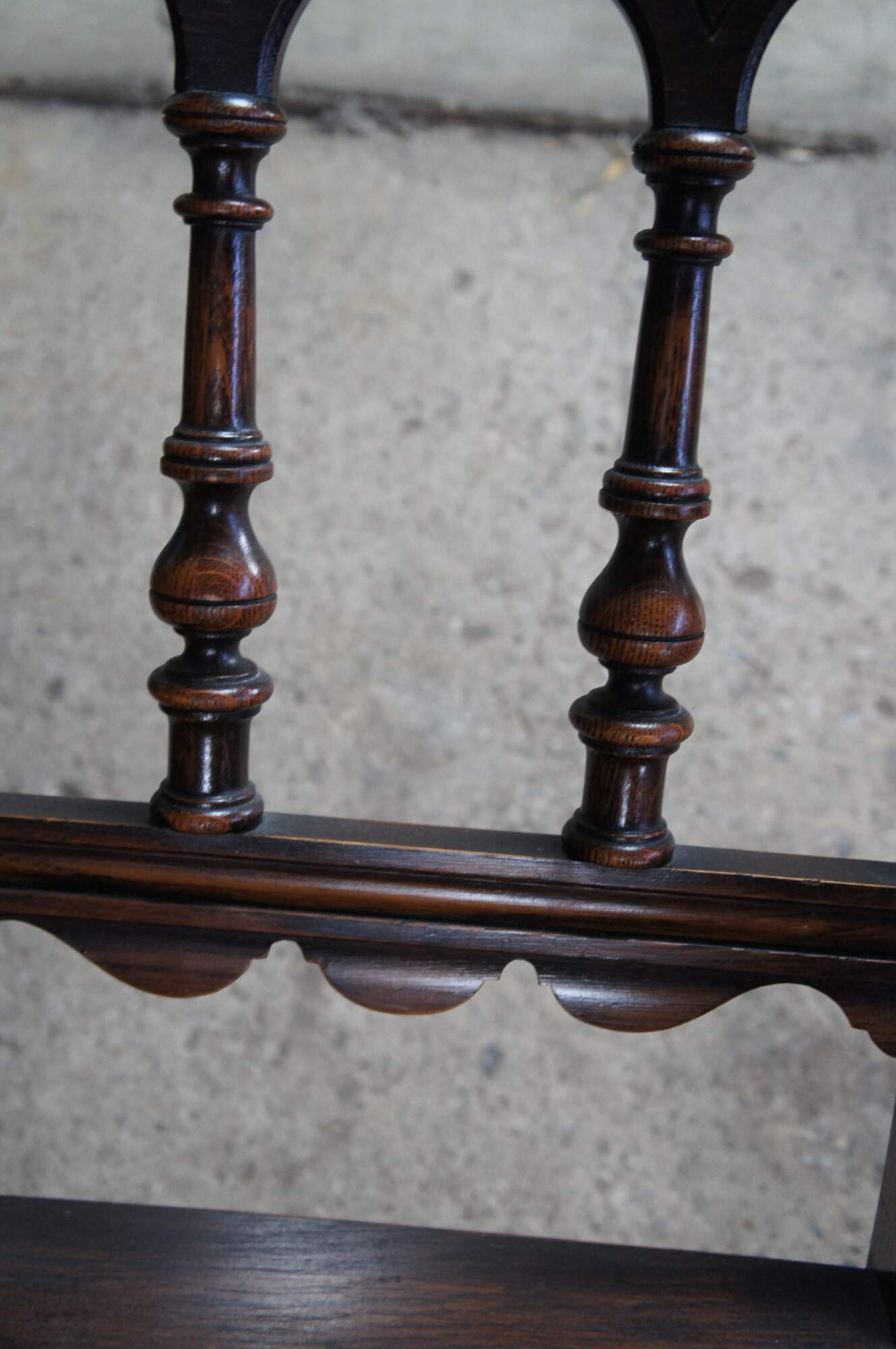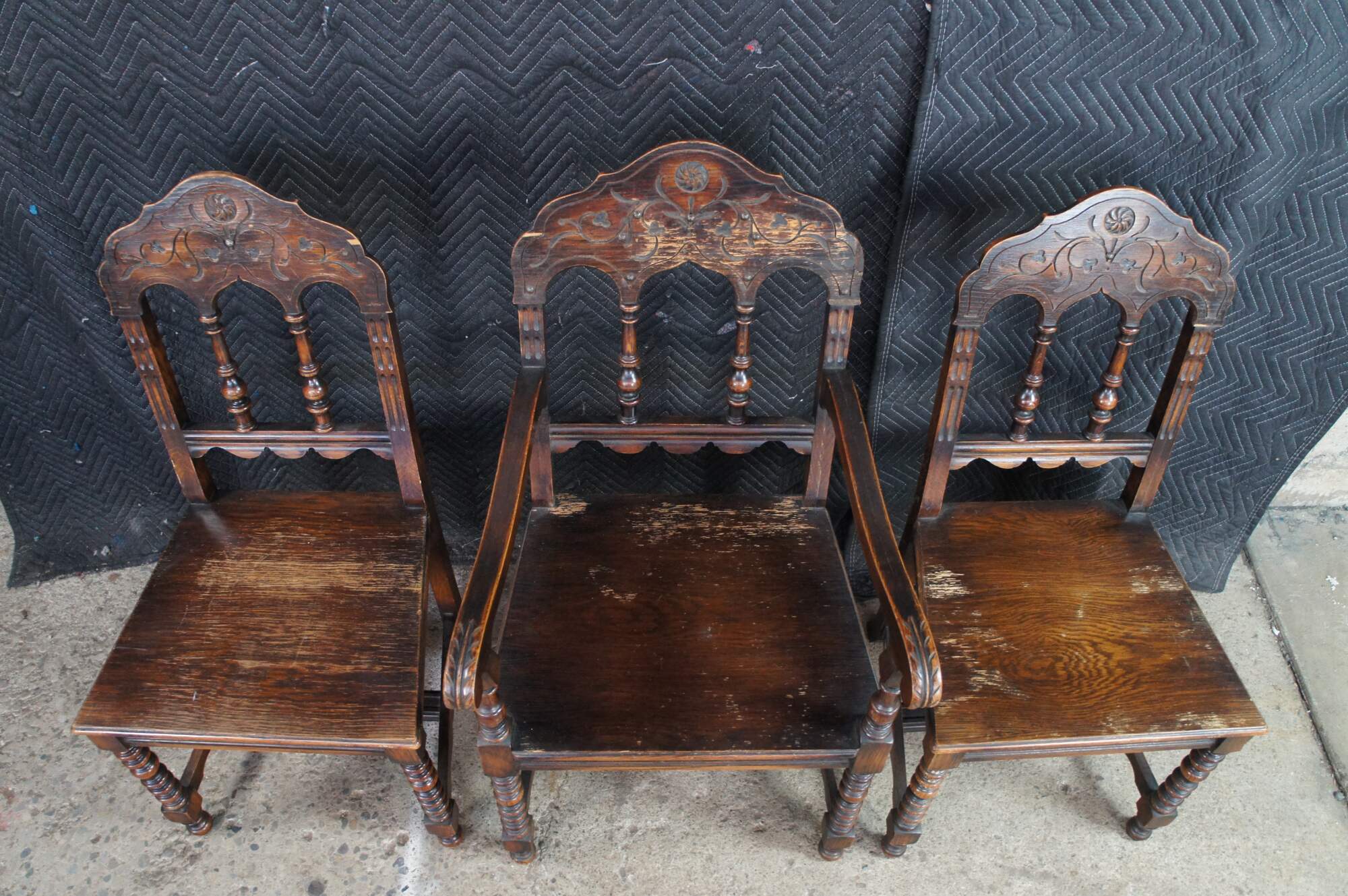 Antique set of six dining chairs featuring Jacobean and Spanish Revival styling. Made of oak with arched gothic back, floral carved accents, and turned posts connected by H stretcher.