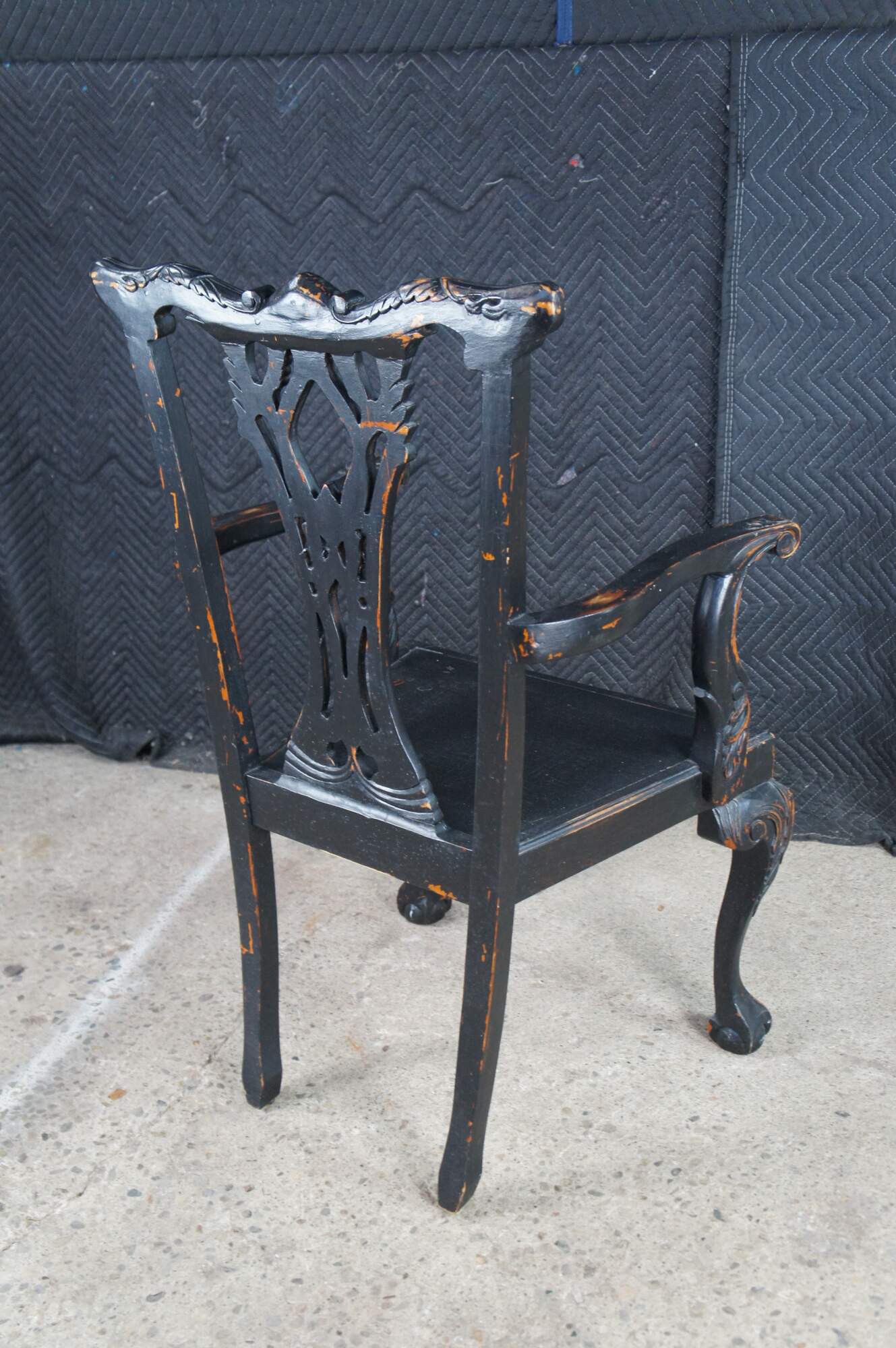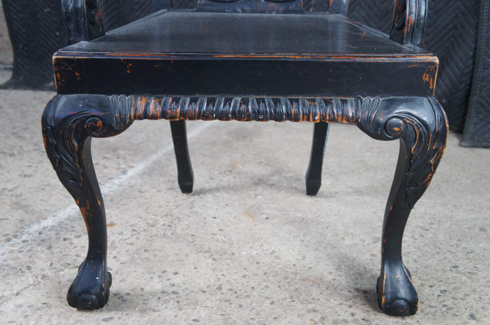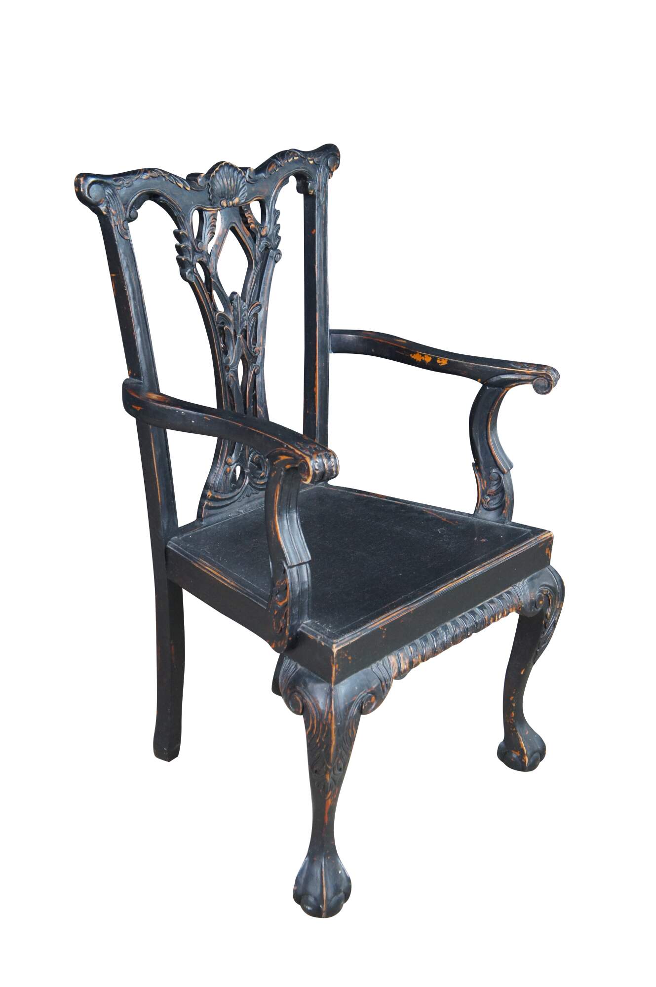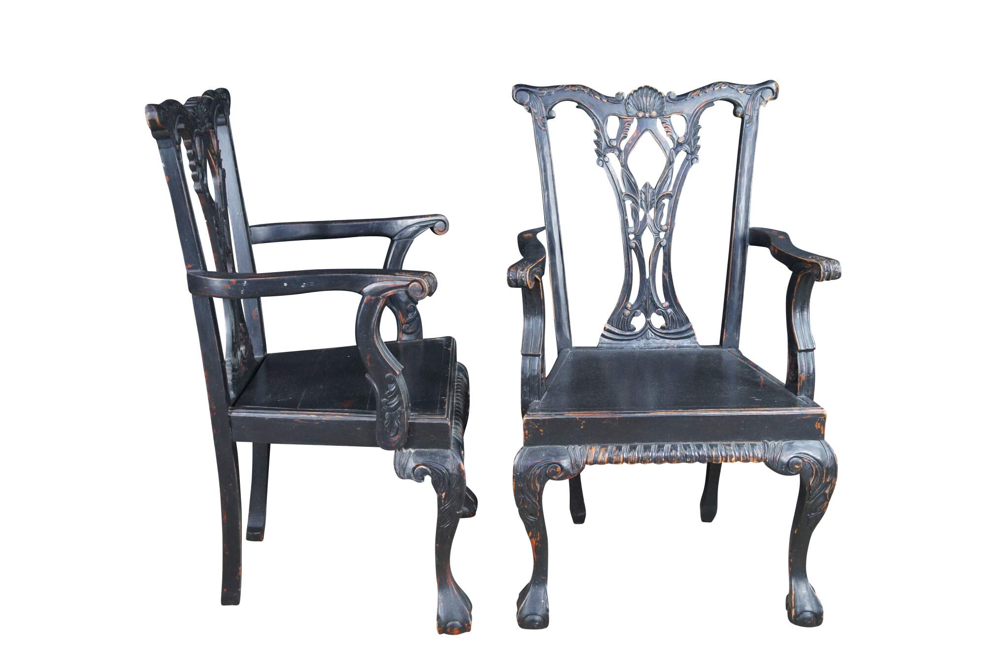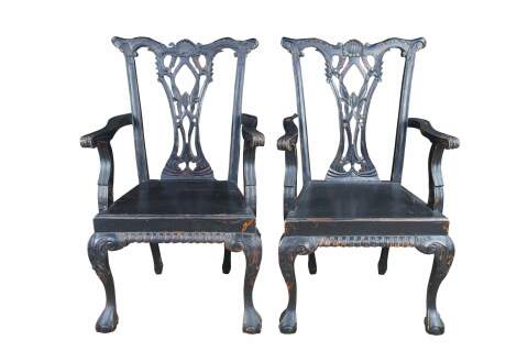Pair of two vintage English Chippendale / Georgian style dining arm chairs. Made of mahogany featuring a serpentine scalloped crest rail carved along the ear over and interlaced pierced back splat leading to a flat seat. The chair is supported by cabriole legs with acanthus carved knees leading to a ball and claw foot.