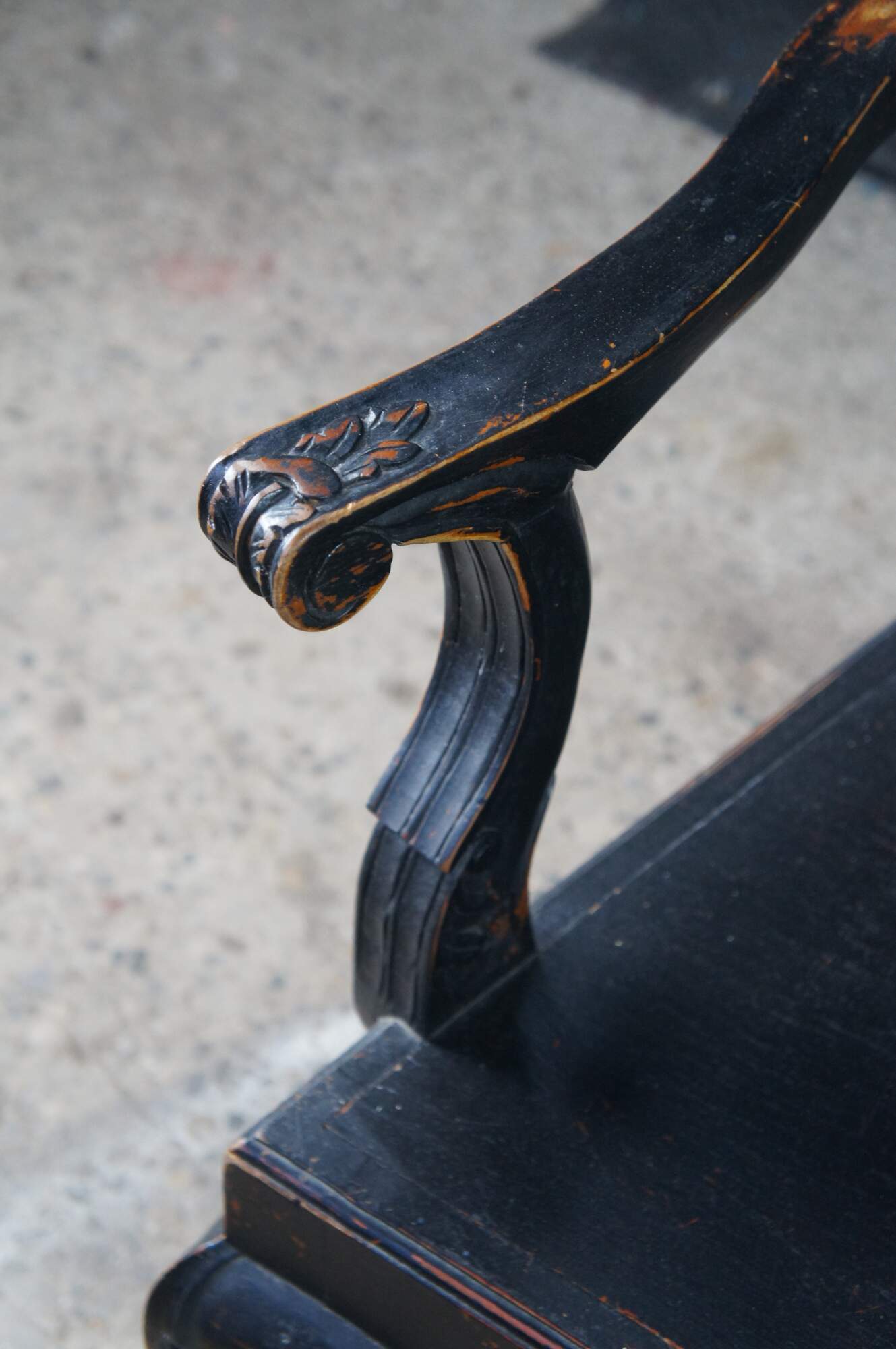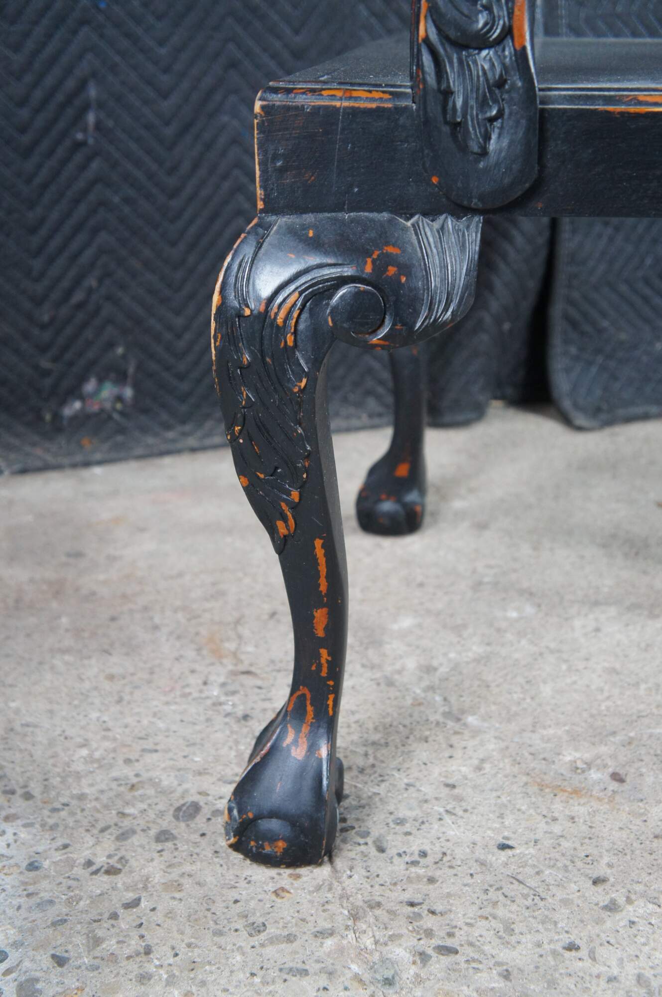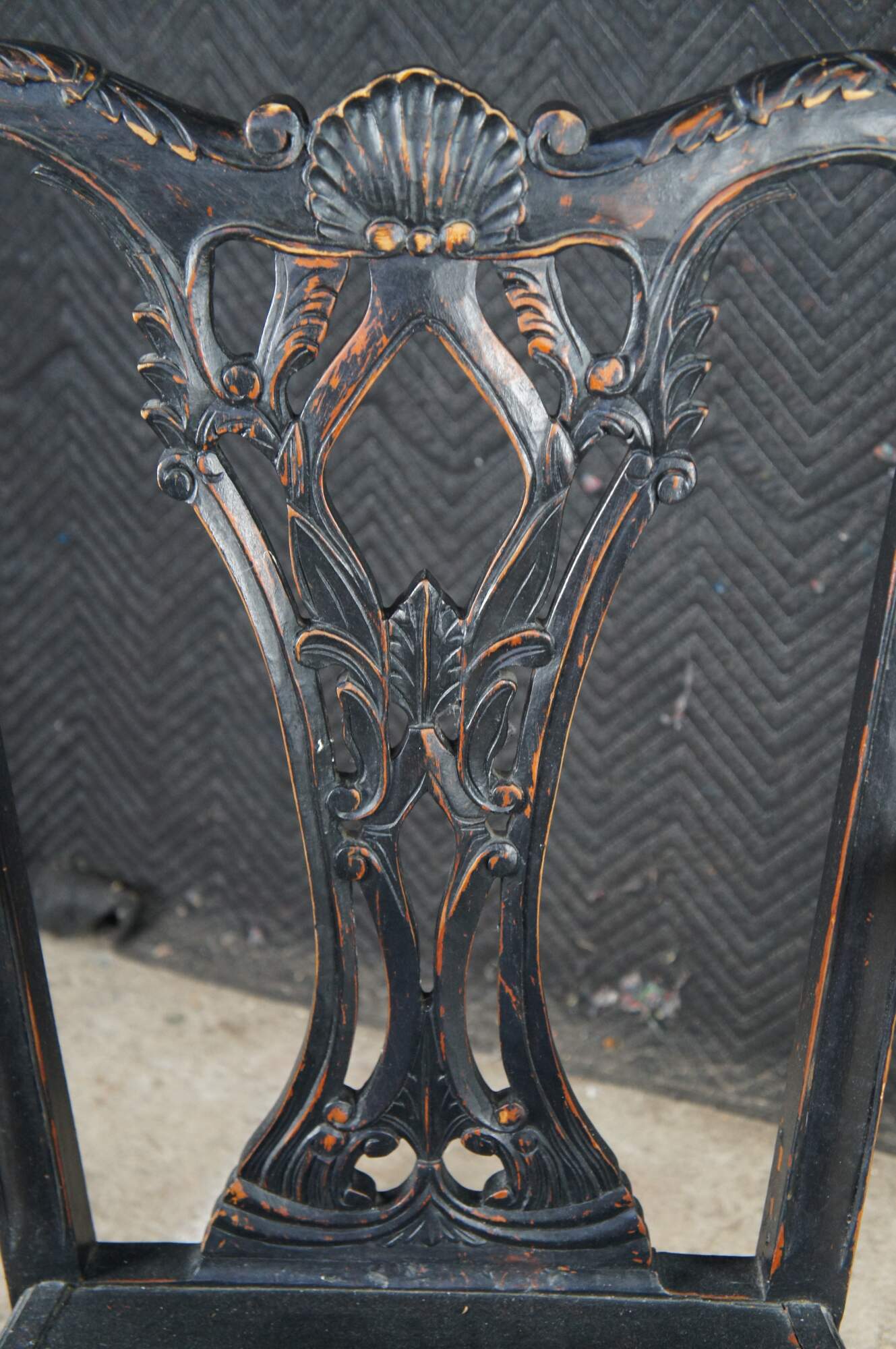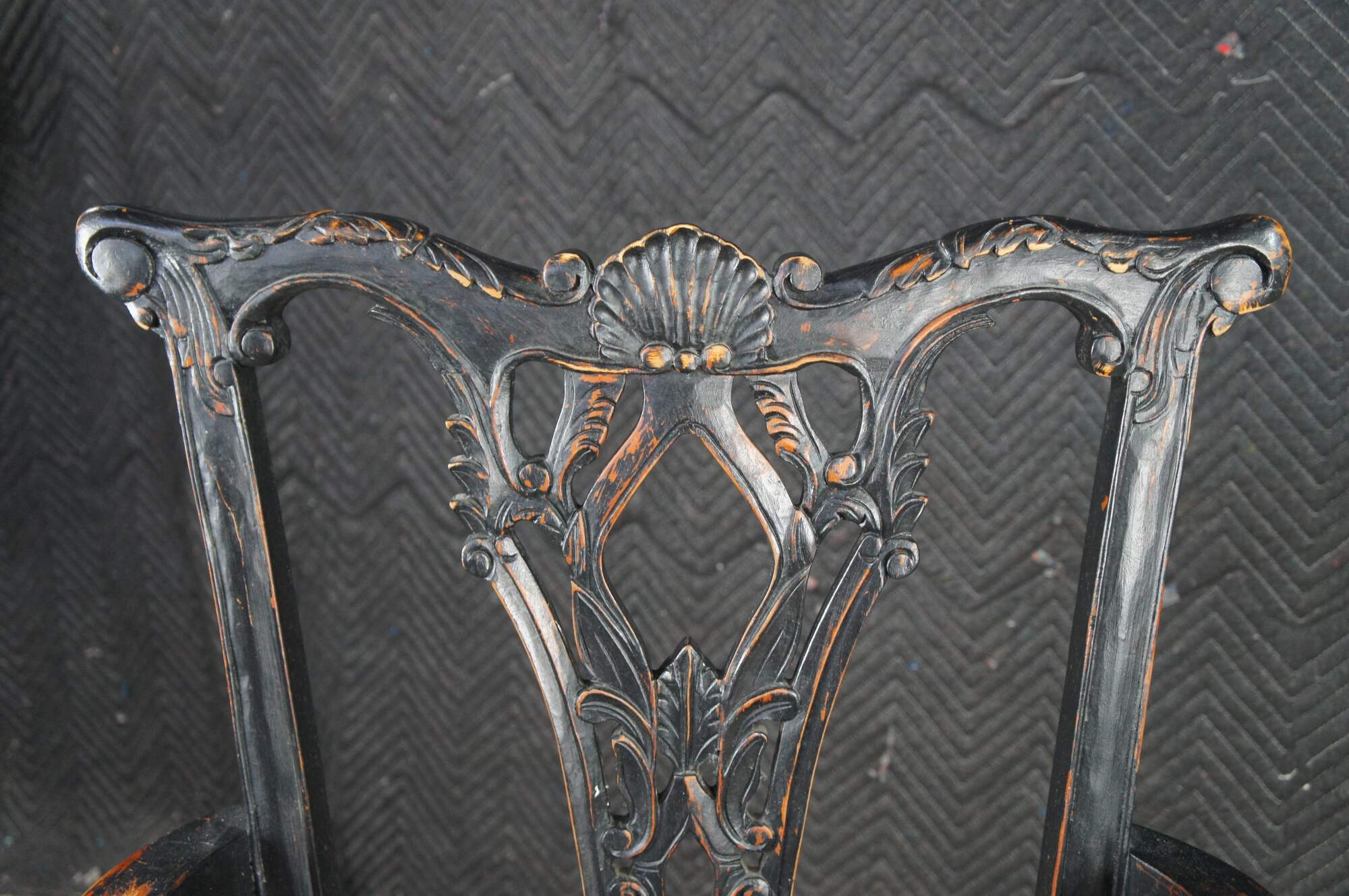 Pair of two vintage English Chippendale / Georgian style dining arm chairs. Made of mahogany featuring a serpentine scalloped crest rail carved along the ear over and interlaced pierced back splat leading to a flat seat. The chair is supported by cabriole legs with acanthus carved knees leading to a ball and claw foot.