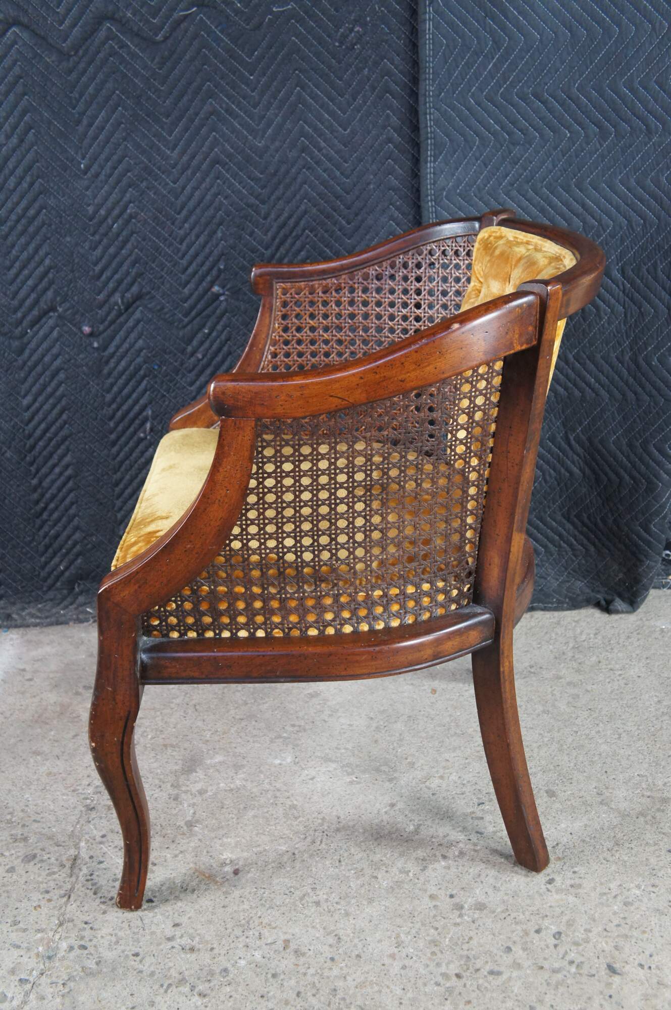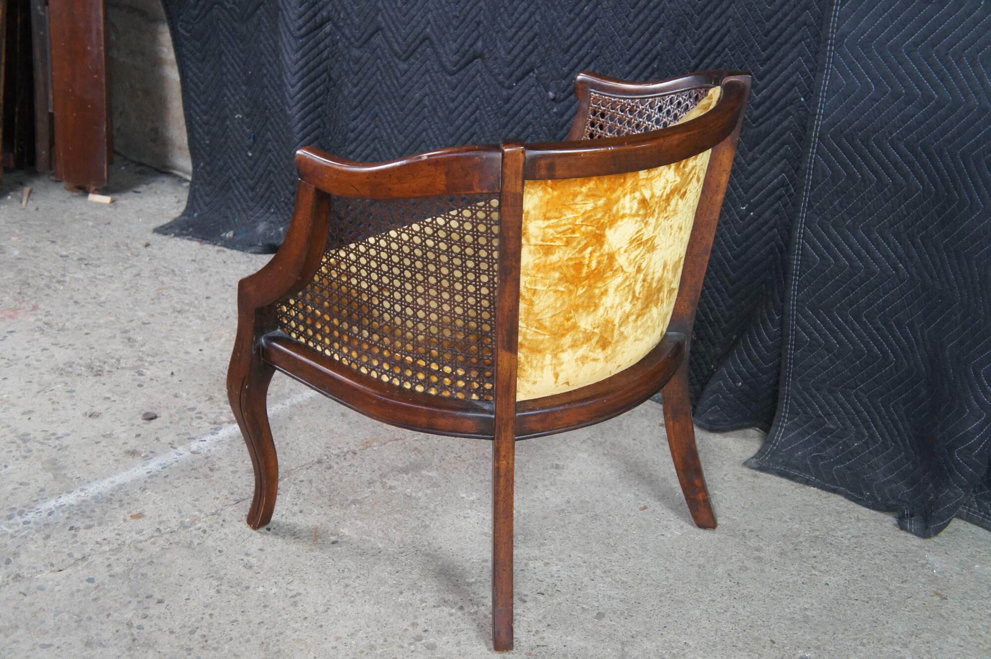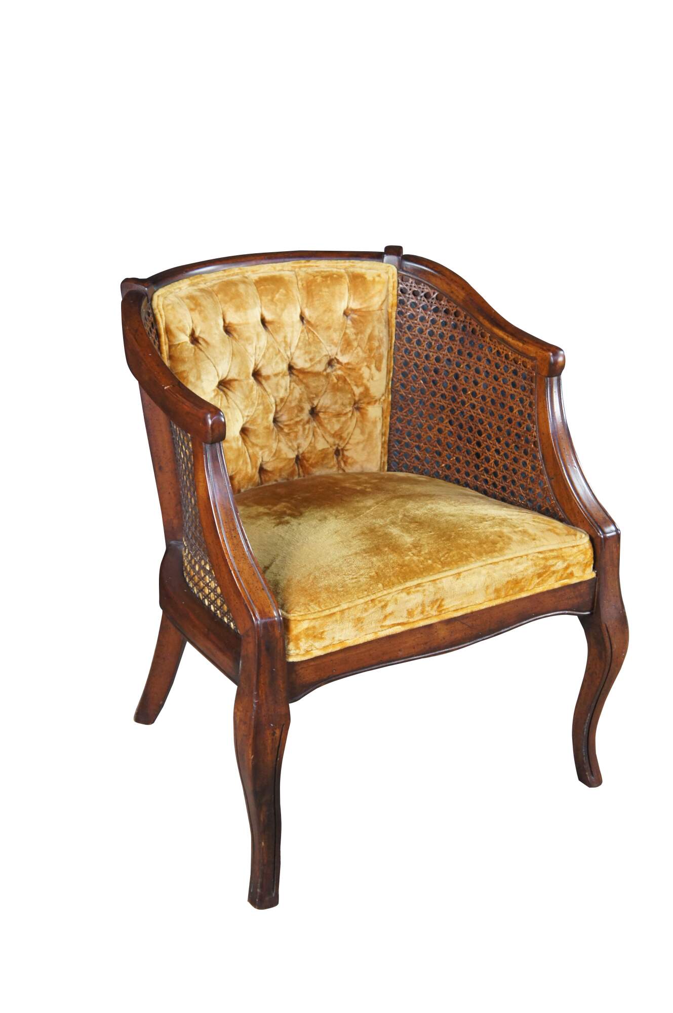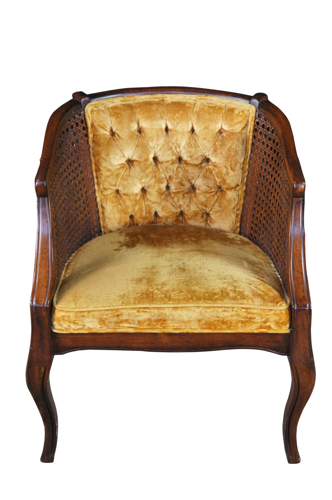 Vintage French Louis XVI style bergere arm chair. Made of walnut featuring a barrel back with tufted velvet upholstery and caned sides.