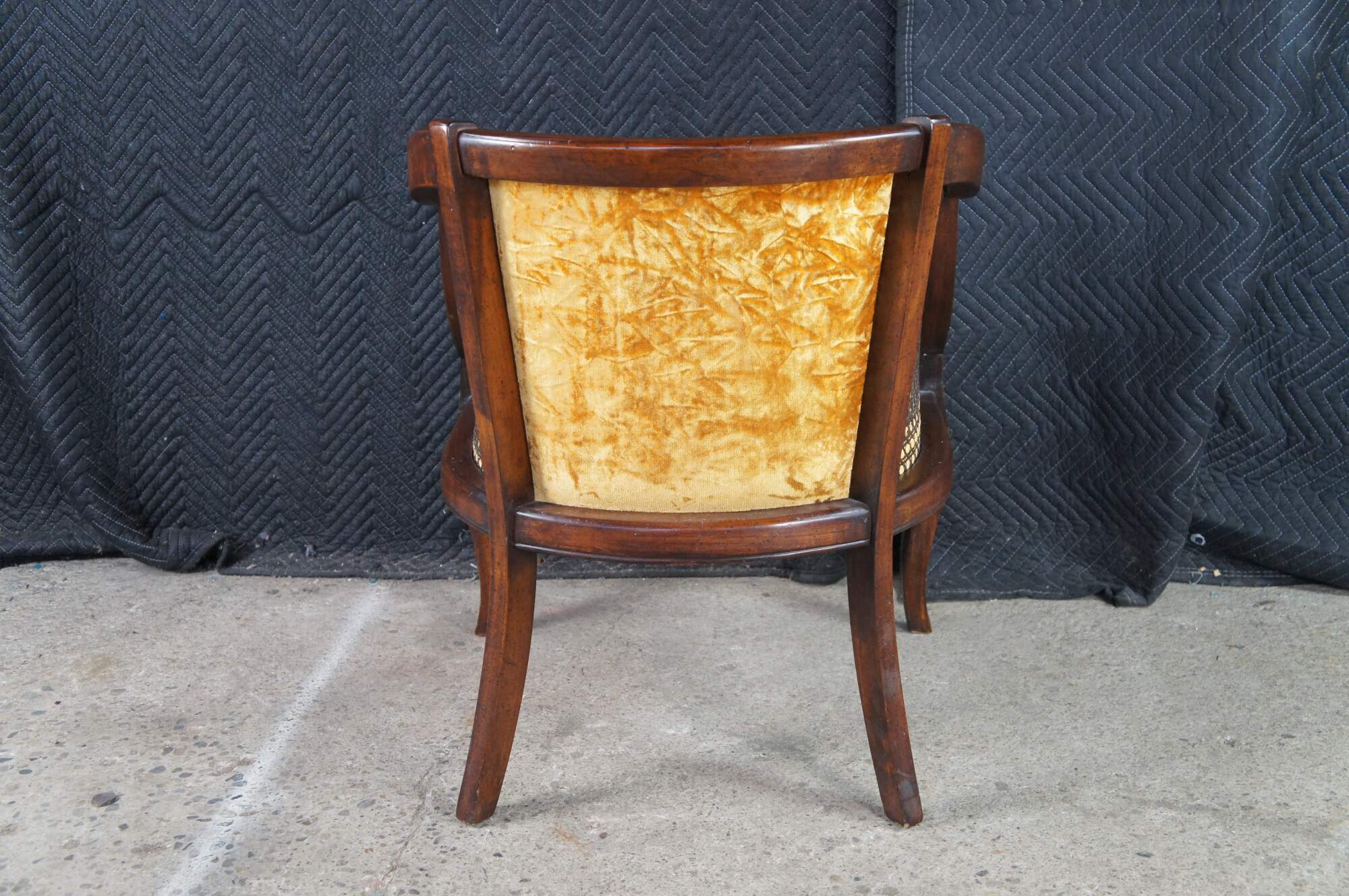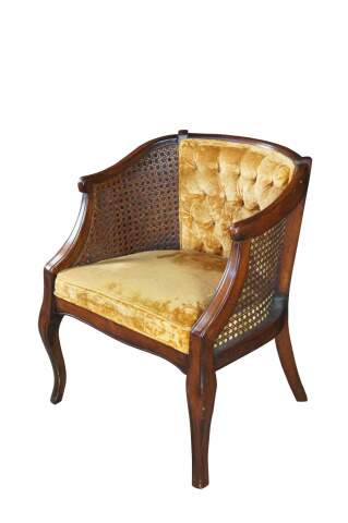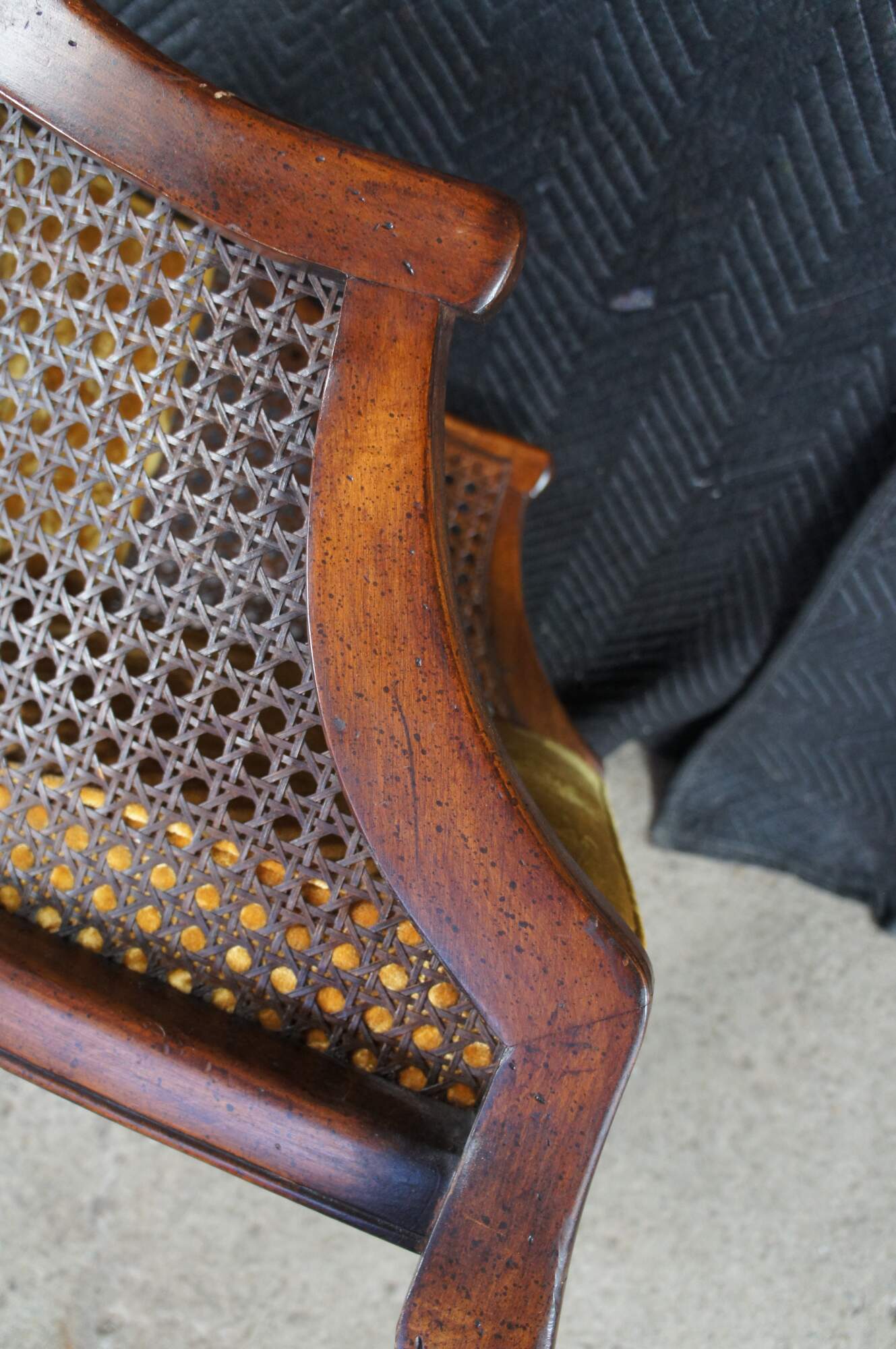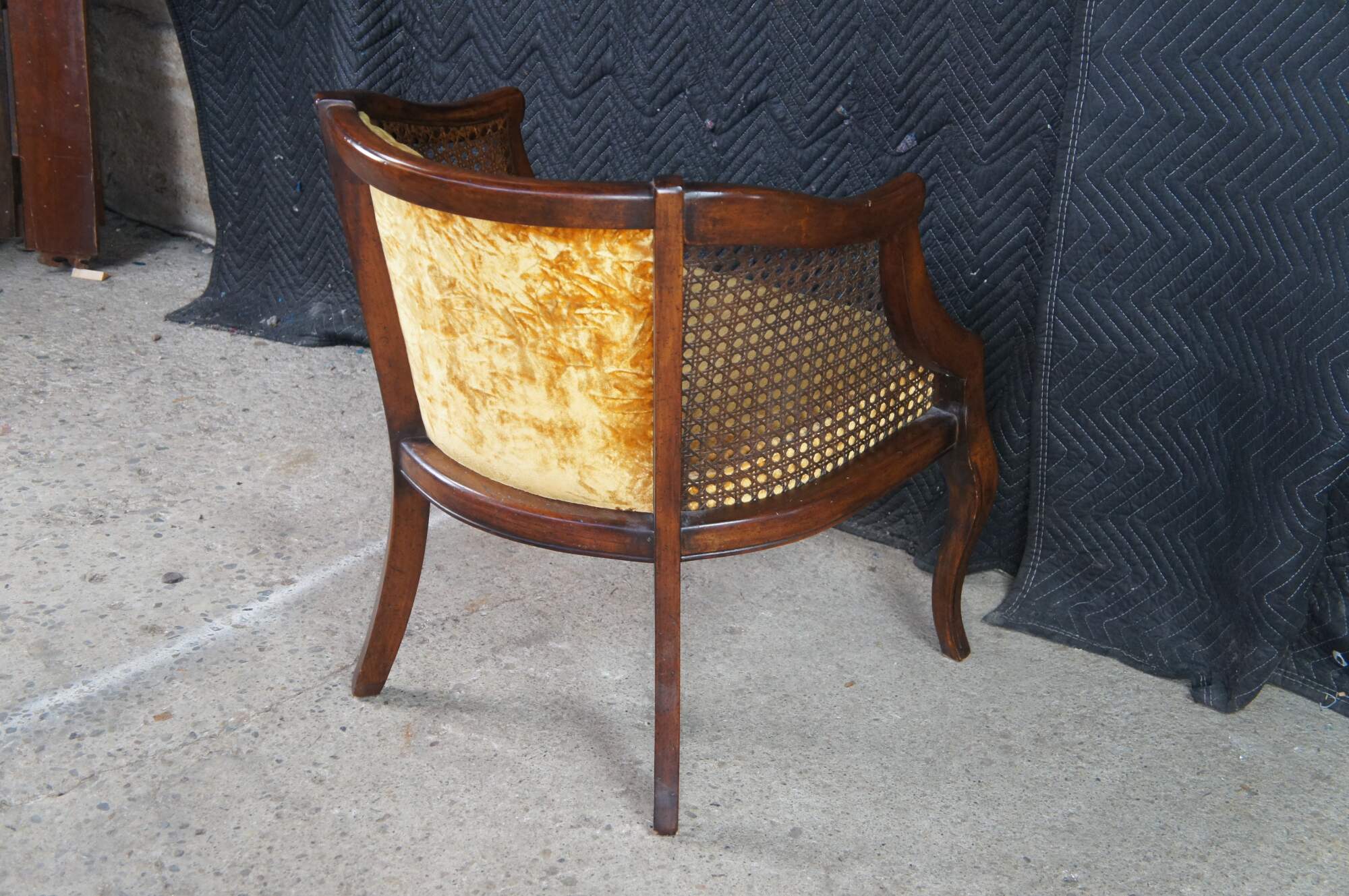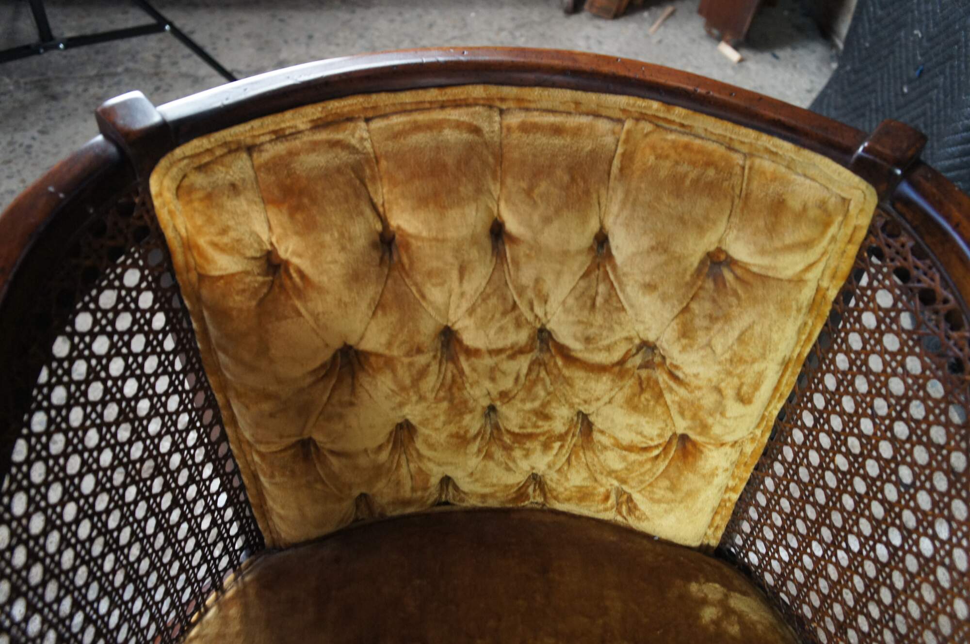 Vintage French Louis XVI style bergere arm chair. Made of walnut featuring a barrel back with tufted velvet upholstery and caned sides.