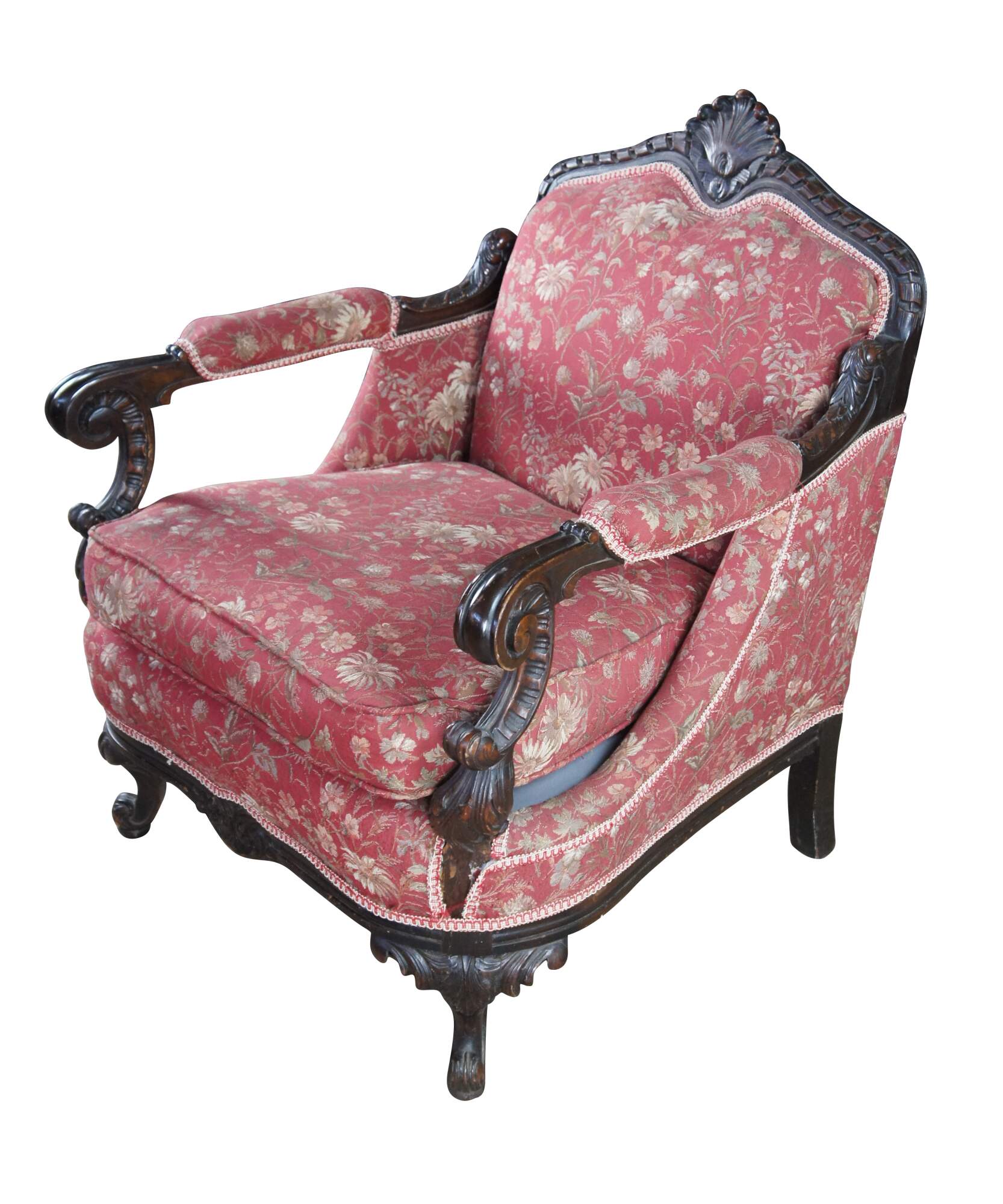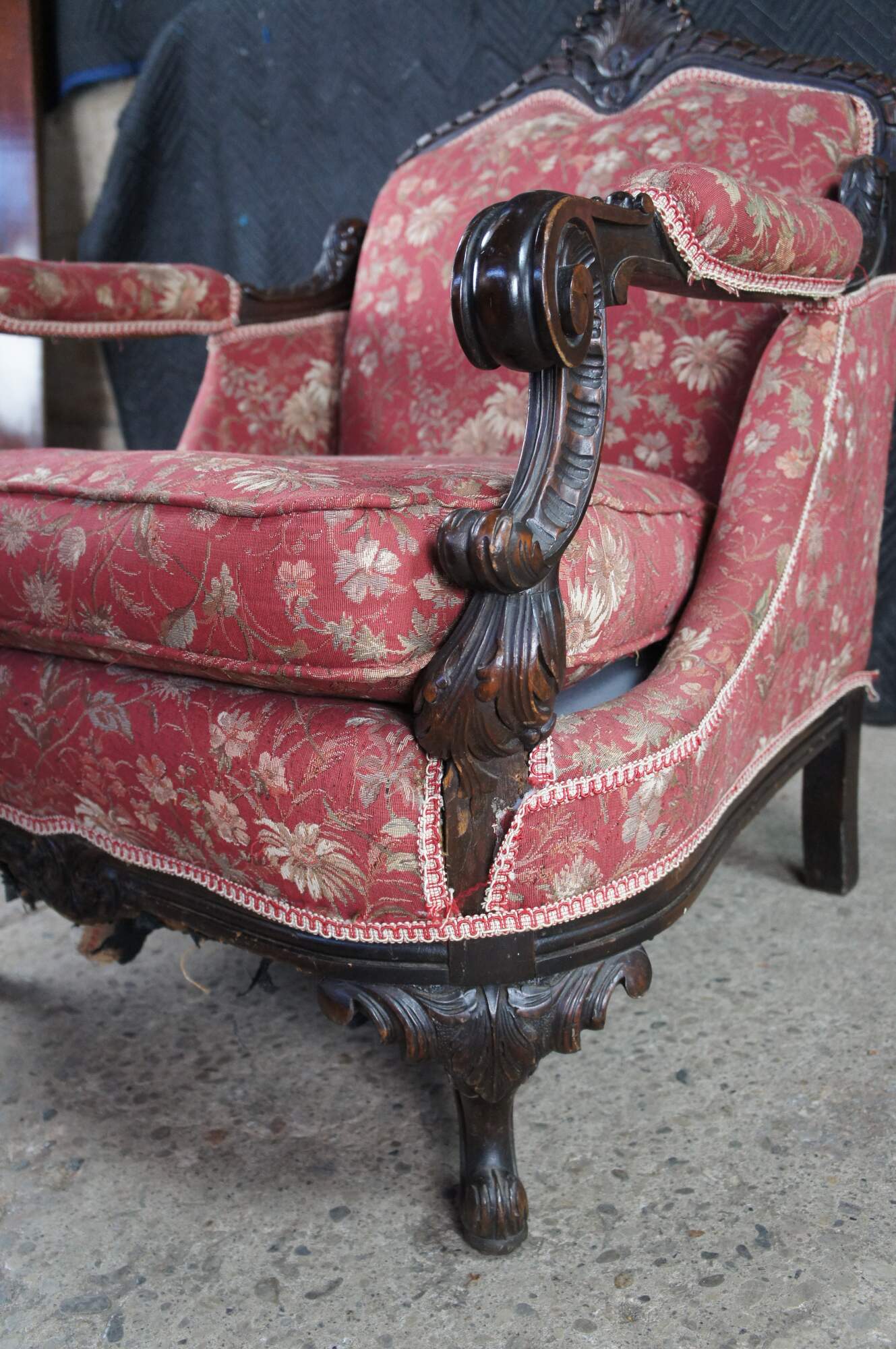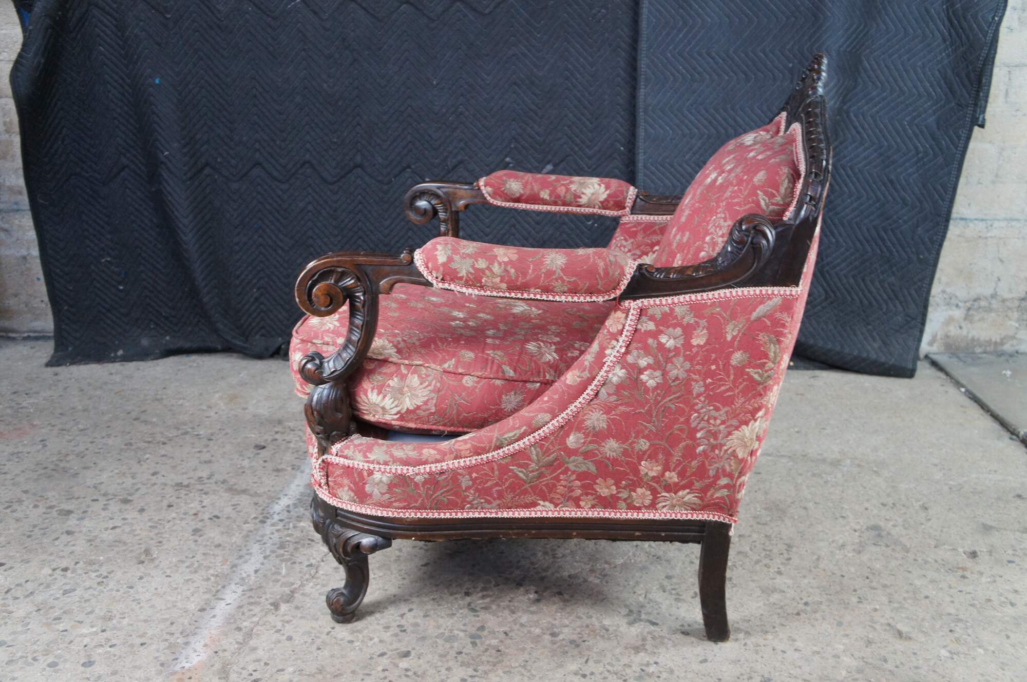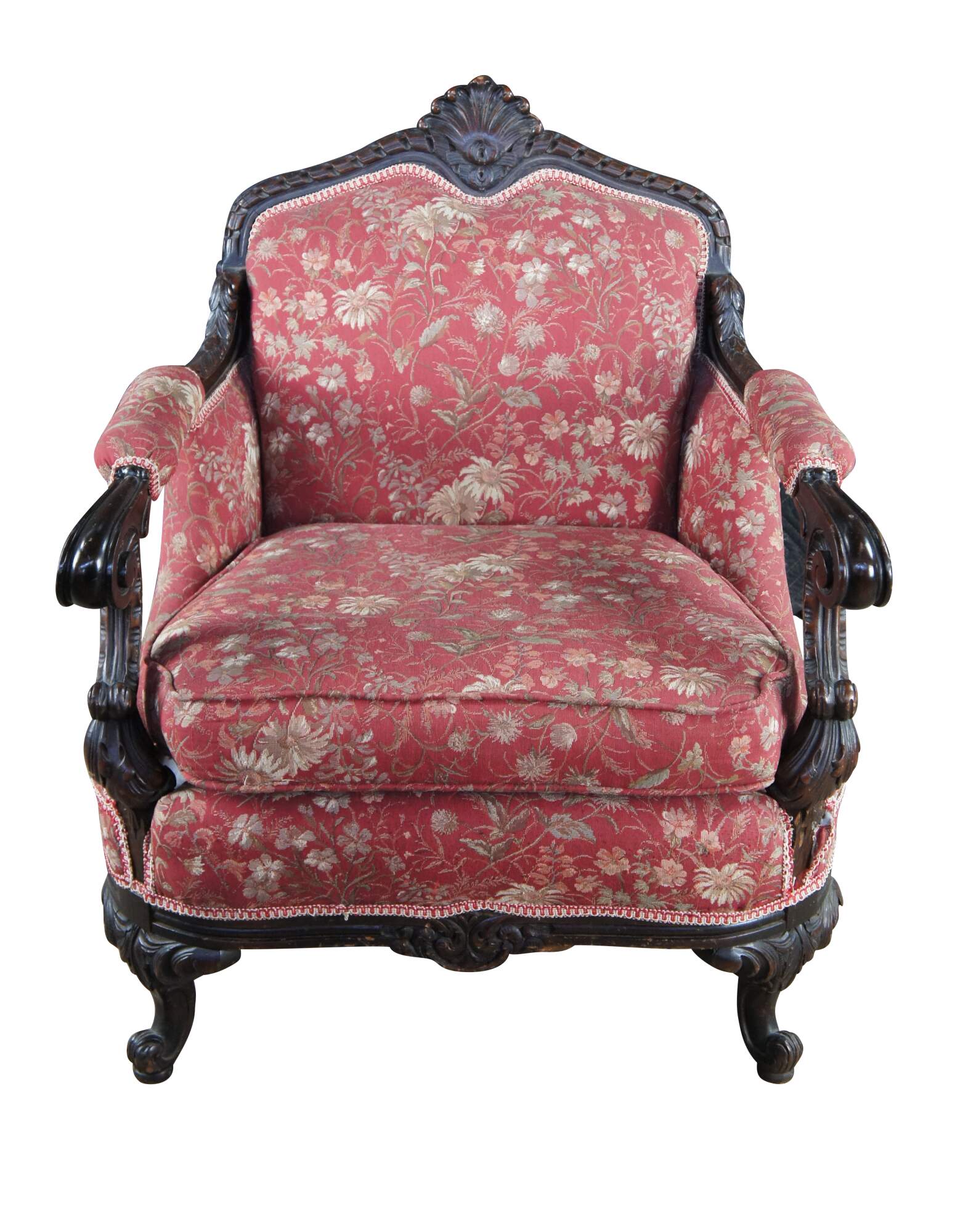 Antique Victorian oversized gentlemans parlor / fireside / club / lounge arm chair. Made of mahogany featuring highly carved Baroque / Rococo / acanthus designs with fauteuil padded arms, and chunky cabriole legs.