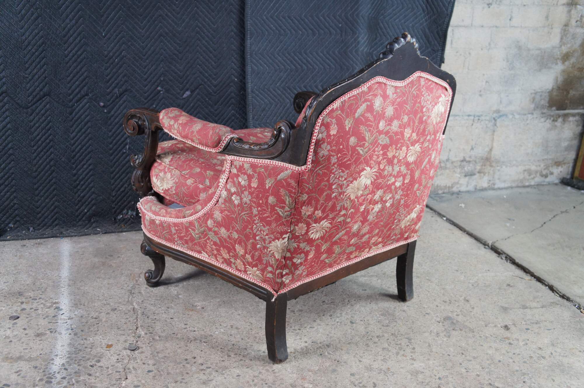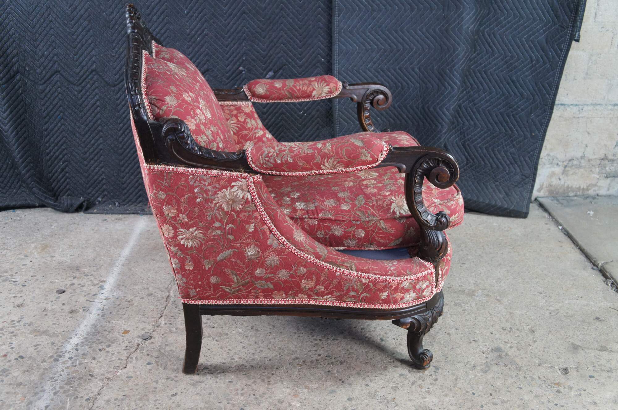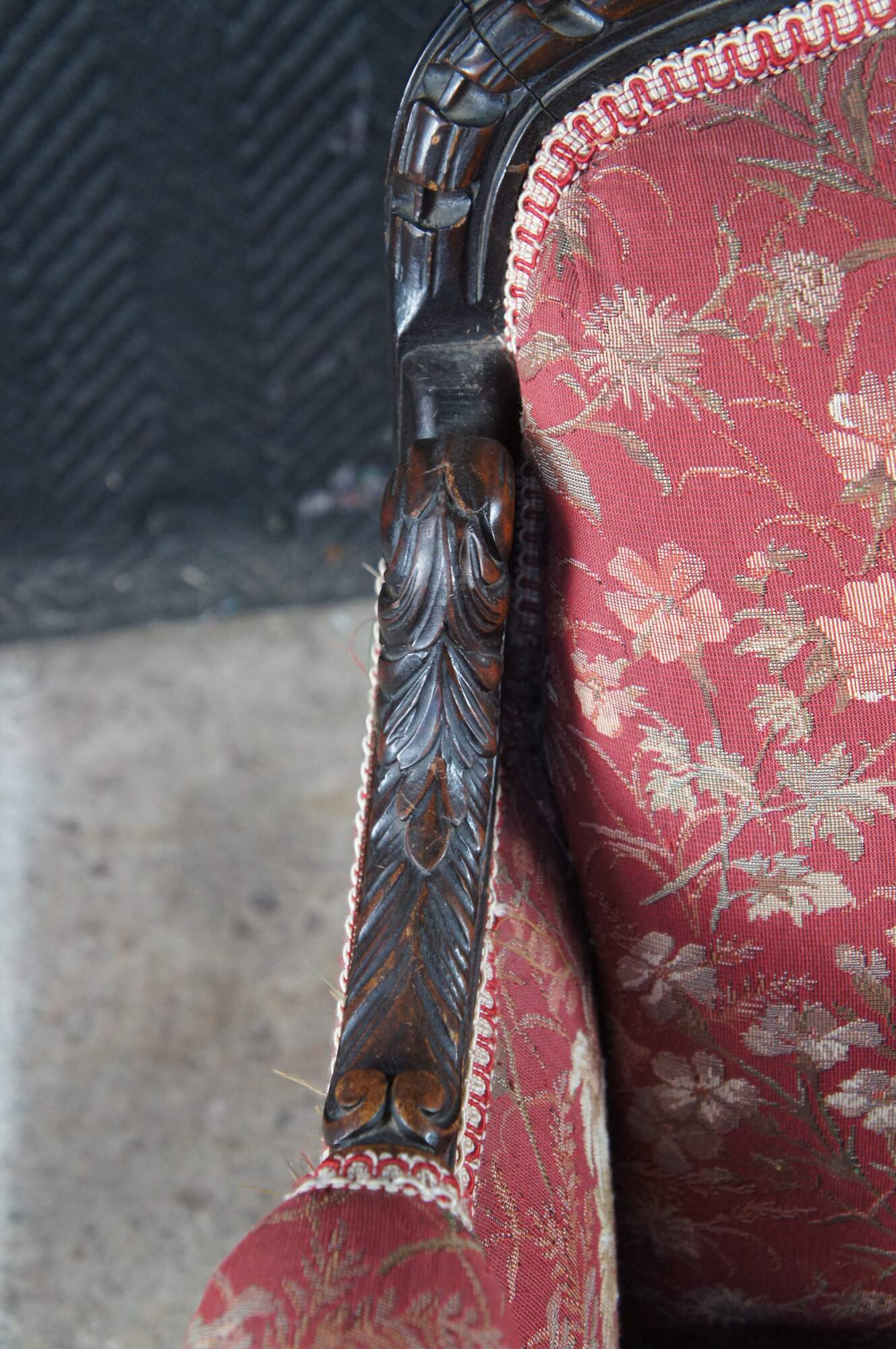 Antique Victorian oversized gentlemans parlor / fireside / club / lounge arm chair. Made of mahogany featuring highly carved Baroque / Rococo / acanthus designs with fauteuil padded arms, and chunky cabriole legs.
