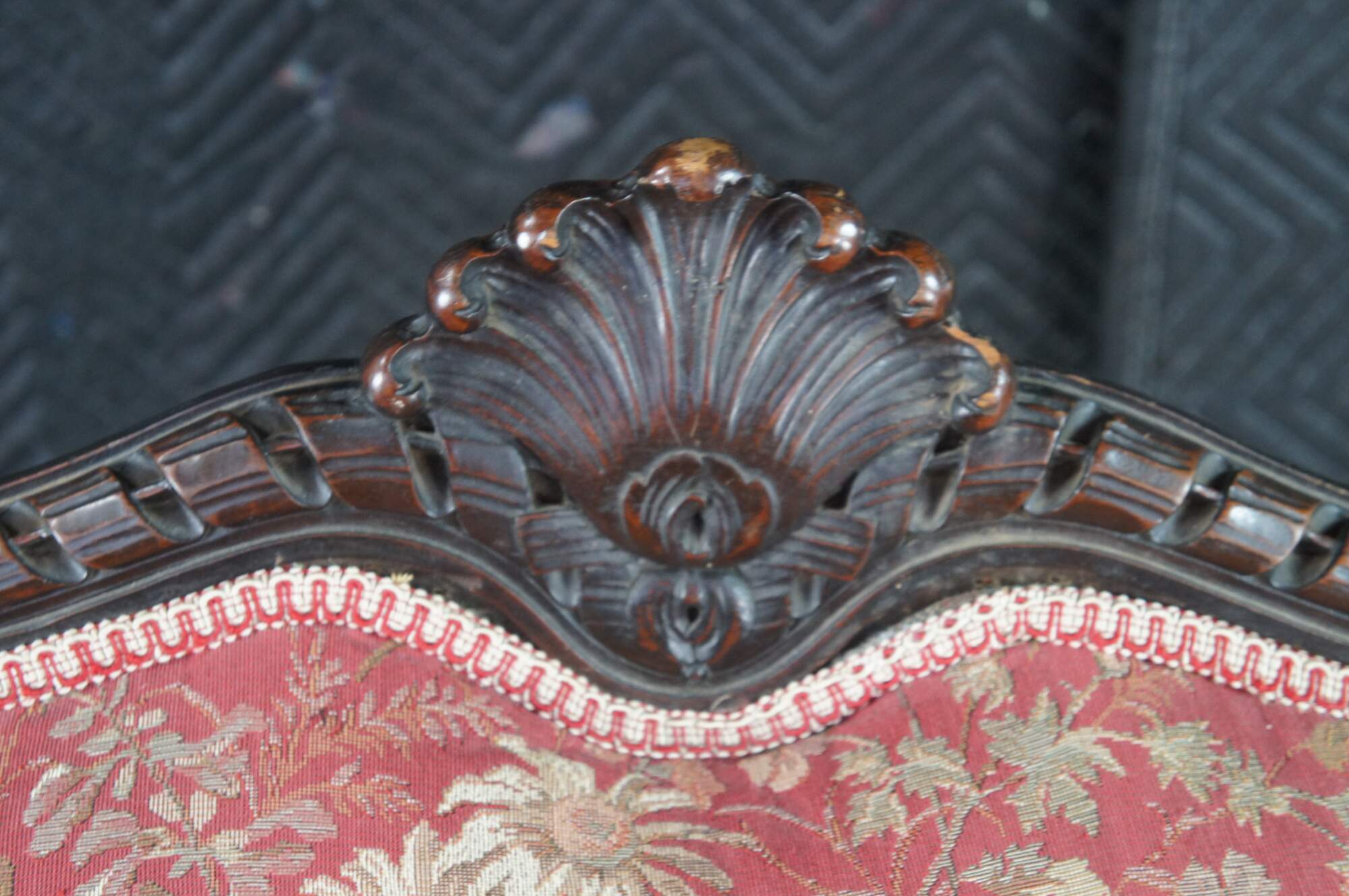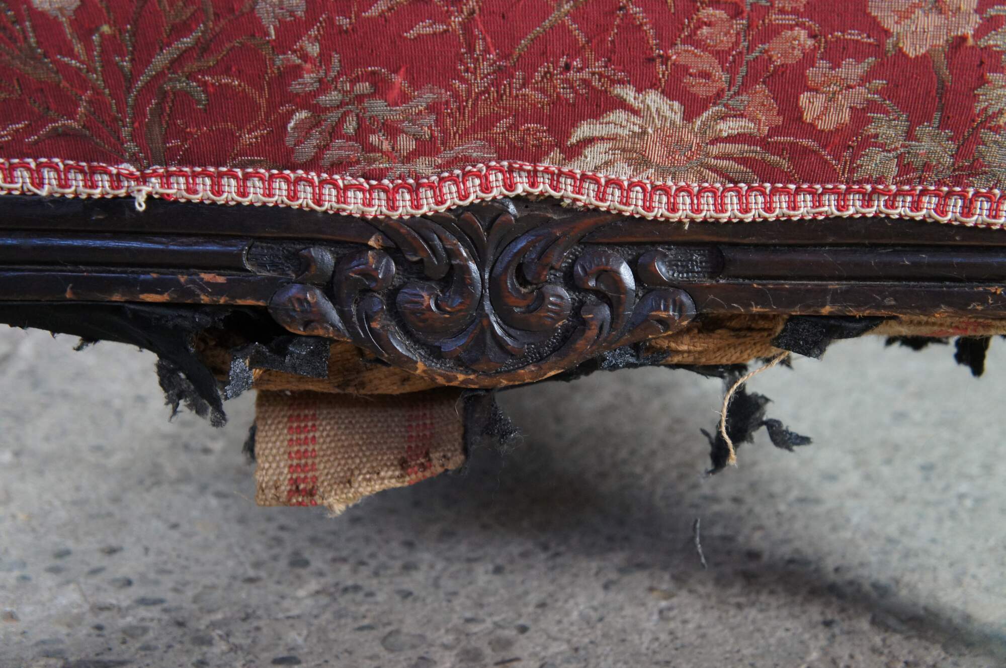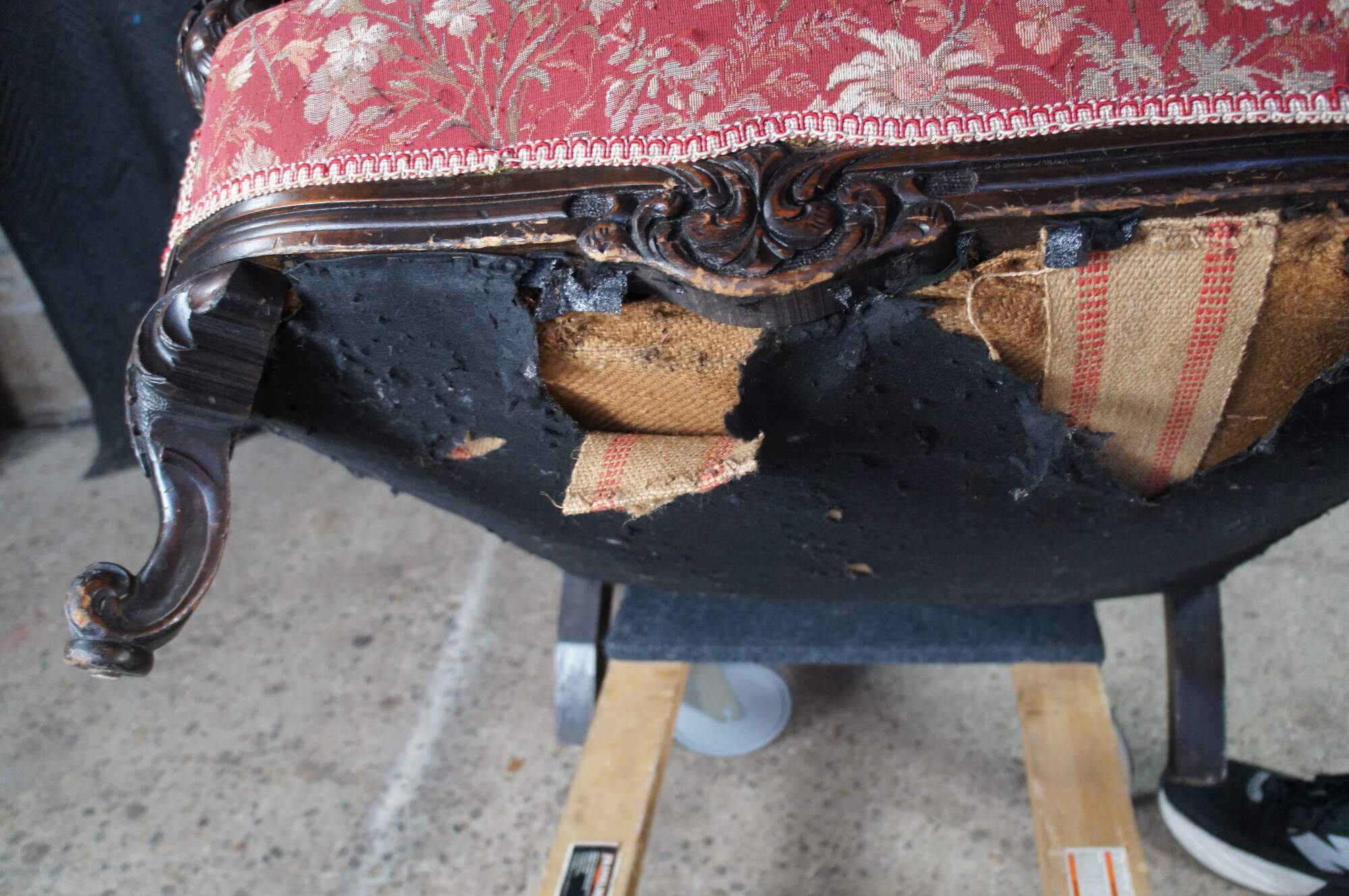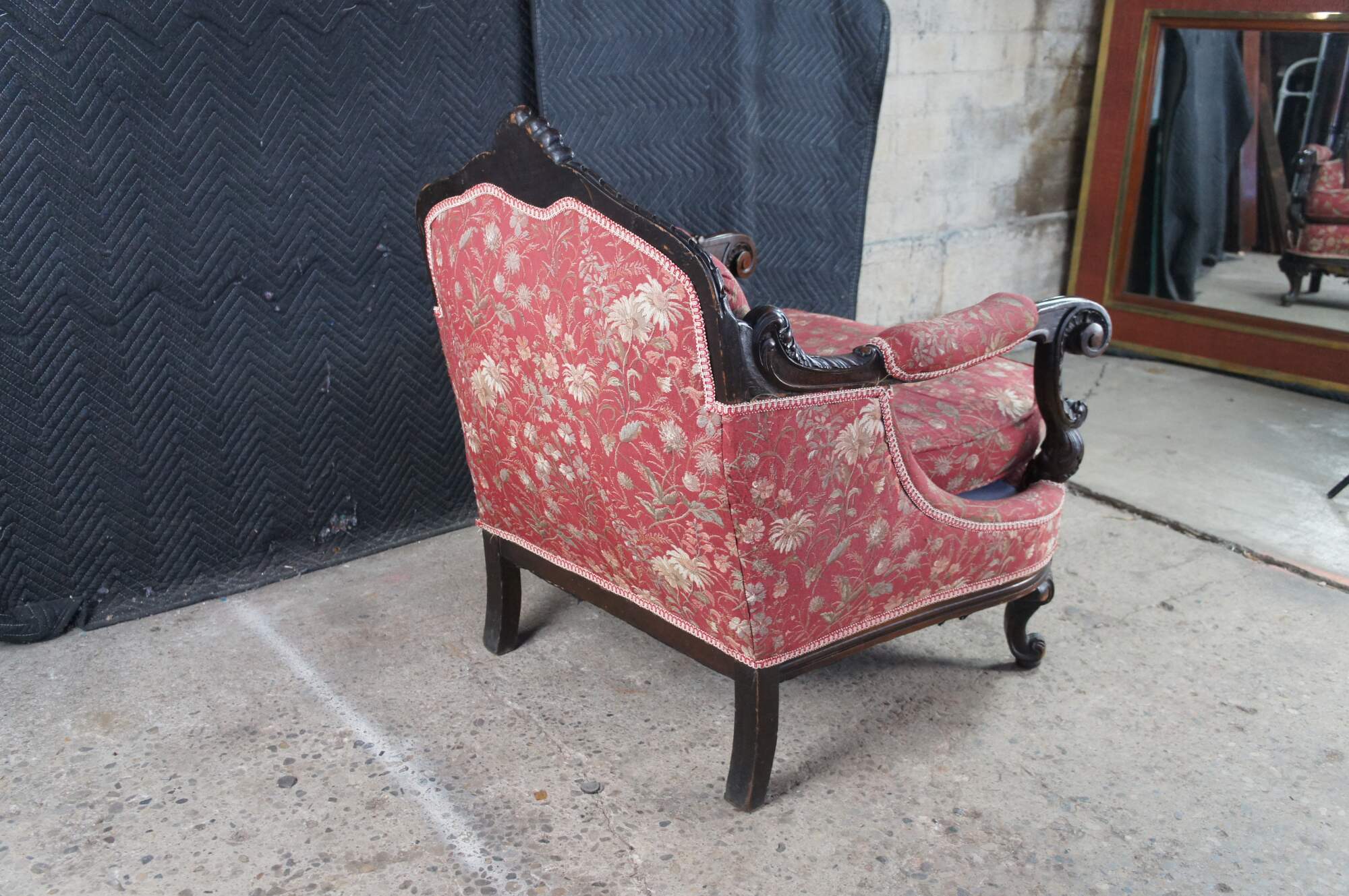 Antique Victorian oversized gentlemans parlor / fireside / club / lounge arm chair. Made of mahogany featuring highly carved Baroque / Rococo / acanthus designs with fauteuil padded arms, and chunky cabriole legs.