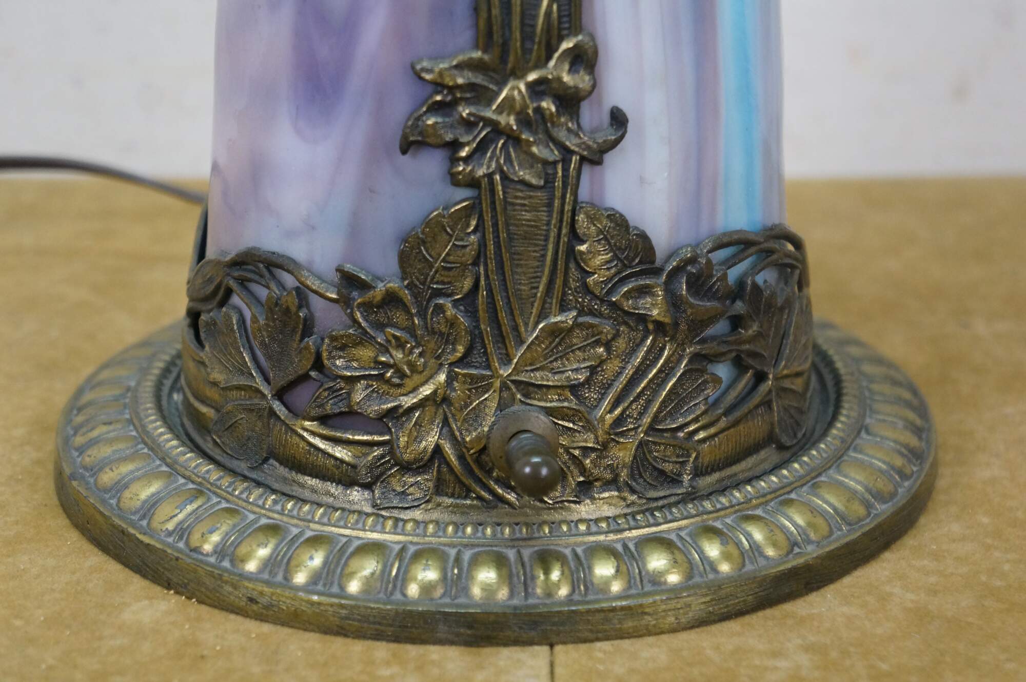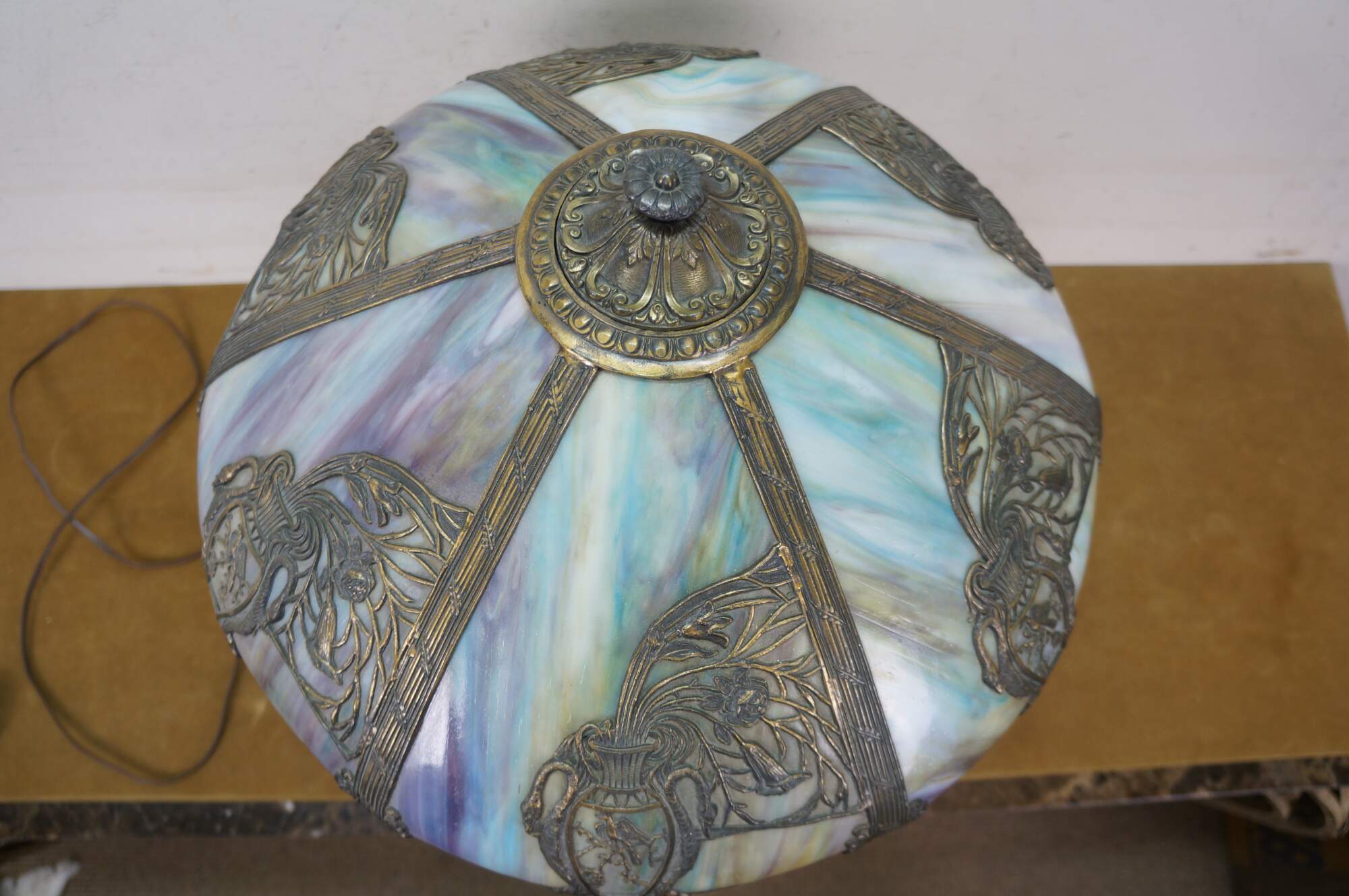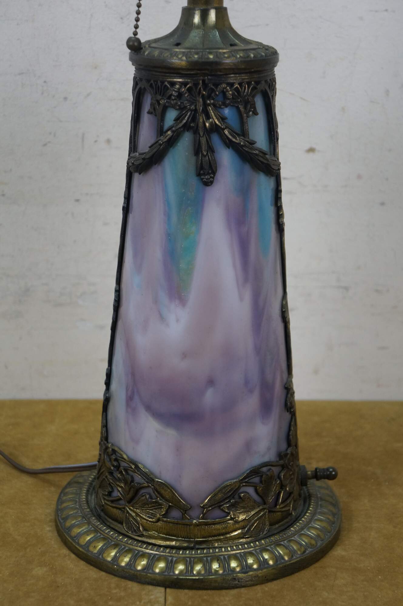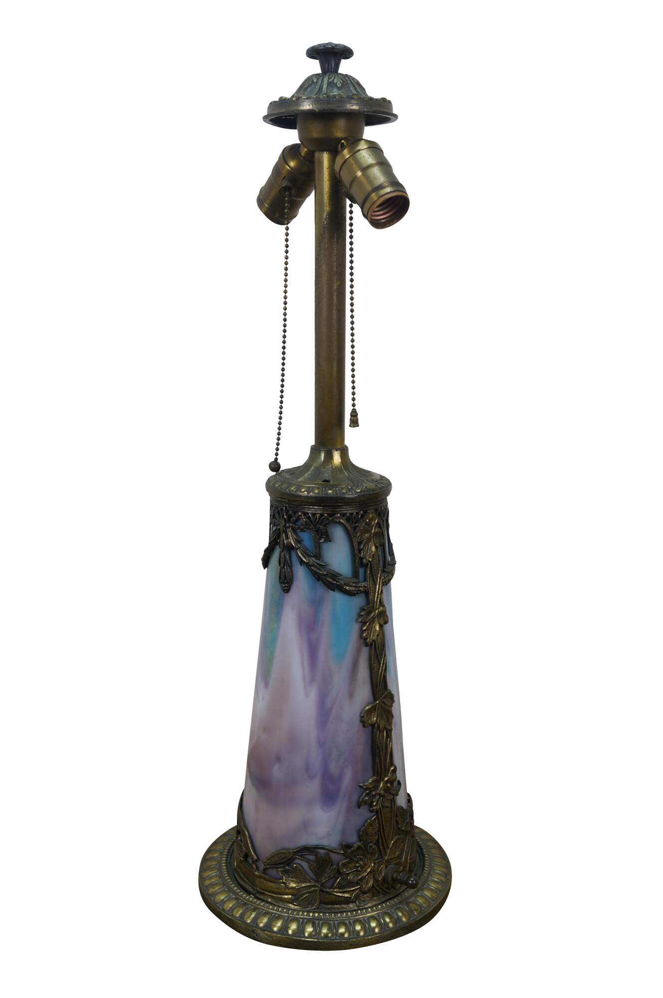 Antique Victorian era Aesthetic Movement / Art Nouveau style table lamp. Mushroom shaped lamp crafted of swirling blue, white, and purple slag glass framed with ornate filigree brass designs of vines, flowers, birds and chinoiserie vases. Two light upper portion with pull chains. Individually illuminated base with button switch. Attributed to Bradley & Hubbard.
