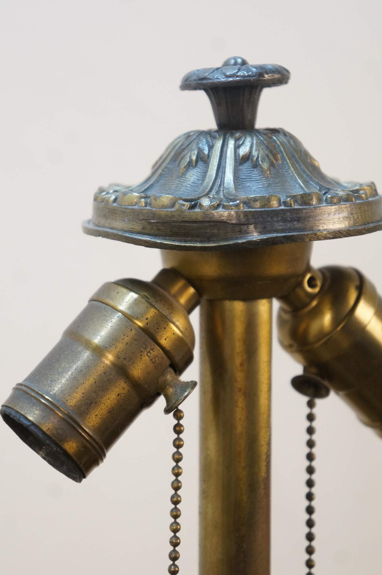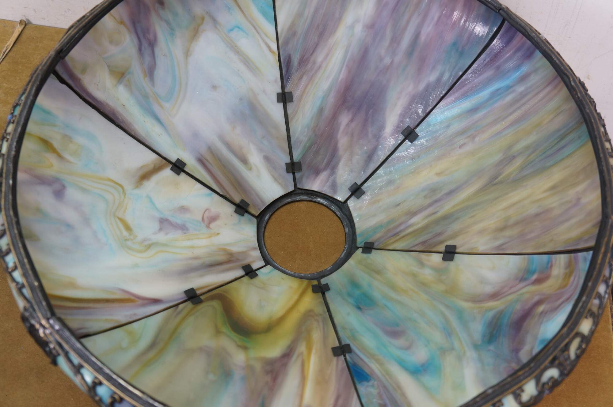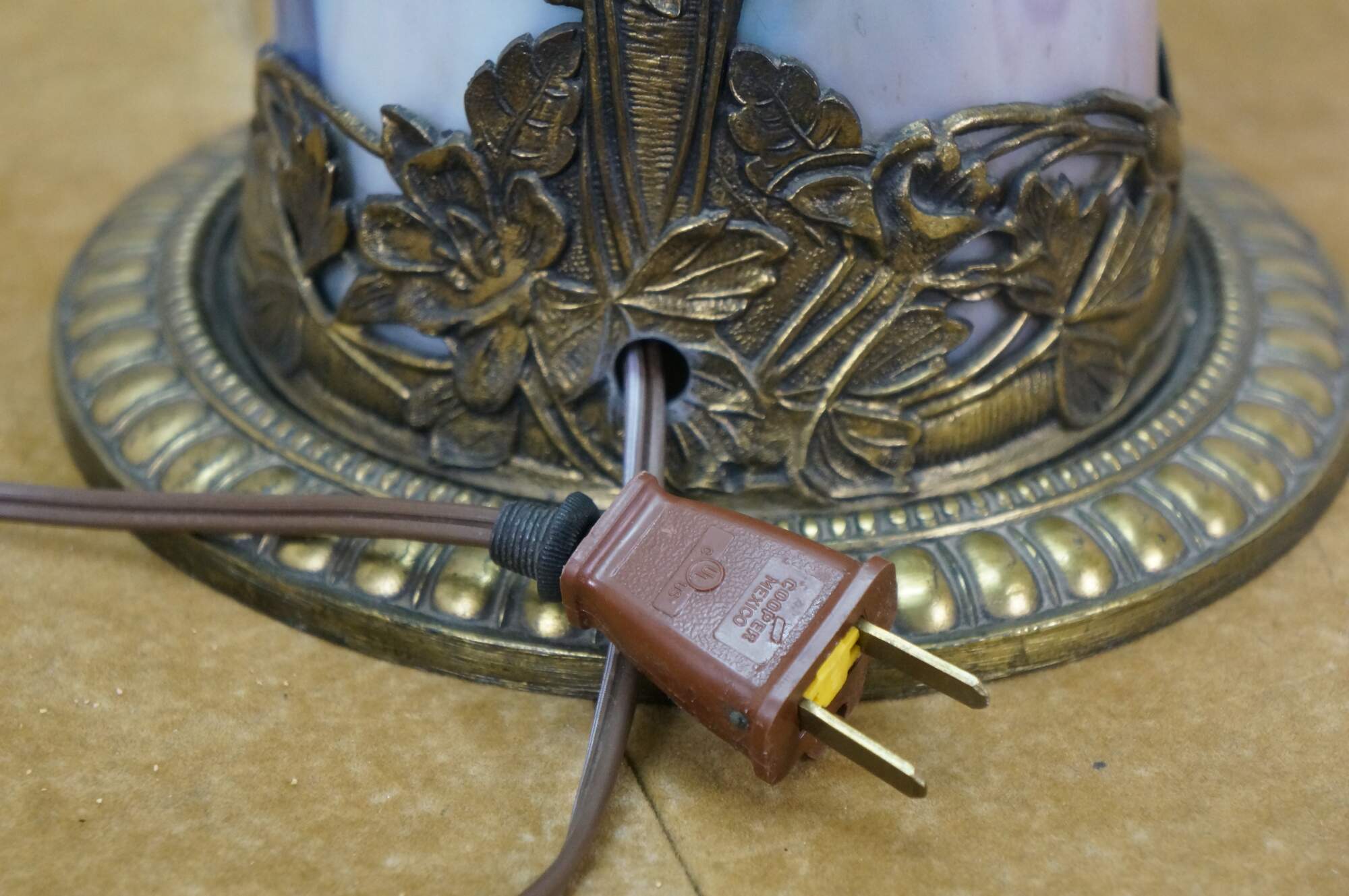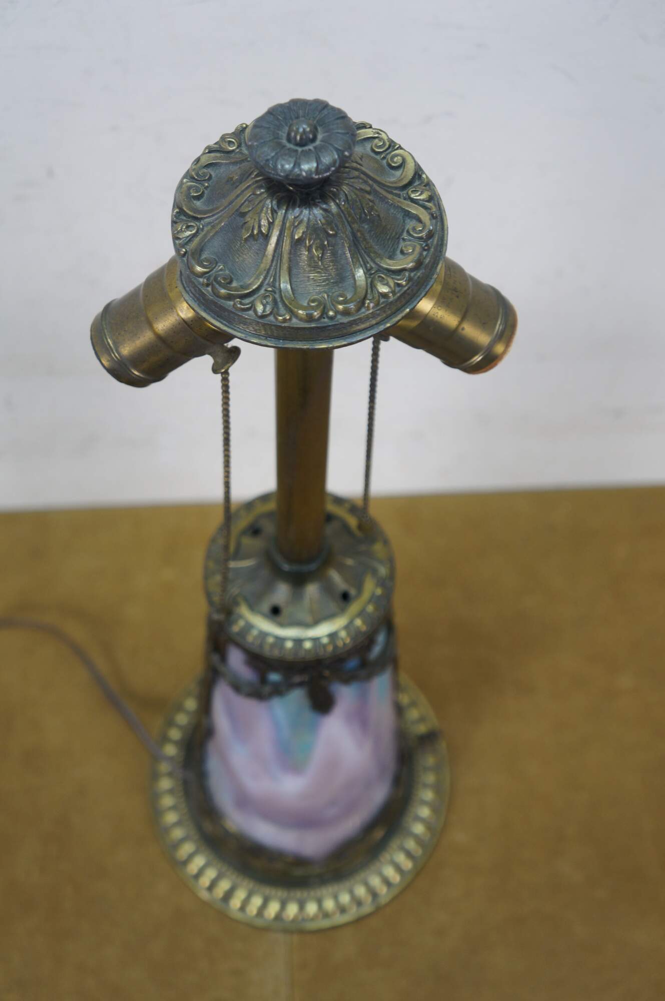 Antique Victorian era Aesthetic Movement / Art Nouveau style table lamp. Mushroom shaped lamp crafted of swirling blue, white, and purple slag glass framed with ornate filigree brass designs of vines, flowers, birds and chinoiserie vases. Two light upper portion with pull chains. Individually illuminated base with button switch. Attributed to Bradley & Hubbard.