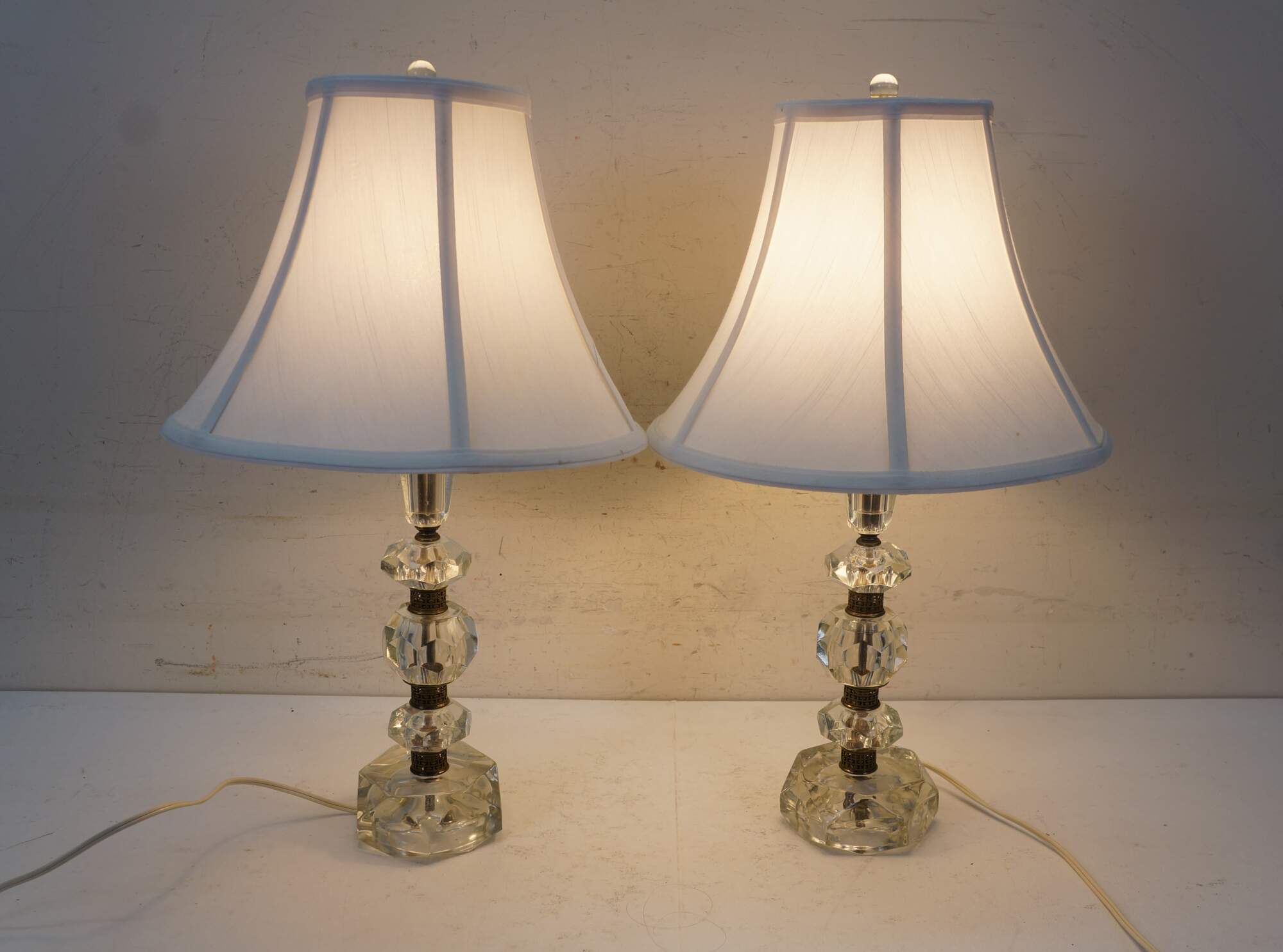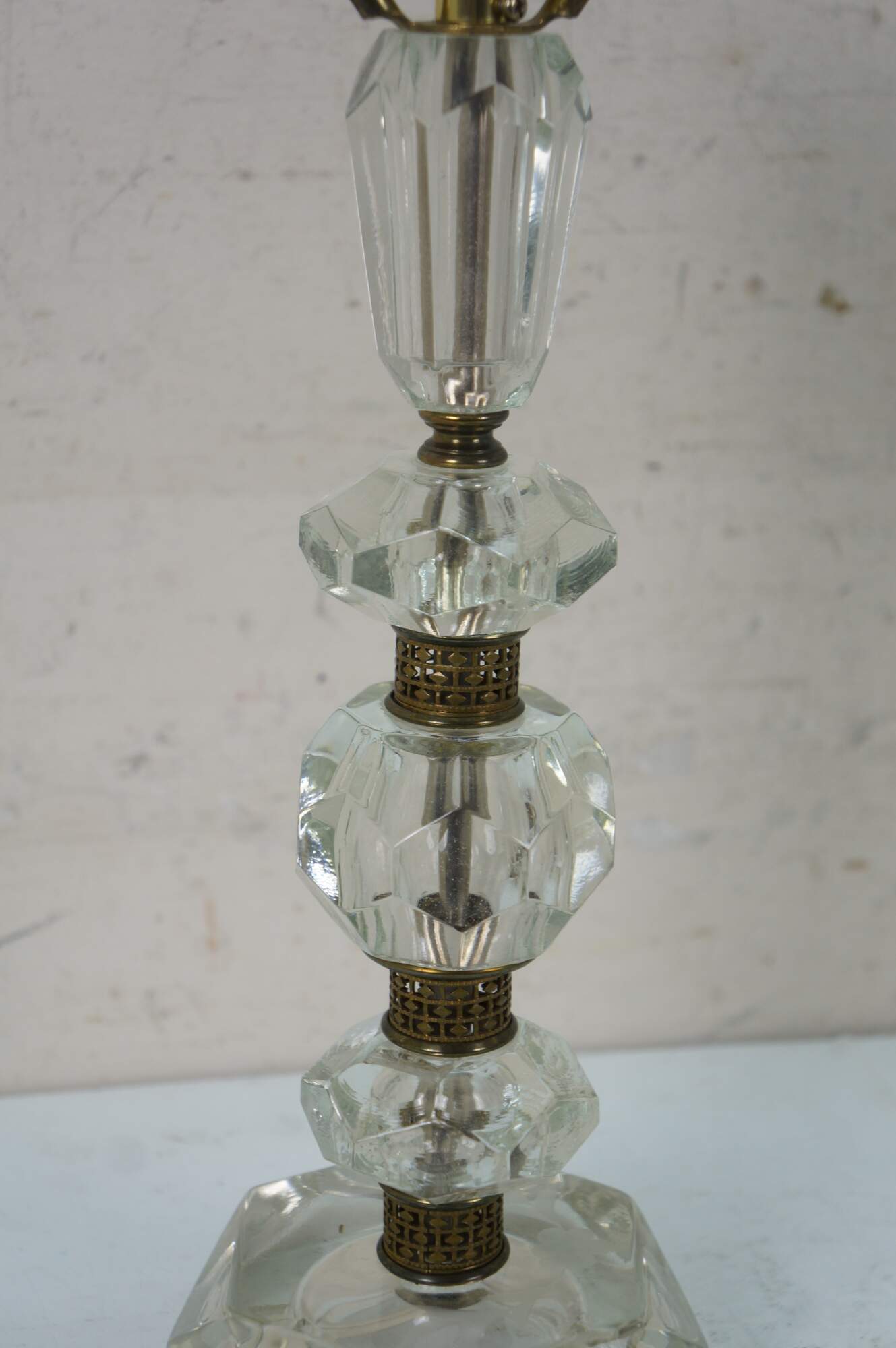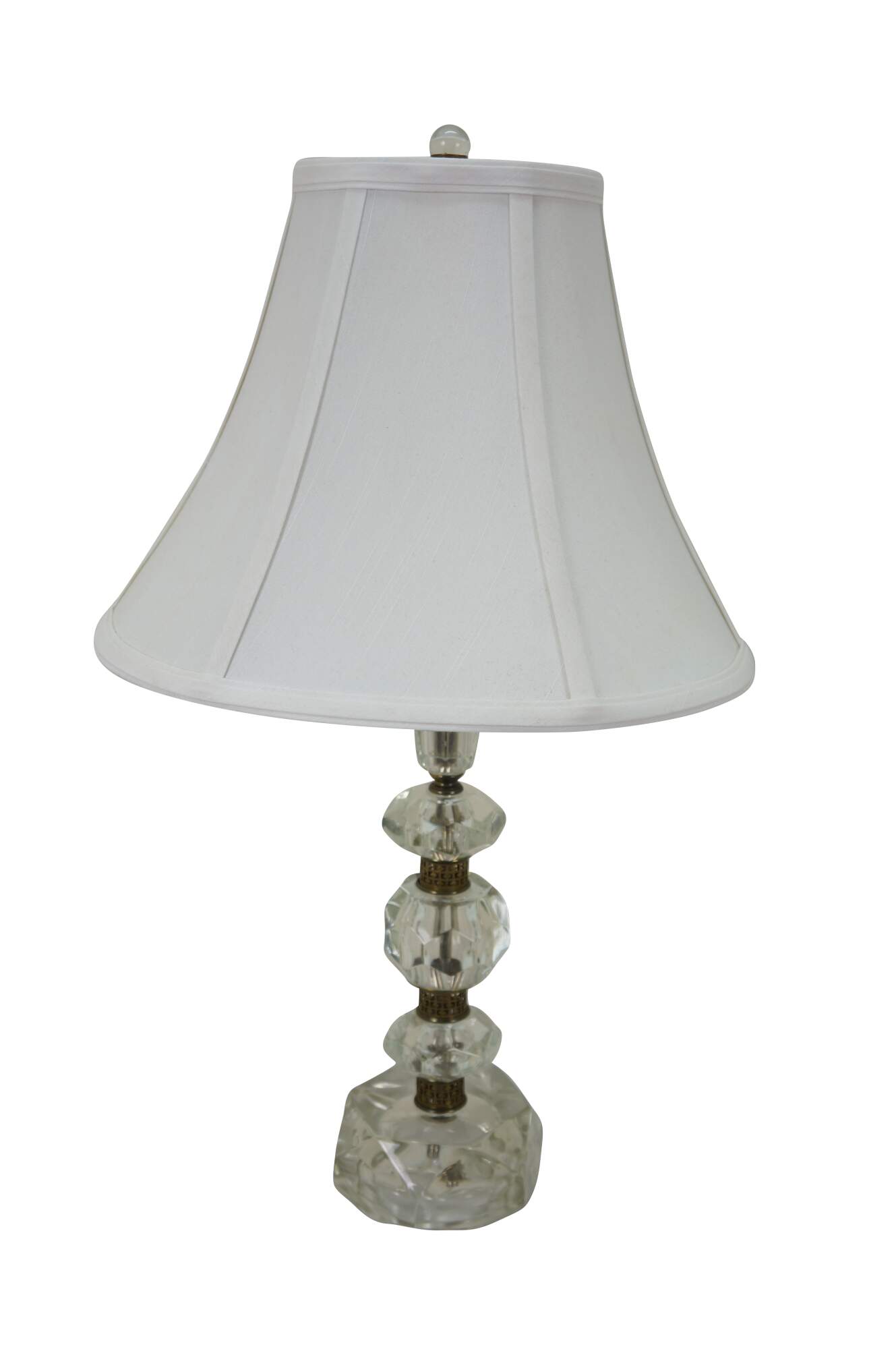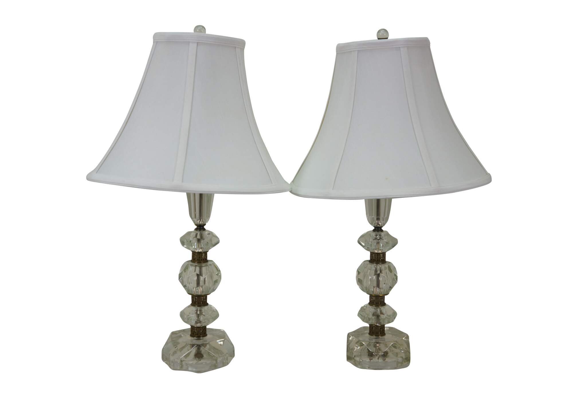 Pair of circa mid 20th century cut crystal / glass table lamps - five geometrically cut crystal prisms divided by reticulated brass bands. Hollywood Regency styling. Includes harps, glass orb finials, and white fabric shades.