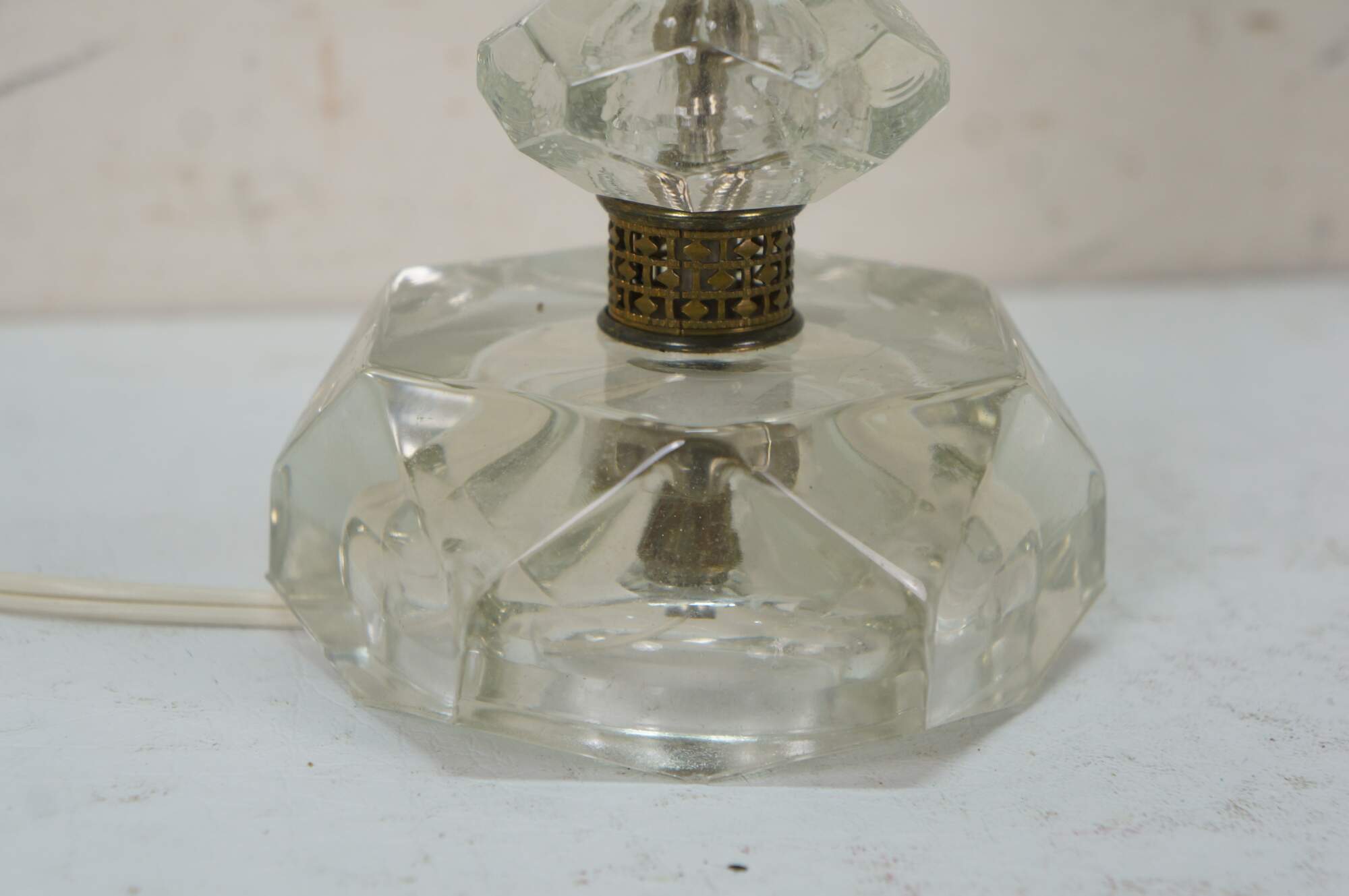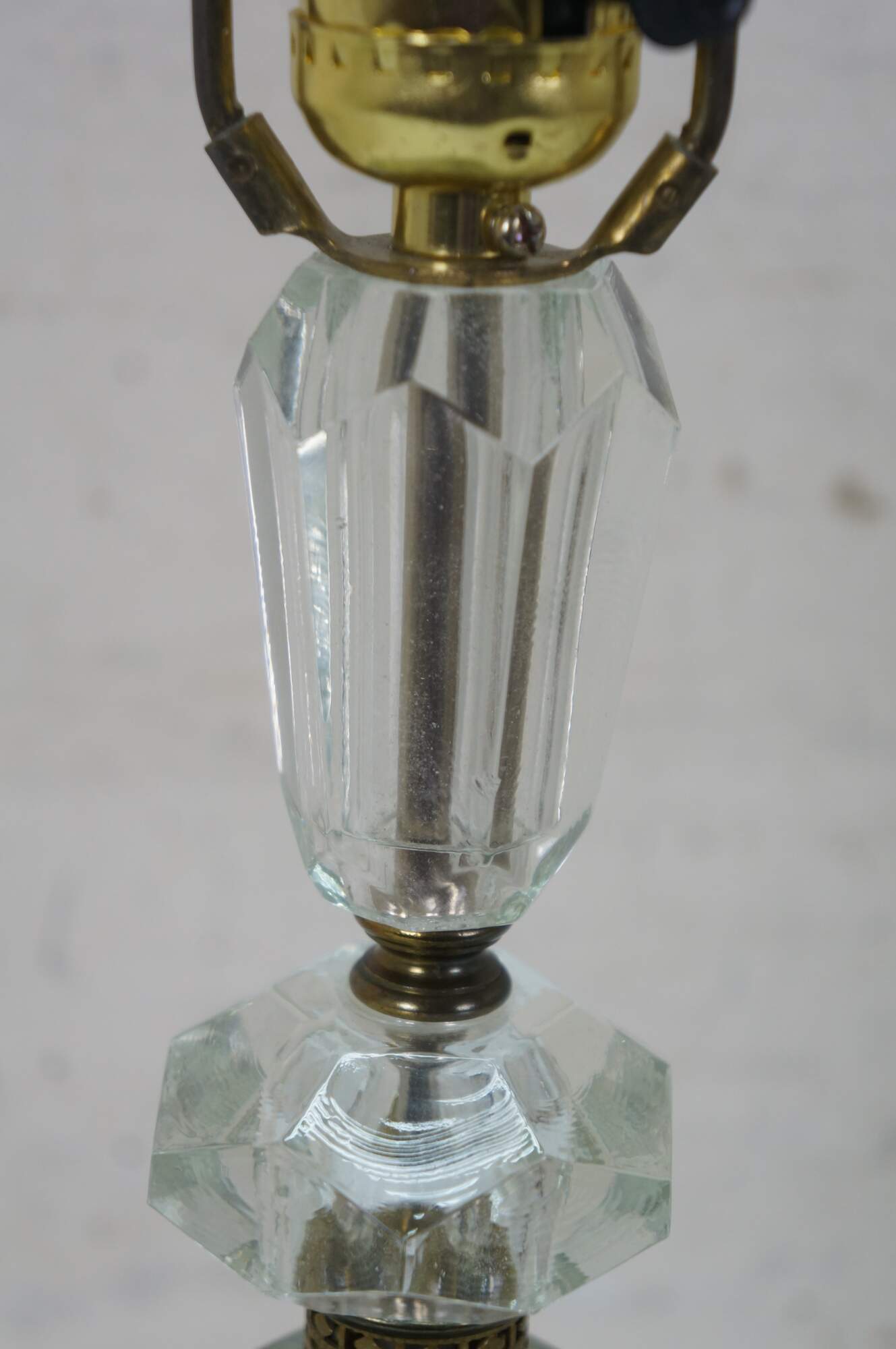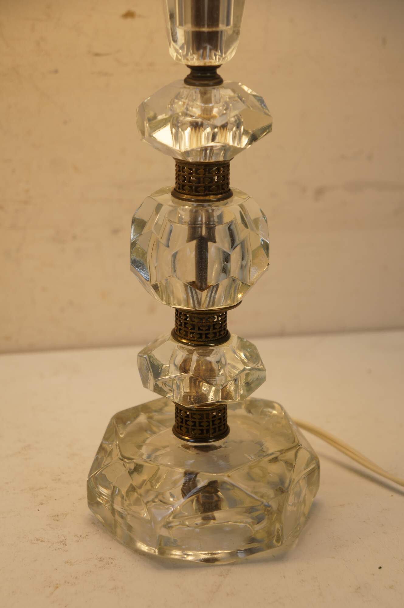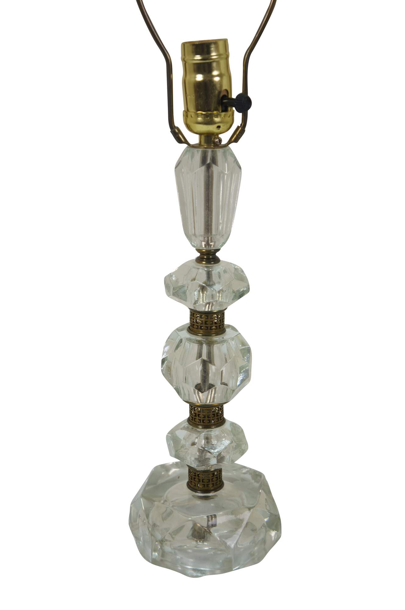 Pair of circa mid 20th century cut crystal / glass table lamps - five geometrically cut crystal prisms divided by reticulated brass bands. Hollywood Regency styling. Includes harps, glass orb finials, and white fabric shades.