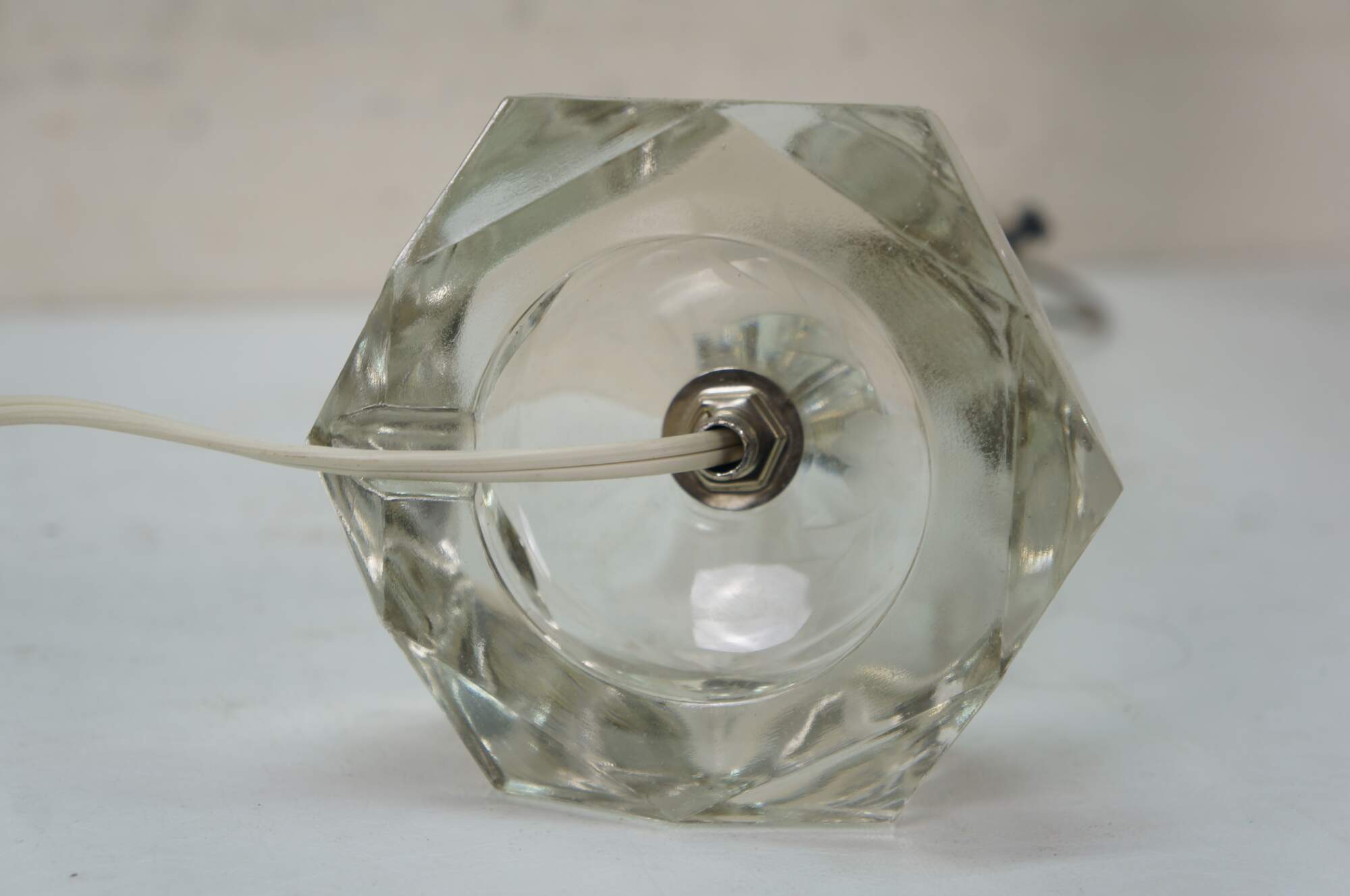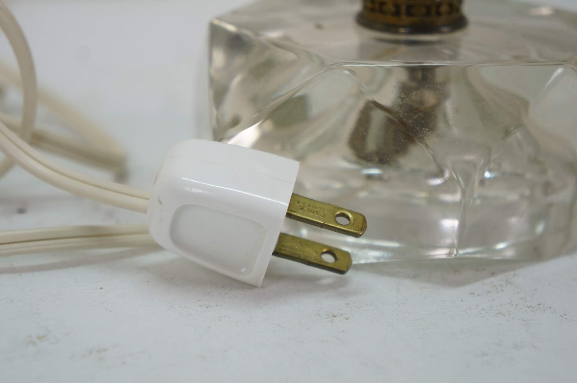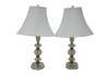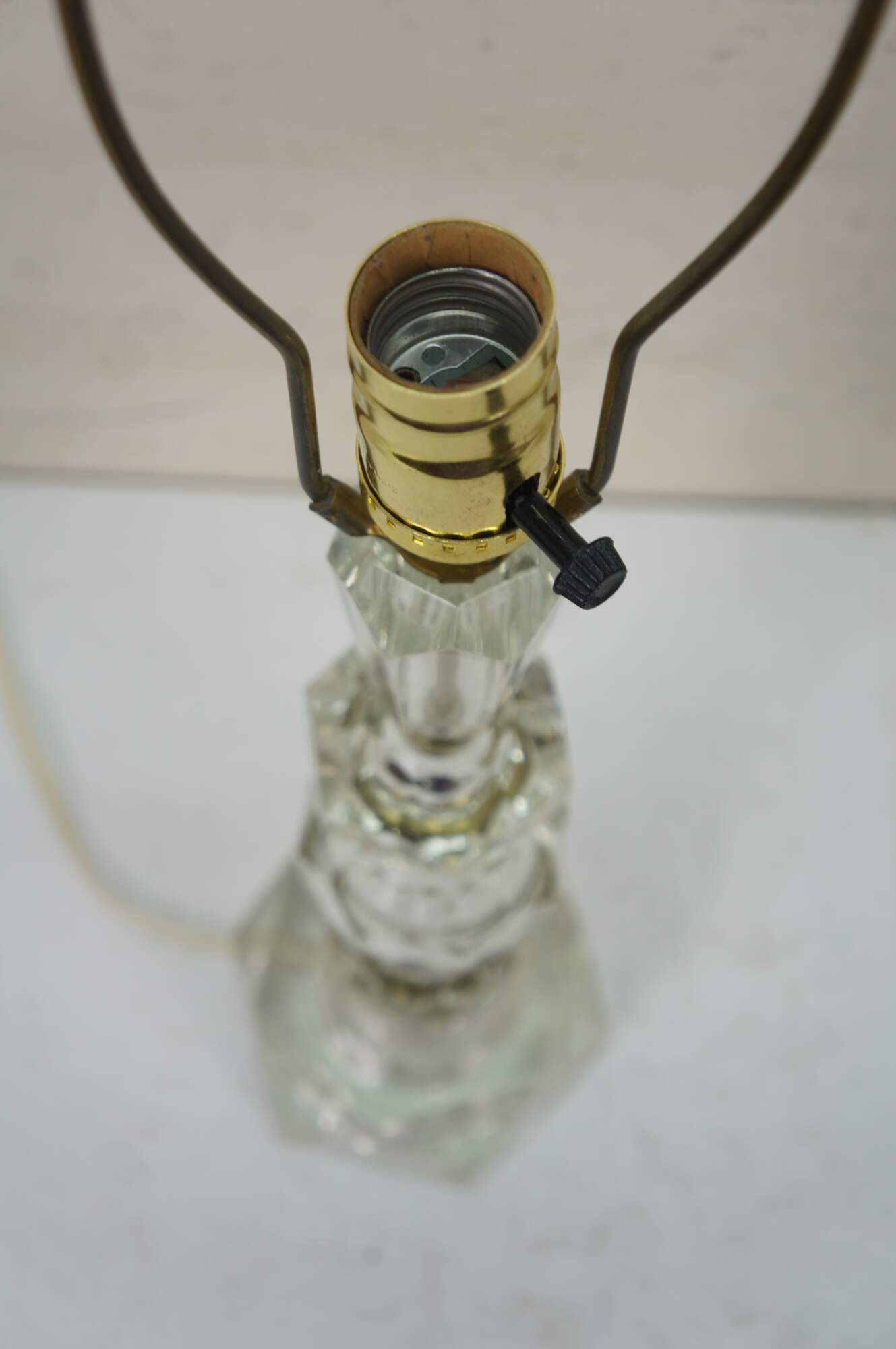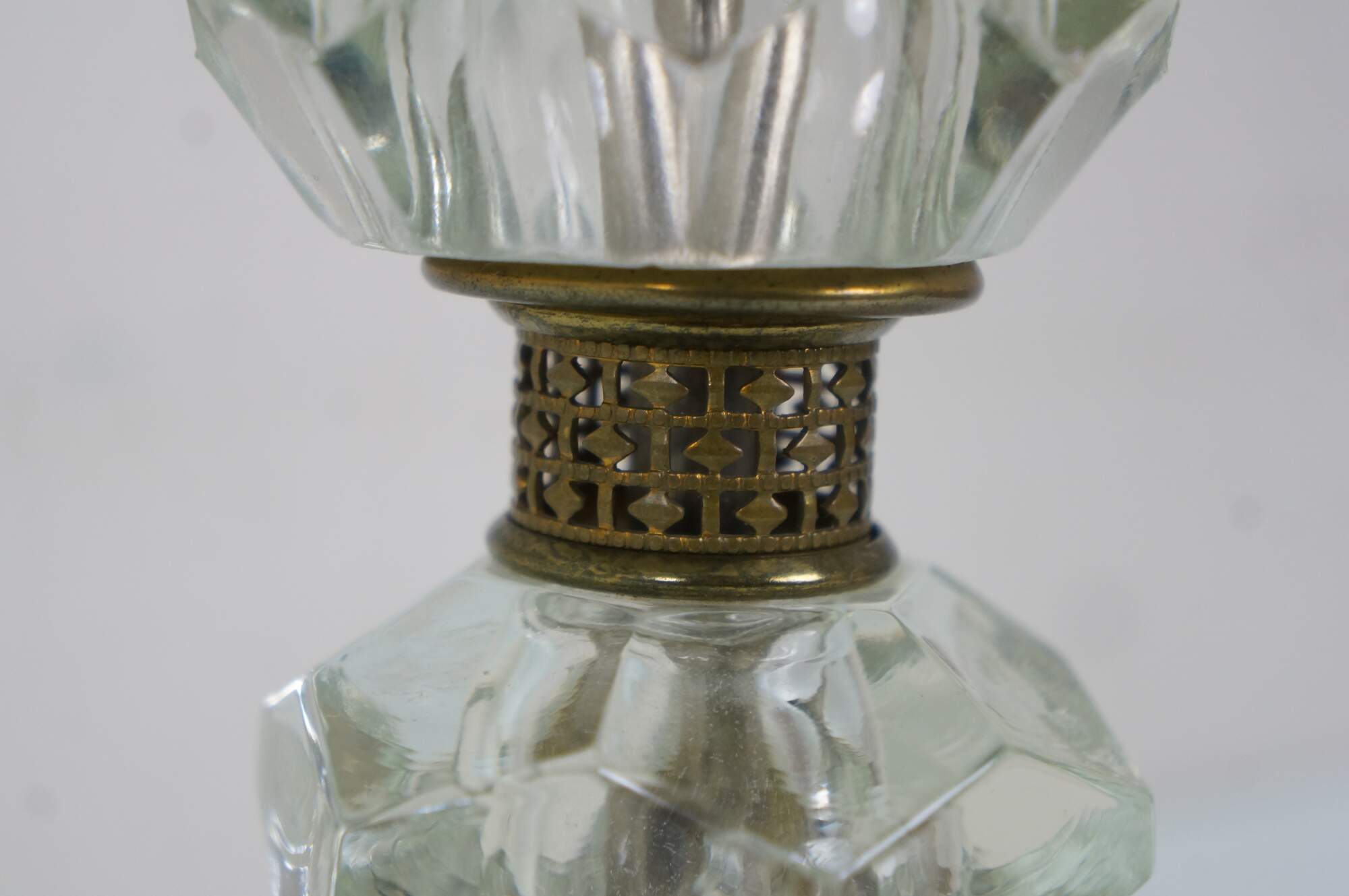 Pair of circa mid 20th century cut crystal / glass table lamps - five geometrically cut crystal prisms divided by reticulated brass bands. Hollywood Regency styling. Includes harps, glass orb finials, and white fabric shades.