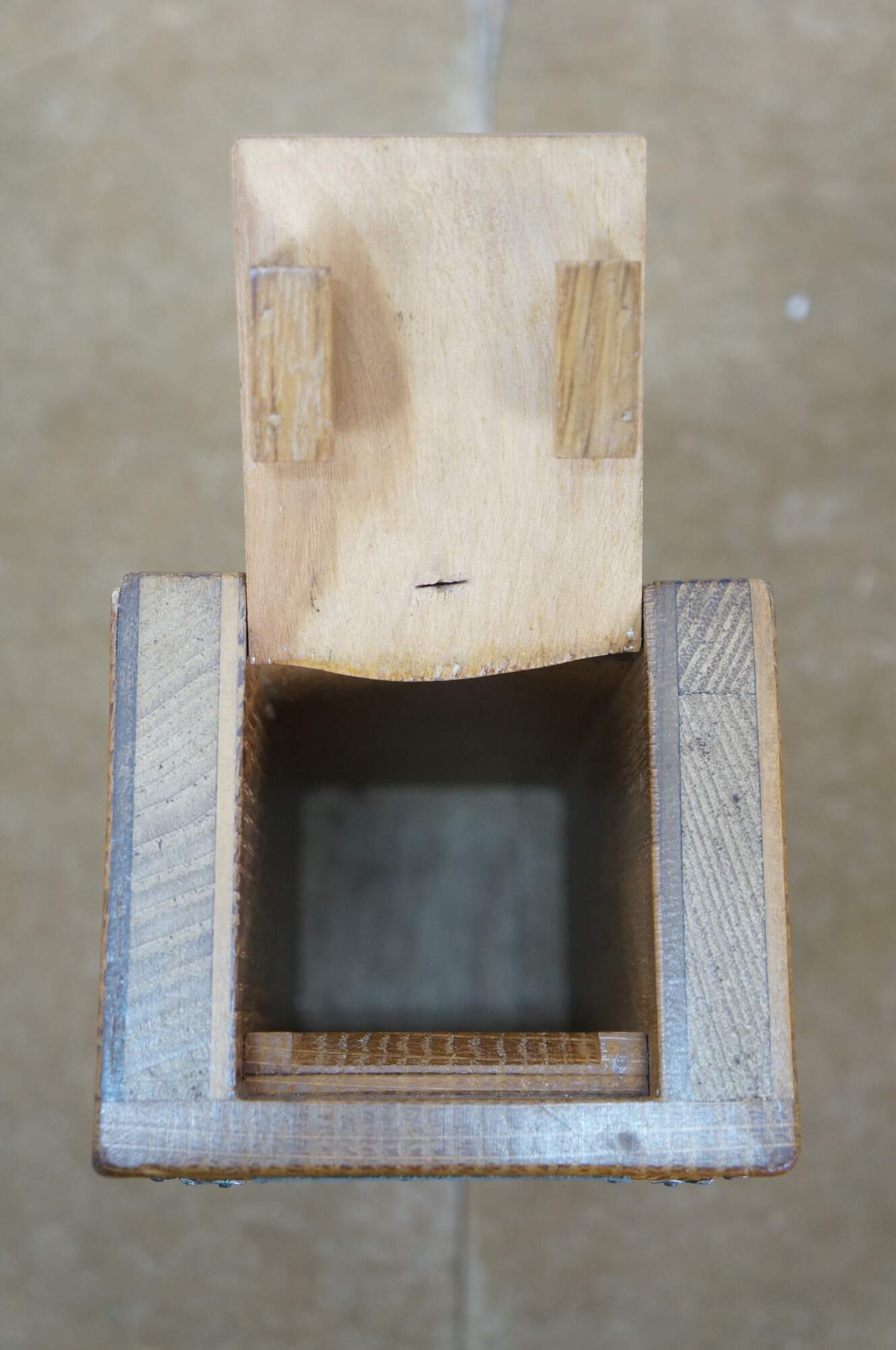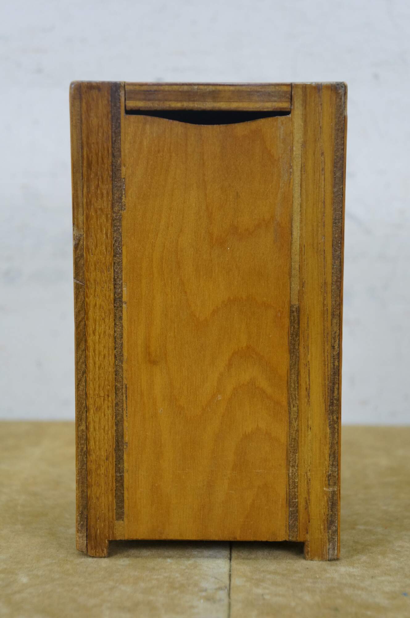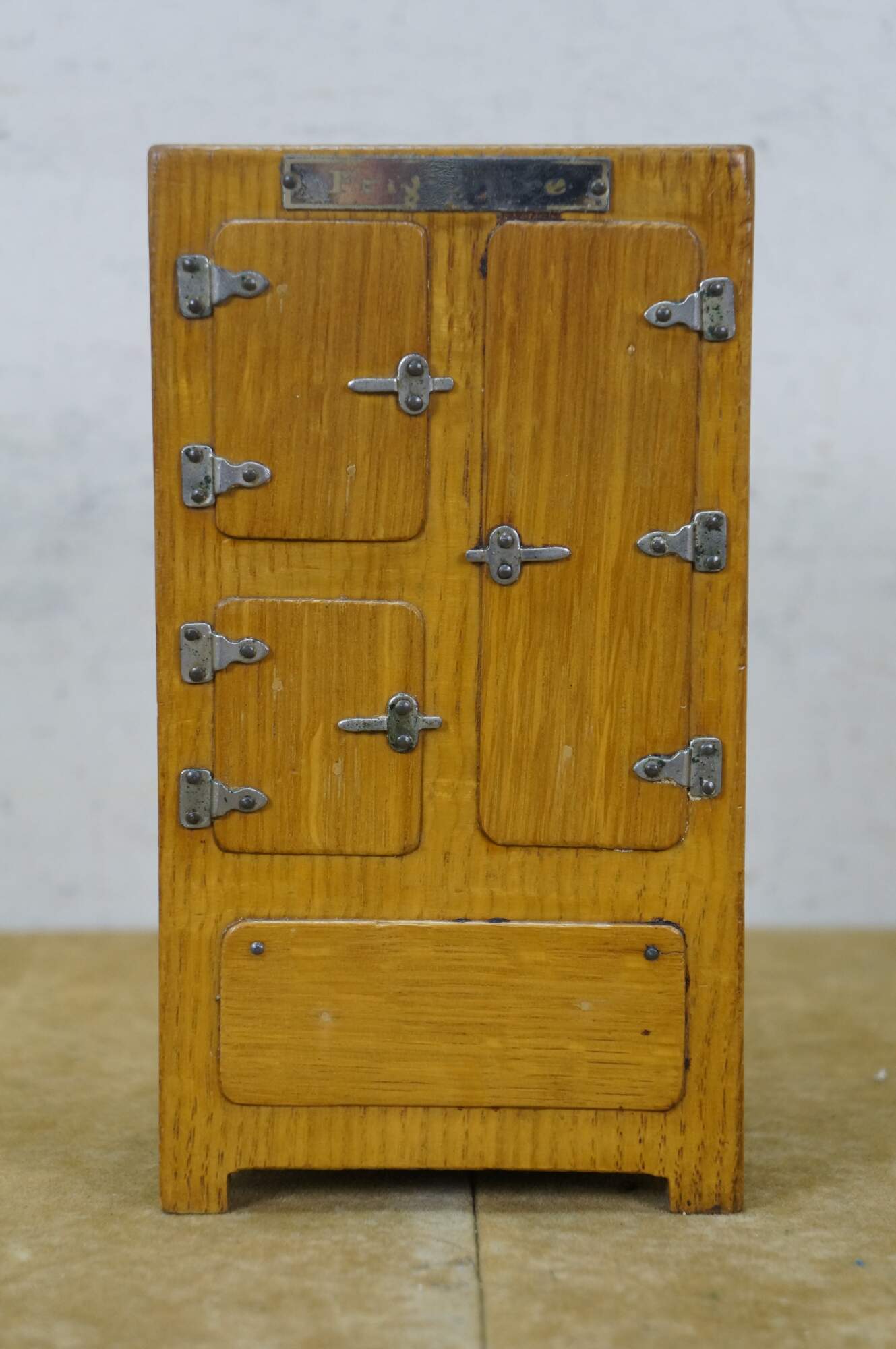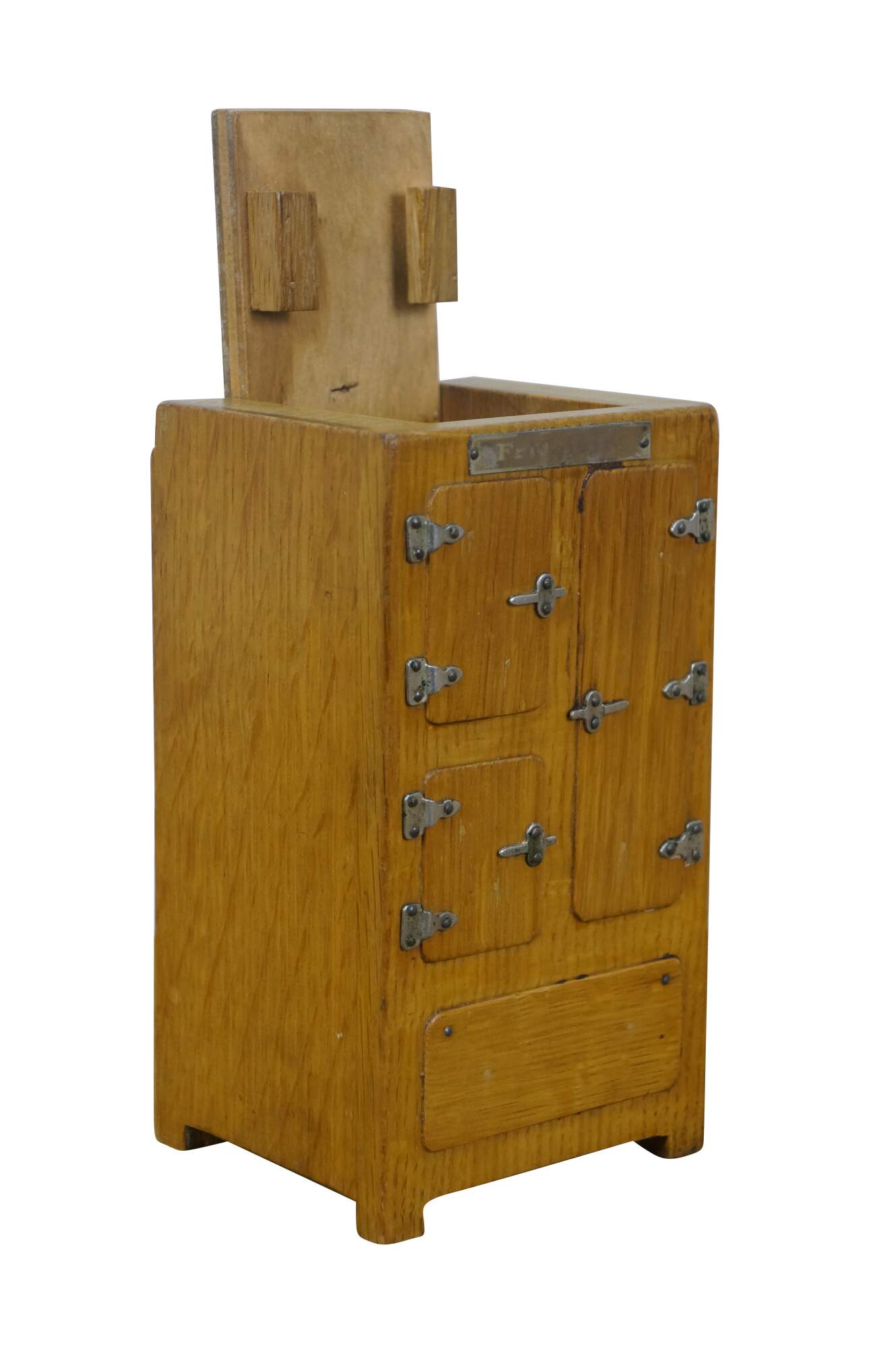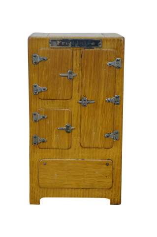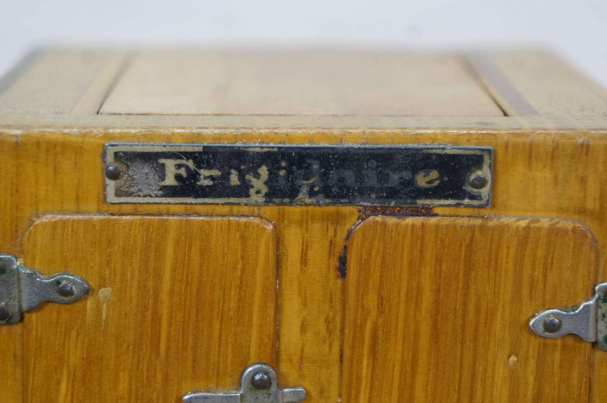 Vintage 20th century model / salesman sample / doll house figurine / trinket box in the shape of an antique wooden ice box, labeled at the top edge with the Frigidaire name. Doors on front are nonfunctional. Flip top lid with pair of supports for an unknown object.