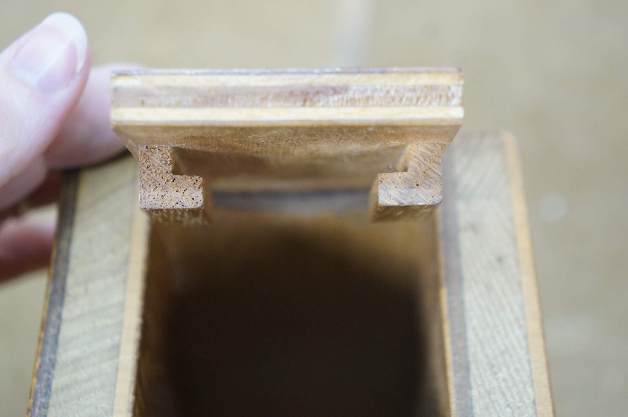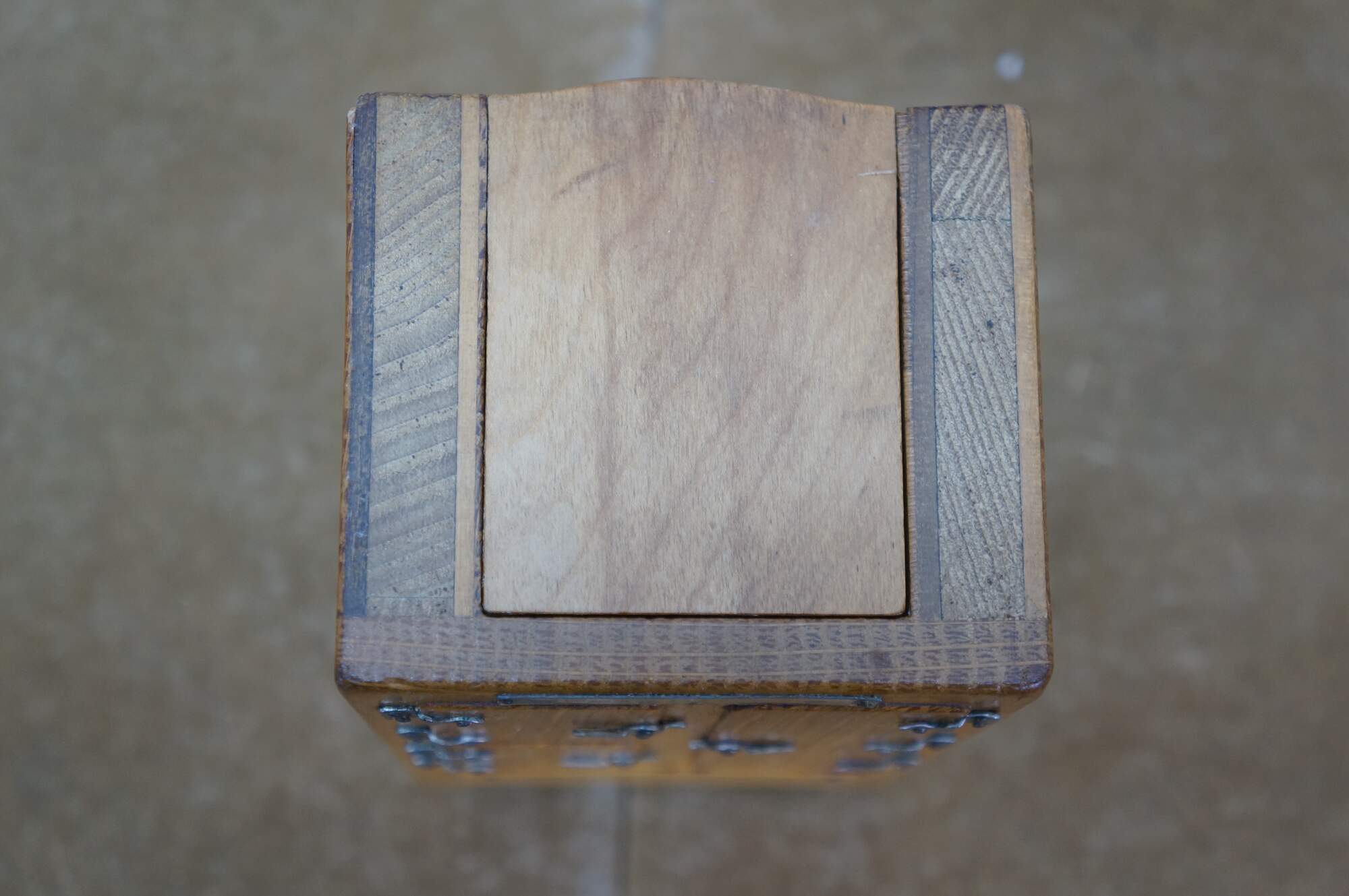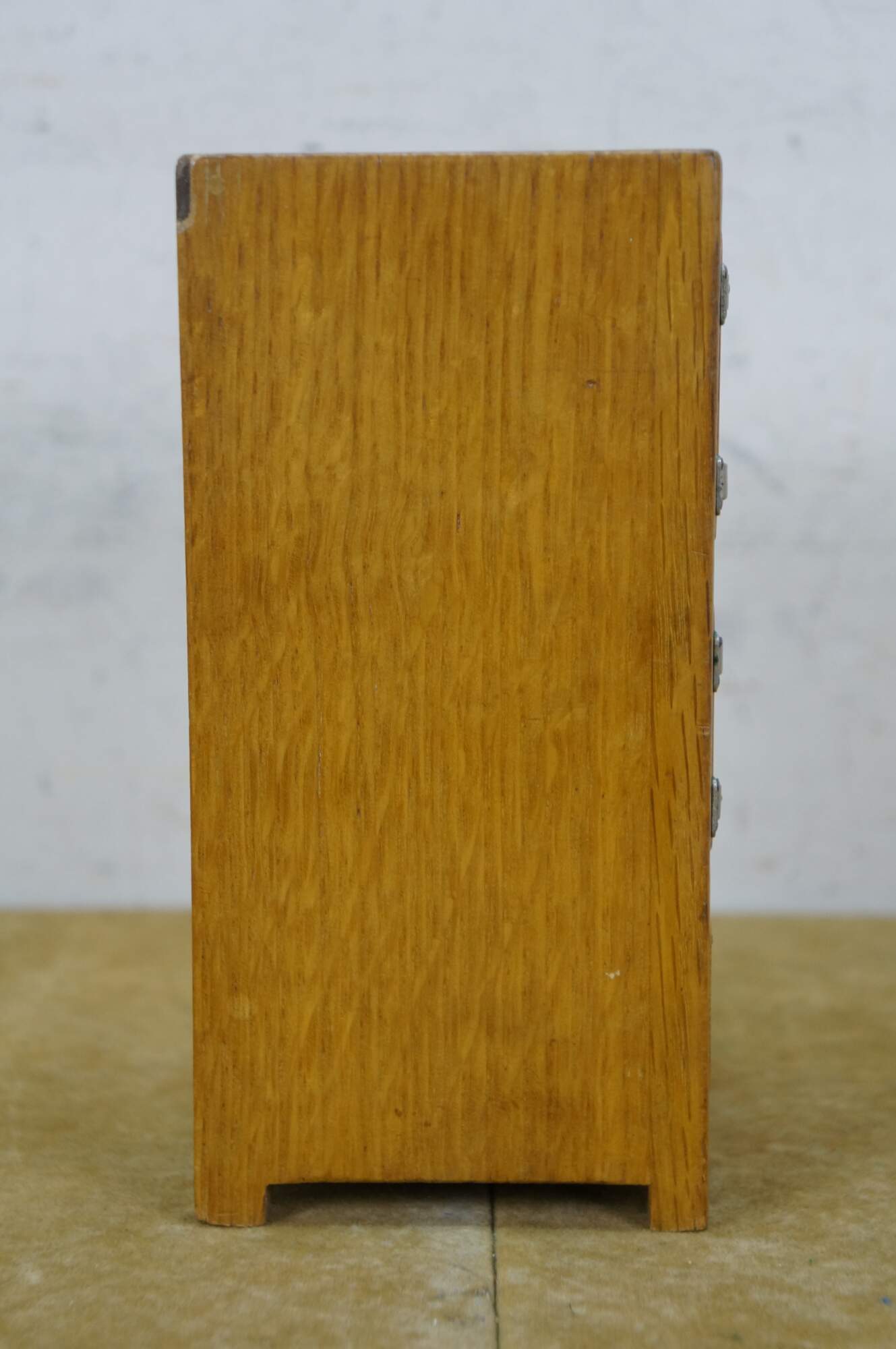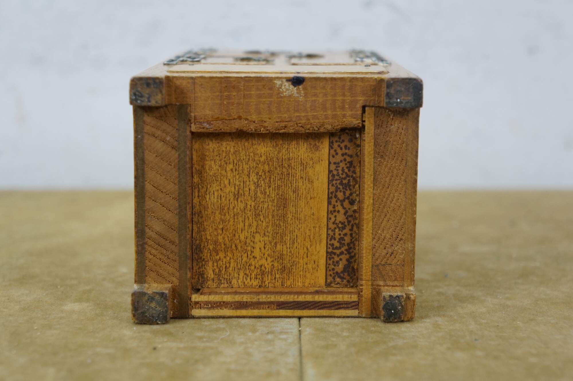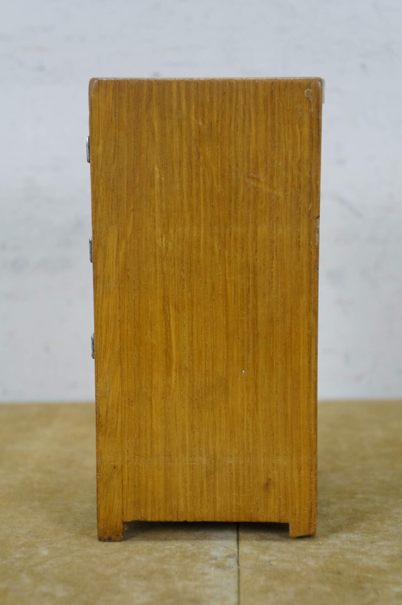 Vintage 20th century model / salesman sample / doll house figurine / trinket box in the shape of an antique wooden ice box, labeled at the top edge with the Frigidaire name. Doors on front are nonfunctional. Flip top lid with pair of supports for an unknown object.