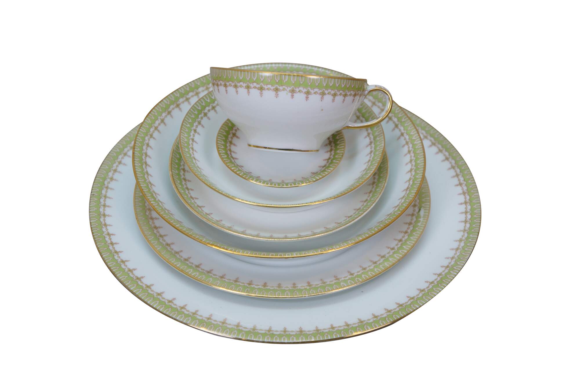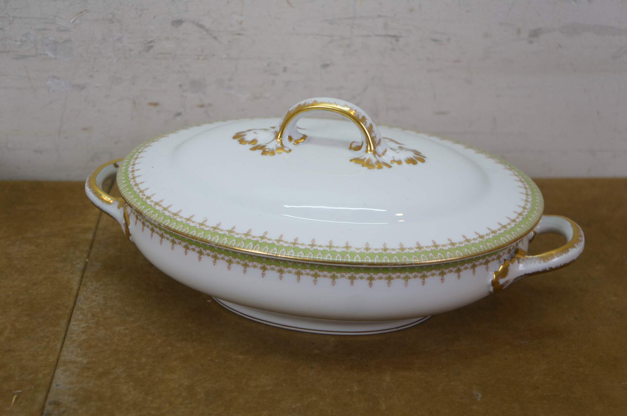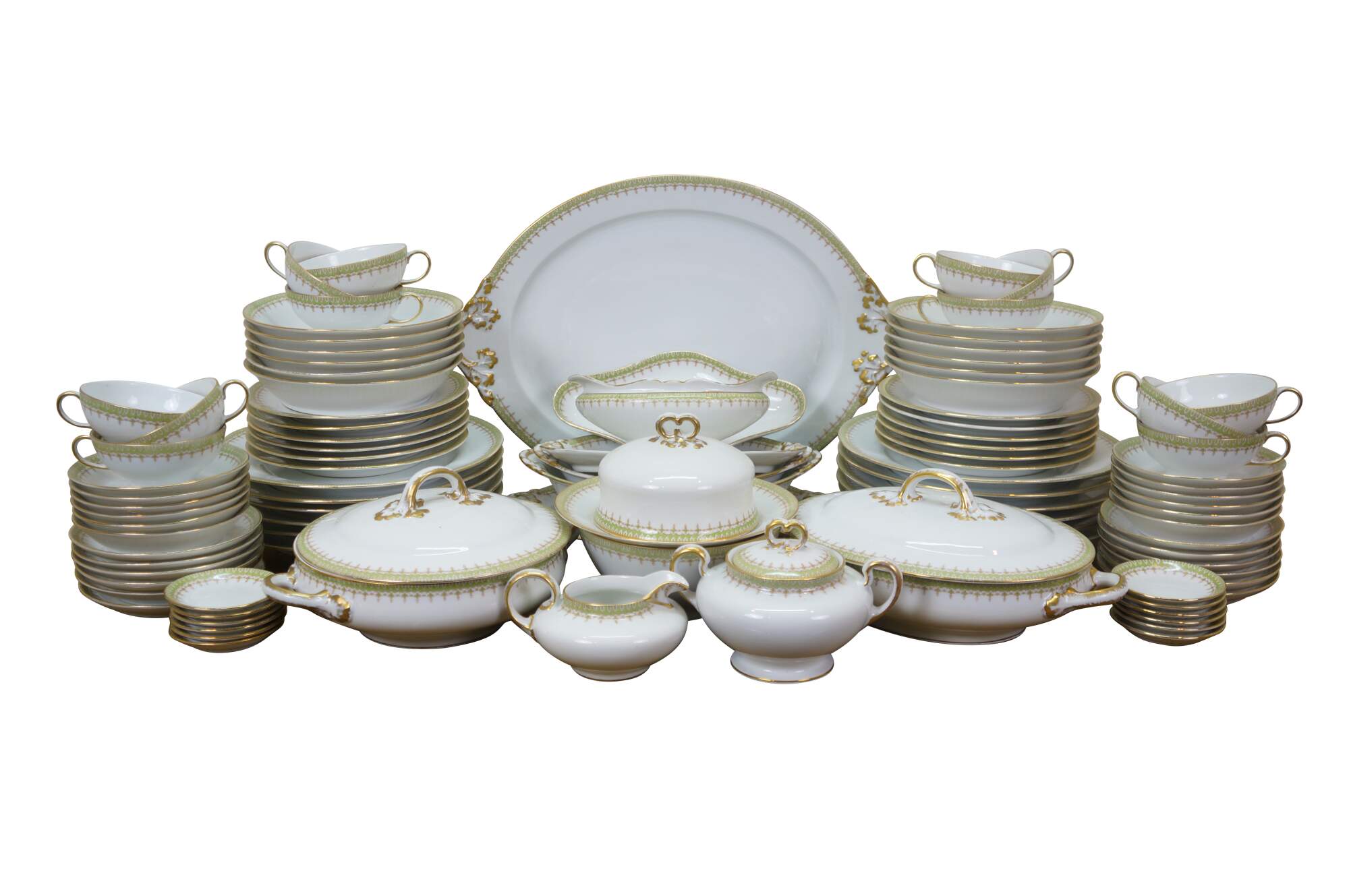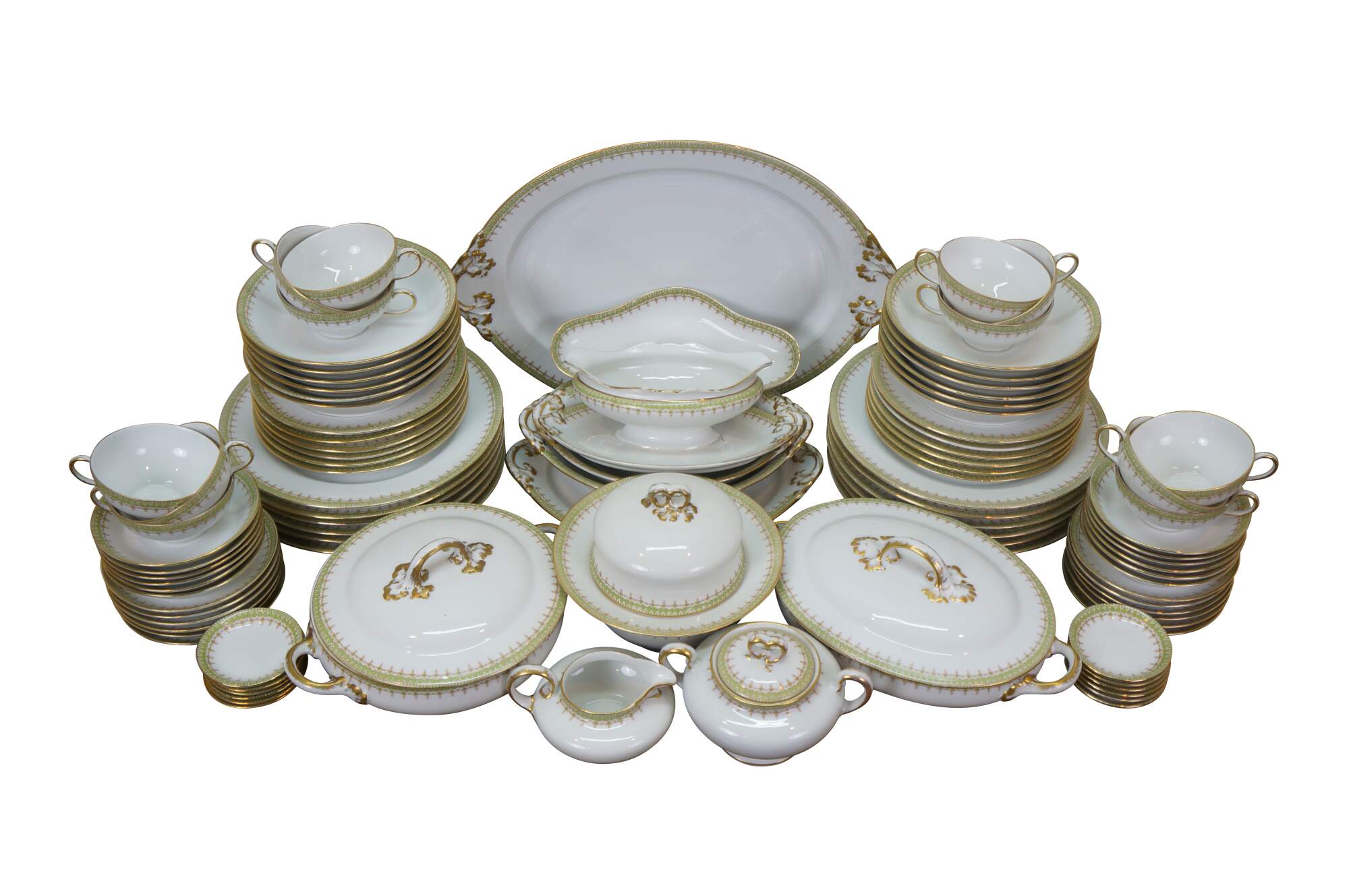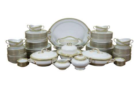 Includes: Lidded Sugar Bowl, 12 Teacups, Creamer, Round Lidded Dish, Lidded Butter Dish, Large Oval Platter, Small Oval Platter, Footed Gravy Boat, Oval Lidded Dish, Small Oblong Dish, Large Oval Bowl, Medium Oval Bowl, 12 Bone Dishes, 12 Saucers, 12 Soup Bowls, 12 Custard Dishes, 12 Salad Plates, 12 Dinner Plates, Round Serving Bowl