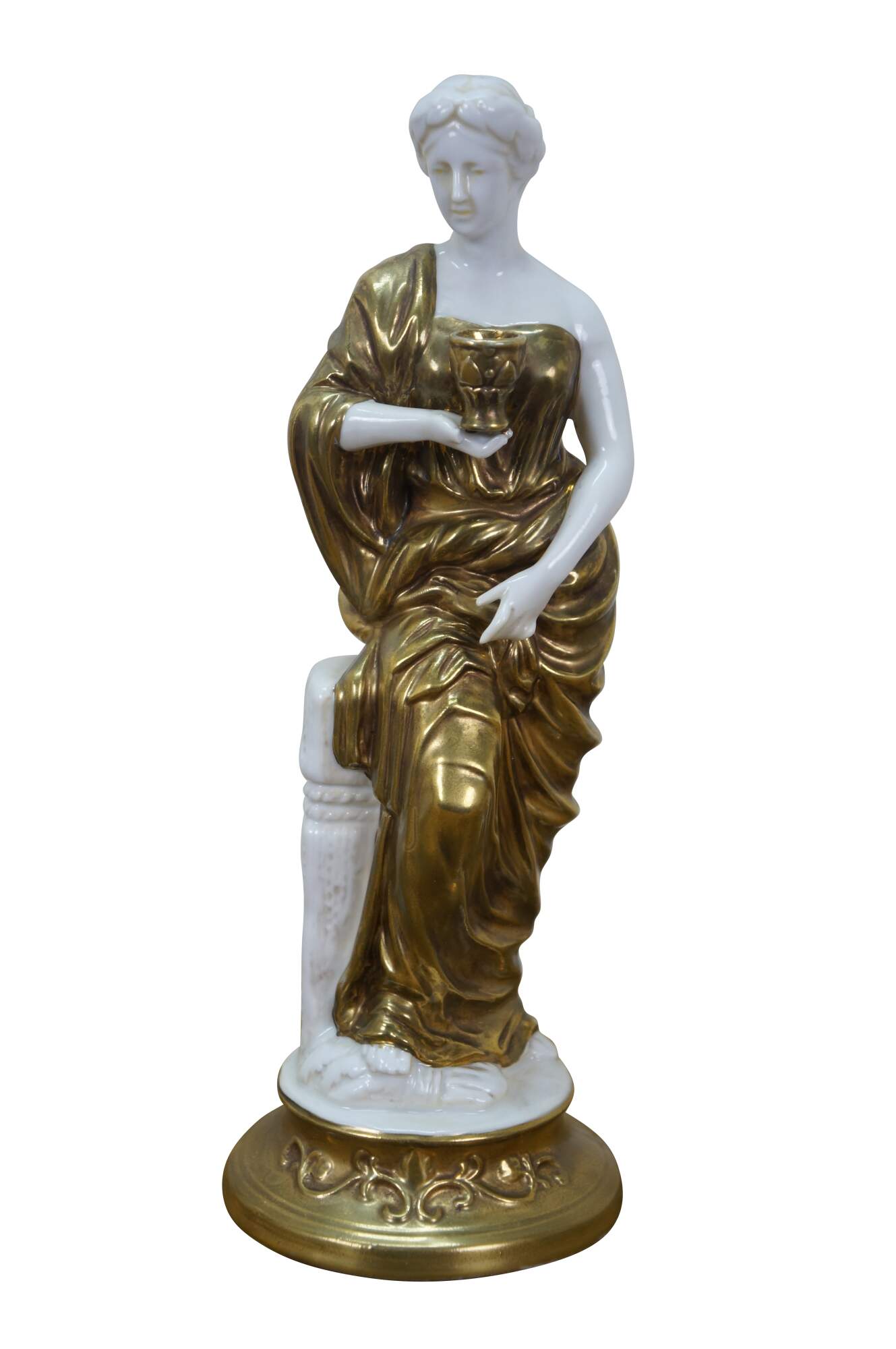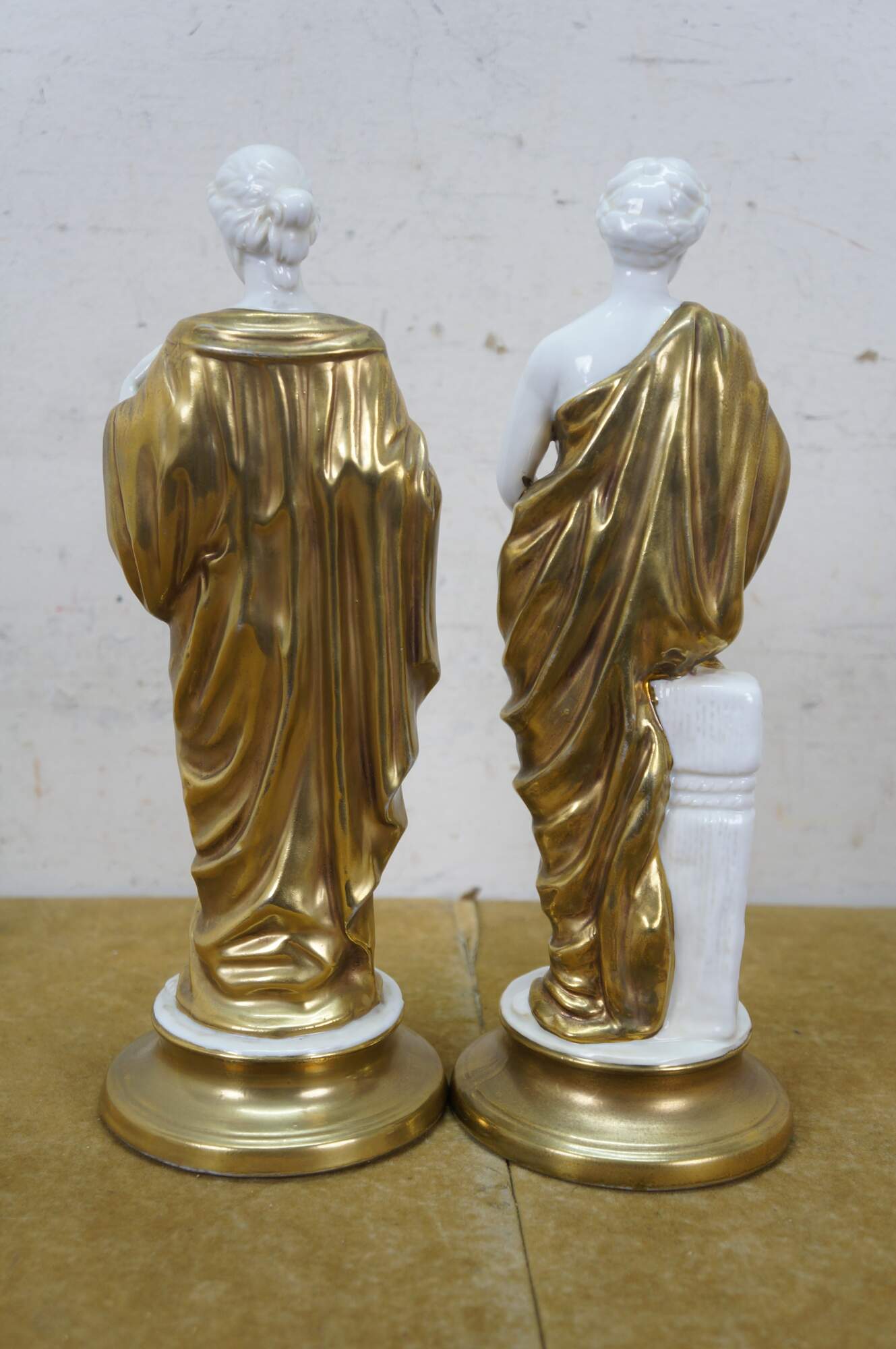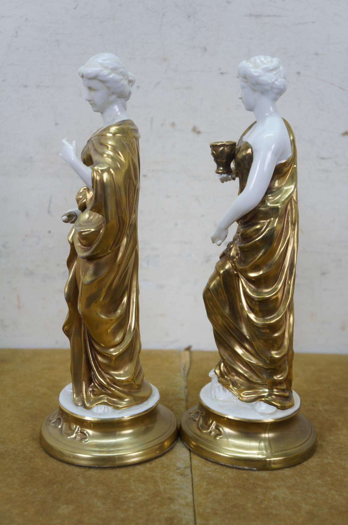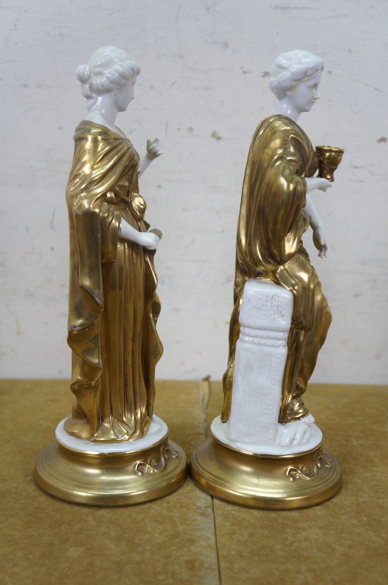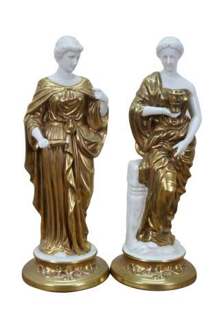 Pair of mid to late 20th century white porcelain figurines with gold gilt details, in the shape of two ancient Greek / Roman goddesses - one holding a spool / spindle of thread (likely Clotho - one of the Three Fates, who spins the thread of human life) and one holding a goblet (possibly Hebe - Cupbearer of Mount Olympus).