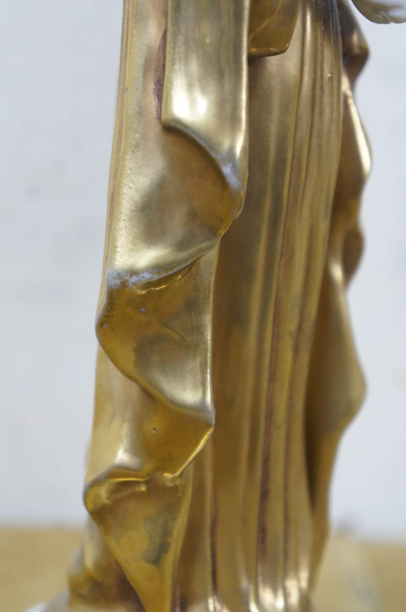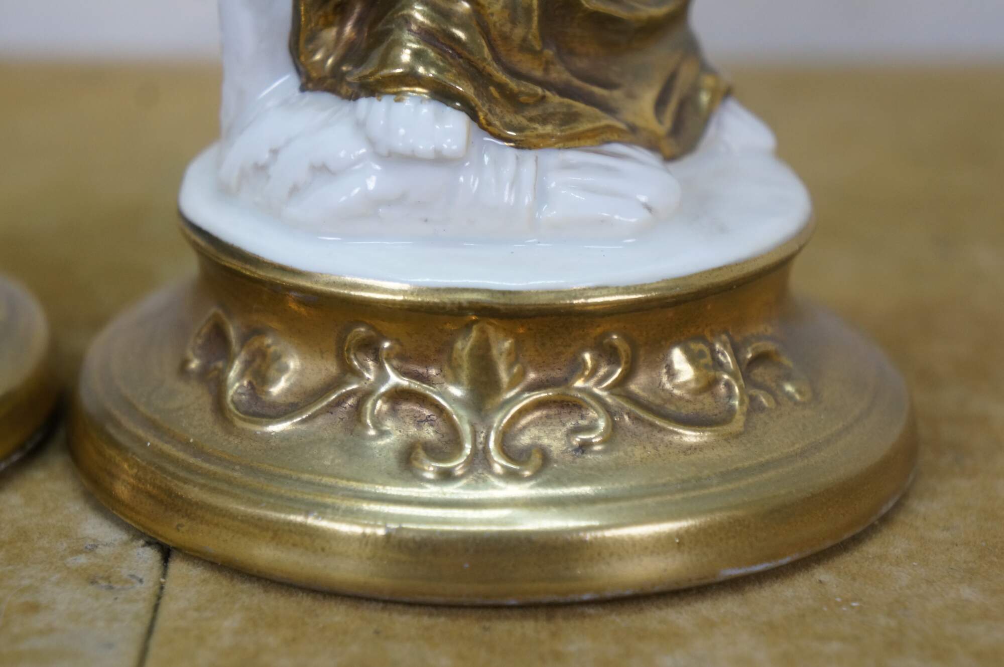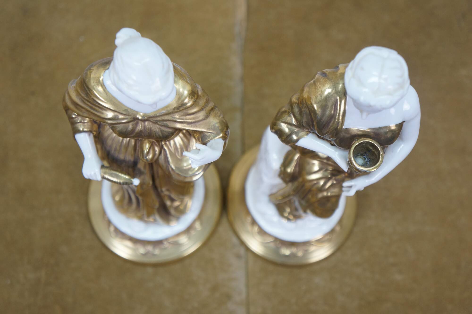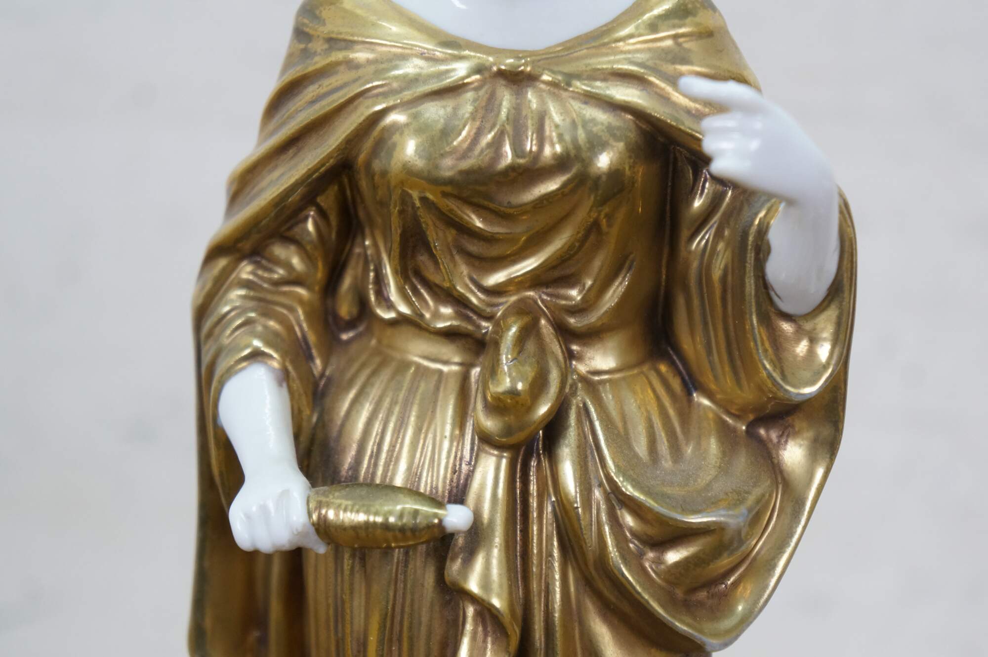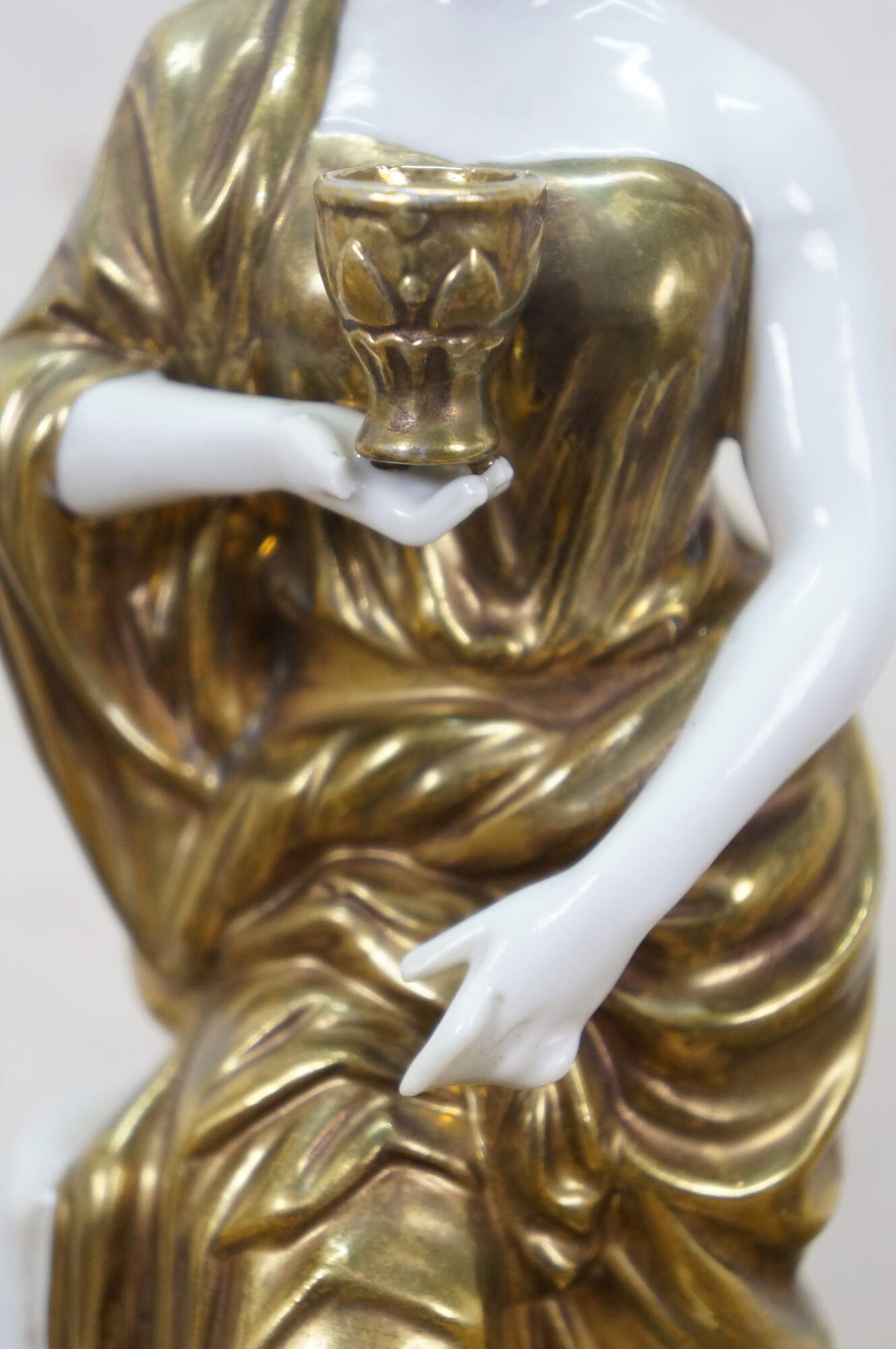 Pair of mid to late 20th century white porcelain figurines with gold gilt details, in the shape of two ancient Greek / Roman goddesses - one holding a spool / spindle of thread (likely Clotho - one of the Three Fates, who spins the thread of human life) and one holding a goblet (possibly Hebe - Cupbearer of Mount Olympus).
