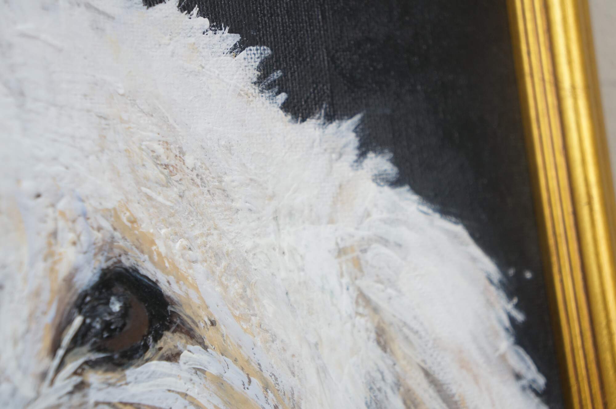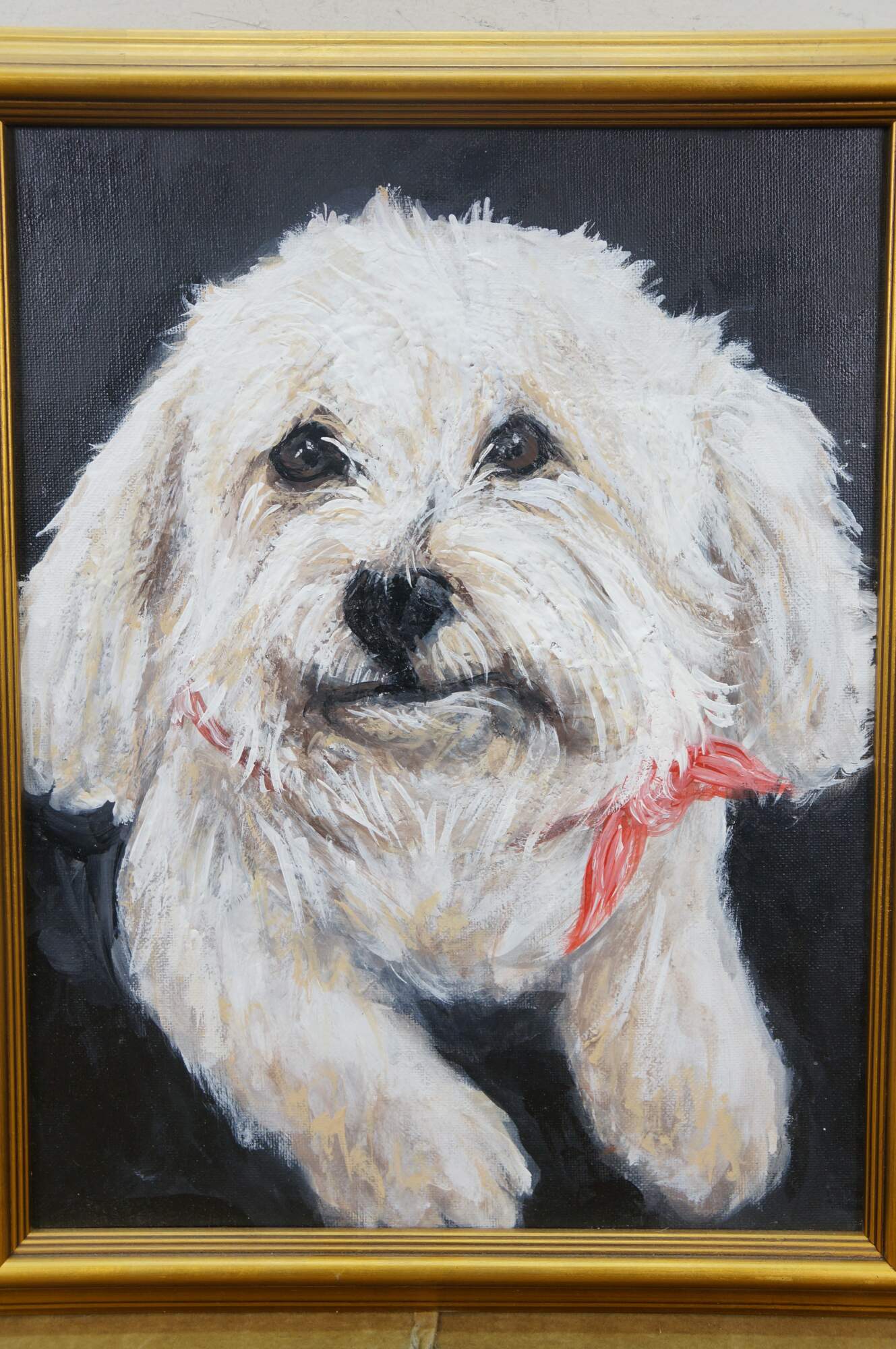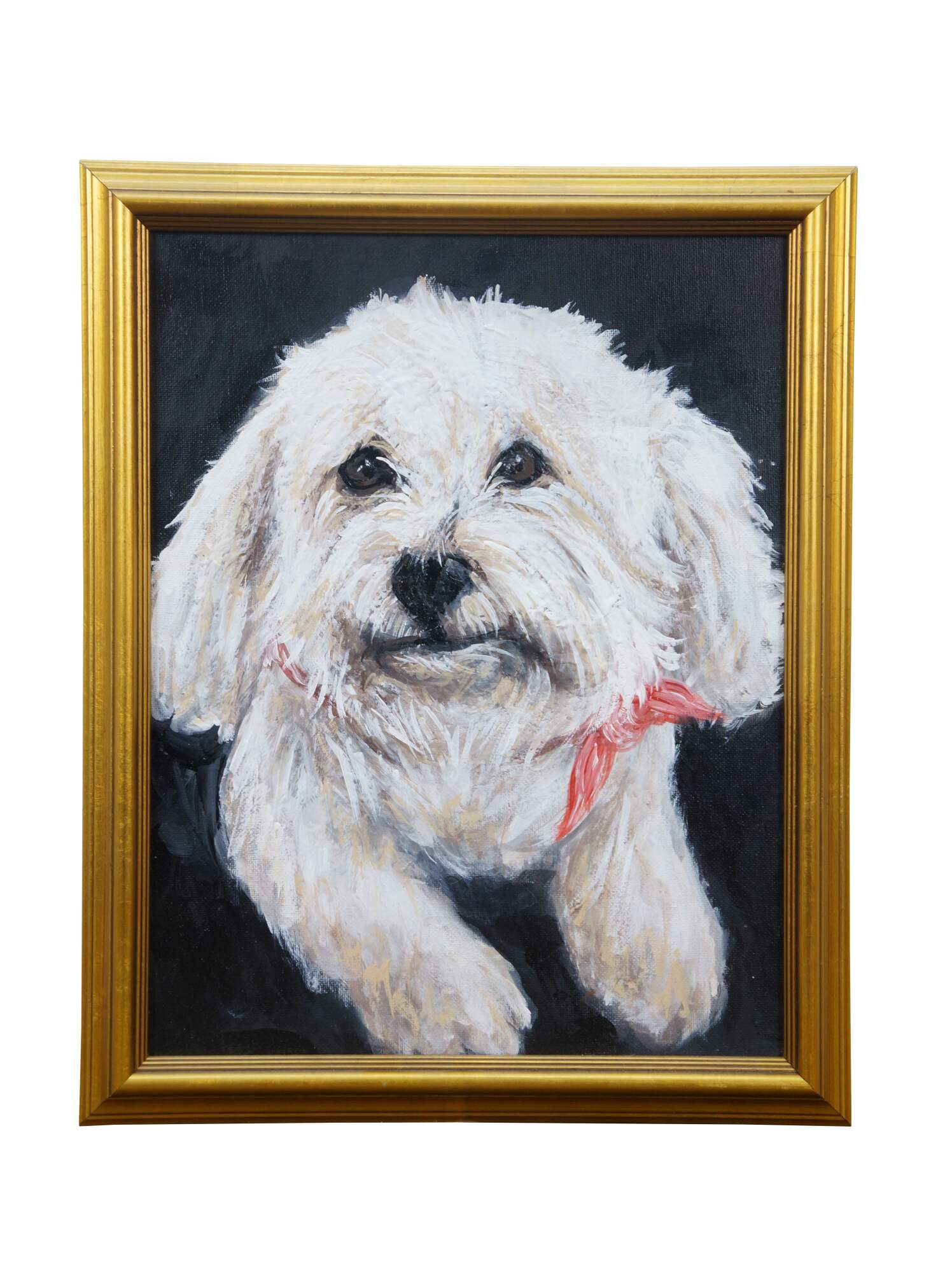 Late 20th century original oil on canvas painting depicting a white fluffy dog - likely a Maltese - wearing a pink ribbon. Beveled gilt frame.