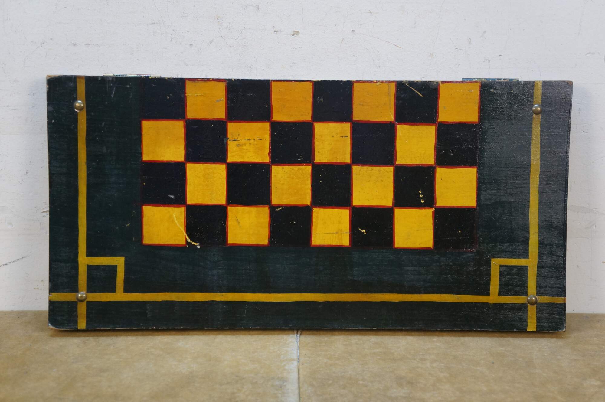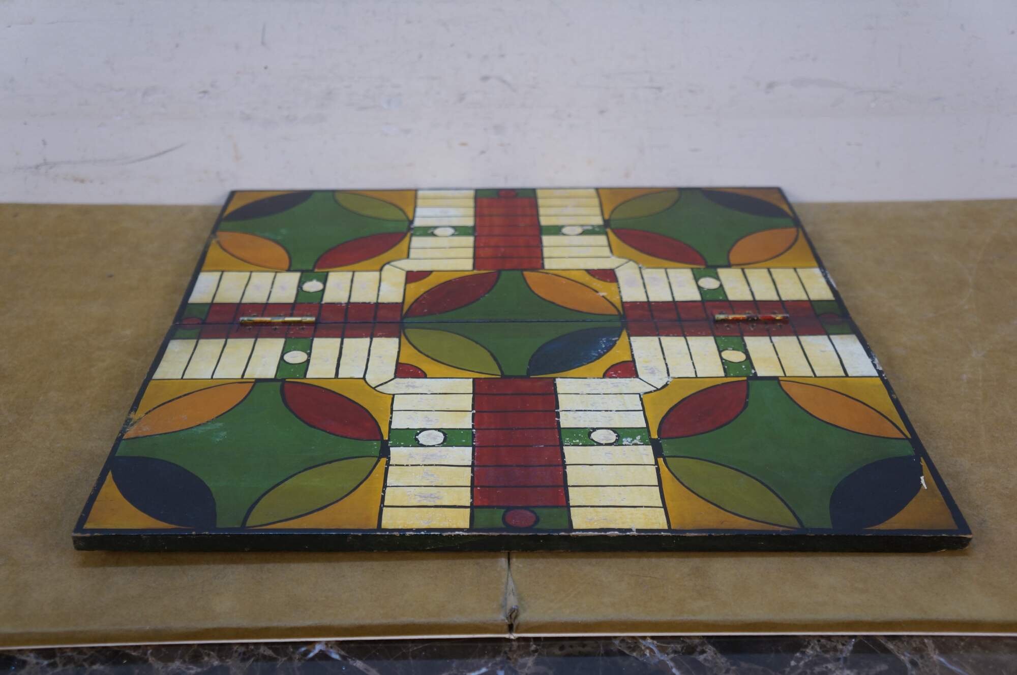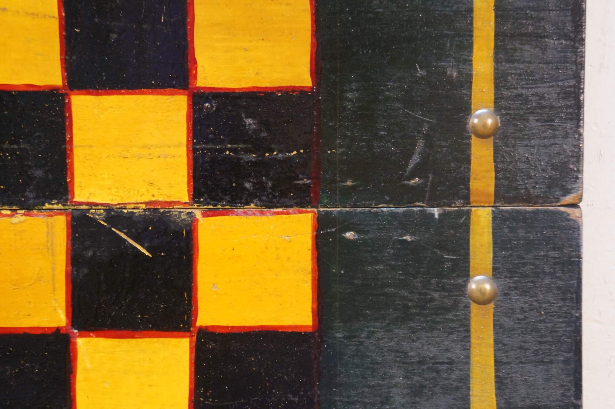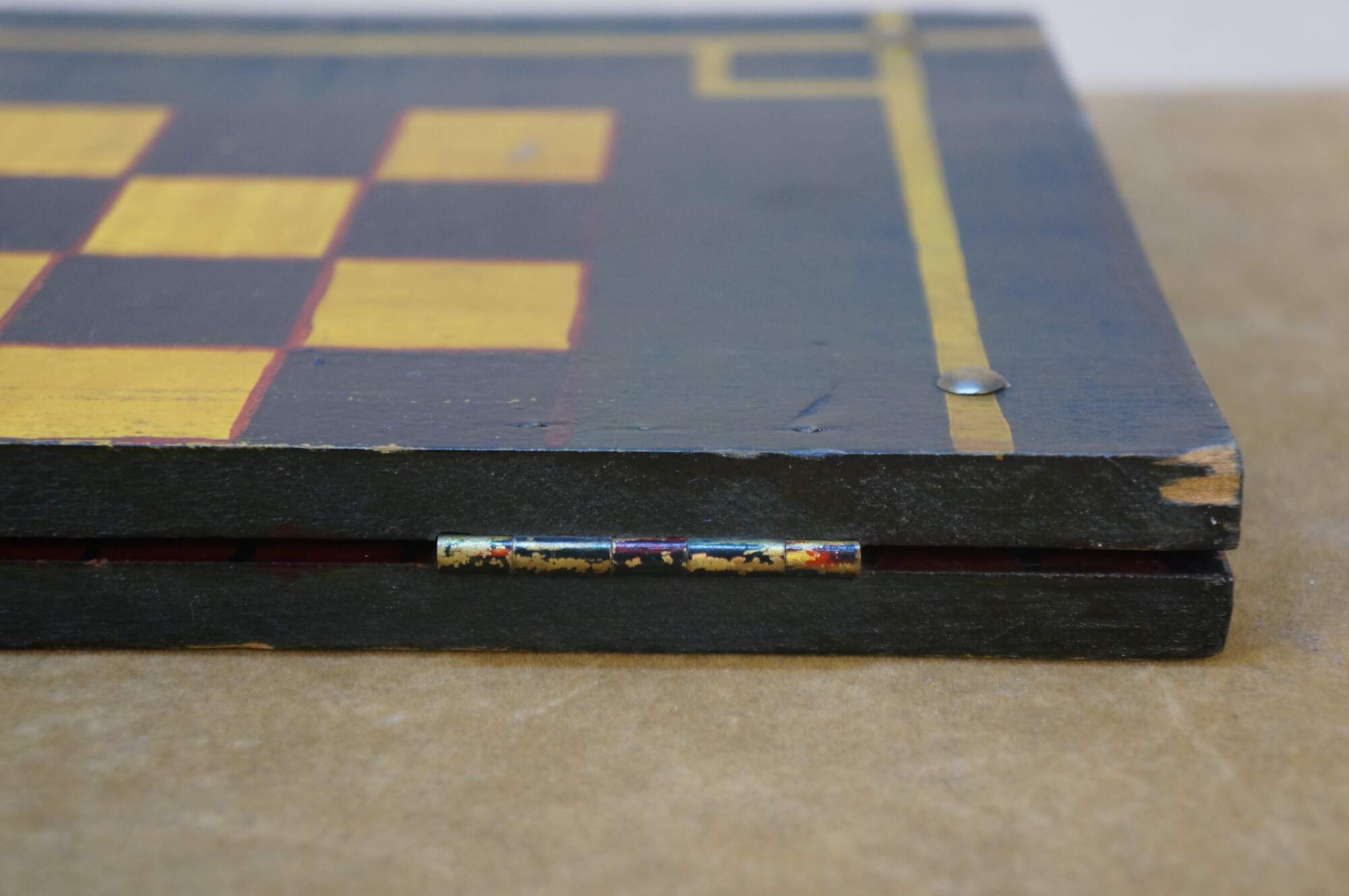 Antique hand painted, folding, double sided game board. One side painted for chess / checkers in a simple design of yellow and black. The other painted for Parcheesi in white, green, yellow, blue, and red.
