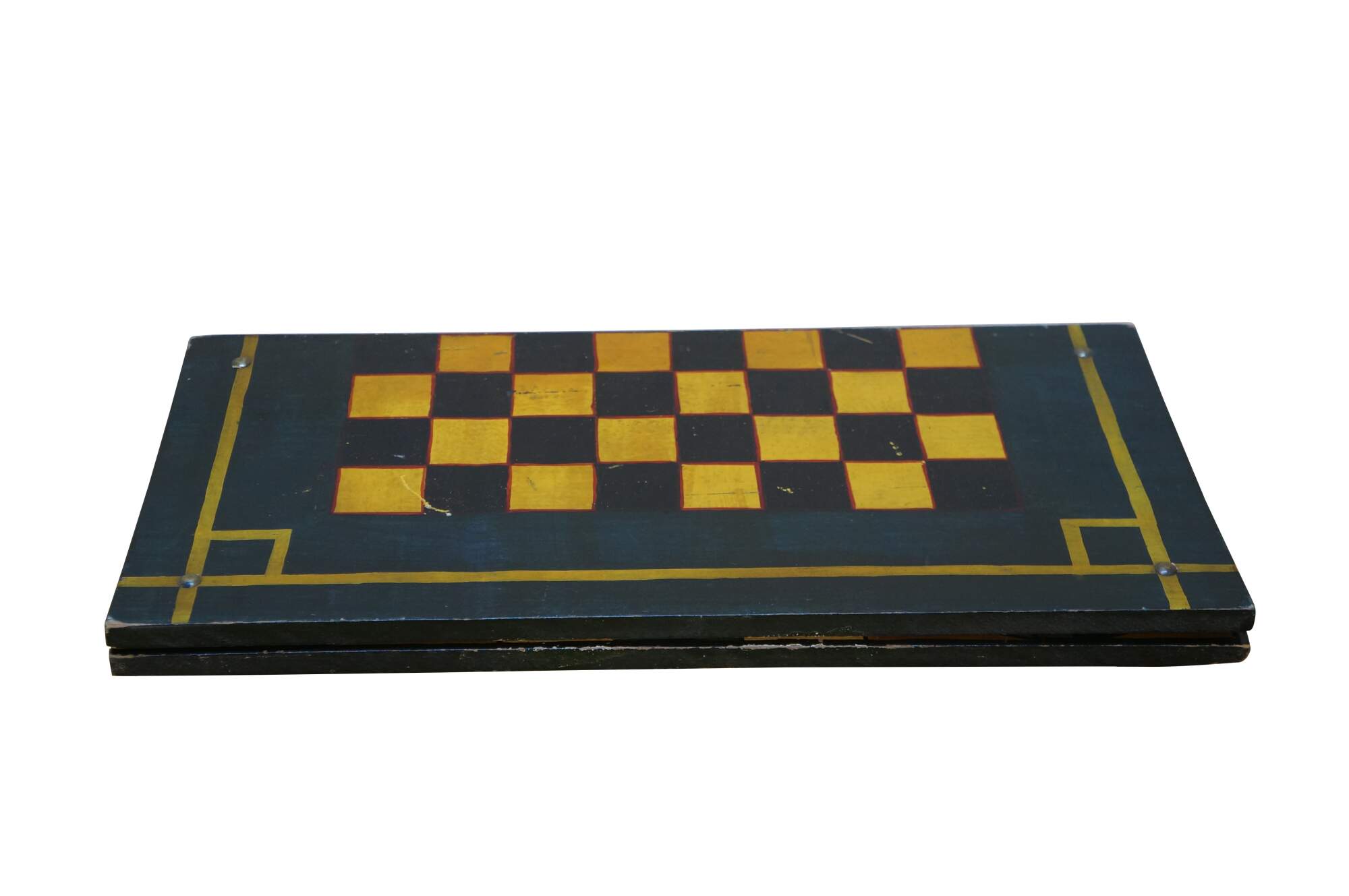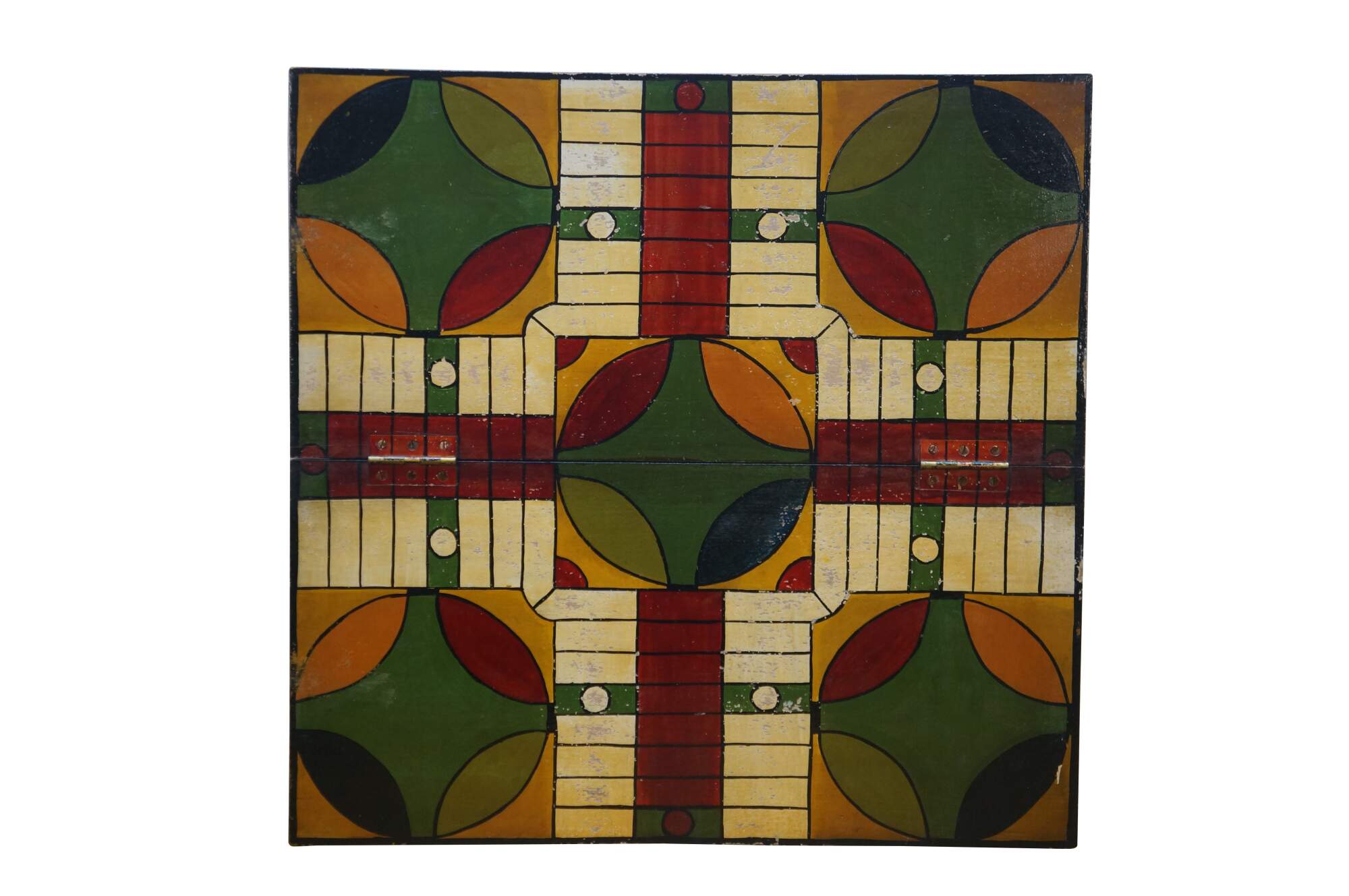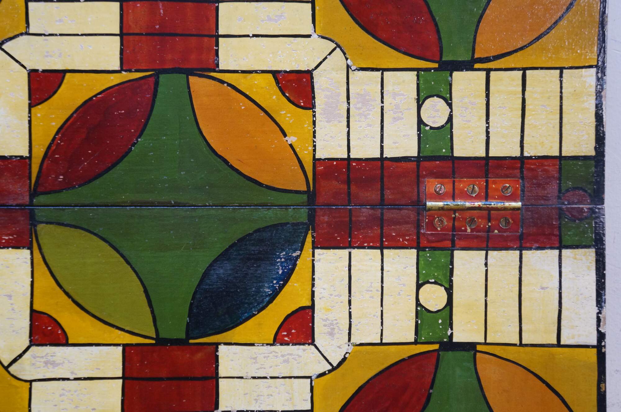 Antique hand painted, folding, double sided game board. One side painted for chess / checkers in a simple design of yellow and black. The other painted for Parcheesi in white, green, yellow, blue, and red.