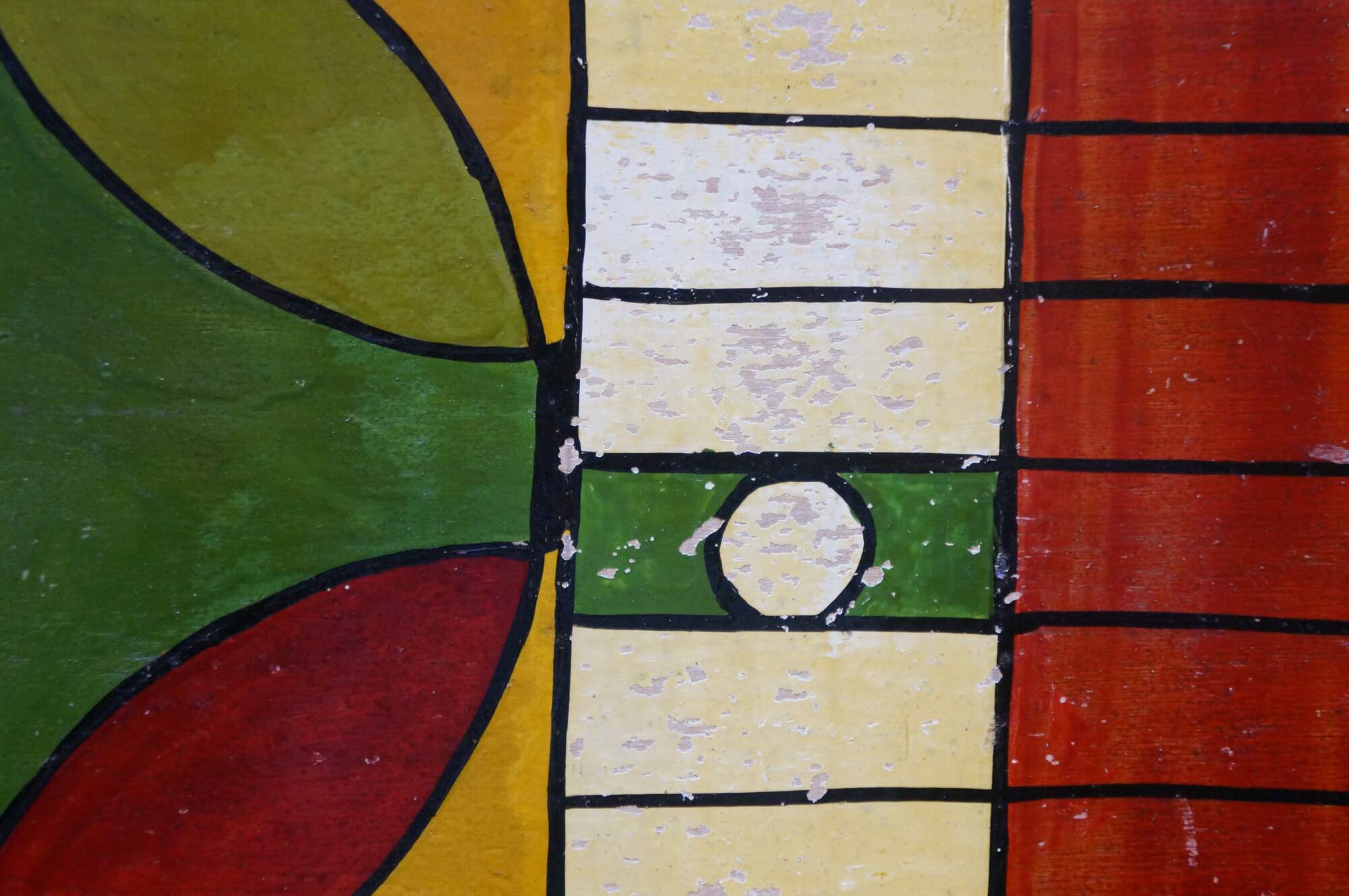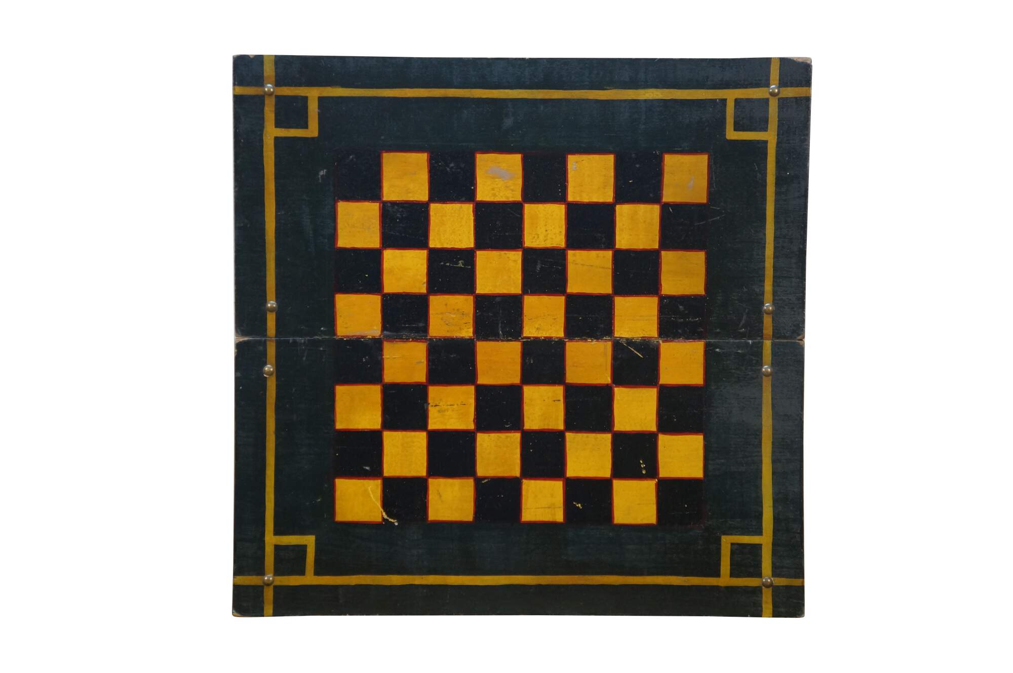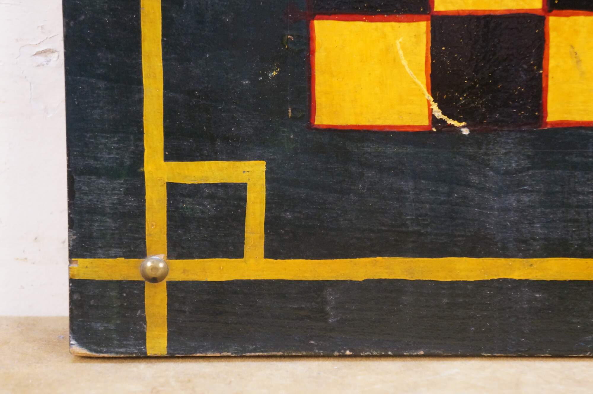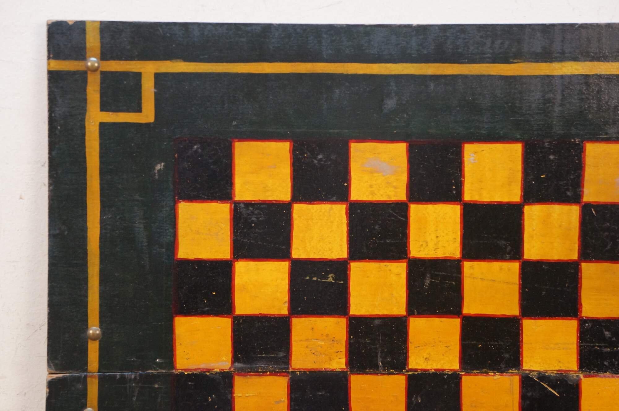 Antique hand painted, folding, double sided game board. One side painted for chess / checkers in a simple design of yellow and black. The other painted for Parcheesi in white, green, yellow, blue, and red.