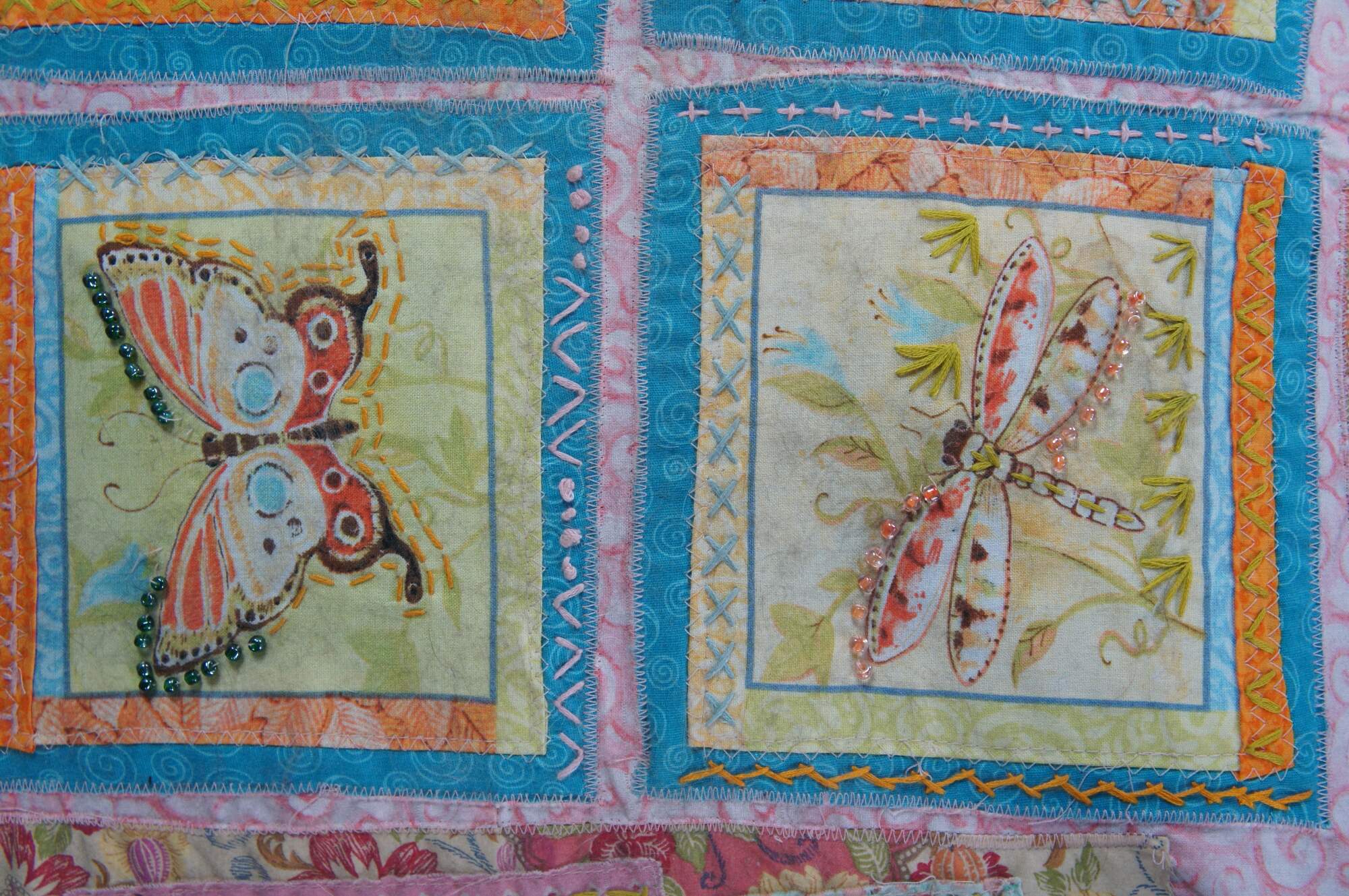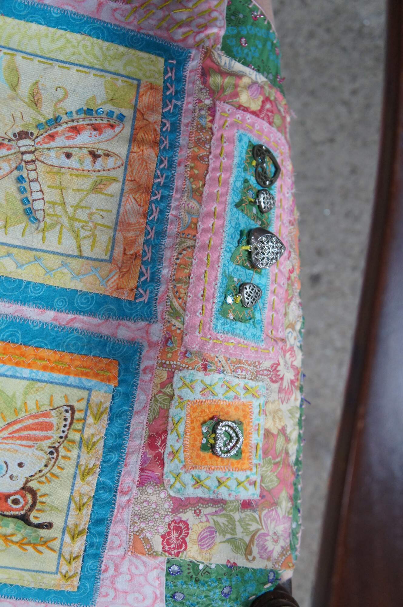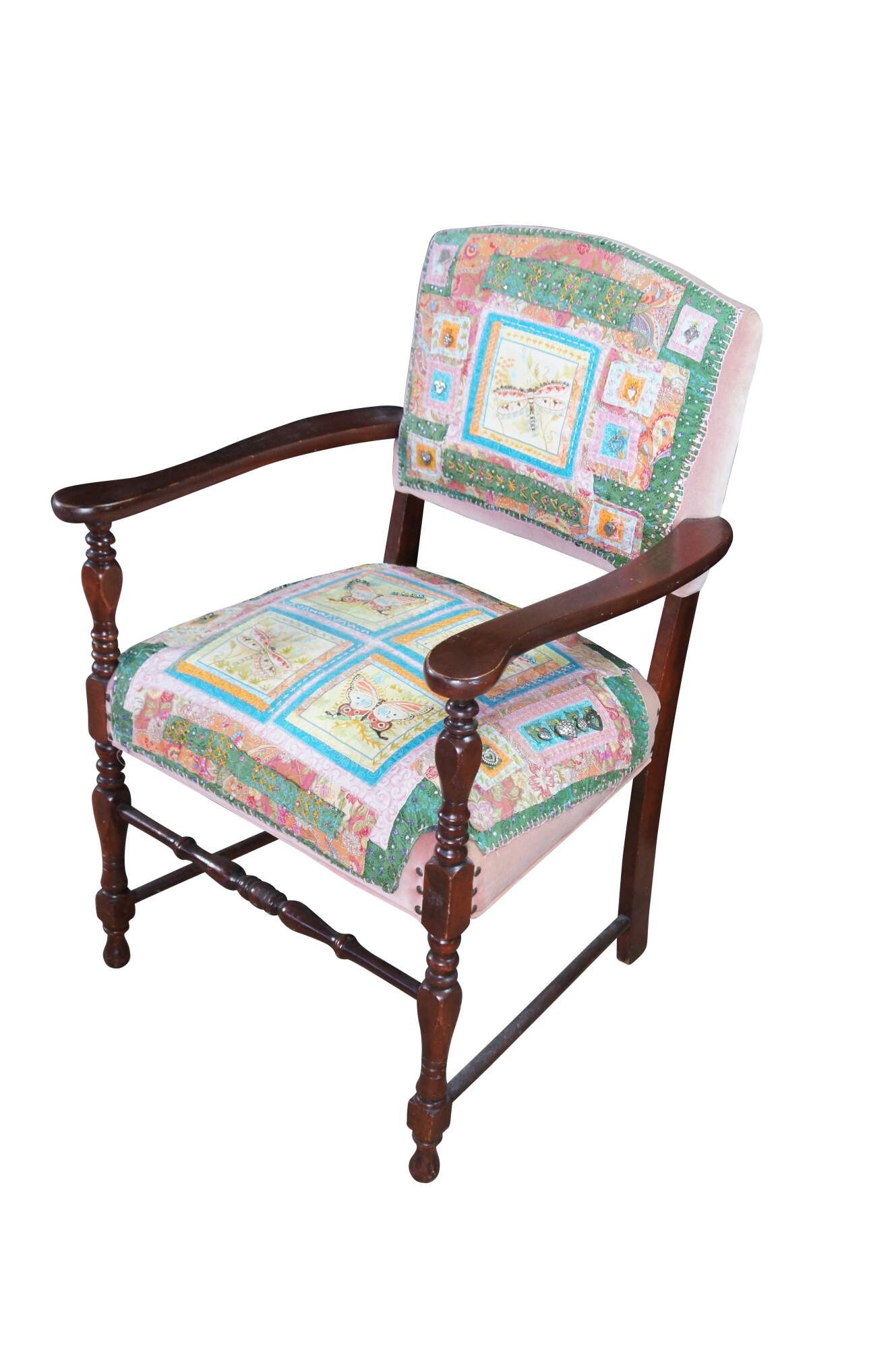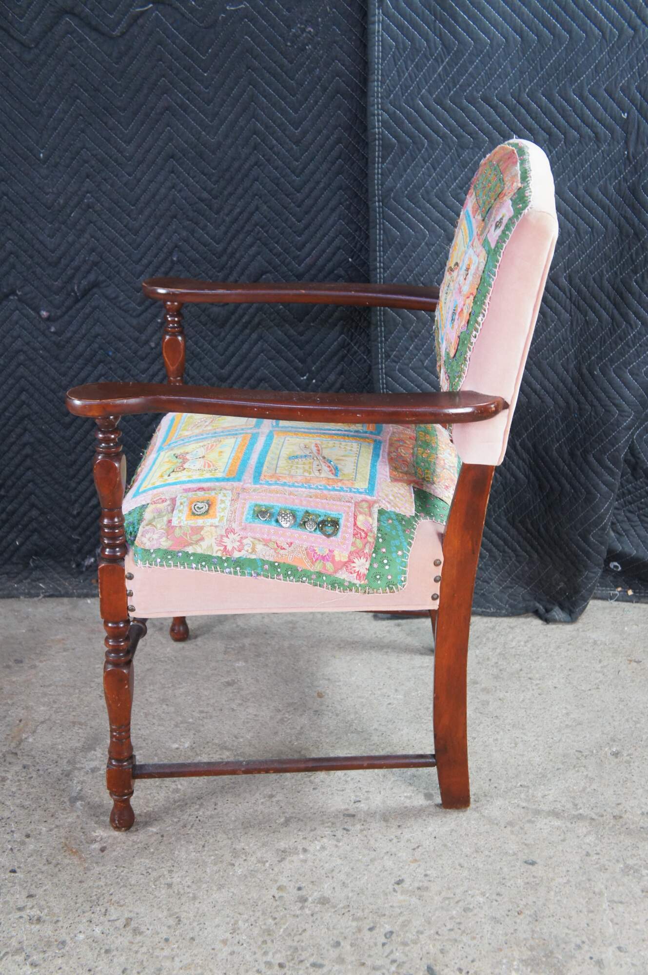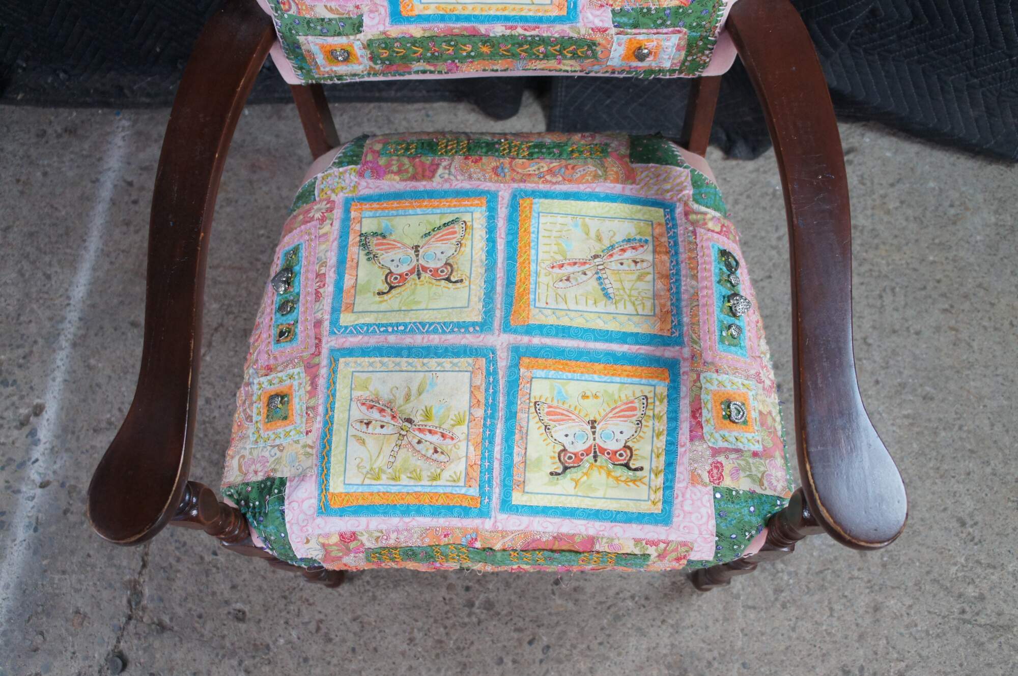 Antique mahogany and velvet nailhead armchair featuring a quilted patchwork design with dragonflies / butterflies and heart charms.