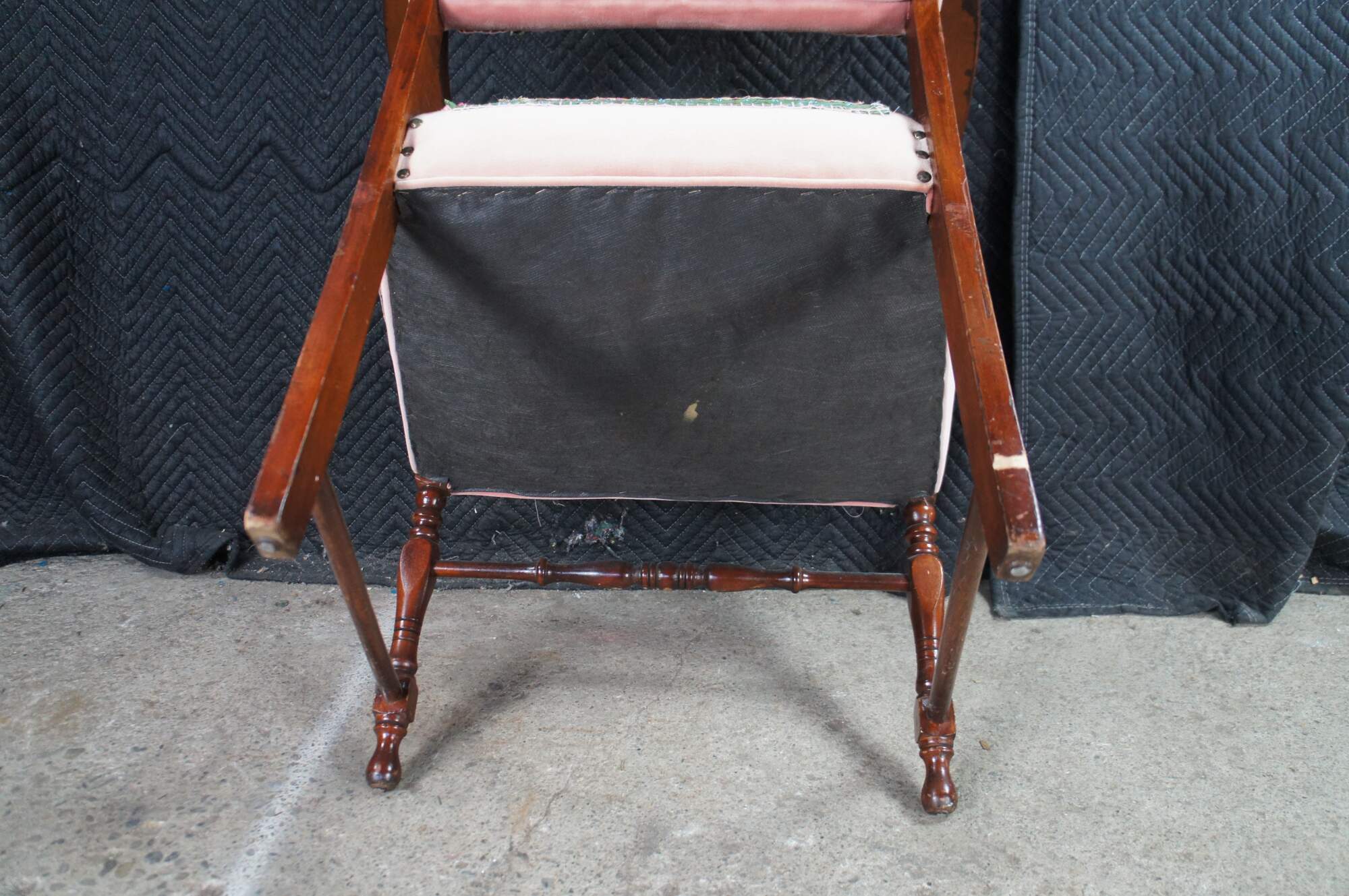 Structurally solid, finish loss, distressing to frame, some fading to fabric, patchwork appears to be stitched down to original upholstery, staining to backside of chair.